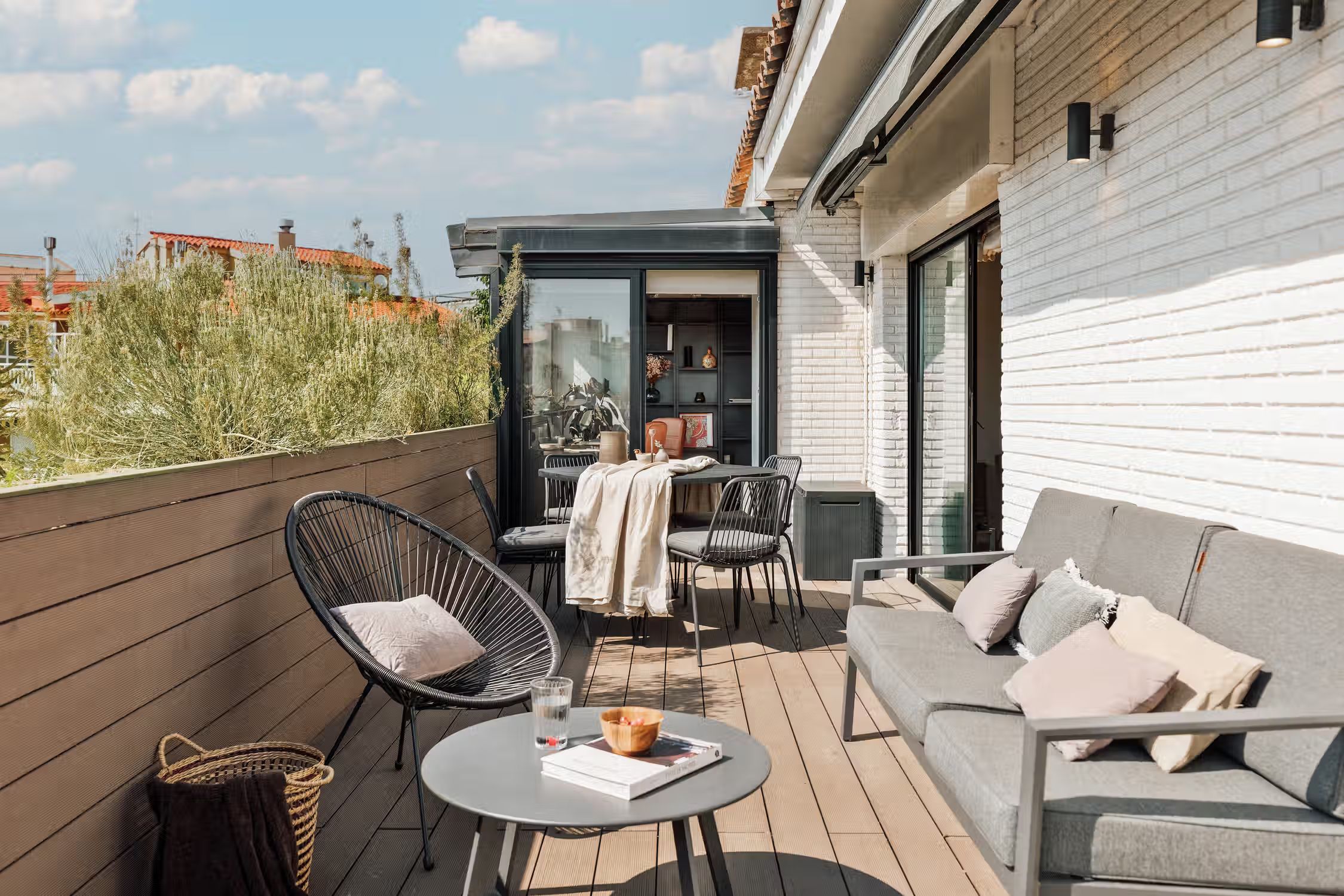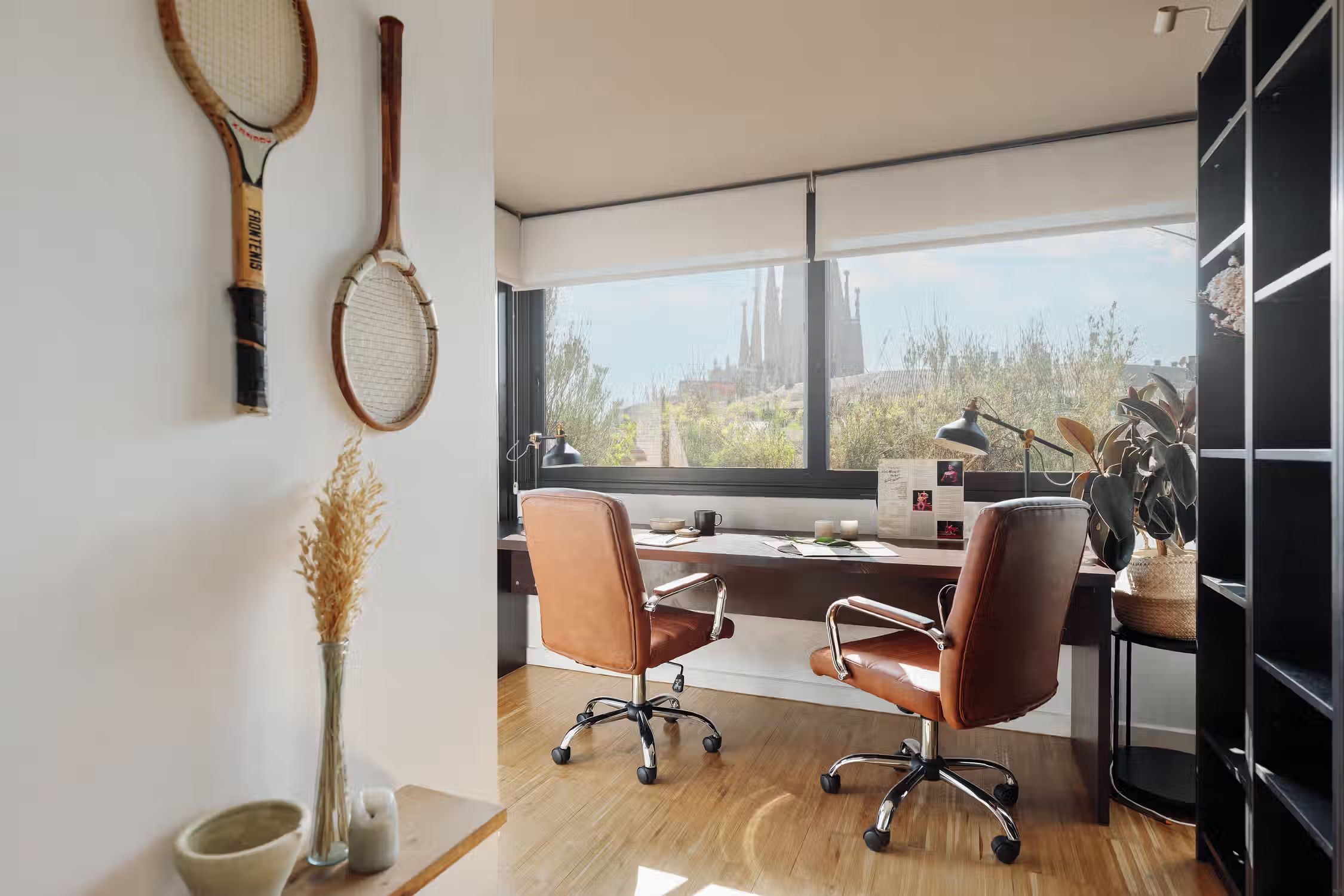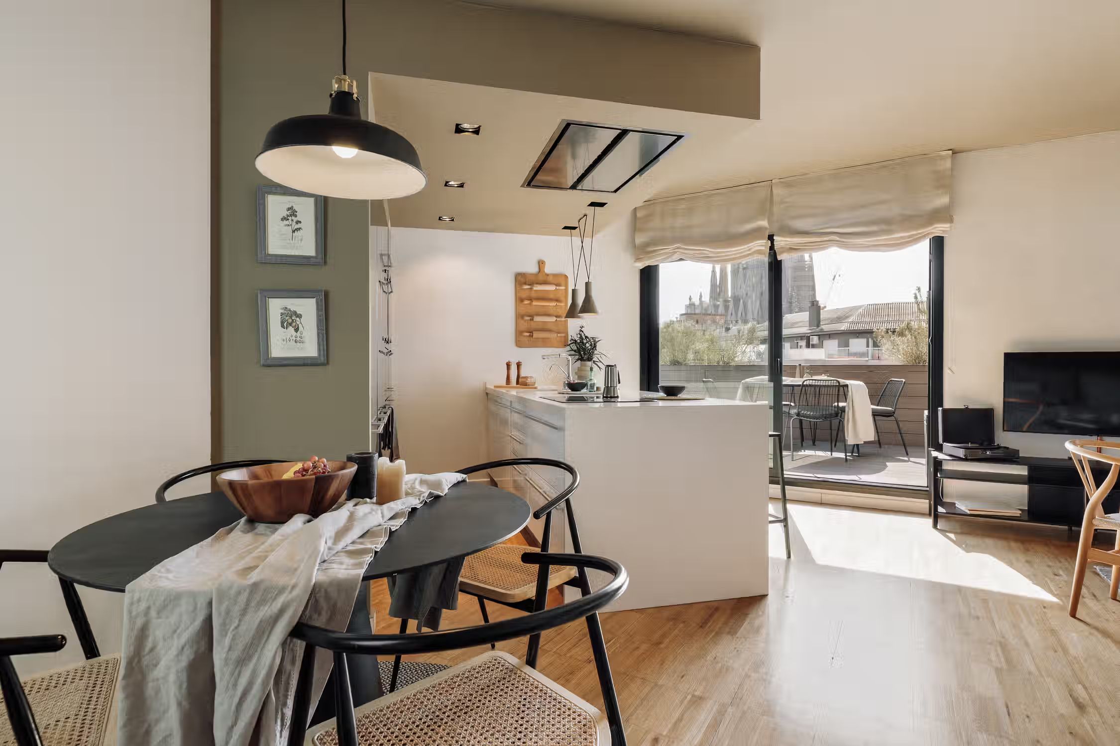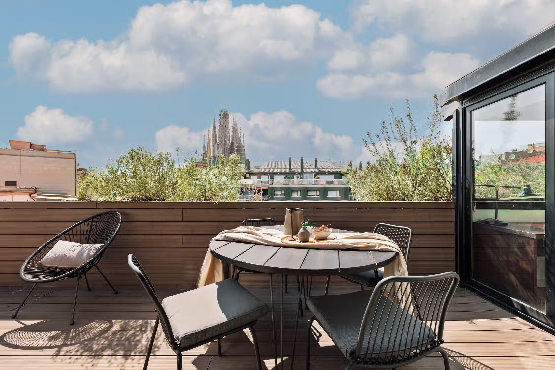 It is rare to find a flat such as this one - a huge terrace, views of the Sagrada Familia, and amazing decor! The wrap around outdoor terrace has a lounge area with a sofa and low table, as well as a dining area. Turn the corner and find a huge rocking sofa chair facing the sun. Walk into the flat and find a guest room, uniquely designed with frames covering the walls and a pull out couch bed. Down the hallway is an open plan kitchen which is completely new with a sleek kitchen island. The open plan living room is flooded with natural light, with discreet wood decor on the walls. The living room comes with a sitting area, and a small round dining area. There is a private alcove with a custom made desk for all your work from home needs. The living room gives access to the fantastic terrace which overlooks Gaudi's famous Sagrada Familia. The master bedroom can be accessed by the other side of the terrace. There is ample storage space and a queen sized bed with new sheets. There is an ensuite bathroom with a shower, and fresh towels. For comfort, this apartment comes equipped with air conditioning in the Living room and in one bedroom