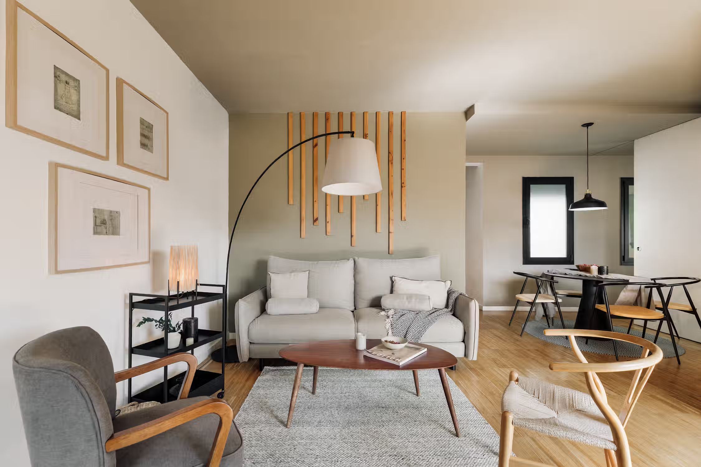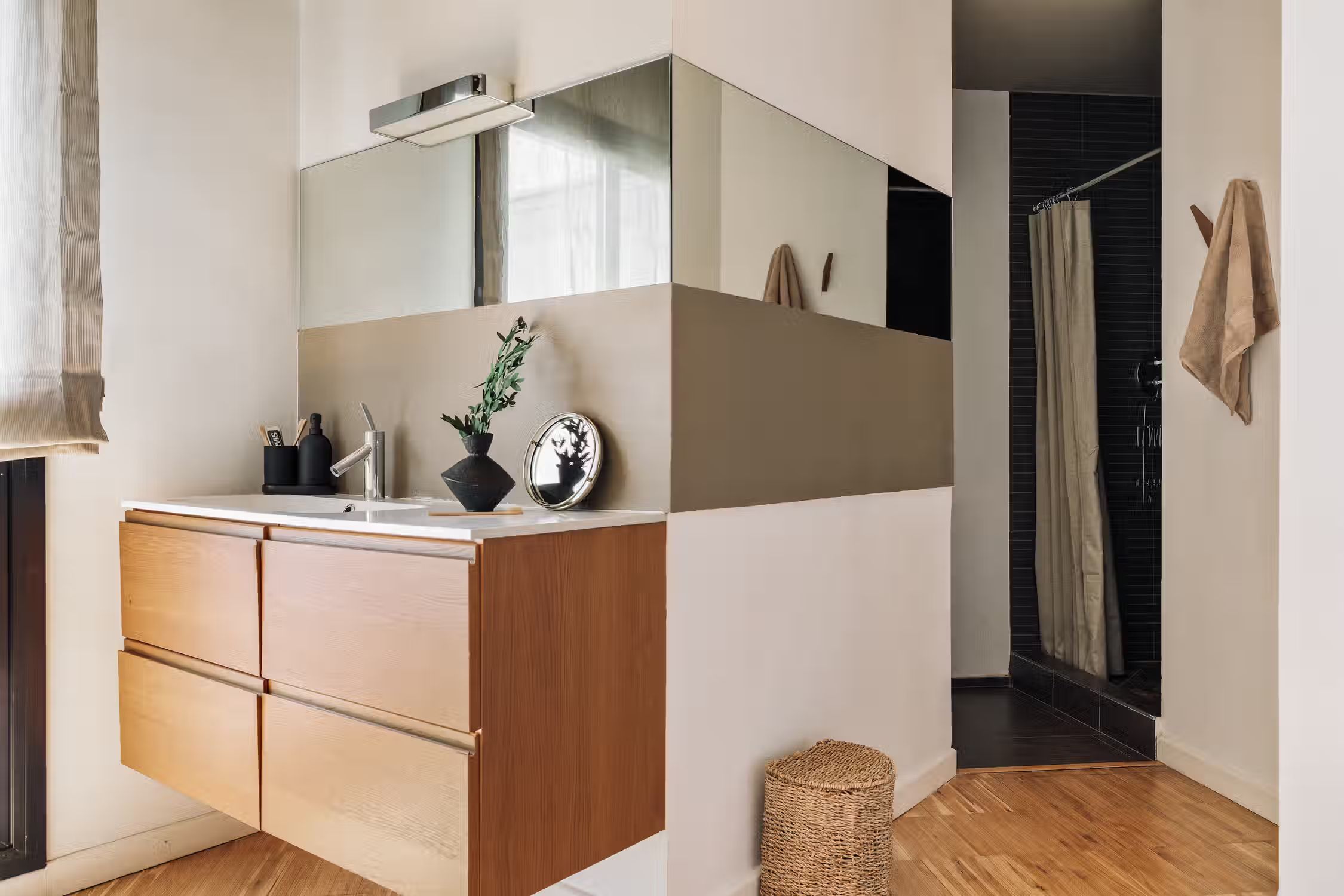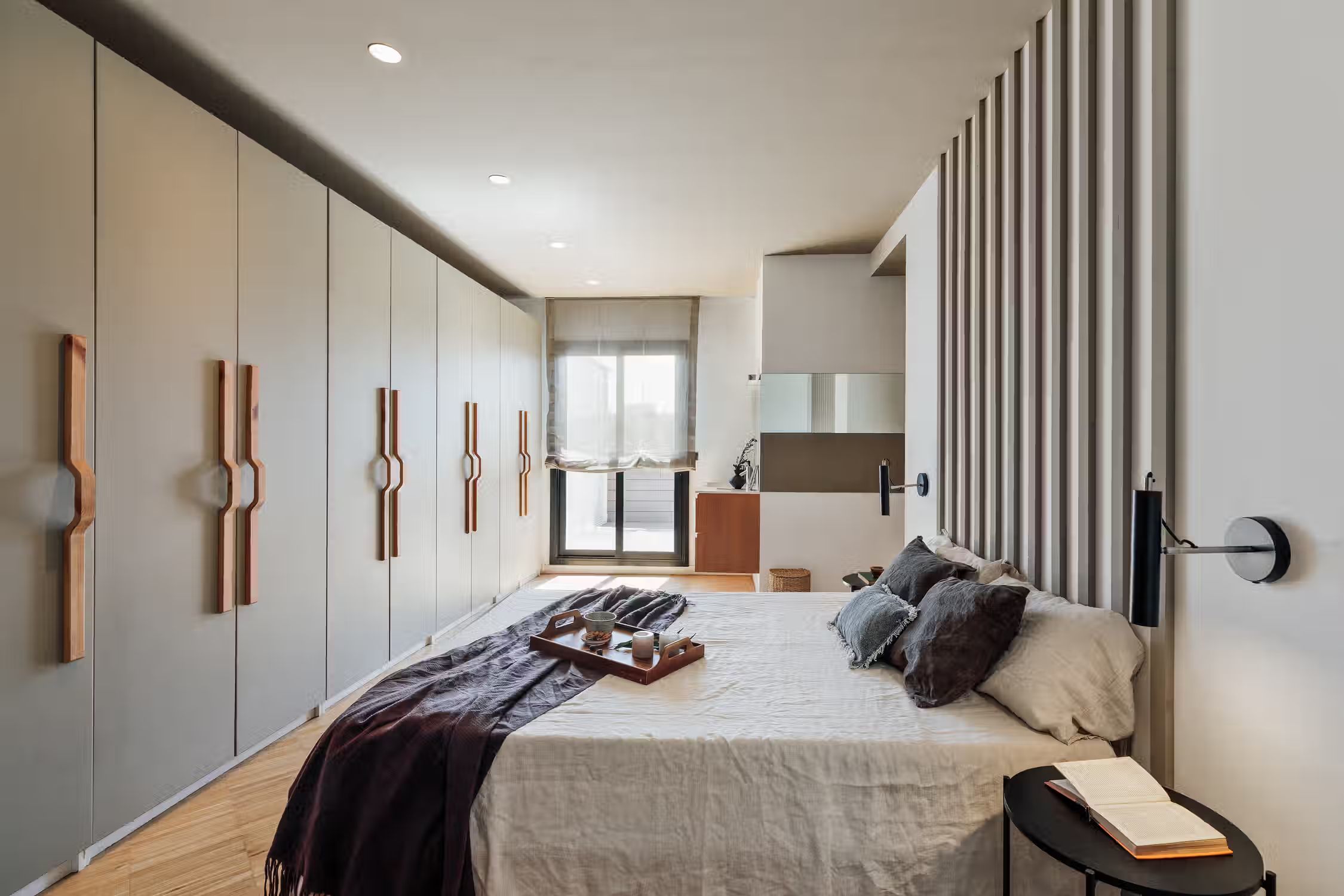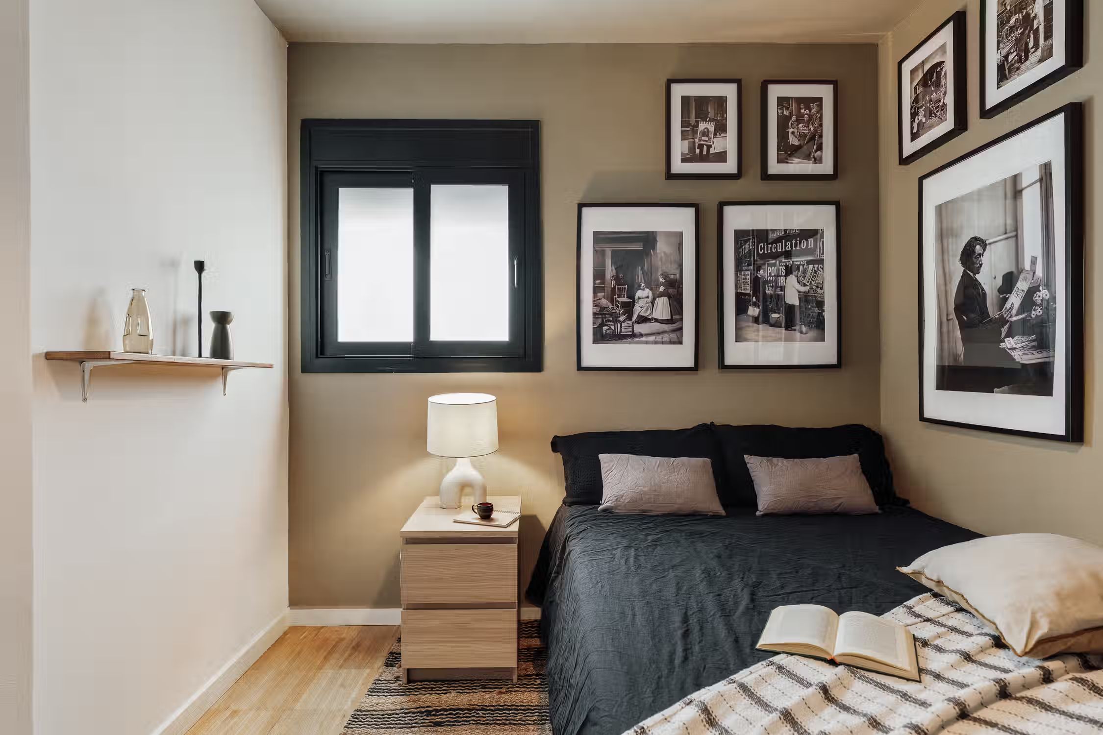 It is rare to find a flat such as this one - a huge terrace, views of the Sagrada Familia, and amazing decor! The wrap around outdoor terrace has a lounge area with a sofa and low table, as well as a dining area. Turn the corner and find a huge rocking sofa chair facing the sun. Walk into the flat and find a guest room, uniquely designed with frames covering the walls and a pull out couch bed. Down the hallway is an open plan kitchen which is completely new with a sleek kitchen island. The open plan living room is flooded with natural light, with discreet wood decor on the walls. The living room comes with a sitting area, and a small round dining area. There is a private alcove with a custom made desk for all your work from home needs. The living room gives access to the fantastic terrace which overlooks Gaudi's famous Sagrada Familia. The master bedroom can be accessed by the other side of the terrace. There is ample storage space and a queen sized bed with new sheets. There is an ensuite bathroom with a shower, and fresh towels. For comfort, this apartment comes equipped with air conditioning in the Living room and in one bedroom
