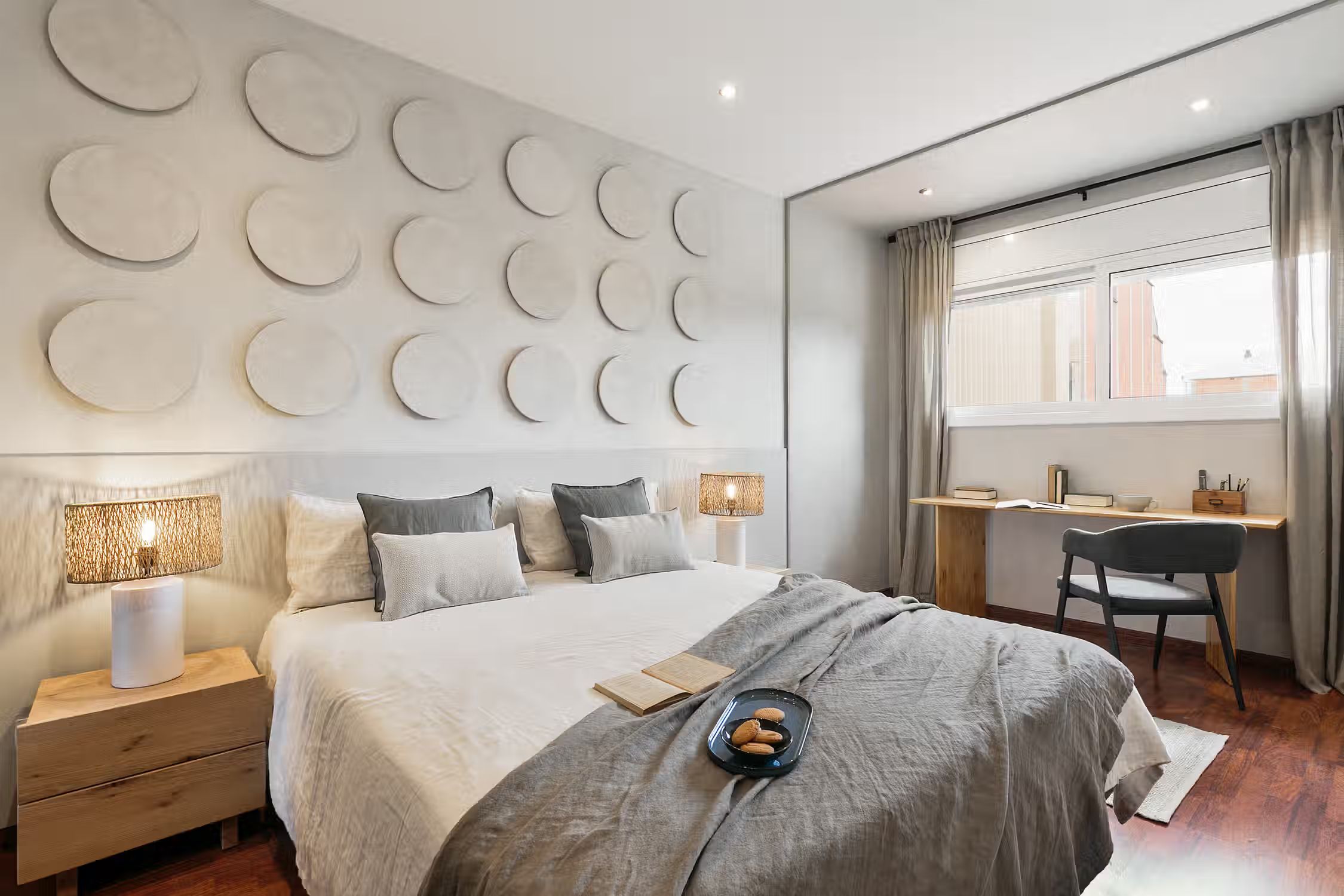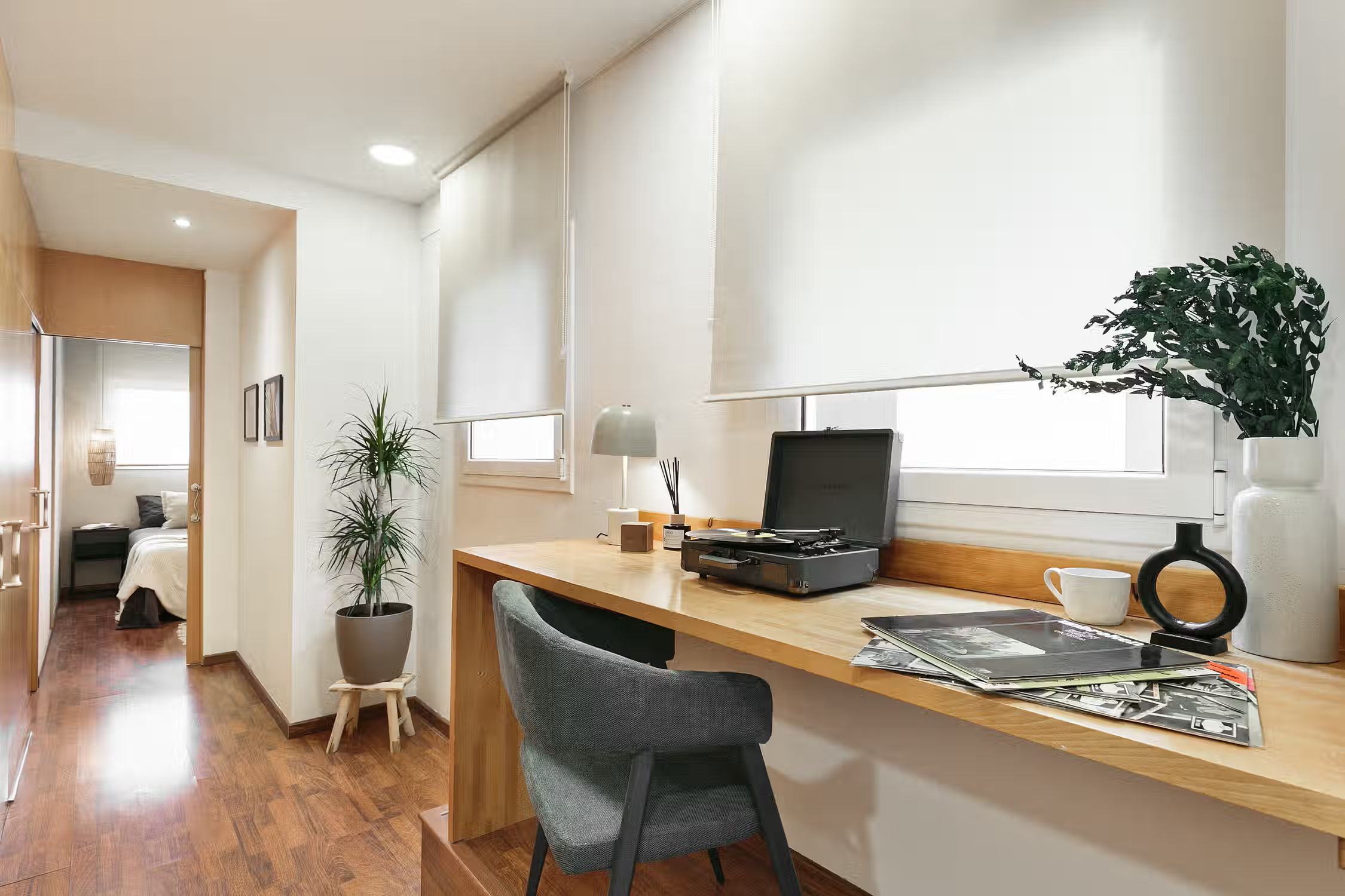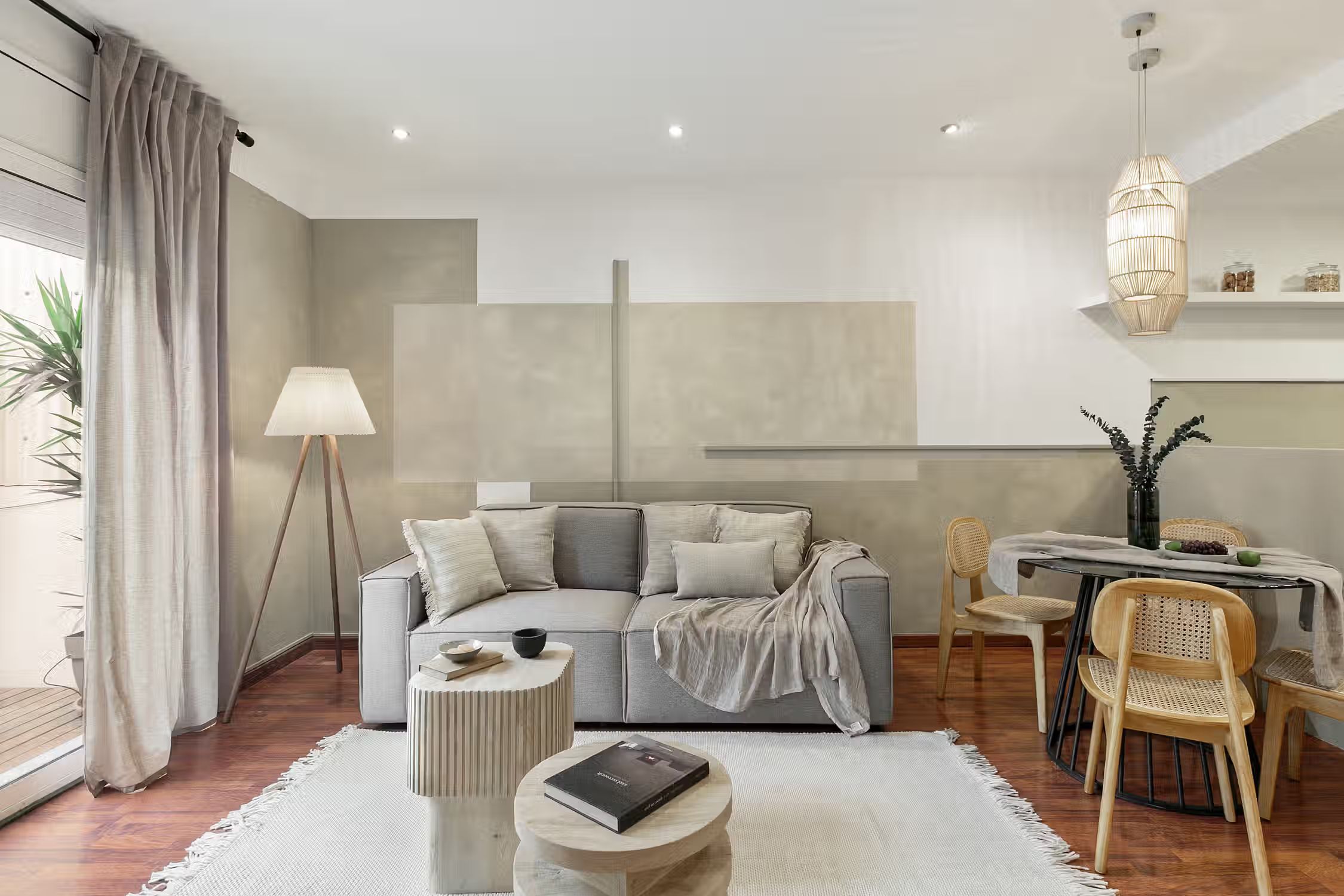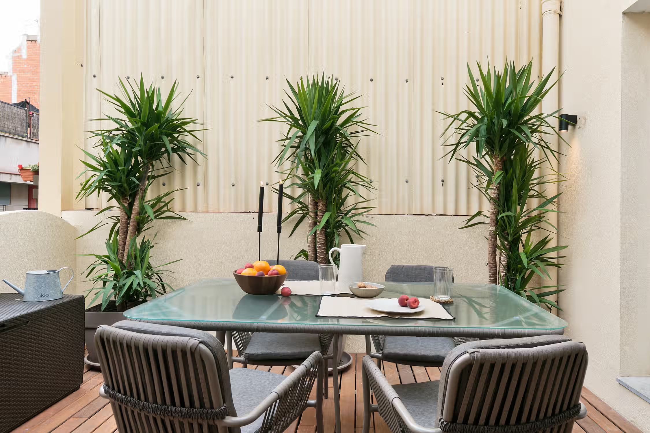 Welcome to Nerano, a delightful beach-themed apartment located in the vibrant neighborhood of Gracia in Barcelona. This cute area is perfect for enjoying an outdoor drink, shopping the trendy stores, and getting a great bite to eat. After a day of exploring, come home to Nerano for absolute indulgence. Spanning 80 square meters, Nerano is designed to provide a comfortable and relaxing atmosphere. The apartment features two tastefully decorated bedrooms, both equipped with queen-size beds to ensure a restful night's sleep. One of the bedrooms also includes a dedicated workstation, providing a convenient space for work or study during your stay. The one bathroom is chic and functional in design and provides the perfect place to get ready for your day. The heart of Nerano is the spacious living room, where you can unwind and enjoy quality time with family and friends. This space is decorated in true beach style, with its sandy neutral color scheme and woven light wood chairs. Relax in the comfortable seating area while watching your favorite movies or shows on the entertainment system. The dining table offers a cozy spot for meals, and the large windows flood the room with natural light, creating a bright and welcoming ambiance. Step outside from the living room and discover the charming terrace. The terrace is a perfect spot to soak up the sun or enjoy al fresco dining. With its sitting area and outdoor dining table, you can savor your meals while taking in the refreshing breeze and delightful views of the surroundings. The fully furnished kitchen is equipped with modern appliances and offers everything you need to prepare your favorite dishes. Adjacent to the kitchen, you'll find a dedicated workstation, providing a comfortable space to catch up on emails or work on any tasks that require your attention. To ensure your comfort during your stay, Nerano is equipped with air conditioning, allowing you to adjust the temperature to your preference and enjoy a pleasant indoor environment. Fully furnished, this apartment comes with everything you need, including bedding and linens