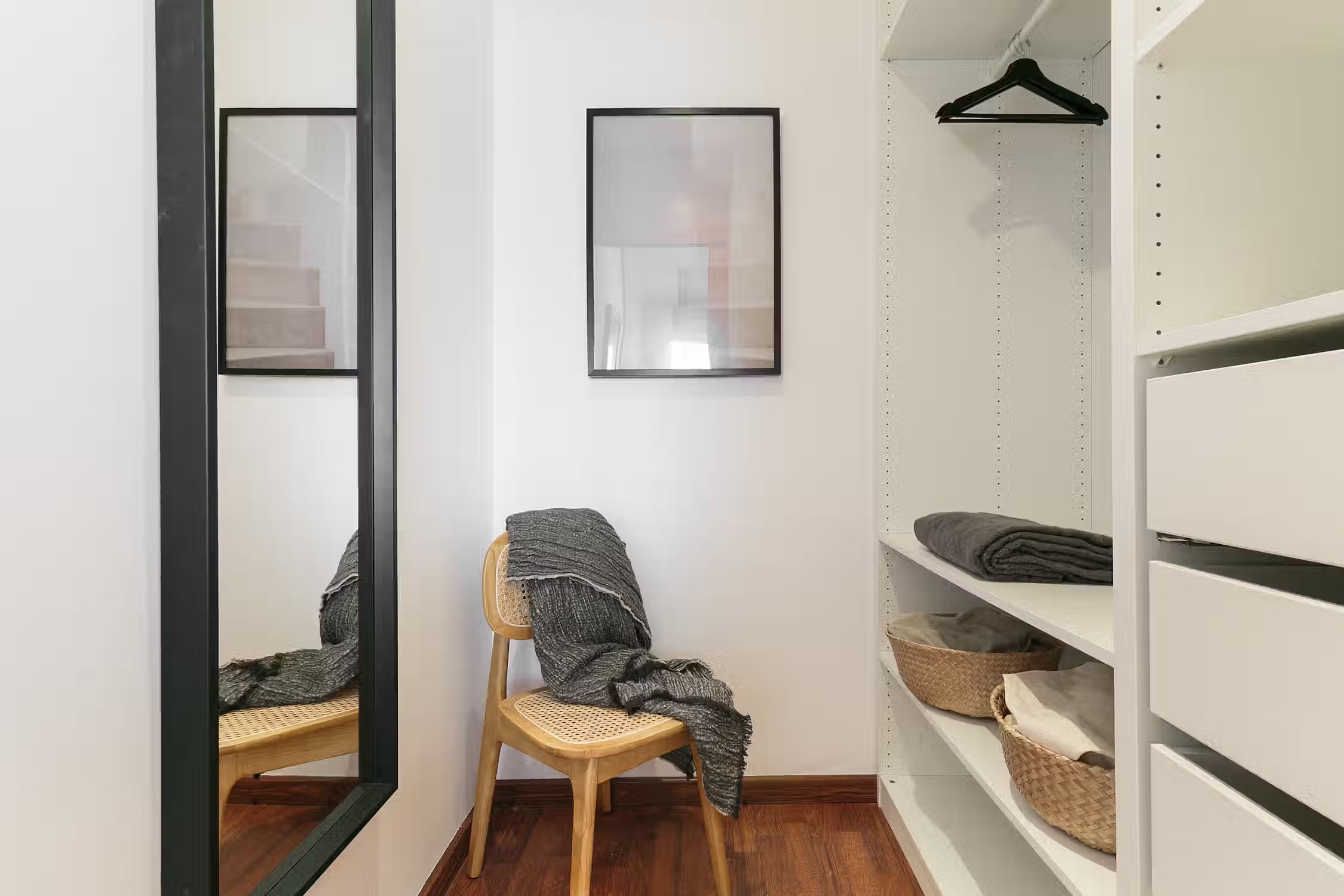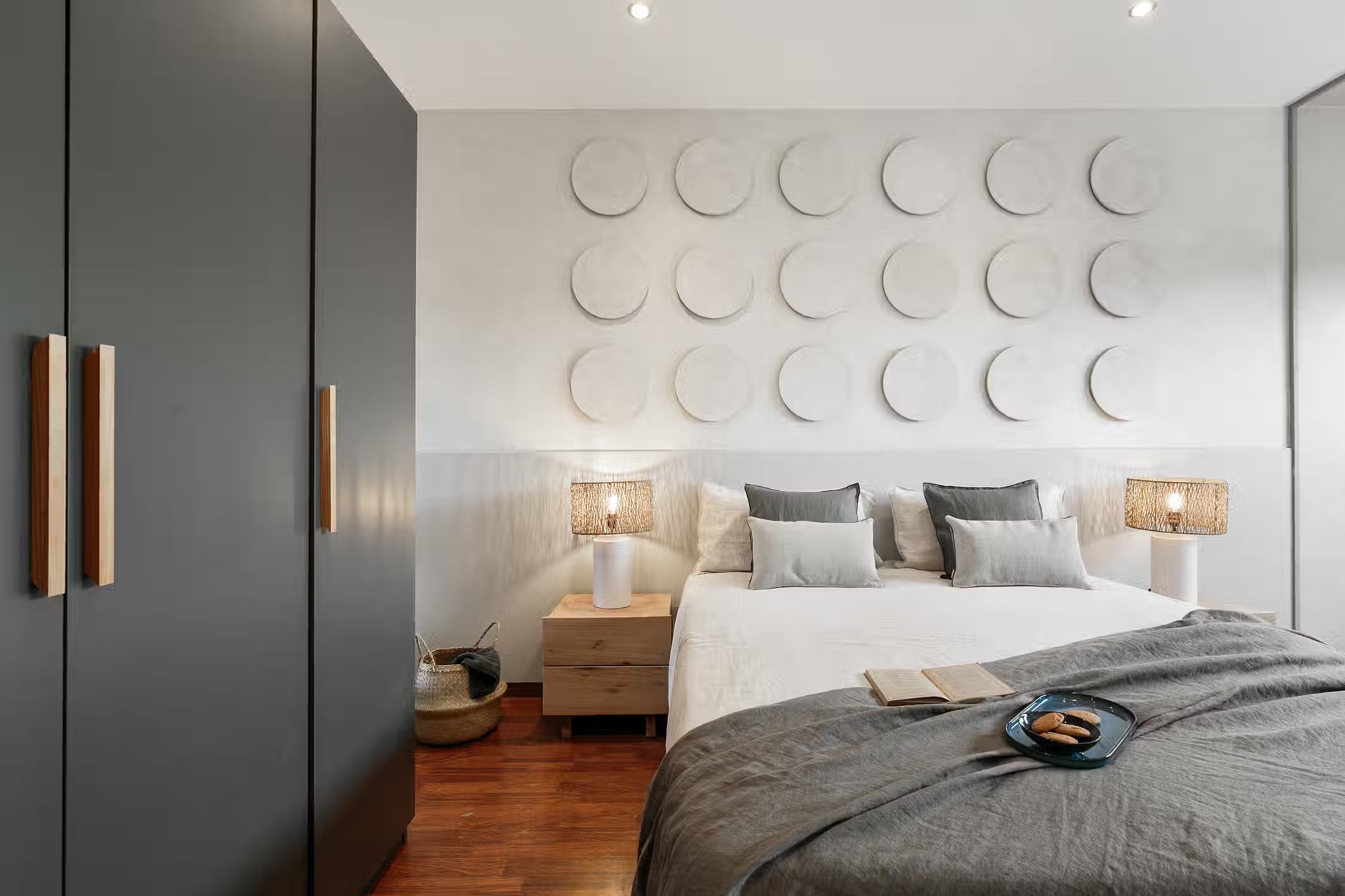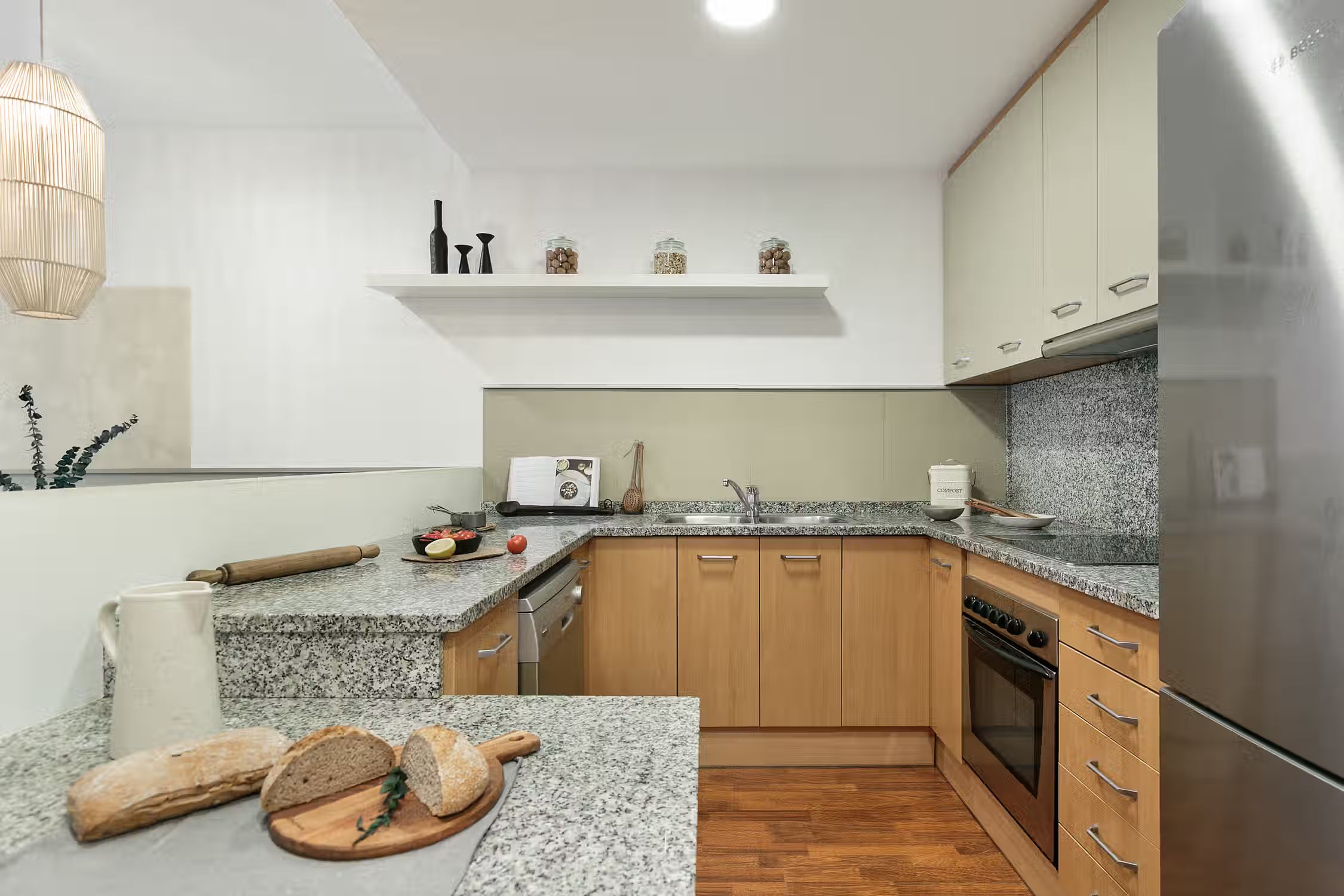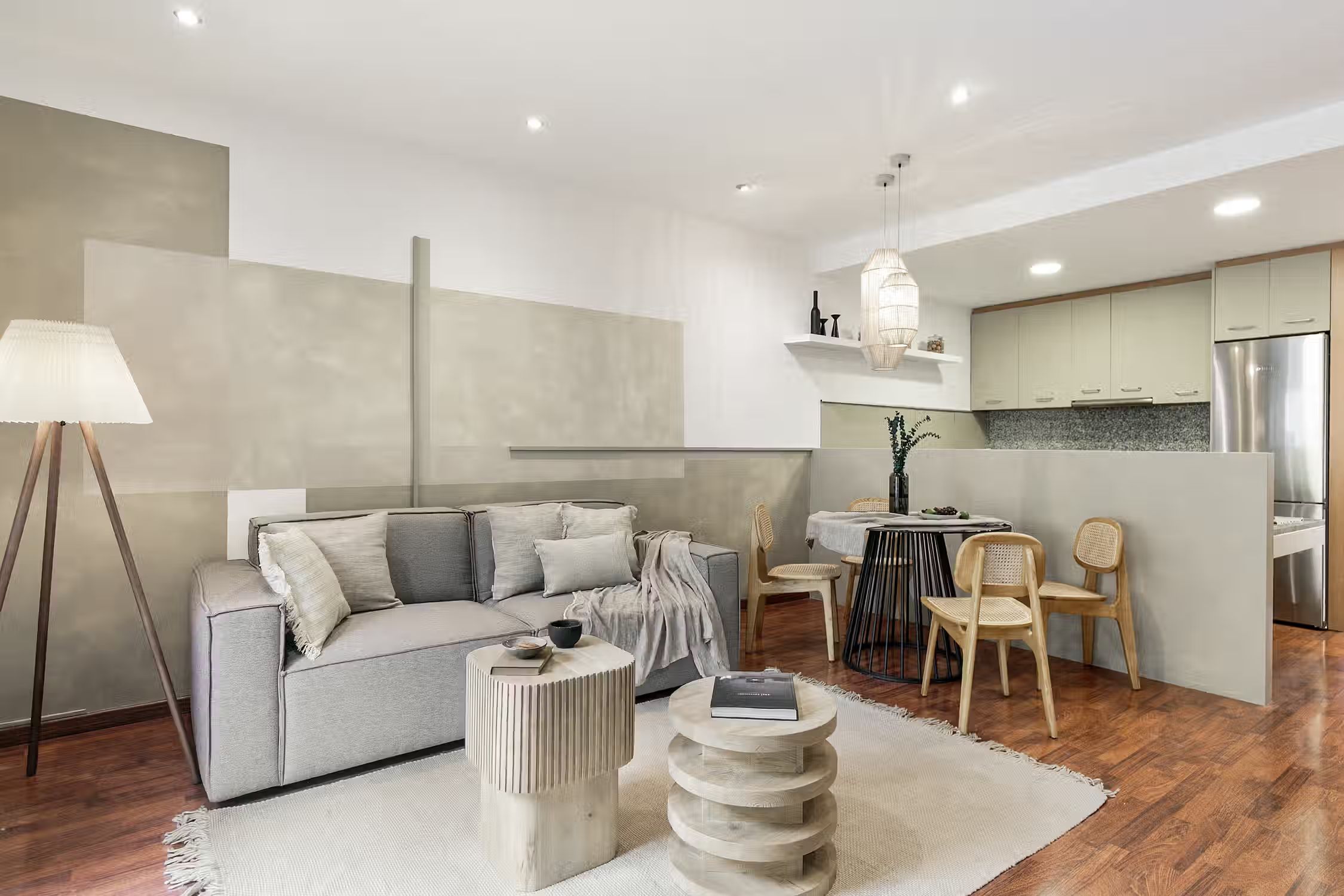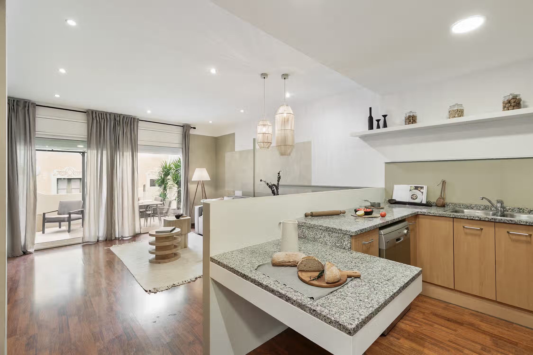 Welcome to Nerano, a delightful beach-themed apartment located in the vibrant neighborhood of Gracia in Barcelona. This cute area is perfect for enjoying an outdoor drink, shopping the trendy stores, and getting a great bite to eat. After a day of exploring, come home to Nerano for absolute indulgence. Spanning 80 square meters, Nerano is designed to provide a comfortable and relaxing atmosphere. The apartment features two tastefully decorated bedrooms, both equipped with queen-size beds to ensure a restful night's sleep. One of the bedrooms also includes a dedicated workstation, providing a convenient space for work or study during your stay. The one bathroom is chic and functional in design and provides the perfect place to get ready for your day. The heart of Nerano is the spacious living room, where you can unwind and enjoy quality time with family and friends. This space is decorated in true beach style, with its sandy neutral color scheme and woven light wood chairs. Relax in the comfortable seating area while watching your favorite movies or shows on the entertainment system. The dining table offers a cozy spot for meals, and the large windows flood the room with natural light, creating a bright and welcoming ambiance. Step outside from the living room and discover the charming terrace. The terrace is a perfect spot to soak up the sun or enjoy al fresco dining. With its sitting area and outdoor dining table, you can savor your meals while taking in the refreshing breeze and delightful views of the surroundings. The fully furnished kitchen is equipped with modern appliances and offers everything you need to prepare your favorite dishes. Adjacent to the kitchen, you'll find a dedicated workstation, providing a comfortable space to catch up on emails or work on any tasks that require your attention. To ensure your comfort during your stay, Nerano is equipped with air conditioning, allowing you to adjust the temperature to your preference and enjoy a pleasant indoor environment. Fully furnished, this apartment comes with everything you need, including bedding and linens