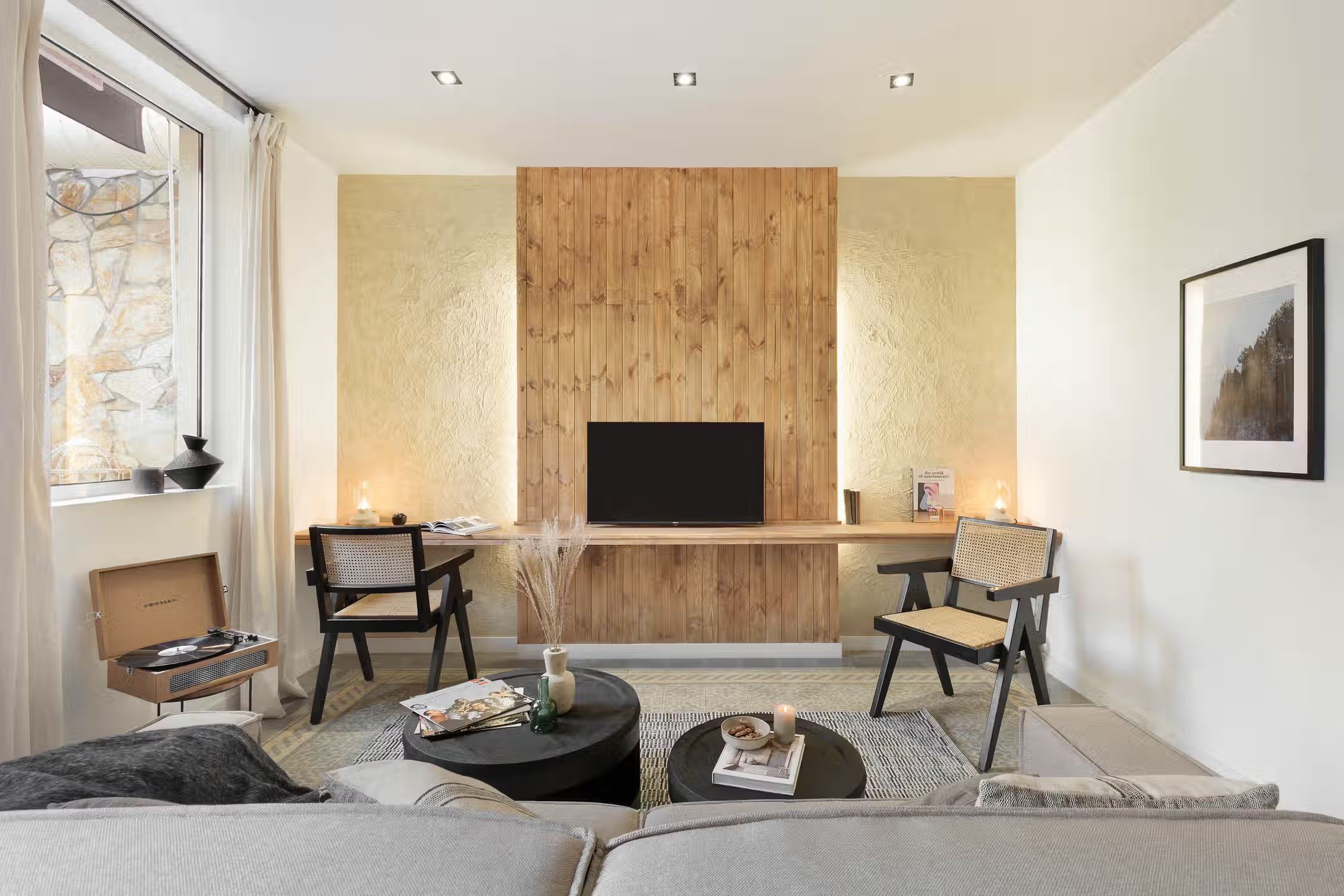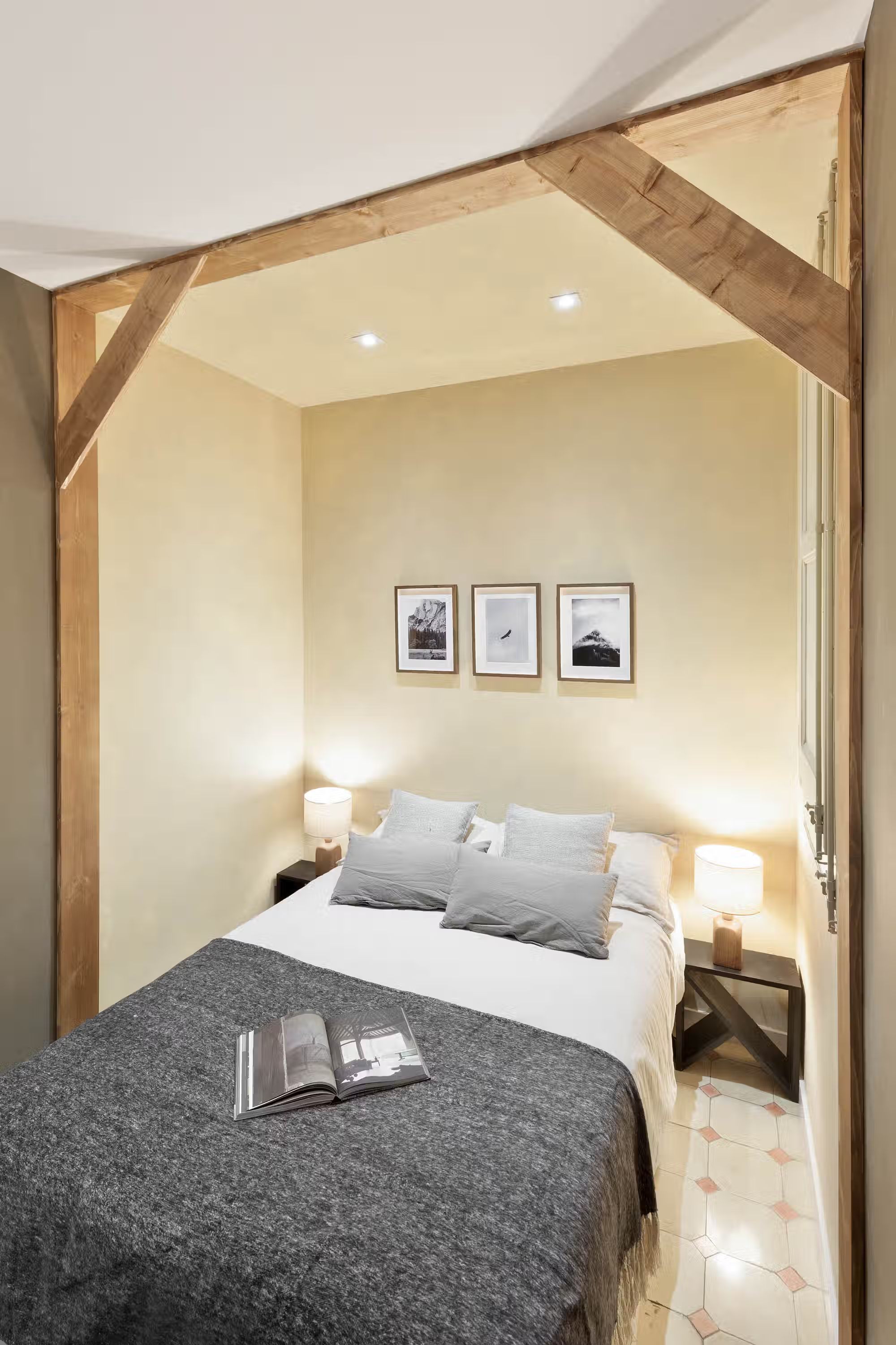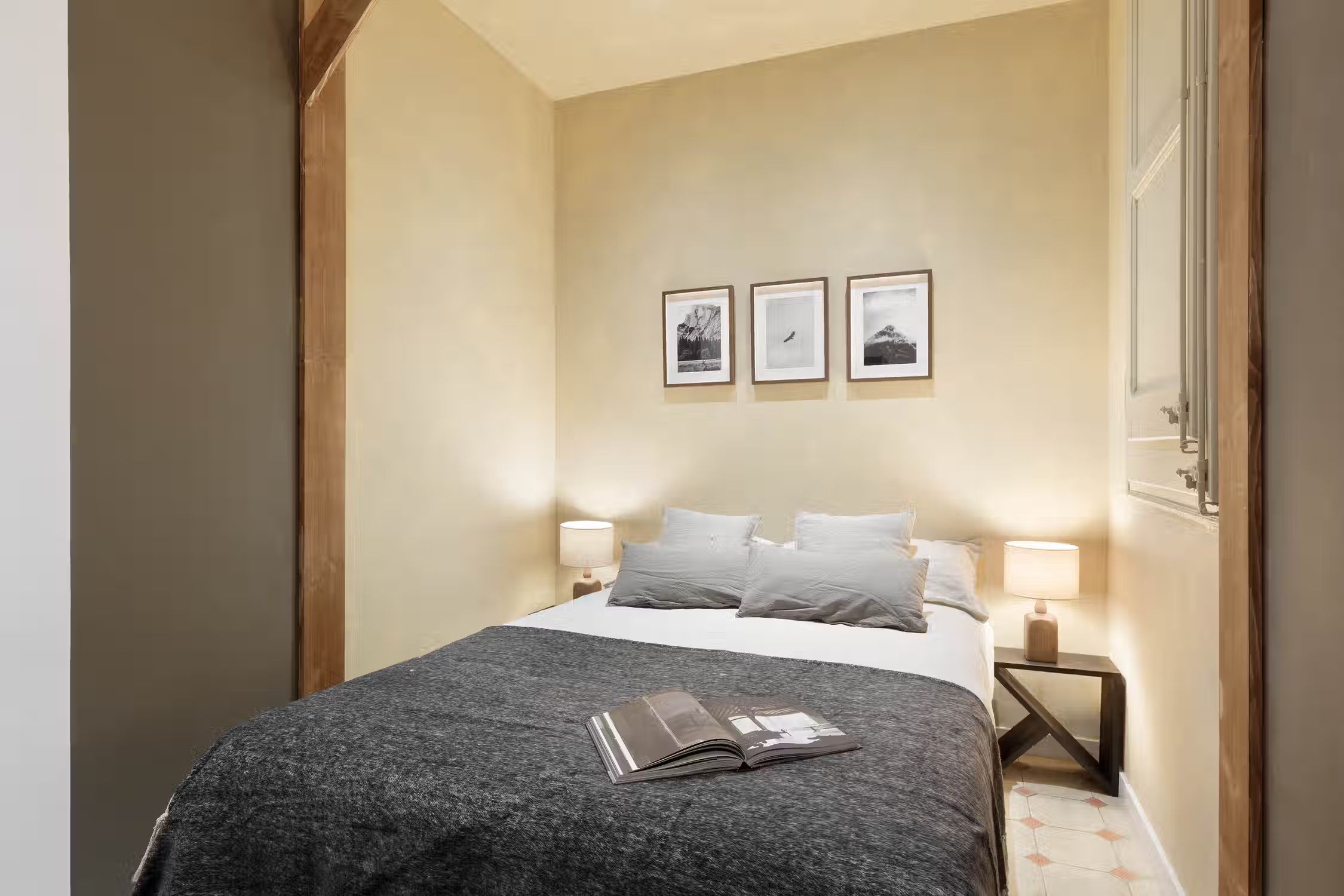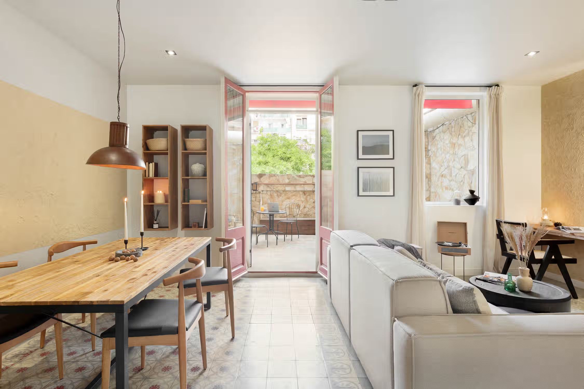 Welcome to Jaiz, a delightful mountain-themed apartment nestled in the heart of the L'Antiga Esquerra de l'Eixample neighborhood in Barcelona. Explore the captivating architecture of the city, indulge in delectable local cuisine, or simply immerse yourself in the energy and charm that Barcelona has to offer. With its warm and inviting ambiance, Jaiz offers a tranquil retreat for your stay in this vibrant city. Spanning 73 square meters, Jaiz features two tastefully furnished double bedrooms, each boasting a comfortable queen-size bed. The bedrooms provide a serene haven where you can unwind and rejuvenate after a day of exploration. The hanging light features and wooden beams evoke a feeling of mountain serenity from within the bedrooms. The apartment offers a well-appointed bathroom, ensuring convenience and privacy for all guests. The living room in Jaiz is thoughtfully designed with your comfort in mind. It features a dedicated workstation, providing a space where you can catch up on work or stay connected with loved ones. The dining table offers an inviting setting for enjoying meals together or planning your itinerary for the day. As you relax in the living room, you can easily access the expansive terrace, creating a seamless connection between indoor and outdoor living spaces. The fully furnished kitchen in Jaiz is equipped with modern appliances and offers ample counter space, making it a pleasure to prepare your favorite meals. Whether you're a seasoned chef or a novice cook, you'll find everything you need to whip up delicious dishes and create lasting memories around the dining table. As you explore Jaiz, you'll discover a dressing room, providing generous storage space for your belongings and allowing you to keep your living areas clutter-free and organized. To ensure your comfort throughout your stay, air conditioning is available in the living room, allowing you to create an ideal temperature for relaxation and rejuvenation. Fully furnished, this apartment comes with everything you need, including bedding and linens