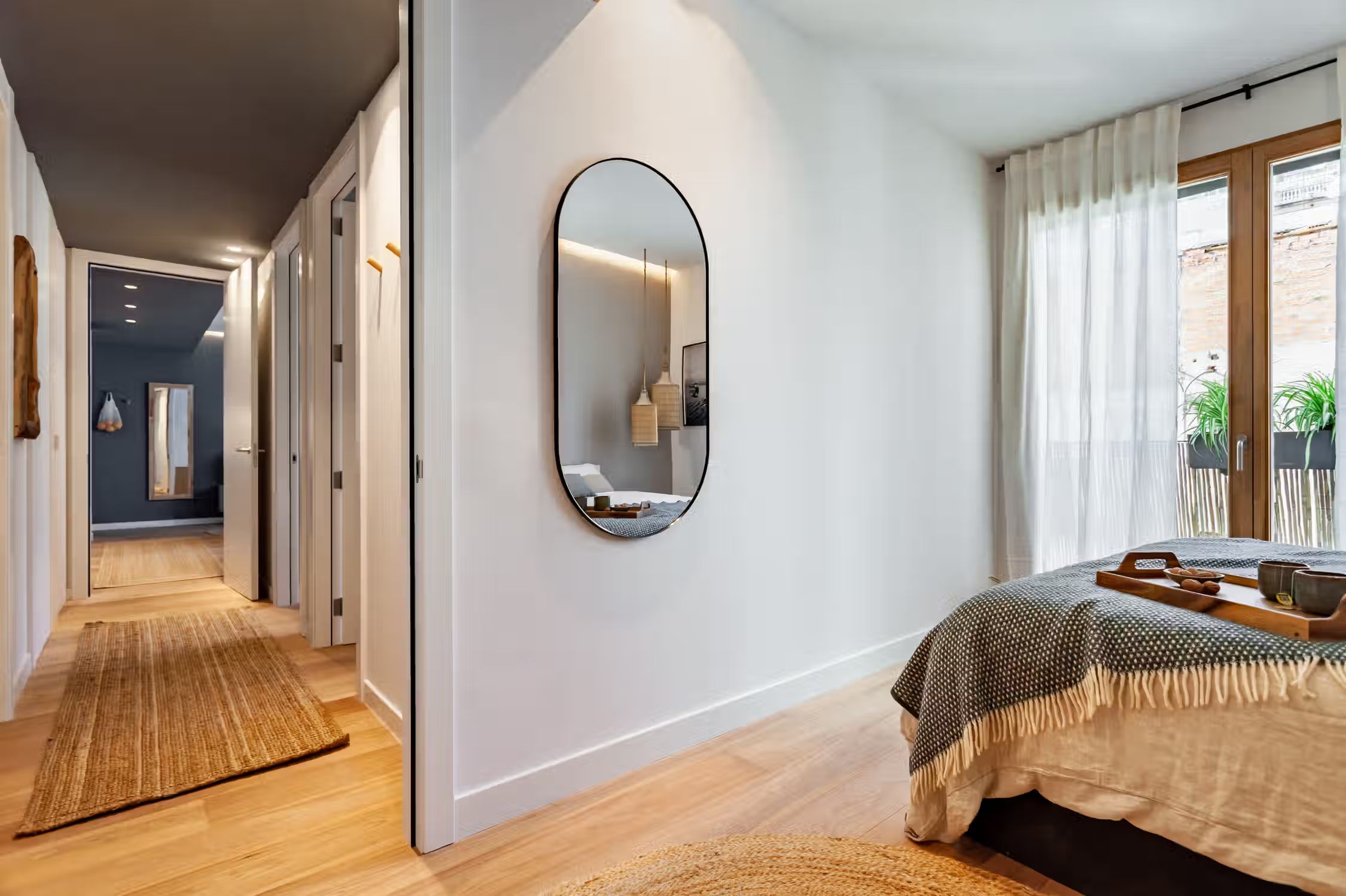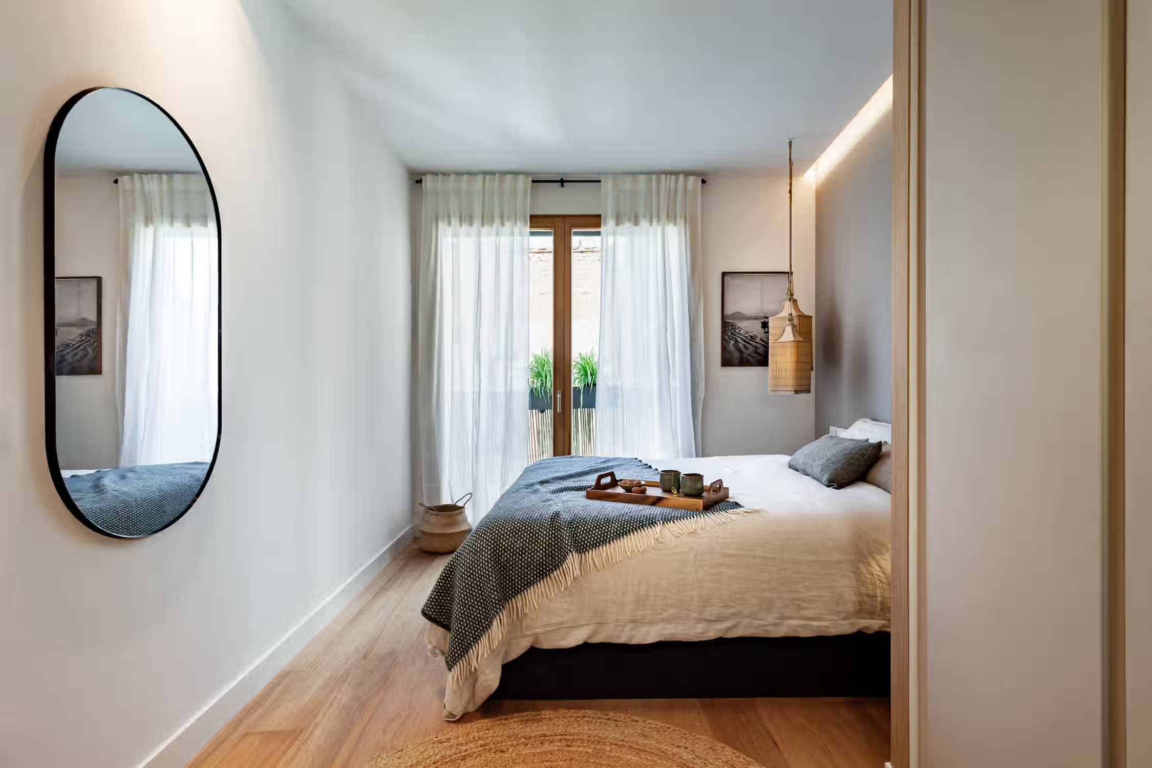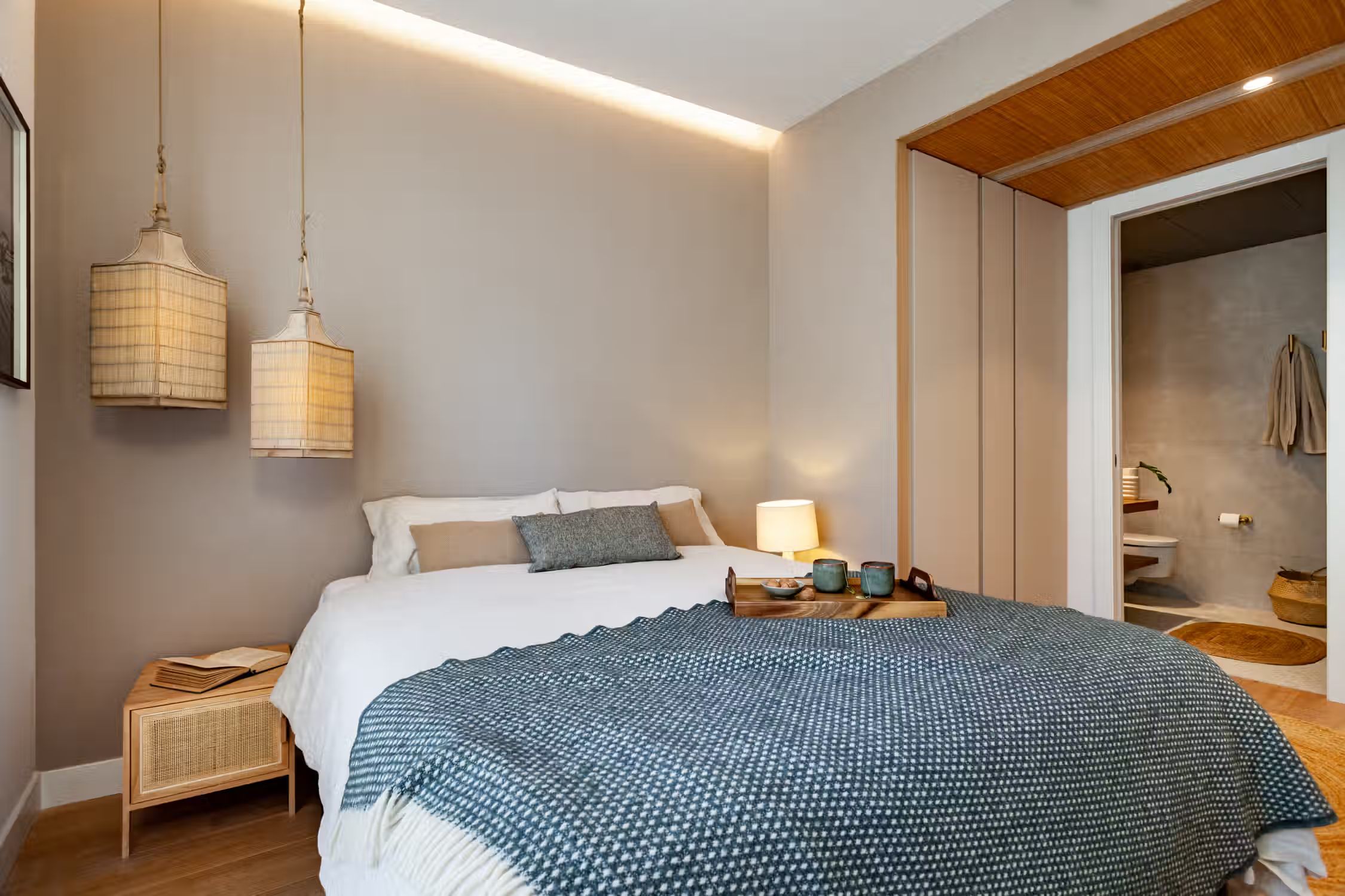 Weaving together Southeast Asian design with Catalonian classics, Oetune is a 65 square meter marvel. The awe continues from its interiors to outside the home in the lively Gracia neighborhood. Peruse the many local artisan shops or have a bite at any of the famed tapas bars. Barcelona boasts a majority of sunny days, which is aided by Oetune’s shared rooftop pool and solarium. Making a luminous first impression, Oetune offers an open-concept living and dining area at the very entrance. Nearest to the front door, a lounge area with designer furnishing and jute touches invites a sensation of entertainment. Cool blues remind guests of the Indonesian design roots with a large, handmade art piece hanging behind the seven-person dining set to the right of the room. Double French doors lead to the living room balcony. The wall opposite the French doors highlights the kitchen space. Modern appliances and sleek cabinetry are flush with the wall to create a well-concealed, yet fully-functional cooking area. Down the hallway, the first door to the left is Oetune’s office. Indonesian art hangs throughout the space, framing the dedicated workstation in the corner. Ample storage space resides nearest the office’s entry. The next door on the left is Oetune’s first bedroom. Perfectly suited for visitors, a single bed clothed in organic textiles sits to the right with built-in storage hanging overhead. Across the hall is Oetune’s detached bathroom. Travertine tile meets Catalonian-style flooring to create a spa-like space. The bathroom is complete with an all-glass, walk-in shower. At the end of the hall is the ensuite bedroom. Once through the bedroom doors, the right door leads to the attached bathroom. Mirroring the same luxury of the detached bathroom, this space also offers an all-glass, walk-in shower with a delightful tiling blend. Into the bedroom, themes of radiance take over with natural light coming in through the balcony on the left and creamy textiles covering the queen-sized bed. Built-in storage sits to the right of the bed. All bedding and linens are provided