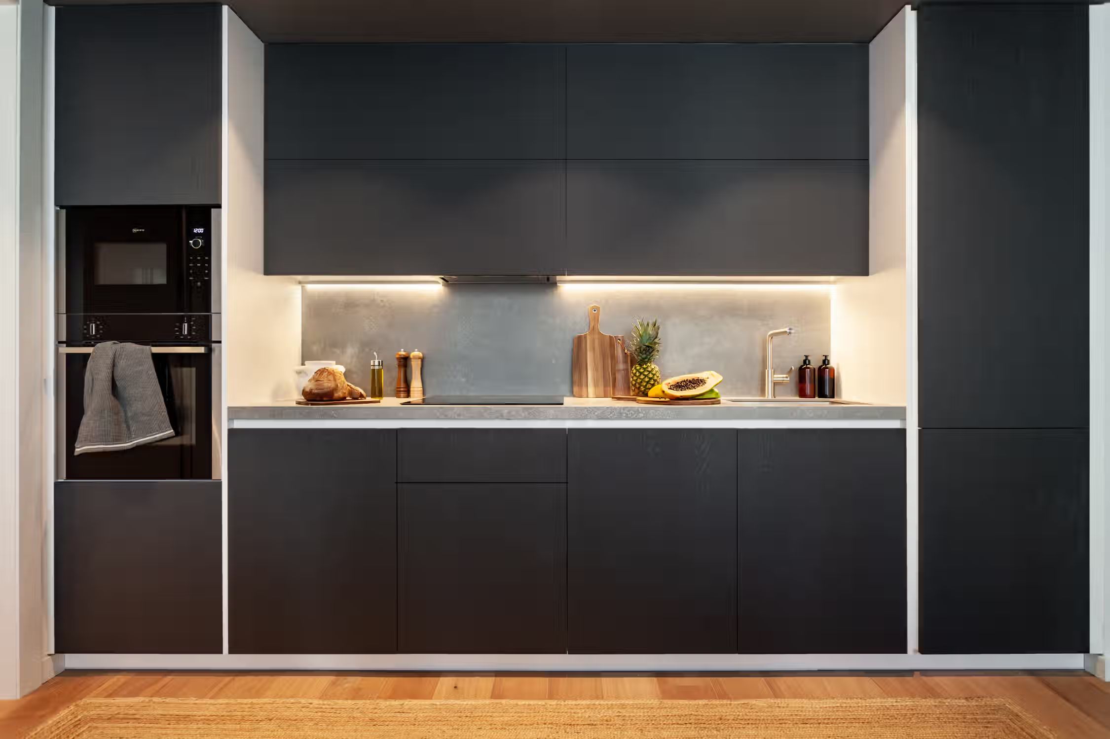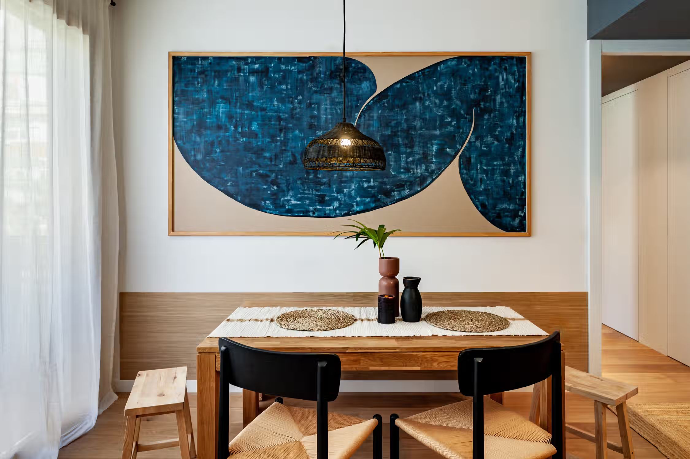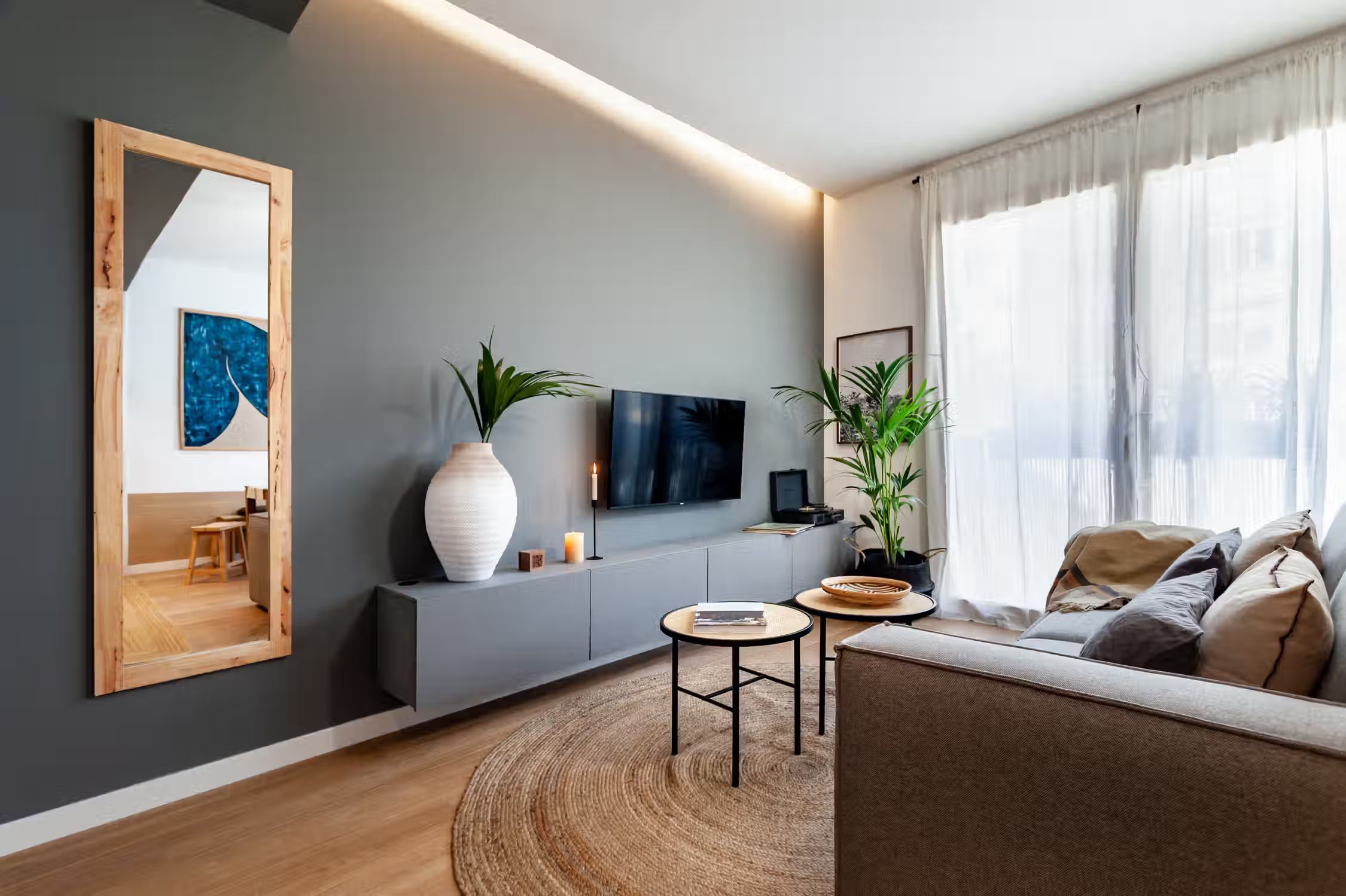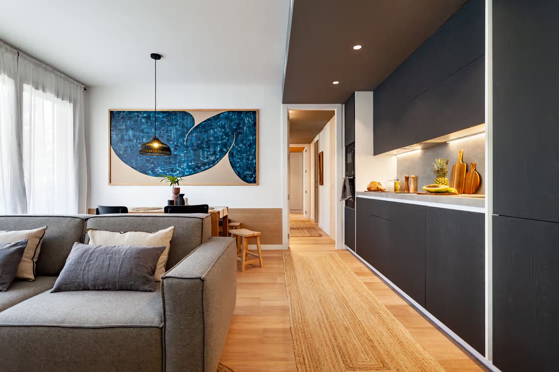 Weaving together Southeast Asian design with Catalonian classics, Oetune is a 65 square meter marvel. The awe continues from its interiors to outside the home in the lively Gracia neighborhood. Peruse the many local artisan shops or have a bite at any of the famed tapas bars. Barcelona boasts a majority of sunny days, which is aided by Oetune’s shared rooftop pool and solarium. Making a luminous first impression, Oetune offers an open-concept living and dining area at the very entrance. Nearest to the front door, a lounge area with designer furnishing and jute touches invites a sensation of entertainment. Cool blues remind guests of the Indonesian design roots with a large, handmade art piece hanging behind the seven-person dining set to the right of the room. Double French doors lead to the living room balcony. The wall opposite the French doors highlights the kitchen space. Modern appliances and sleek cabinetry are flush with the wall to create a well-concealed, yet fully-functional cooking area. Down the hallway, the first door to the left is Oetune’s office. Indonesian art hangs throughout the space, framing the dedicated workstation in the corner. Ample storage space resides nearest the office’s entry. The next door on the left is Oetune’s first bedroom. Perfectly suited for visitors, a single bed clothed in organic textiles sits to the right with built-in storage hanging overhead. Across the hall is Oetune’s detached bathroom. Travertine tile meets Catalonian-style flooring to create a spa-like space. The bathroom is complete with an all-glass, walk-in shower. At the end of the hall is the ensuite bedroom. Once through the bedroom doors, the right door leads to the attached bathroom. Mirroring the same luxury of the detached bathroom, this space also offers an all-glass, walk-in shower with a delightful tiling blend. Into the bedroom, themes of radiance take over with natural light coming in through the balcony on the left and creamy textiles covering the queen-sized bed. Built-in storage sits to the right of the bed. All bedding and linens are provided