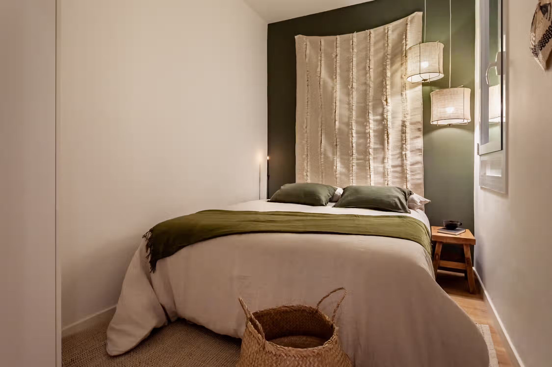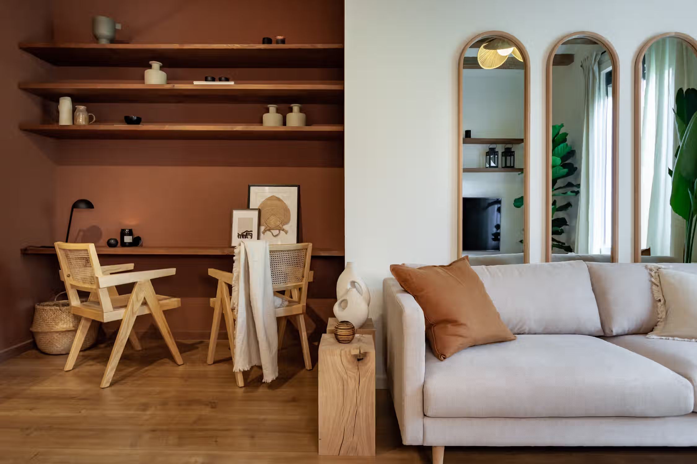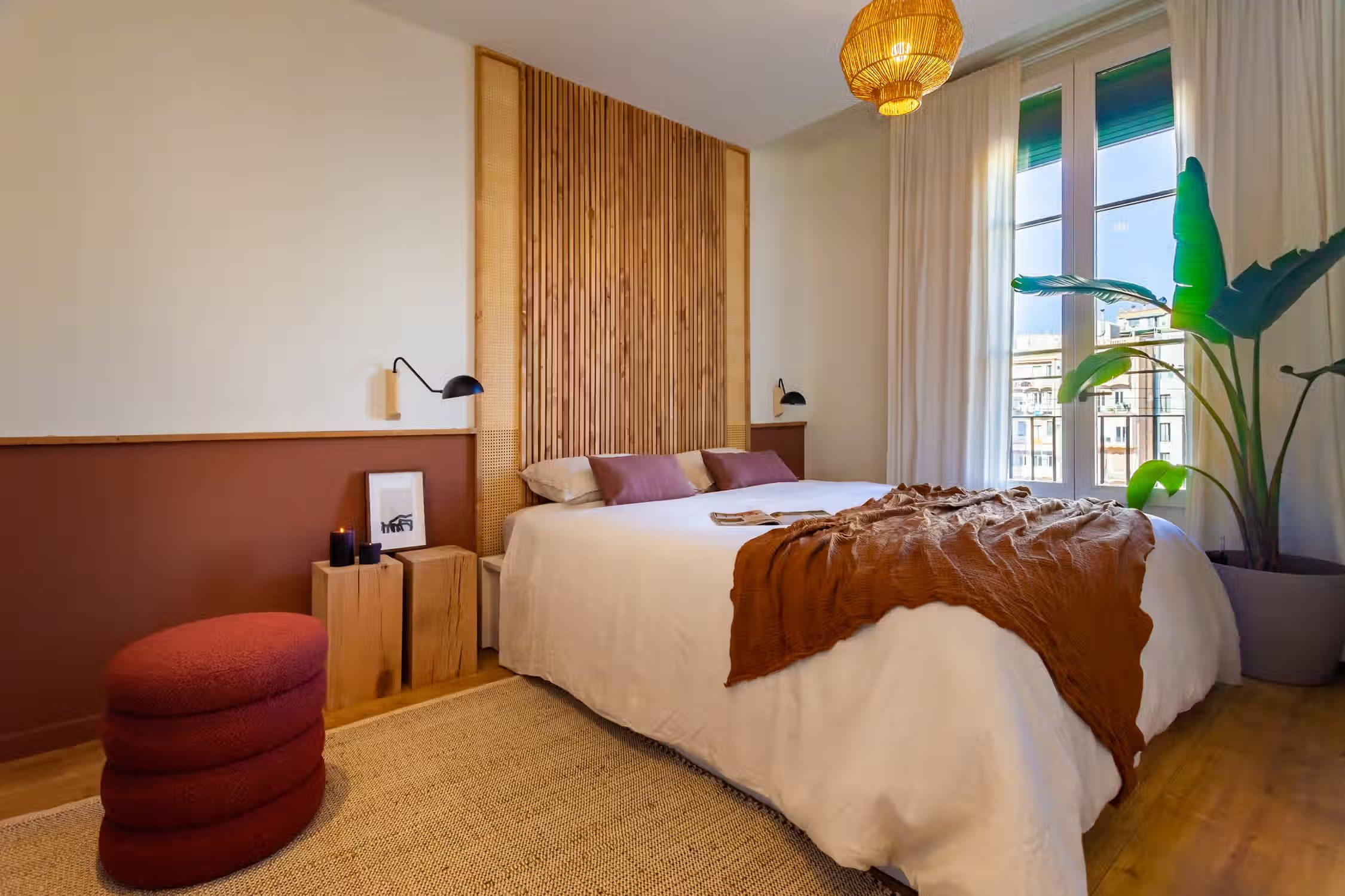 inspired by desert landscapes, uses burnt orange tones with a rustic design throughout the 75 square meter space. The apartment has 2 bedrooms, 2 baths and 2 balconies. The open plan kitchen, featuring varnished wooden cabinets, has all cooking utensils and appliances. There is a sleek black round dining table between the kitchen and lounge area. An alcove, painted in red. serves as a work area with custom-made desk and and wooden shelves. The living room features a sofa facing Smart TV and vinyl bluetooth speakers, and leads to an outdoor balcony. The main bedroom is spacious with ensuite bathroom and ample storage. The queen-size bed has an impressive custom-made wooden headboard. There is access to a second balcony. The second bedroom is unique with a hand-made hanging fabric over the queen-sized bed. The second bathroom is in the hallway. For comfort, this apartment comes equipped with air conditioning in the Living Room and in one Bedroom. Both bathrooms have showers, and all bed & bath linens are provided