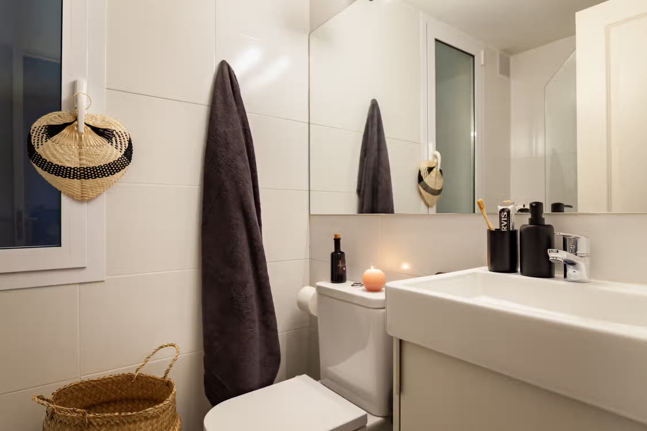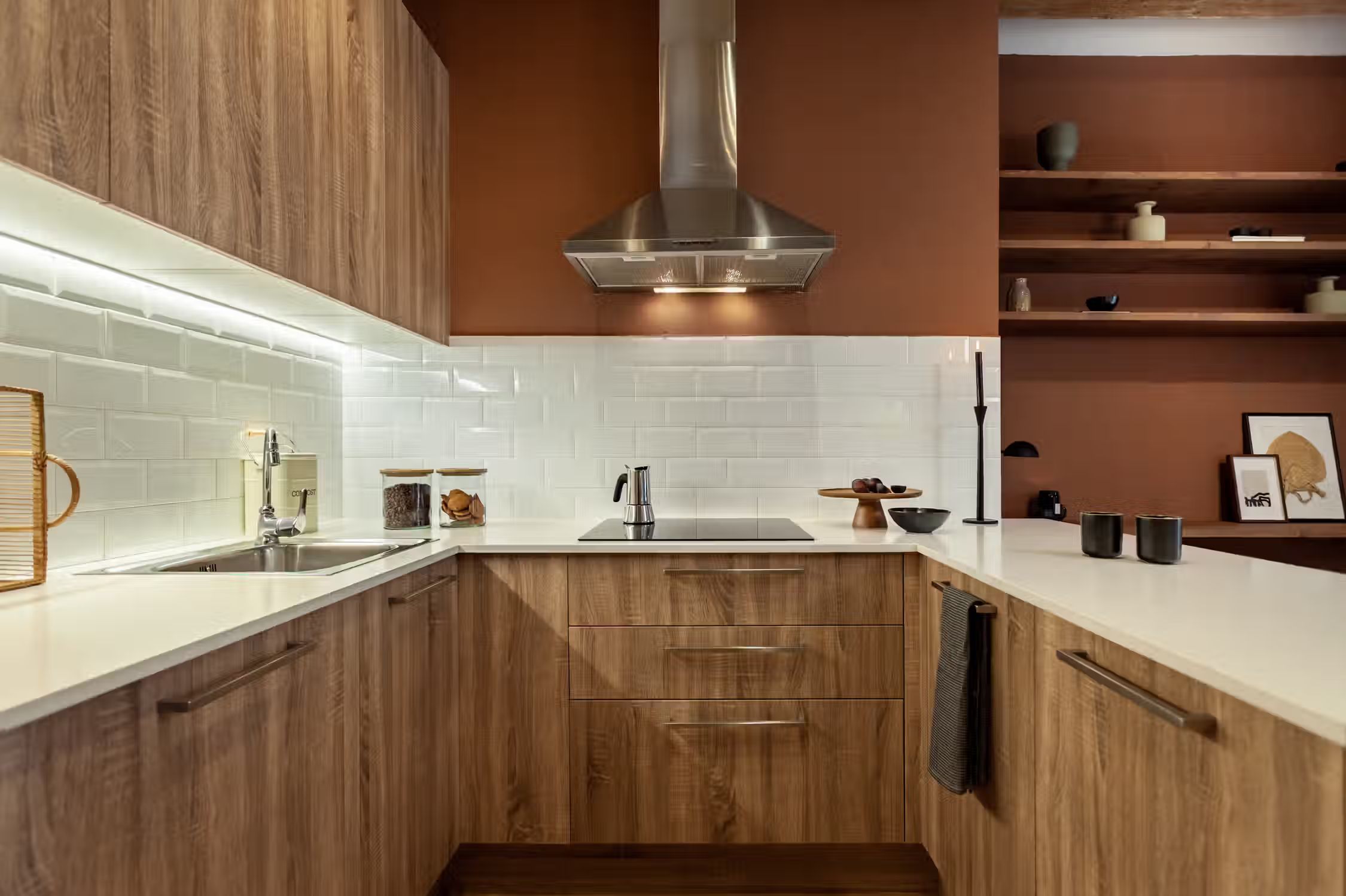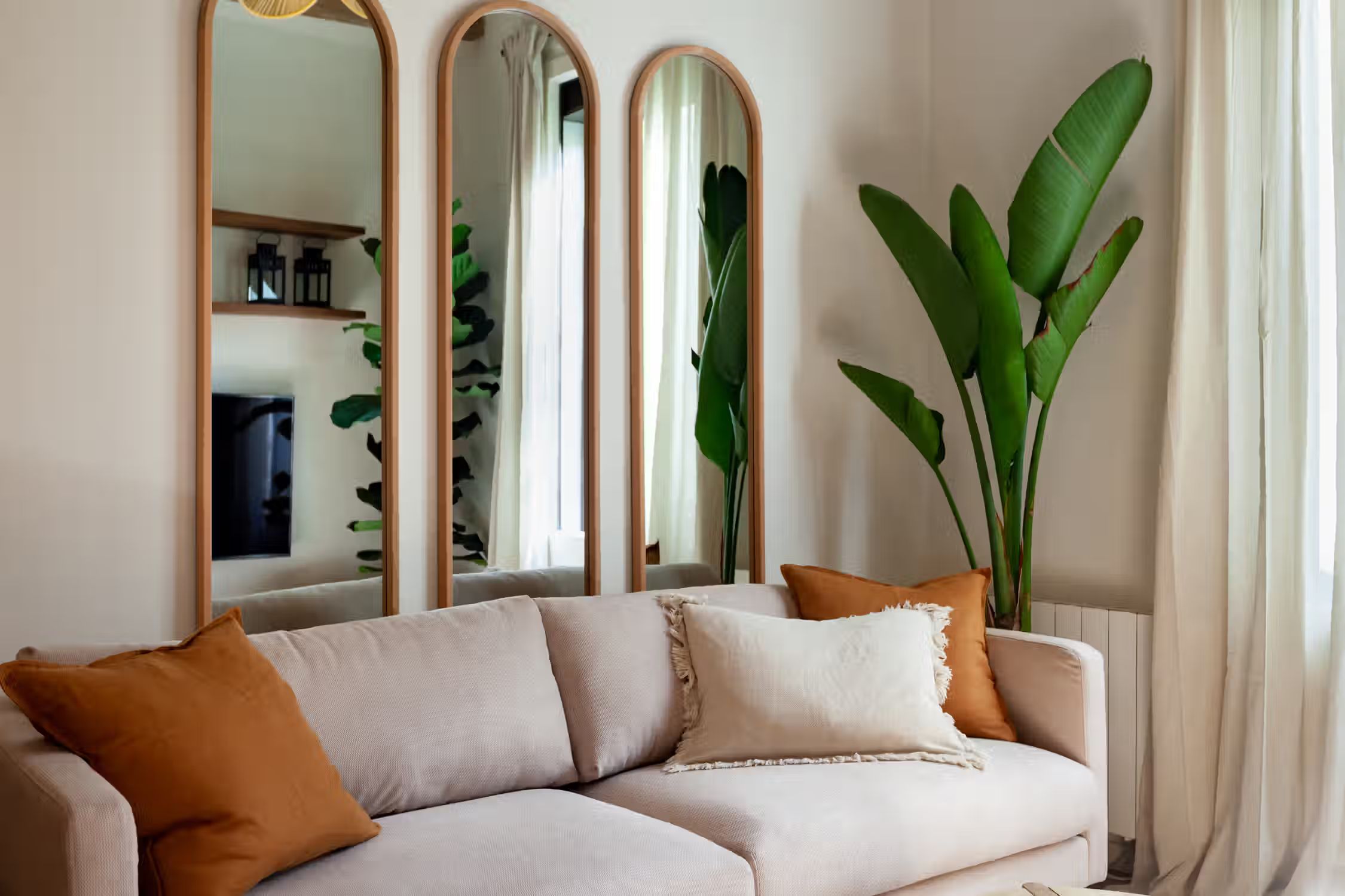 inspired by desert landscapes, uses burnt orange tones with a rustic design throughout the 75 square meter space. The apartment has 2 bedrooms, 2 baths and 2 balconies. The open plan kitchen, featuring varnished wooden cabinets, has all cooking utensils and appliances. There is a sleek black round dining table between the kitchen and lounge area. An alcove, painted in red. serves as a work area with custom-made desk and and wooden shelves. The living room features a sofa facing Smart TV and vinyl bluetooth speakers, and leads to an outdoor balcony. The main bedroom is spacious with ensuite bathroom and ample storage. The queen-size bed has an impressive custom-made wooden headboard. There is access to a second balcony. The second bedroom is unique with a hand-made hanging fabric over the queen-sized bed. The second bathroom is in the hallway. For comfort, this apartment comes equipped with air conditioning in the Living Room and in one Bedroom. Both bathrooms have showers, and all bed & bath linens are provided