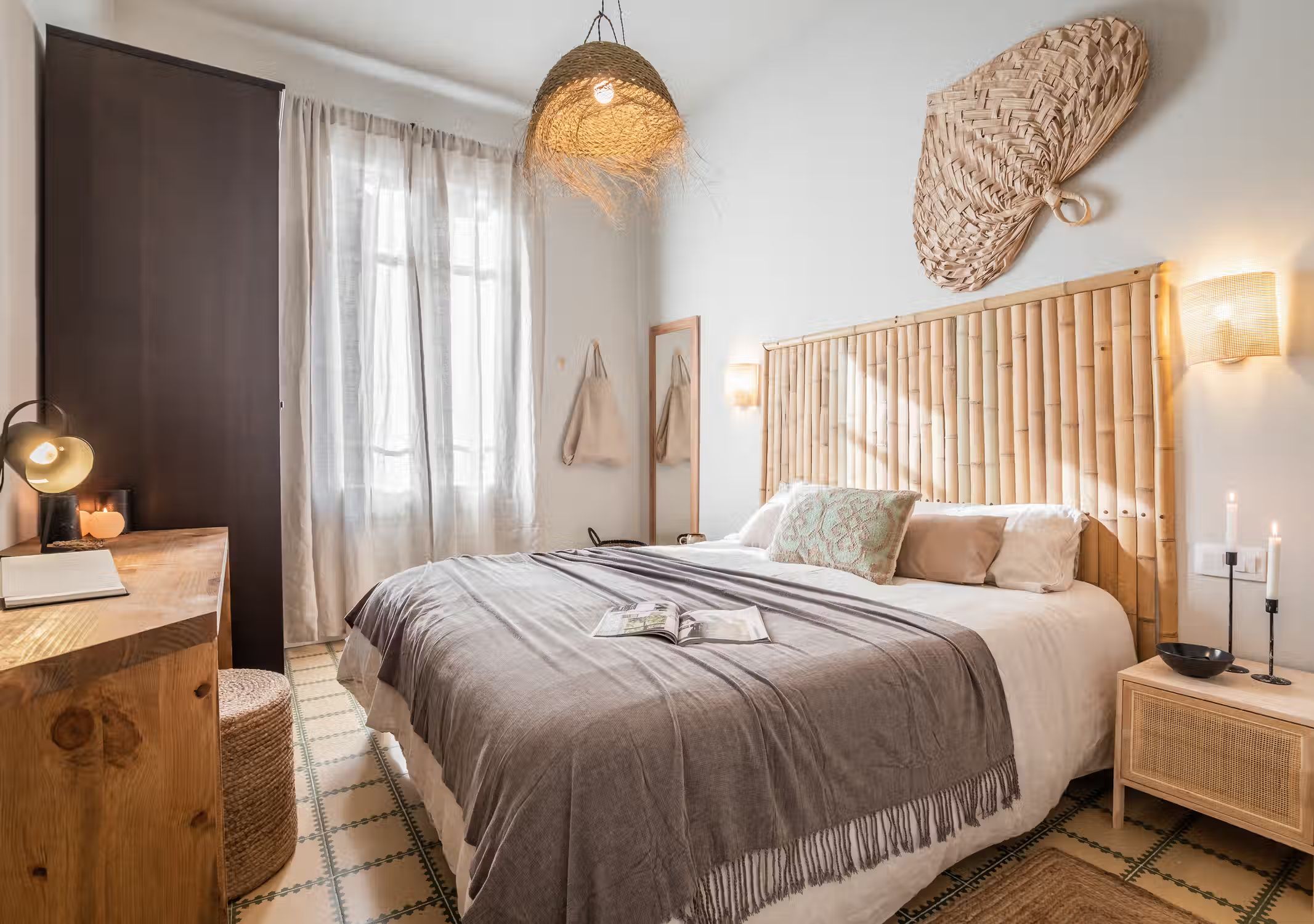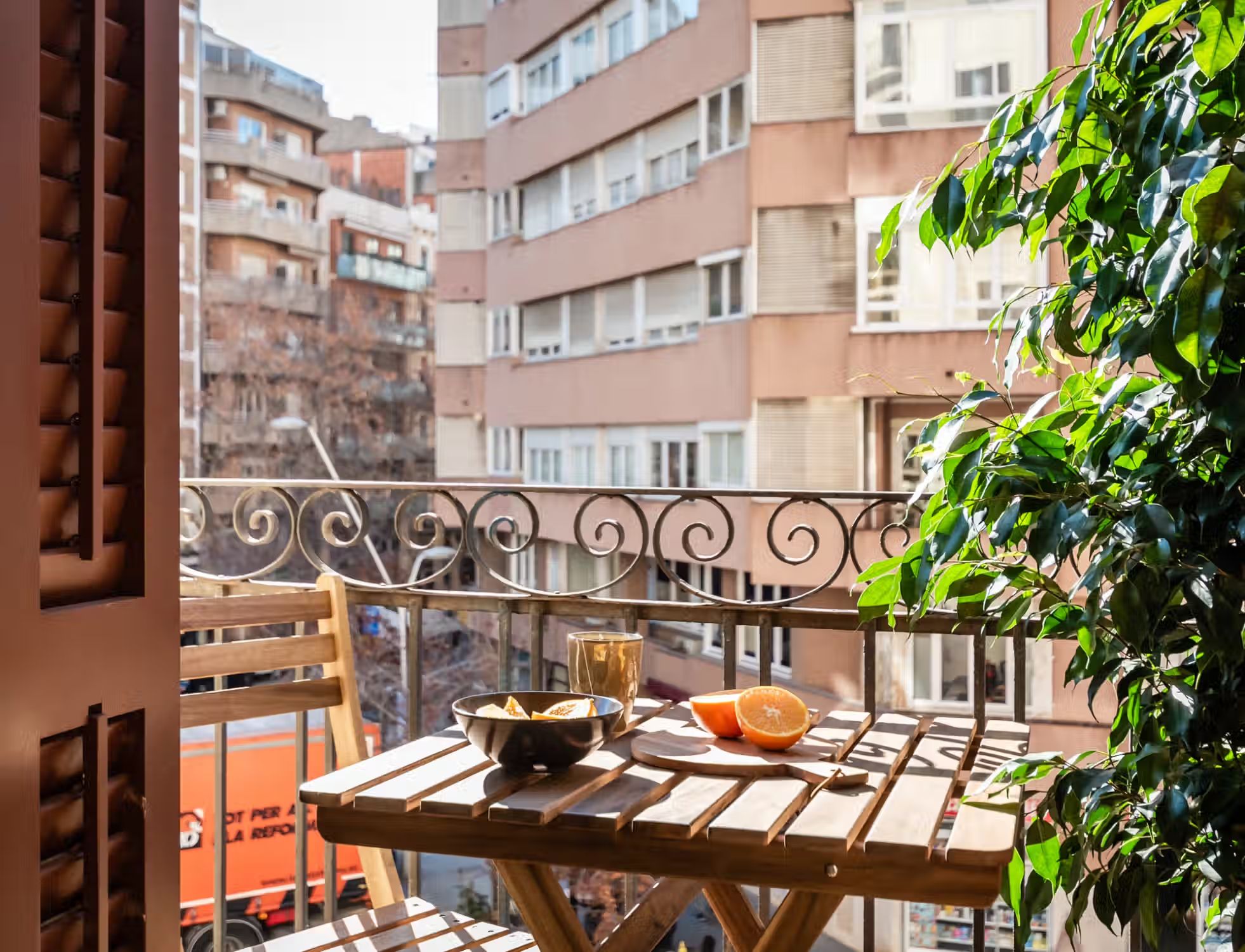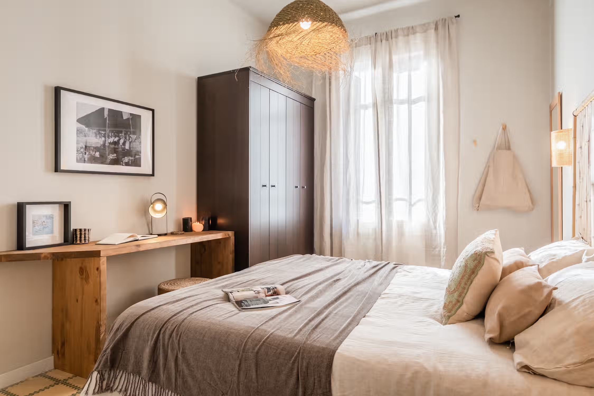 This two-bedroom, two-bath gem is perfectly positioned for the gastronomy-lover and culture-aficionado alike. Eixample is the neighborhood for exploration and recreation which is echoed both in the surrounding area of Tomini and within the space. Tomini’s style is as trendy as the neighborhood it resides in. Step inside this chic apartment to find 76 square meters of pure style and unmatched character pulling from Indonesian and Southeast Asian design elements. The first striking characteristic is the light cast from the sun-baked balcony. Step outside and indulge in the Barcelona cityscape views that Tomini offers. Round the corner of the entryway to find the first bedroom tucked away. This room boasts a queen-sized bed, abundant storage, and plush linens. Just across the hall is the first bath, complete with modern fixtures and a walk-in shower. The main hall leads to a fully-equipped kitchen that later opens up to a lofty living and dining room. Elements of old and new are fused, with the original Eixample-esque flooring and contemporary conversation pieces. The second bedroom is a showstopper. Transcend to tranquility or buckle down on productivity with the duality of this space. This ensuite highlights comfort with an elegantly styled queen-sized bed as well as peak performance with a stylish workspace. The second bedroom also features its own ensuite bathroom