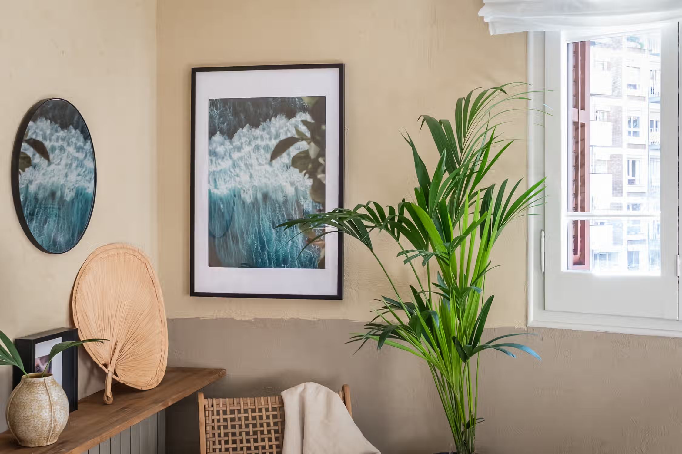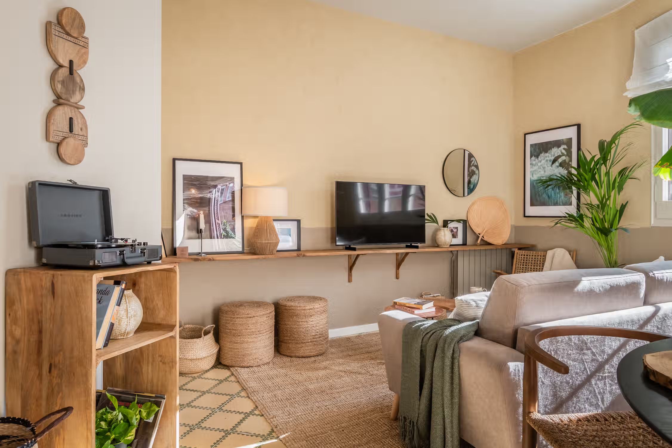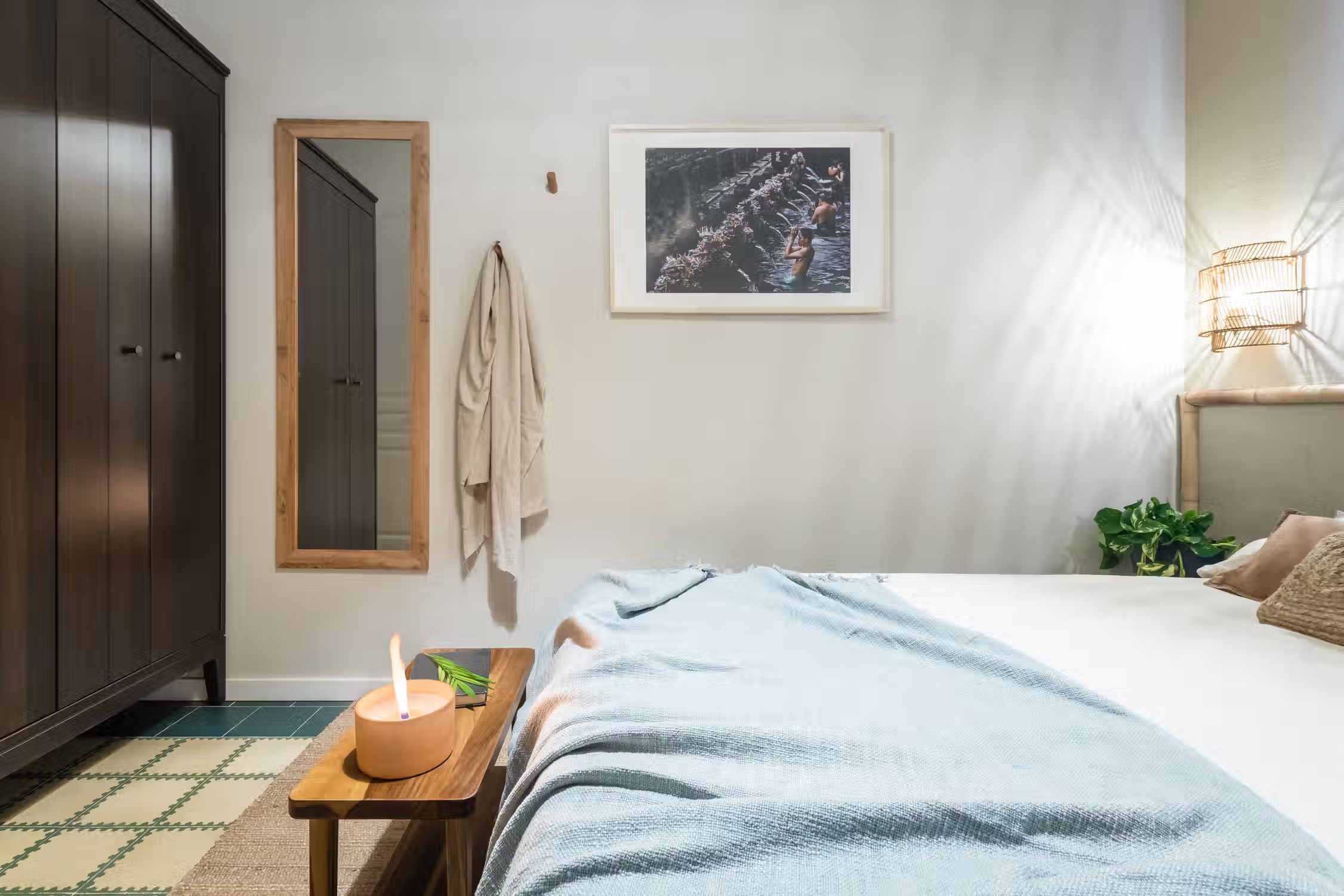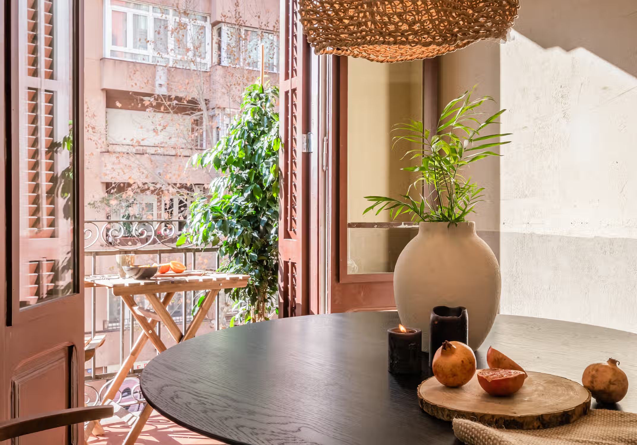This two-bedroom, two-bath gem is perfectly positioned for the gastronomy-lover and culture-aficionado alike. Eixample is the neighborhood for exploration and recreation which is echoed both in the surrounding area of Tomini and within the space. Tomini’s style is as trendy as the neighborhood it resides in. Step inside this chic apartment to find 76 square meters of pure style and unmatched character pulling from Indonesian and Southeast Asian design elements. The first striking characteristic is the light cast from the sun-baked balcony. Step outside and indulge in the Barcelona cityscape views that Tomini offers. Round the corner of the entryway to find the first bedroom tucked away. This room boasts a queen-sized bed, abundant storage, and plush linens. Just across the hall is the first bath, complete with modern fixtures and a walk-in shower. The main hall leads to a fully-equipped kitchen that later opens up to a lofty living and dining room. Elements of old and new are fused, with the original Eixample-esque flooring and contemporary conversation pieces. The second bedroom is a showstopper. Transcend to tranquility or buckle down on productivity with the duality of this space. This ensuite highlights comfort with an elegantly styled queen-sized bed as well as peak performance with a stylish workspace. The second bedroom also features its own ensuite bathroom