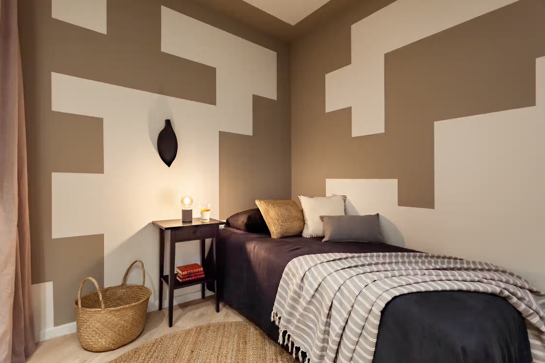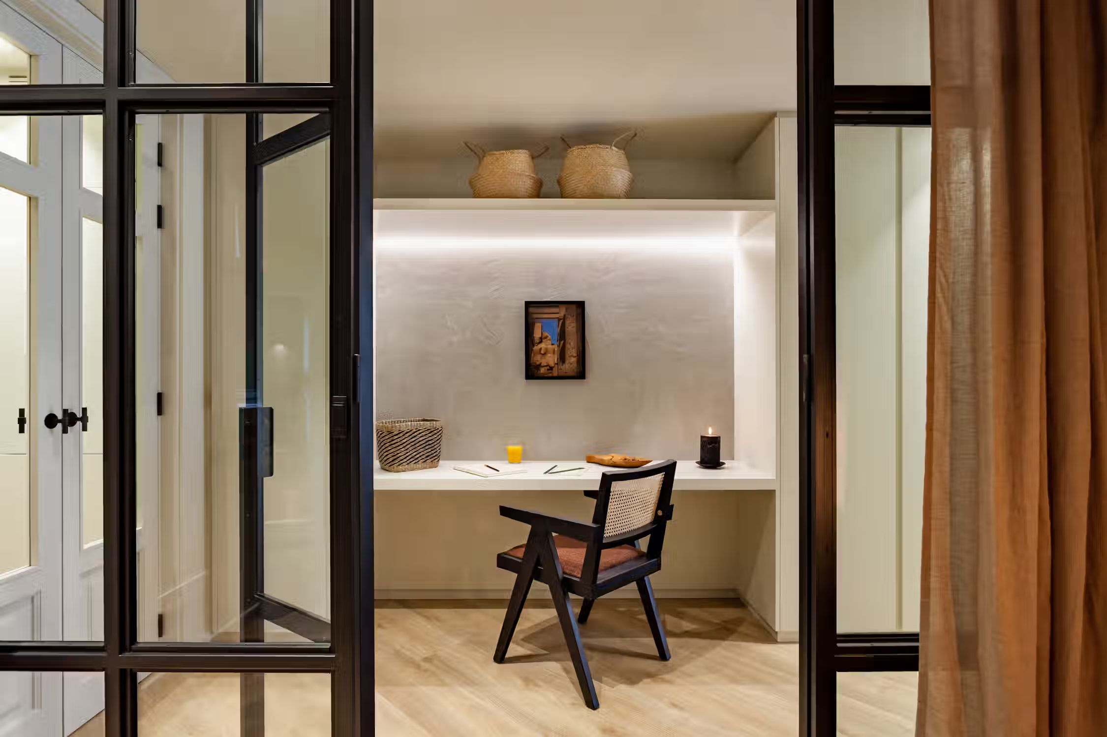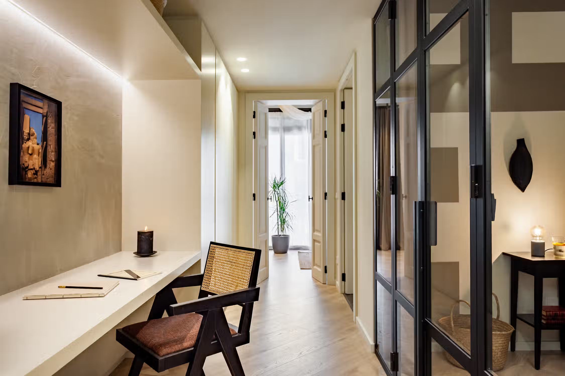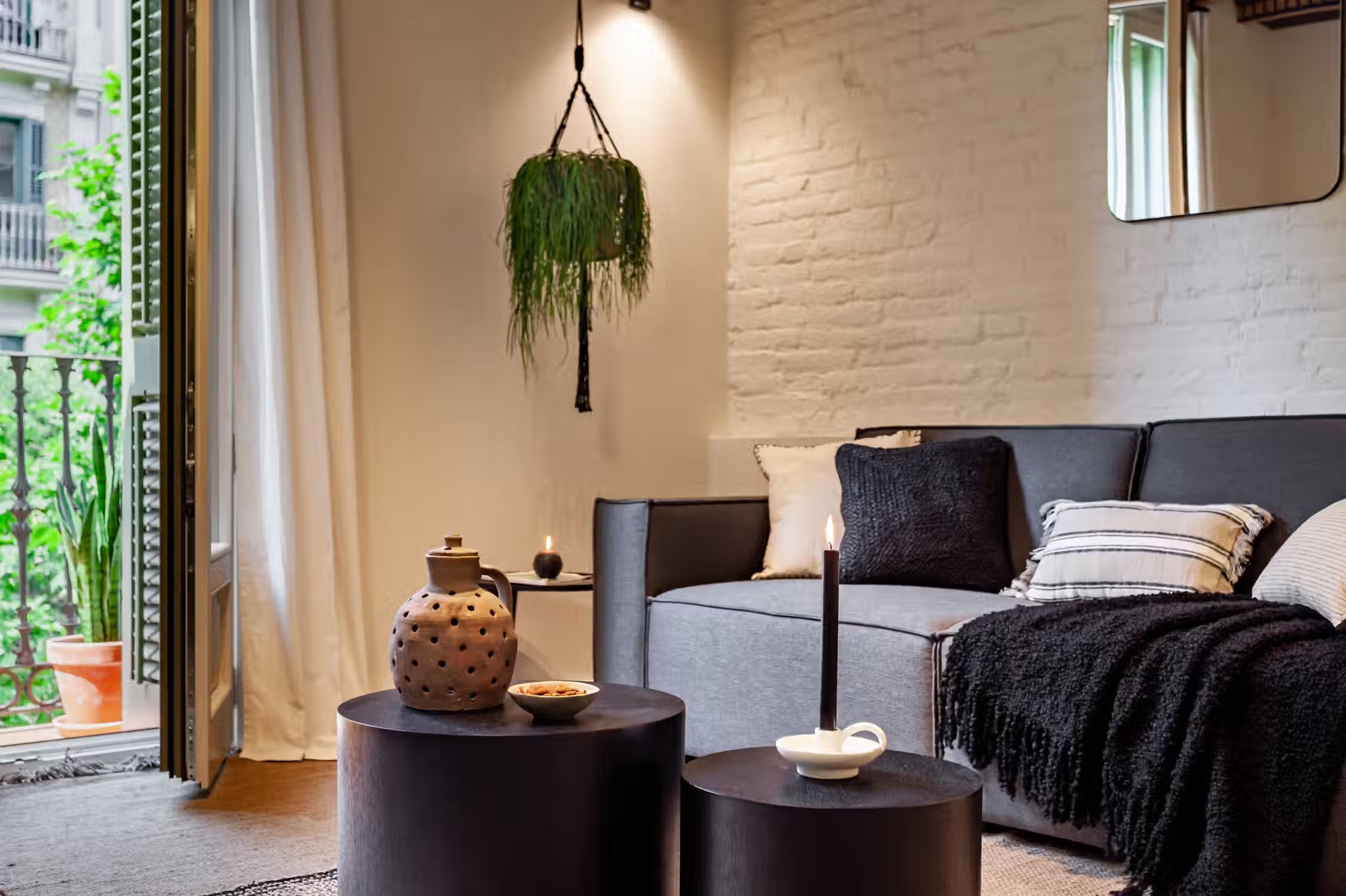 Step into Baharya’s living room with large window doors that open out to a small balcony, a white exposed-brick accent wall, and a gorgeous Saharan desert carpet. This 76 square meter desert-themed apartment tastefully packs in everything you need within its walls including a galley kitchen, a master double bedroom, a single room with a glass wall, one bathroom, a fully furnished kitchen, and a dedicated work space. This home comes with all of the furnishing you need, including bedding and linens, all of which match the desert toned features of Baharya. Light and breezy, this apartment allows for a taste of Barcelona’s Mediterranean climate right from the sofa