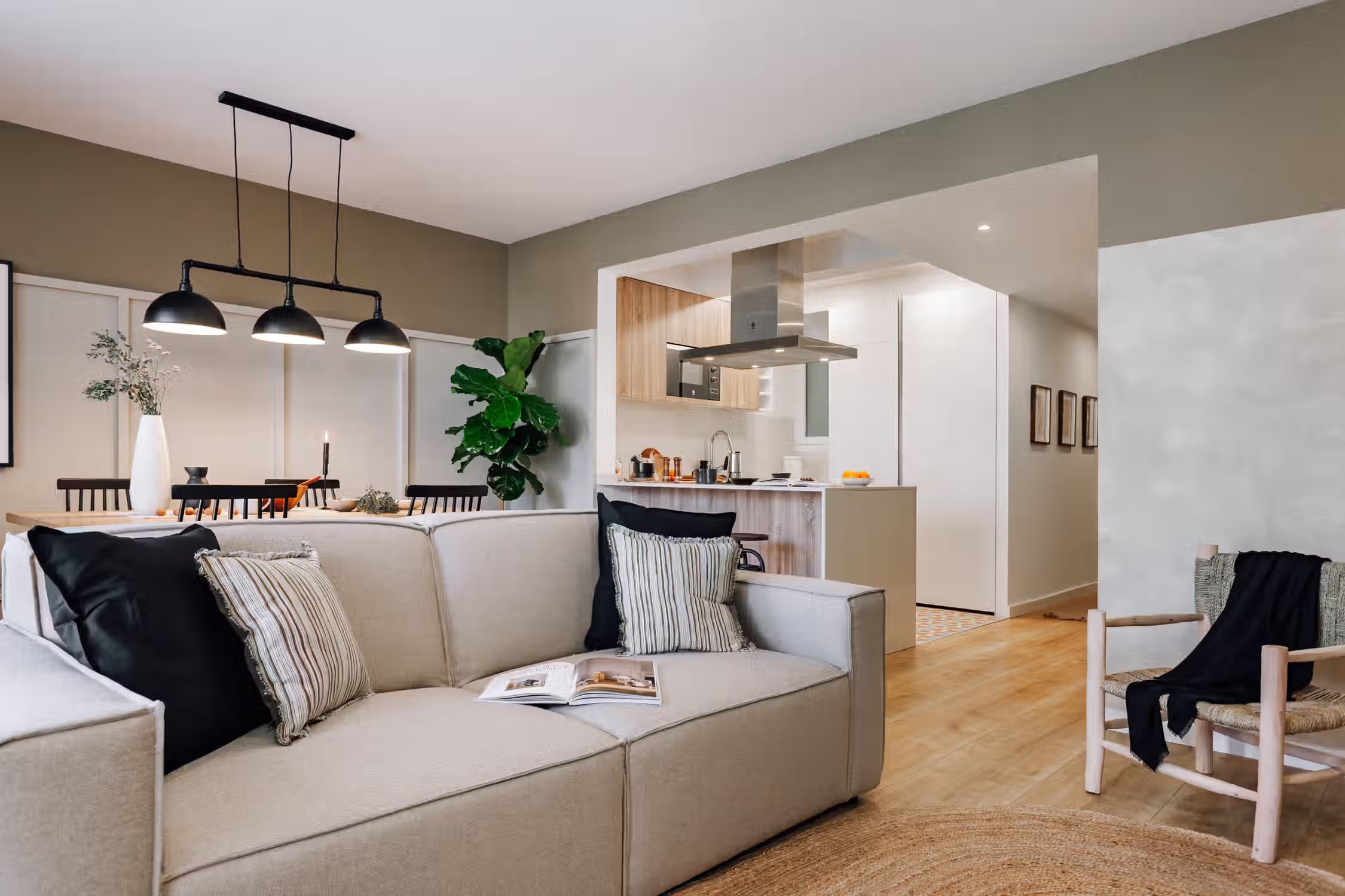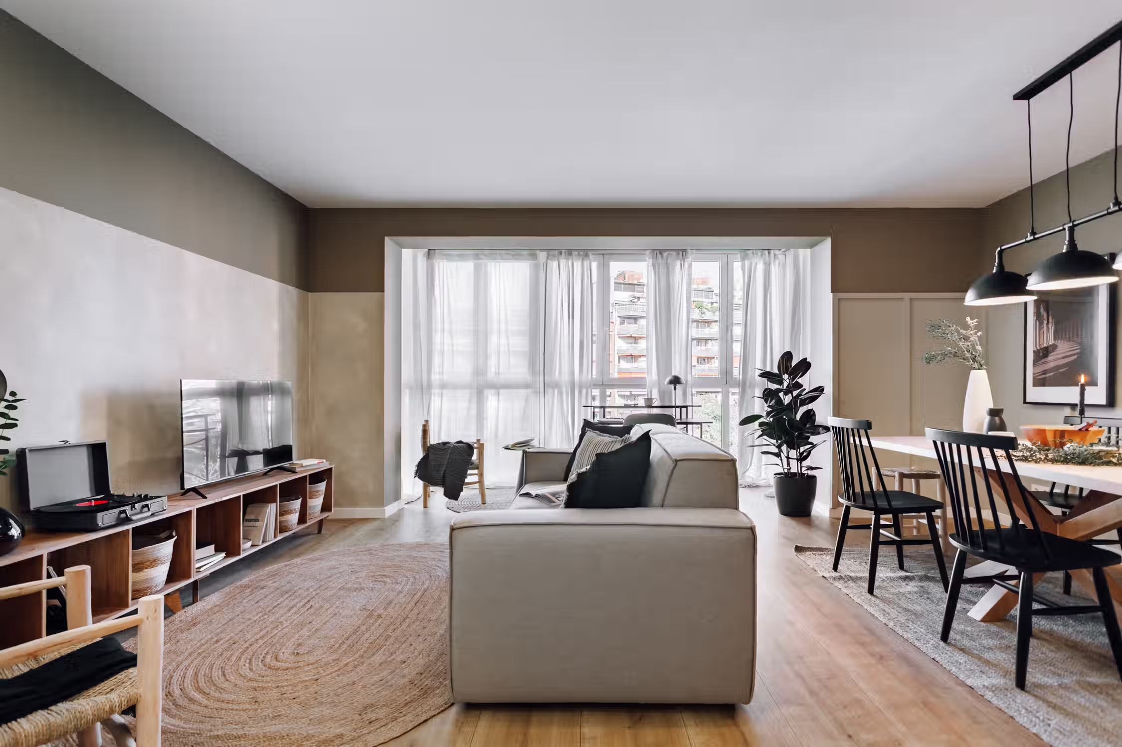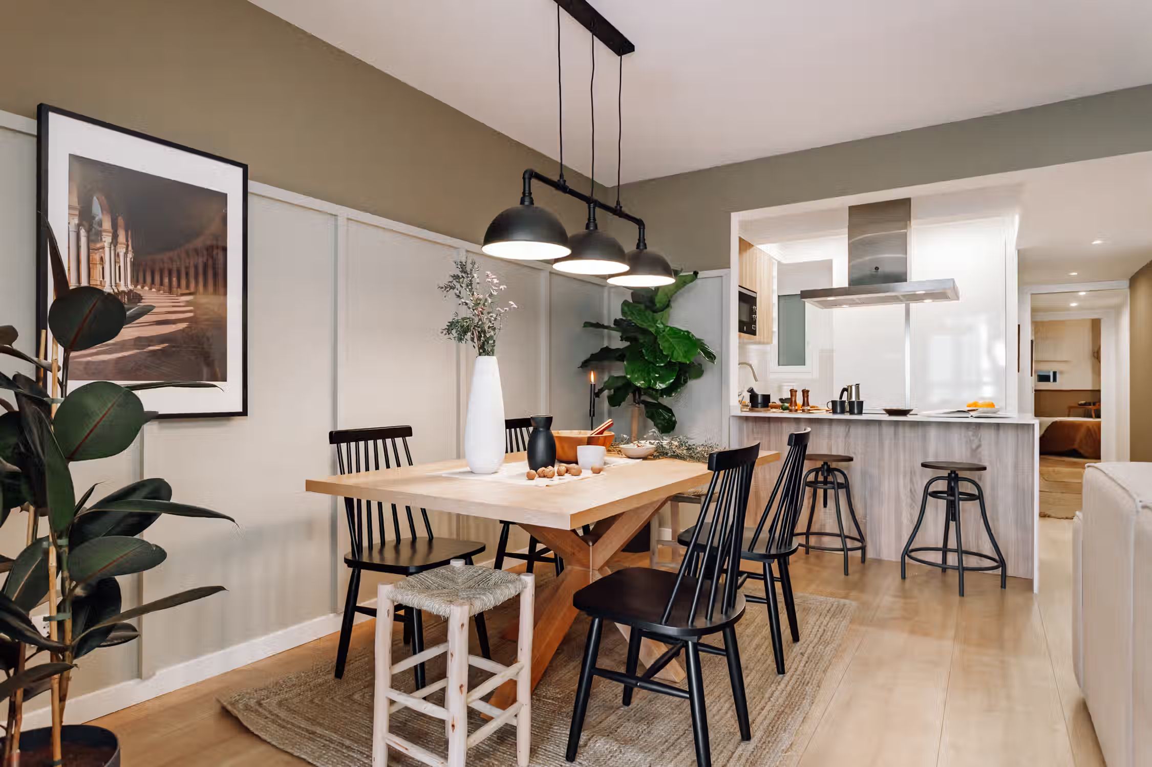 Elevate your stay in Barcelona with this two-bedroom furnished rental in the heart of Sant Antoni. The Loja apartment belongs to our special grassland line offering you grassy greens, burnt orange contrasts, and decorative plate designs. This home comes with a fully equipped kitchen, beddings and towels, and a work area perfect for digital nomads. What more could you ask for! Our in-house team of interior designers placed a lot of thought into this furnished rental in Barcelona. Whether you're lounging on a custom Ukio-fabricated couch or spending time in the kitchen, you'll never miss that 'home' feeling. This apartment also comes with HD television, high-speed internet, fresh linens and towels, and a Crosley vinyl and Bluetooth speaker. There is so much to love in this Sant Antoni apartment