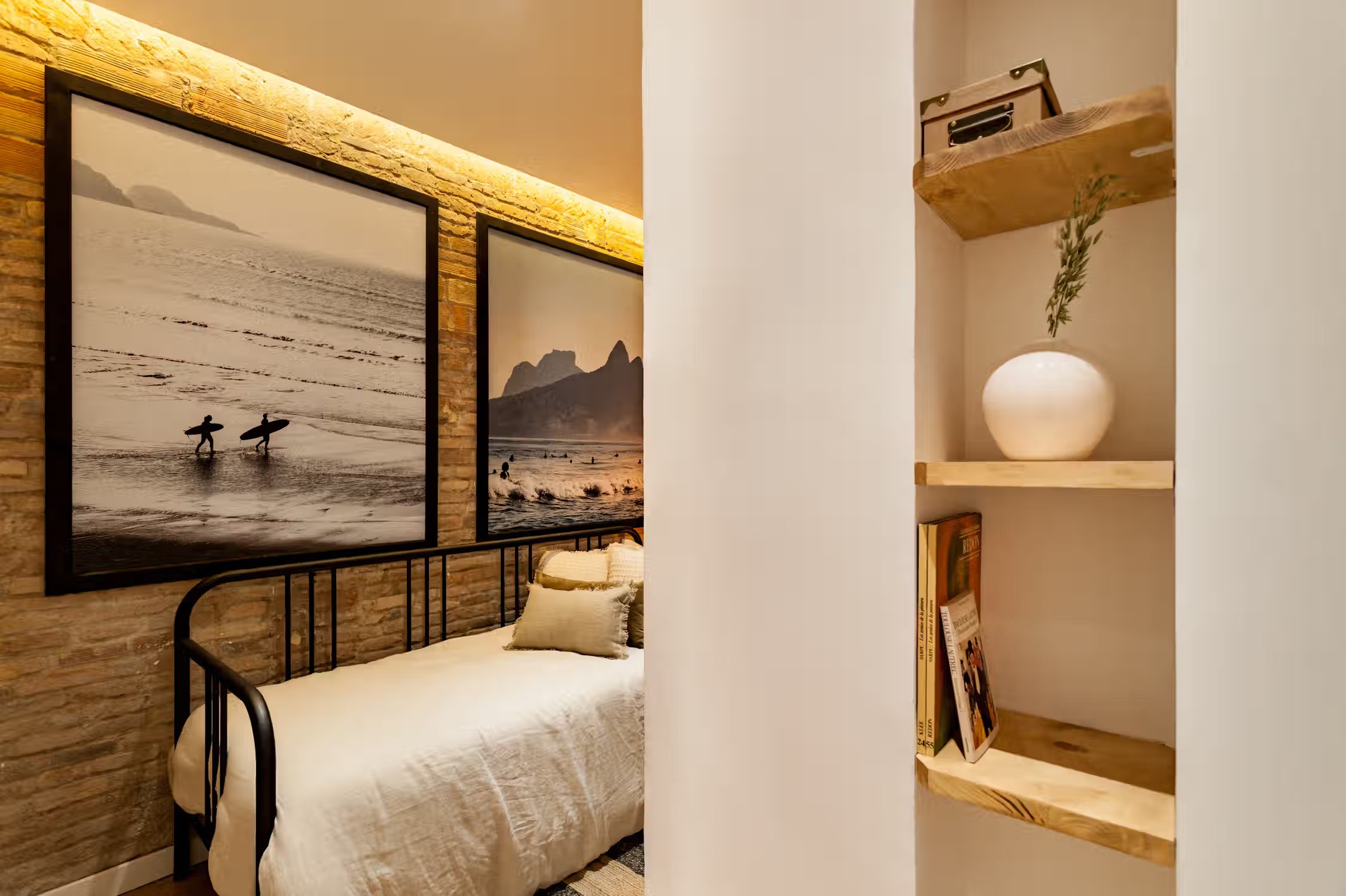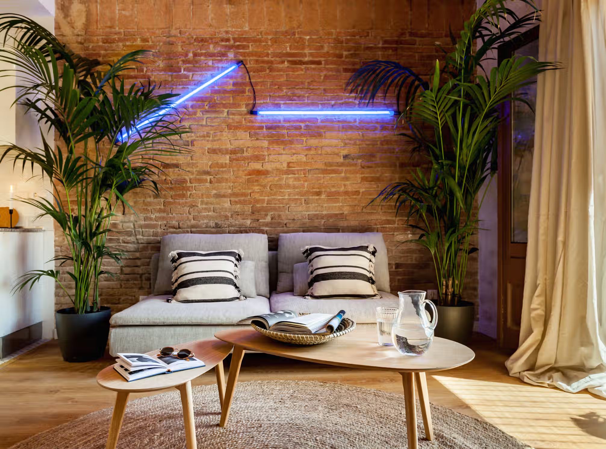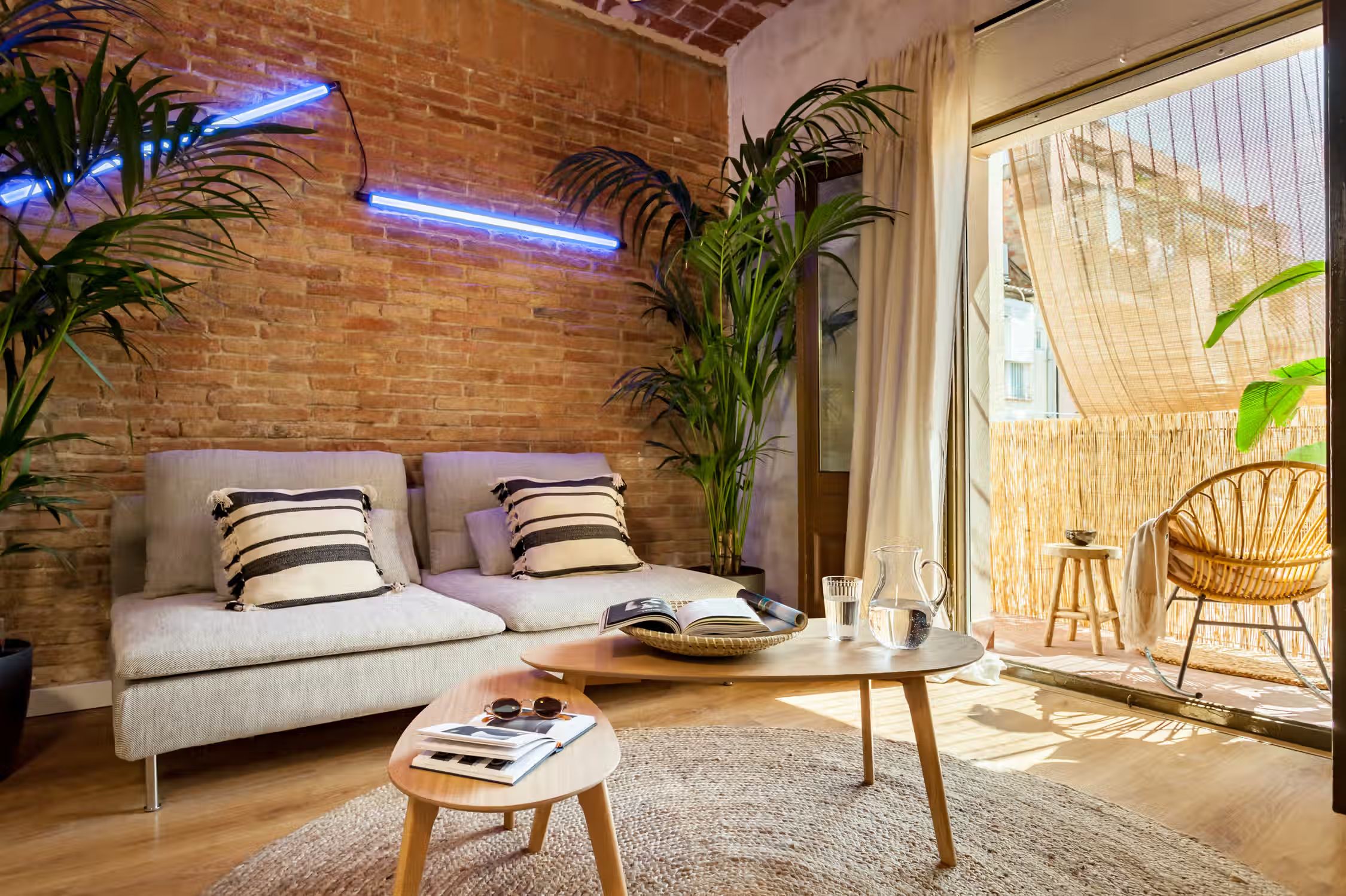 A cozy 2 bedrooms and 1 bath in the heart of Eixample Esquerra. This 62 sq meter flat boasts classic domed ceilings decorated with a mix of vibrant greenery and unique decor pieces. At the entrance, there is a custom built workstation, with desk and chair. The open plan kitchen comes with all cooking essentials and appliances. Find an array of different herbs to be used hanging on the column between kitchen and living room. There is a high compact dining table adjacent to the living area. Framed scenes of Brazilian beaches and a one-of-a-kind neon light structure adorn the walls of the lounge area. There is a balcony fitted with a chair and small round table right outside the living area. The master bedroom, fitted with a queen-sized bed, boasts natural light. Beige tones create a beachy atmosphere in the space. The bathroom comes with a full shower and fresh towels. Next to the bathroom, find a guest bedroom which has a pull-out sofa bed, ideal for visitors. For comfort, this apartment comes equipped with air conditioning in the Living room and fans in one Bedroom