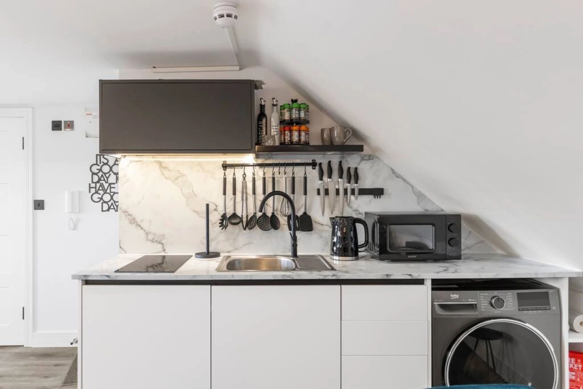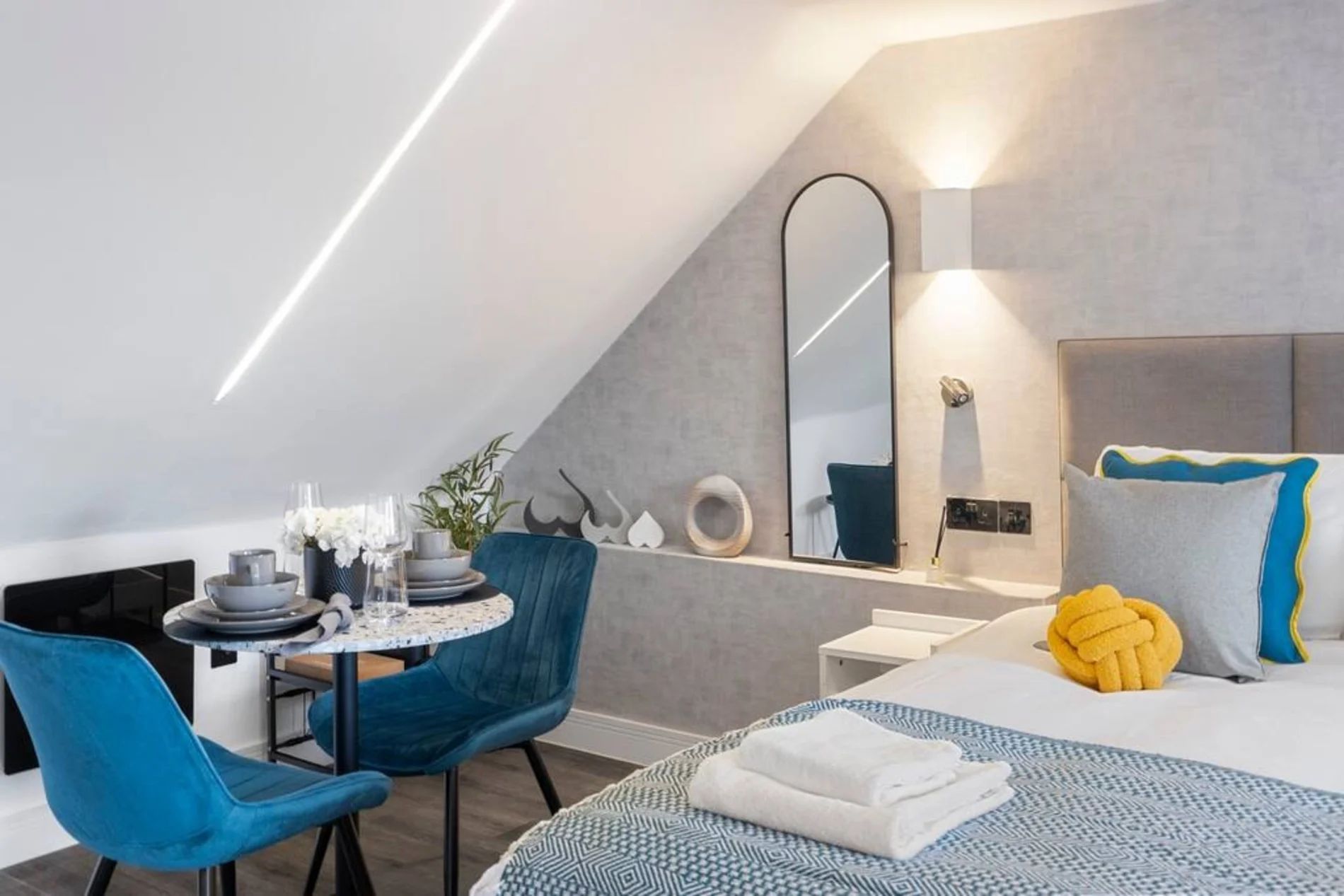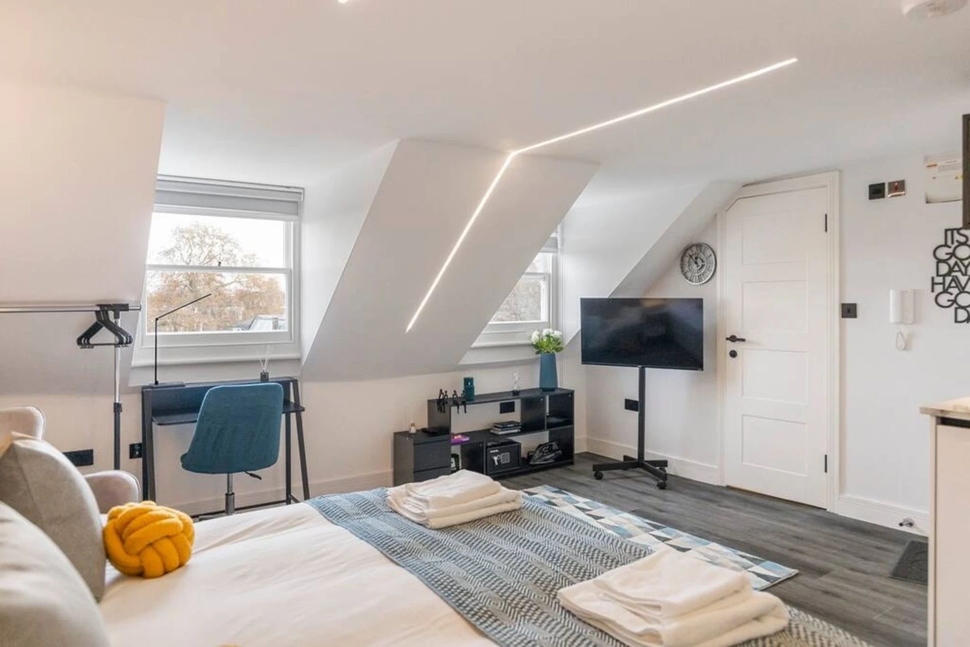 This charming studio nestled in the heart of Camberwell, just a stone's throw away from the picturesque Burgess Park. This thoughtfully decorated space is designed to provide you with a relaxing and rejuvenating stay, featuring pops of soothing turquoise and vibrant yellow that add a touch of warmth and cheerfulness. The studio's strategic location allows easy access to the vibrant atmosphere of Camberwell, with its eclectic mix of shops, cafes, and cultural attractions. The space The studio boasts a spacious interior that revolves around your comfort. The highlight is a luxurious king-sized bed, inviting you to unwind and indulge in a restful night's sleep. The decor creates a tranquil atmosphere, making it the perfect retreat after a day of exploring the vibrant streets of London. For those moments when you prefer a quiet night in, This well-equipped kitchen has everything you need to whip up quick and delicious meals that you can enjoy on the dining table.