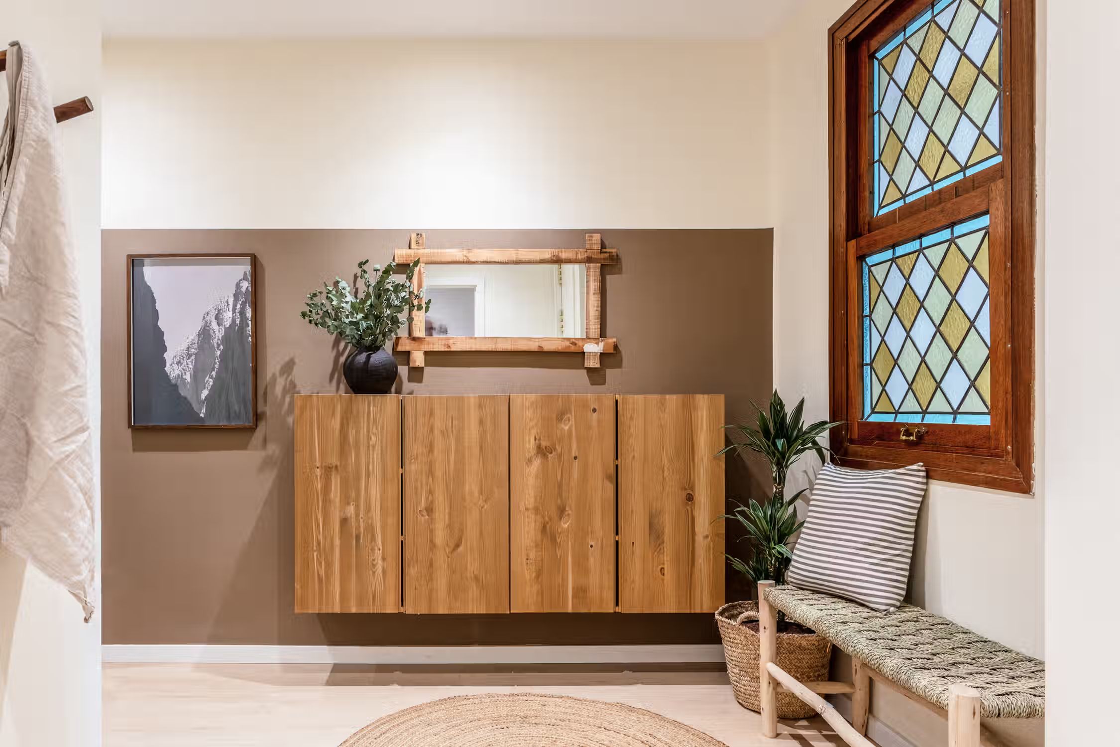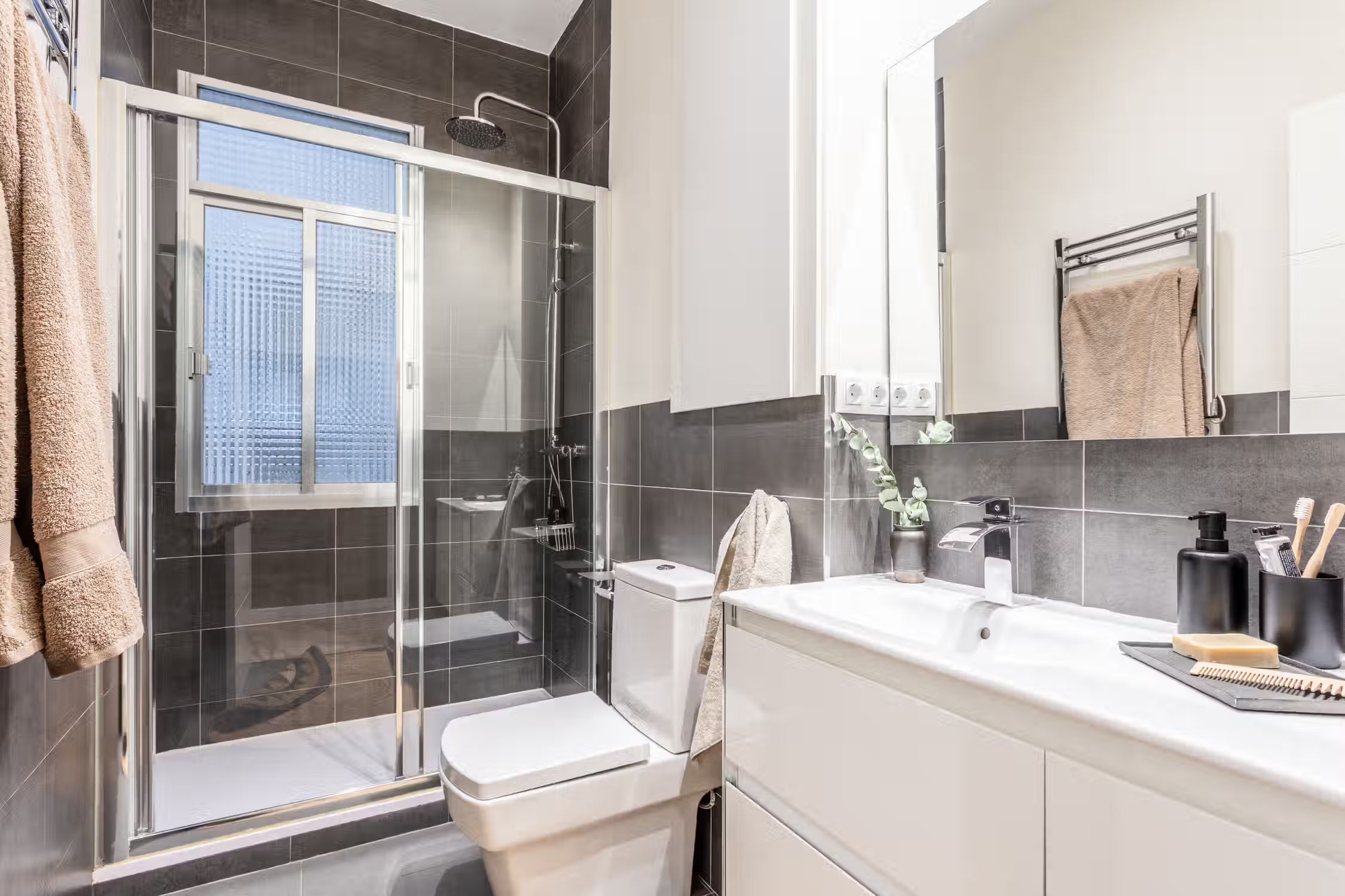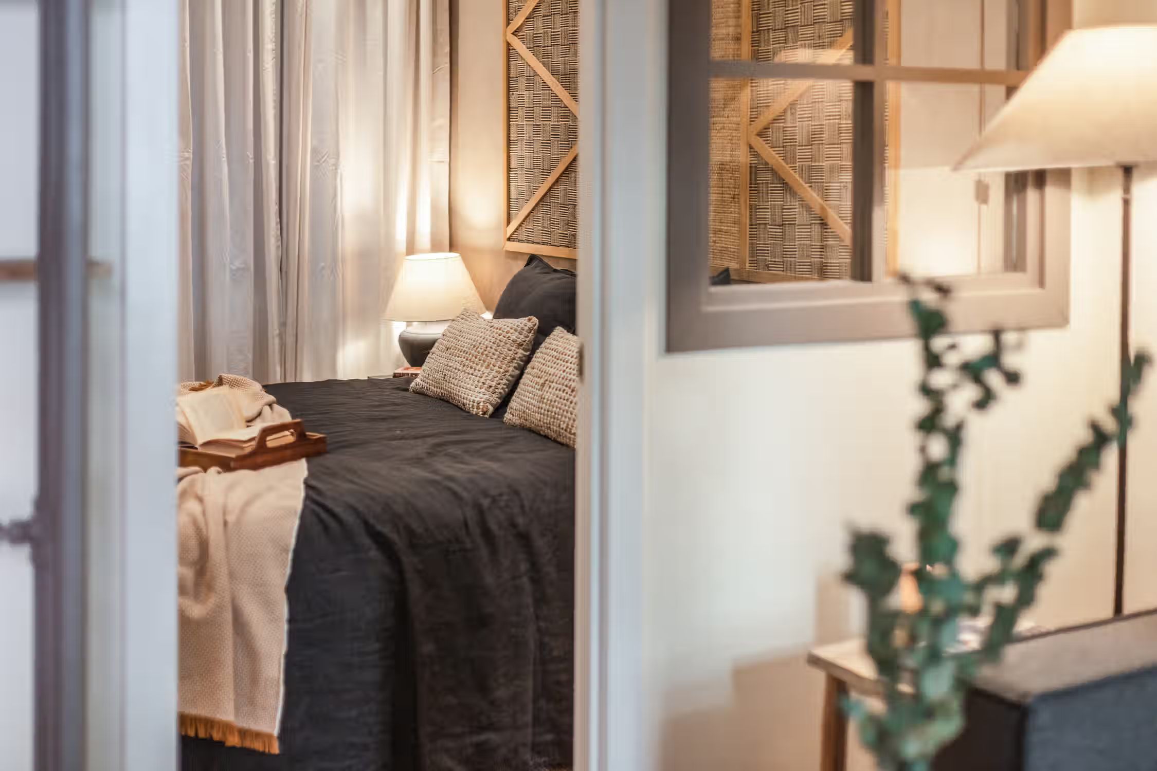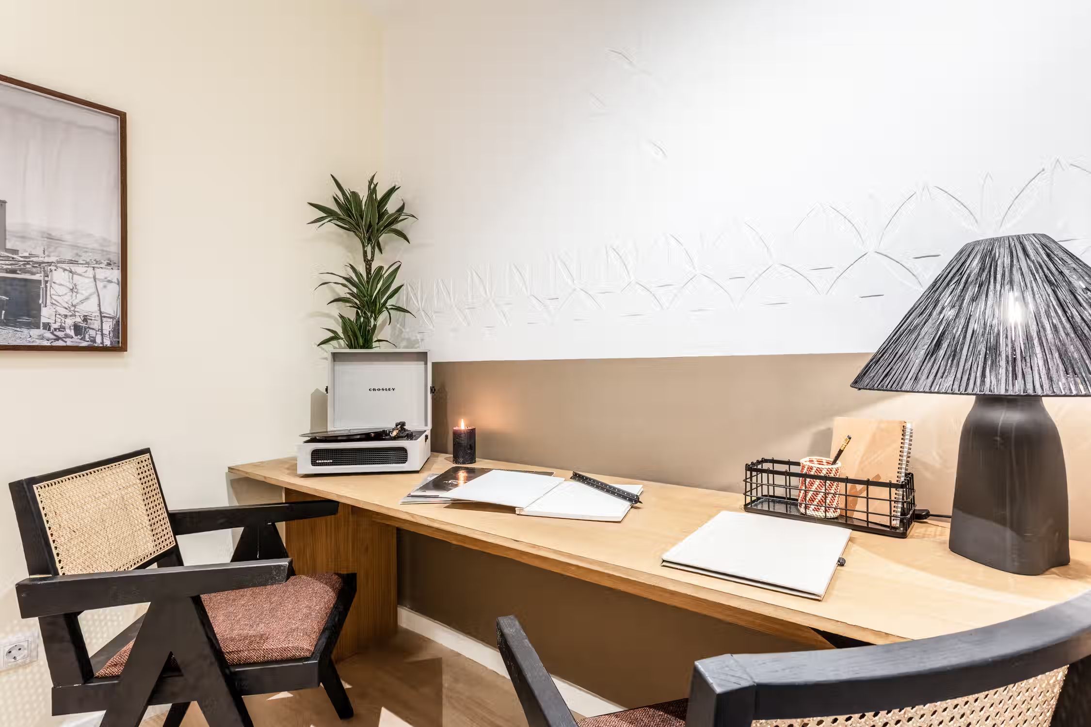 Transcend to a Saharan escape, right in Madrid’s famed Goya neighborhood. Guests can enjoy prime real estate in this Salamanca district with its charming pedestrian streets and traditional tapas restaurants scattered throughout the neighborhood. In true Madrilenian fashion, this 80 square meter home showcases Spanish architecture through its elevated ceilings and stained glass windows upon entry. To the left of the entrance is a dedicated workstation fit for two. Walking down the main hallway, the first door to the left reveals Tazrouk’s first bedroom. Terracotta hues coat the room from the natural fiber accent wall to the linens on the queen-sized bed. A built-in closet sits opposite the bed. The next left leads to Tazrouk’s detached bathroom. Cool blues are highlighted with the slate tiling covering the space and into the full-sized shower. The hallway widens to show off the galley kitchen and a two-person breakfast bar. The space is complete with modern appliances and all the necessary cooking utensils. The end of the hall leads to the open-concept living and dining area. Desert themes echo through the space with natural fiber-lined trey ceilings and earthy decor. To the left of the cozy lounge area is Tazrouk’s final bedroom. This ensuite boasts a queen-sized bed in the center and built-in closets along the left-hand side. At the far corner of the room is the attached bathroom, exuding spa-like vibes with the all-glass shower and floating vanity