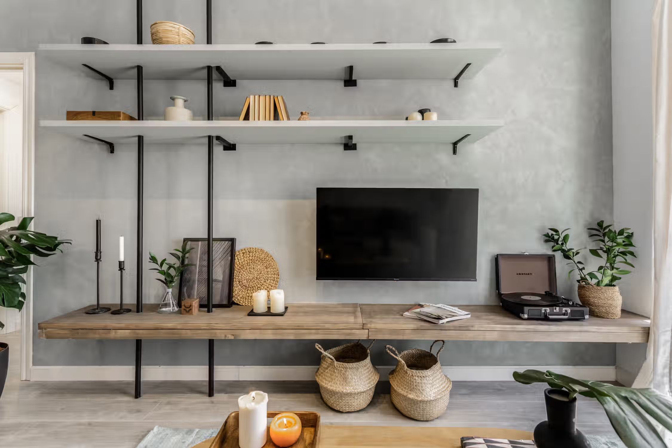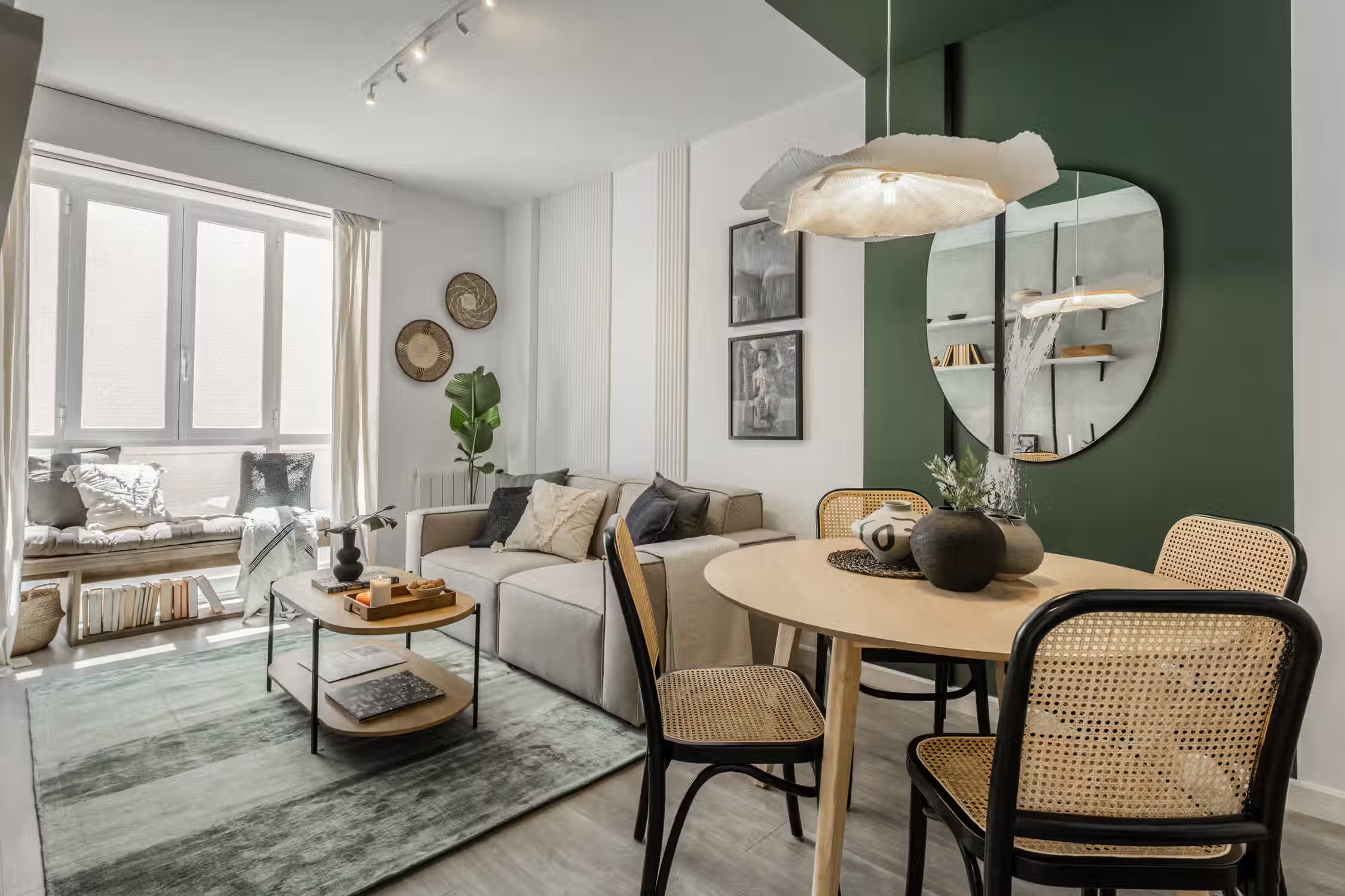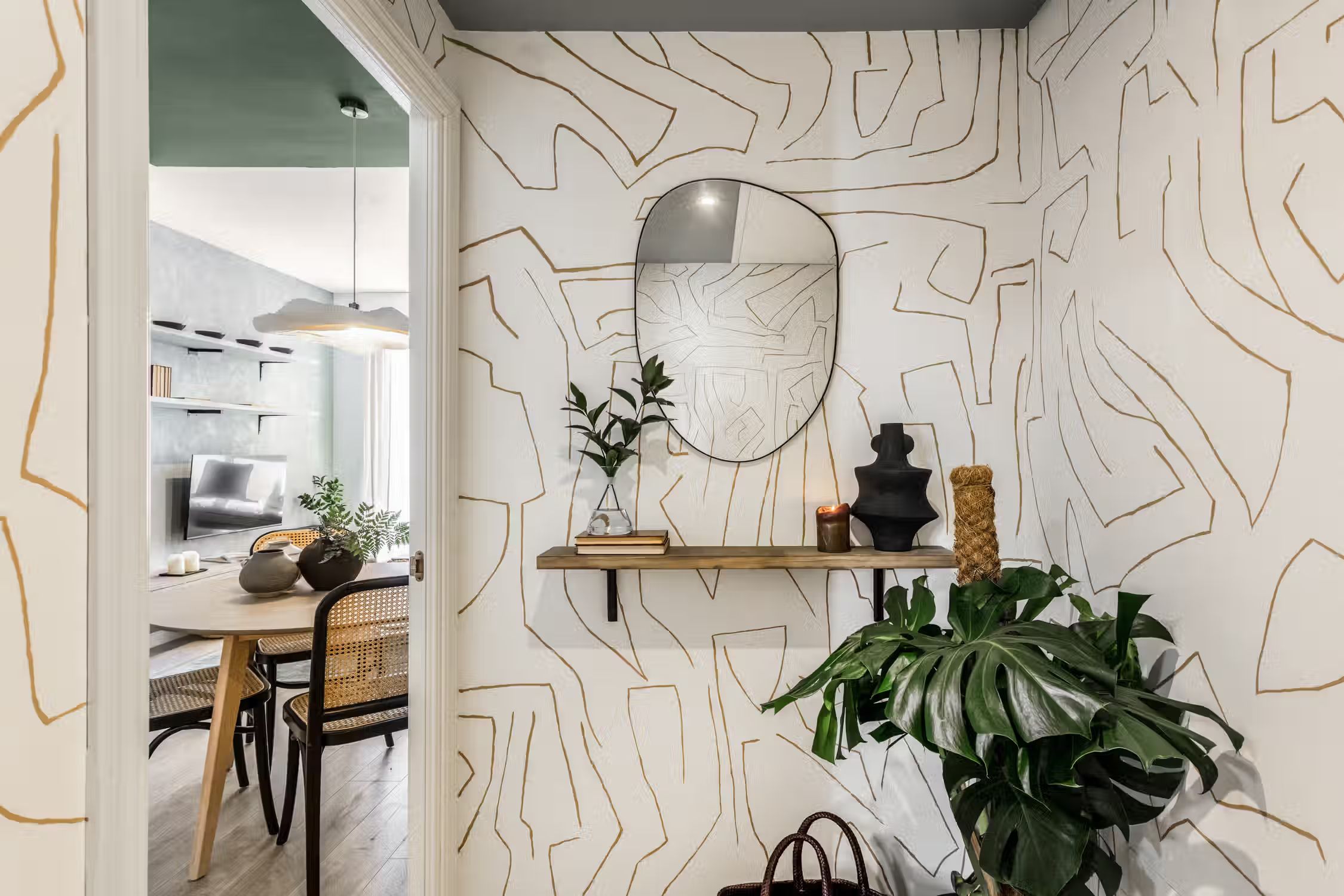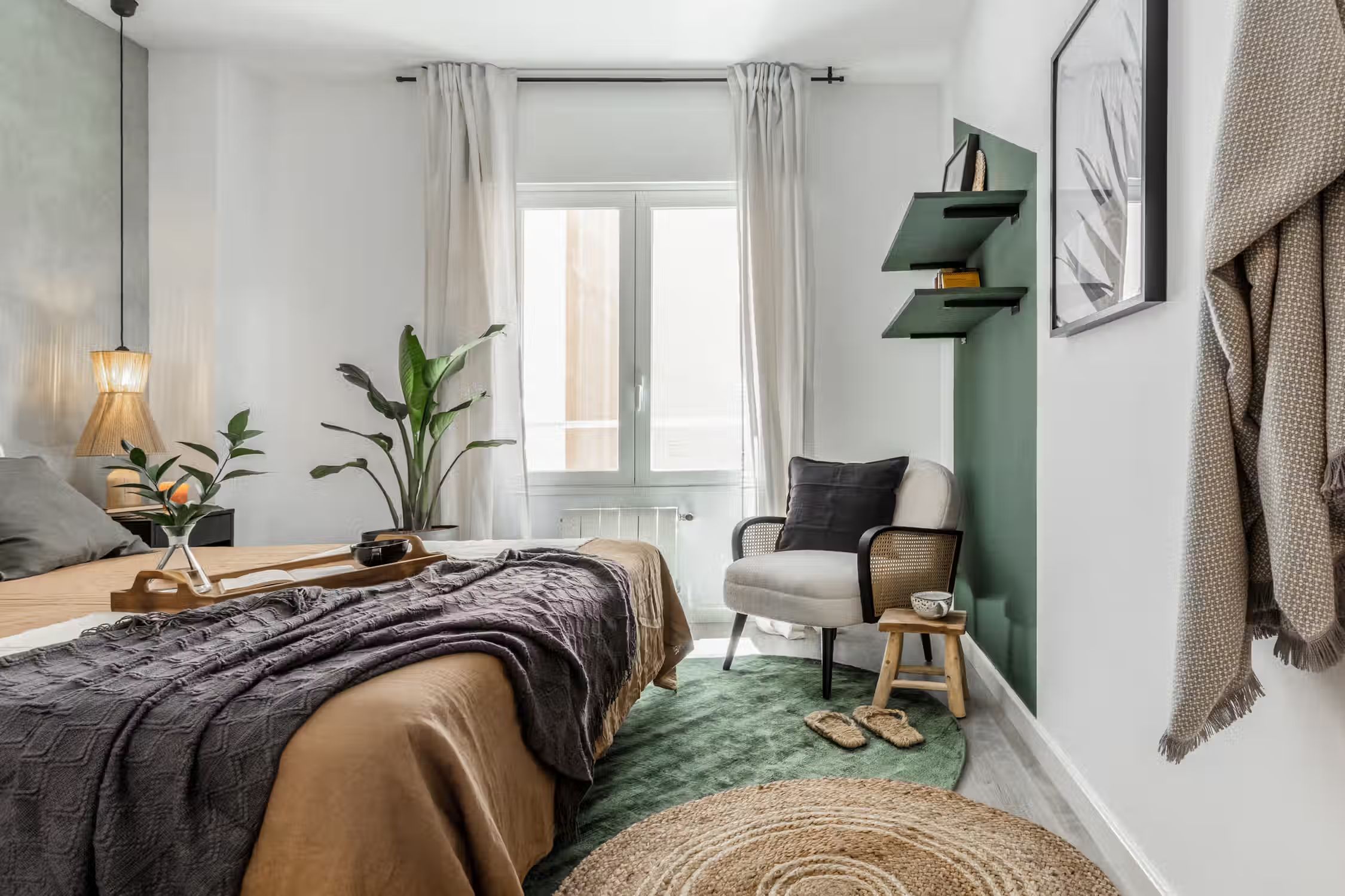 Jungle aesthetics blended with Spanish classics - this 78-square-meter home knows all things design. Located in Madrid’s famed Rio Rosas neighborhood, guests will enjoy centrality and local gems such as the quaint small business and under-the-radar restaurants. Once inside Bwende’s interiors, the two-bed, one-bath home will inspire awe. Hand-painted designs cover the walls of the entryway as guests are guided into the kitchen straight on. Boasting natural light and modernity, the kitchen is complete with modern appliances and all the necessary cooking utensils. To the right of the kitchen is the open-concept living and dining area. Past the four-person dining set, a cozy lounge area is complemented by the full entertainment system. A window seat at the far end of the space gazes out at the Madrid views. The hallway past the living room reveals a detached bathroom to the left and Bwende’s first bedroom to the right. Slate and glass surround the walk-in shower, giving the space a contemporary feel. Across the hall, plush jungle greens meet earthy hues to create a stunning palette in the bedroom. The first bedroom boasts a queen-sized bed in the center and built-in closets nearest the entrance. At the end of the hall, contemporary designs and wall patterns play with the slanted ceilings. A daybed sits comfortably in the corner with a dedicated workstation on the other side