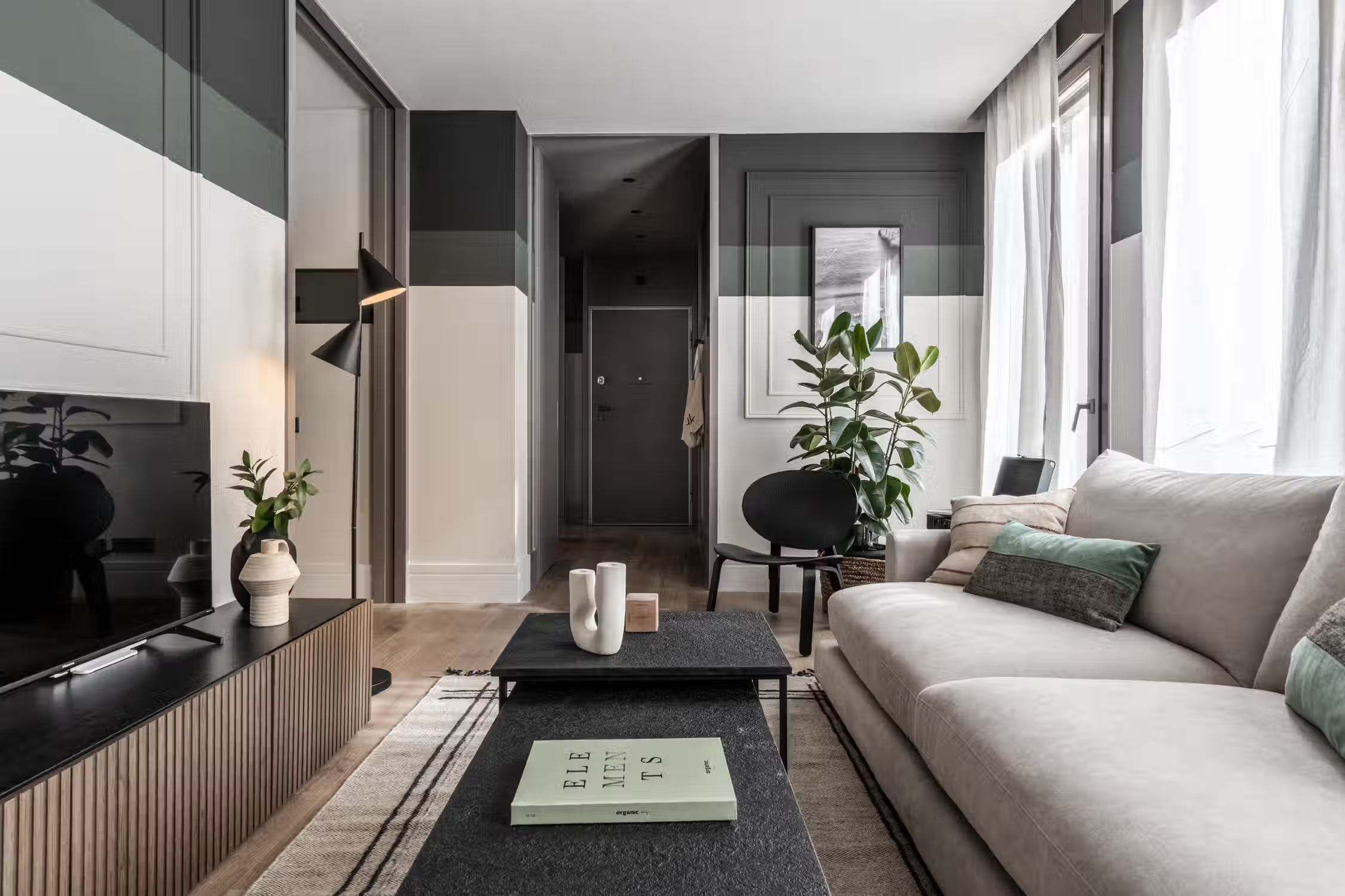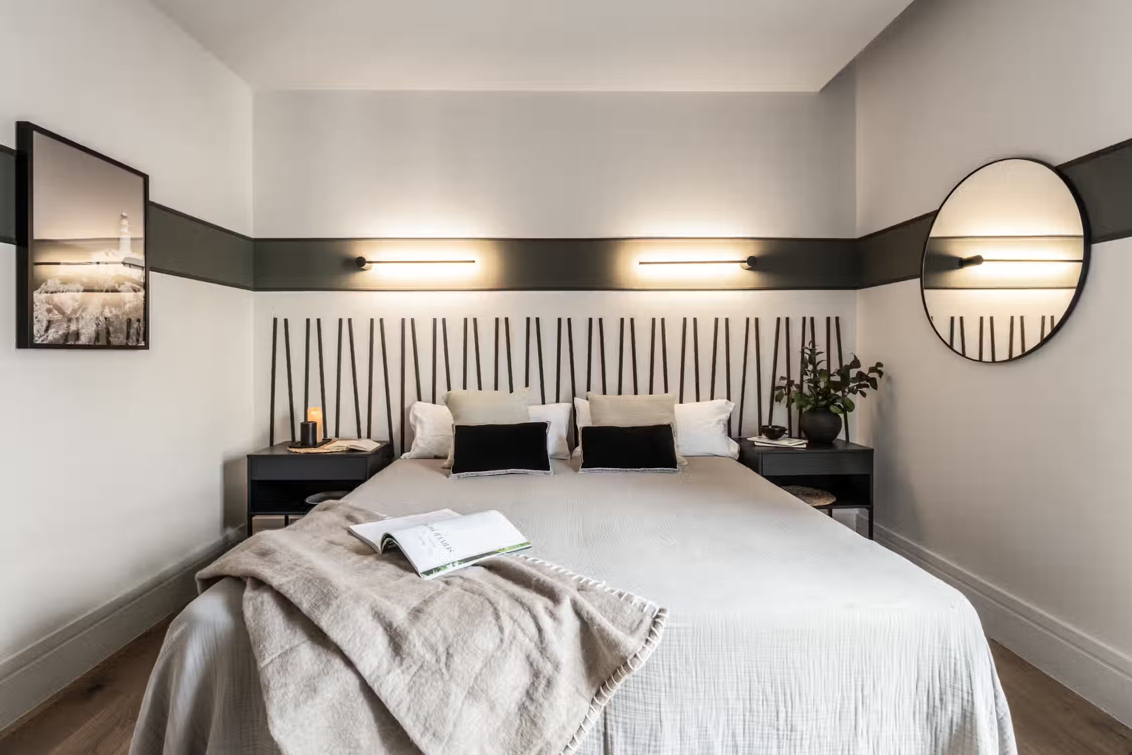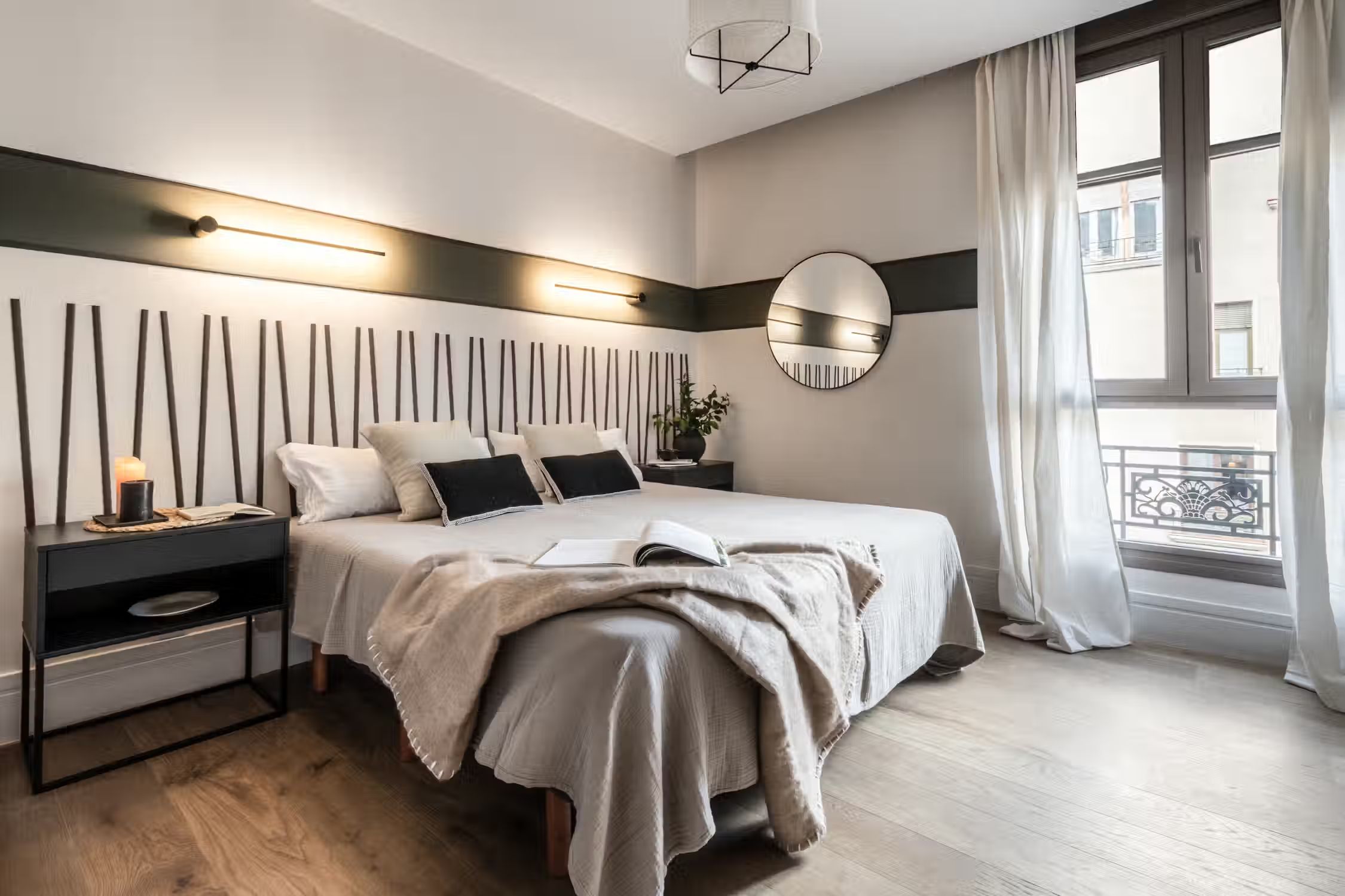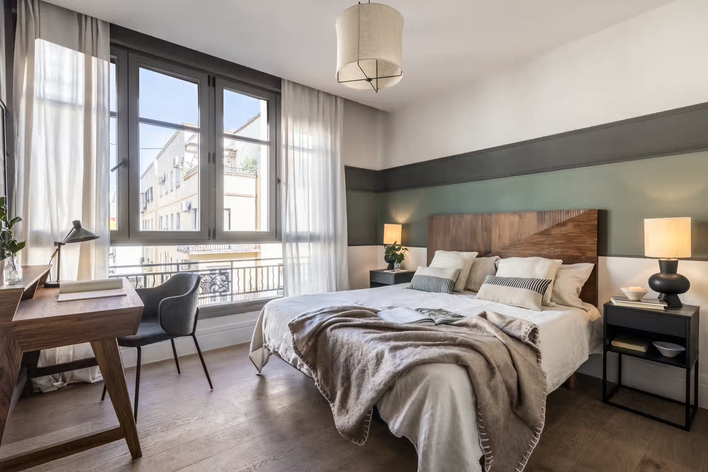 Stay in this spectacular two-bedroom furnished apartment in the Almagro neighborhood. The kitchen is equipped with state-of-the-art appliances and the beds are fitted with soft linens, ideal for a good night's rest. For work travelers and digital nomads, Lusciano has a work designated area so you remain productive at home. Its central location makes it the ideal base for your life in Madrid. As with all Ukio apartments, we furnish our spaces with beautiful pieces and unique designs. But you'll find that this two-bedroom apartment comes with something special: a shared rooftop, pool, and gym. Along with quality linens and towels, a complete kitchen set, HDTV, and a Crosley Bluetooth speaker, you get the best of Madrid life all in on place. A spectacular rental home, if we can say so ourselves. *Please note that the building amenities such as the pool and/or gym may have specific hours of operation and might not be available year-round. *Our in-house design team expertly selects all apartment furniture and decor to ensure the highest level of quality and comfort