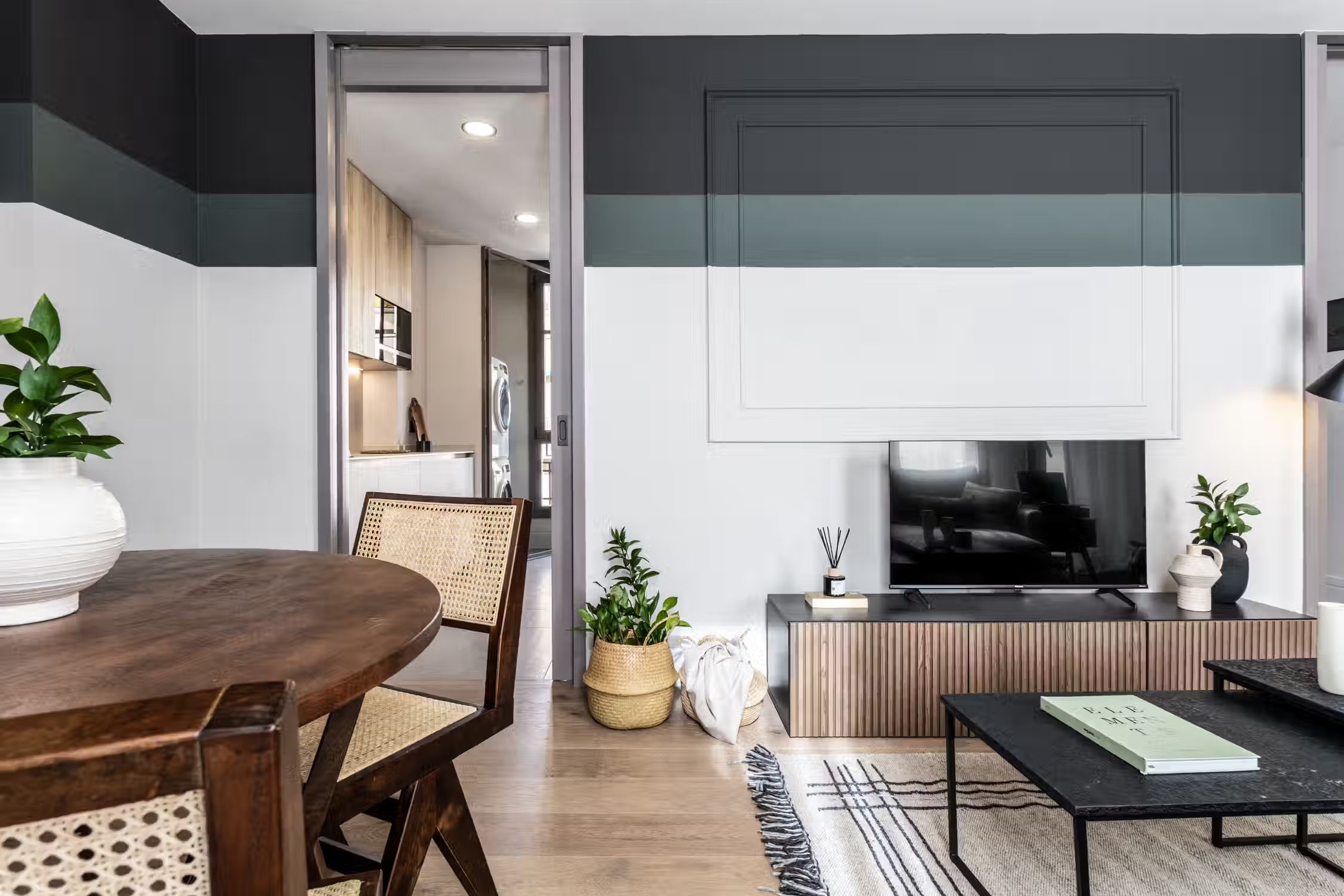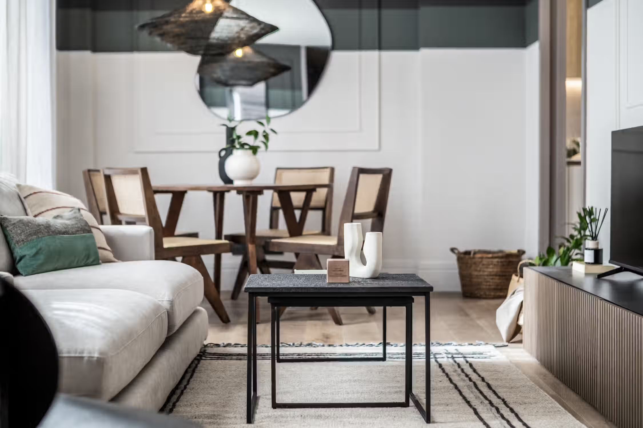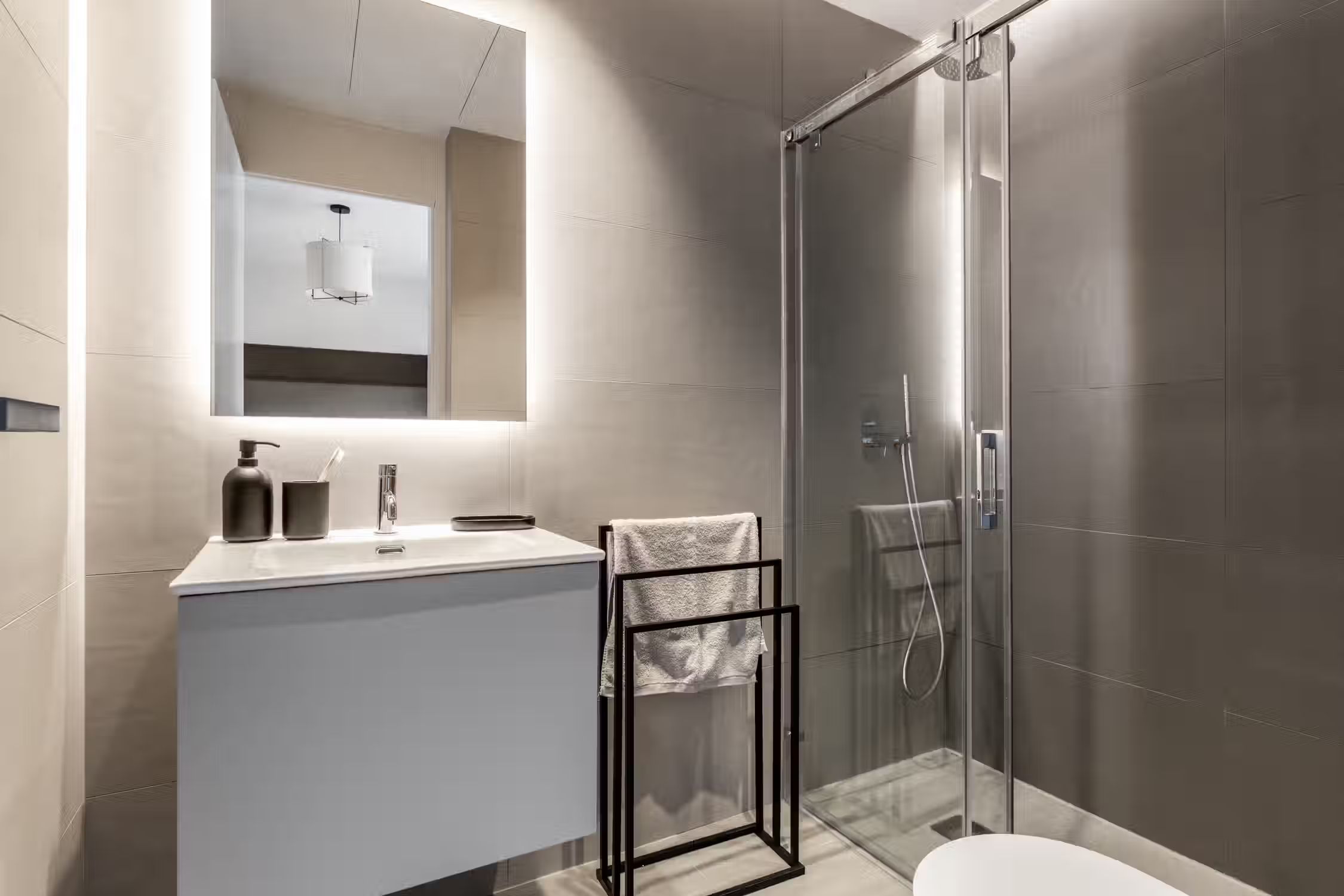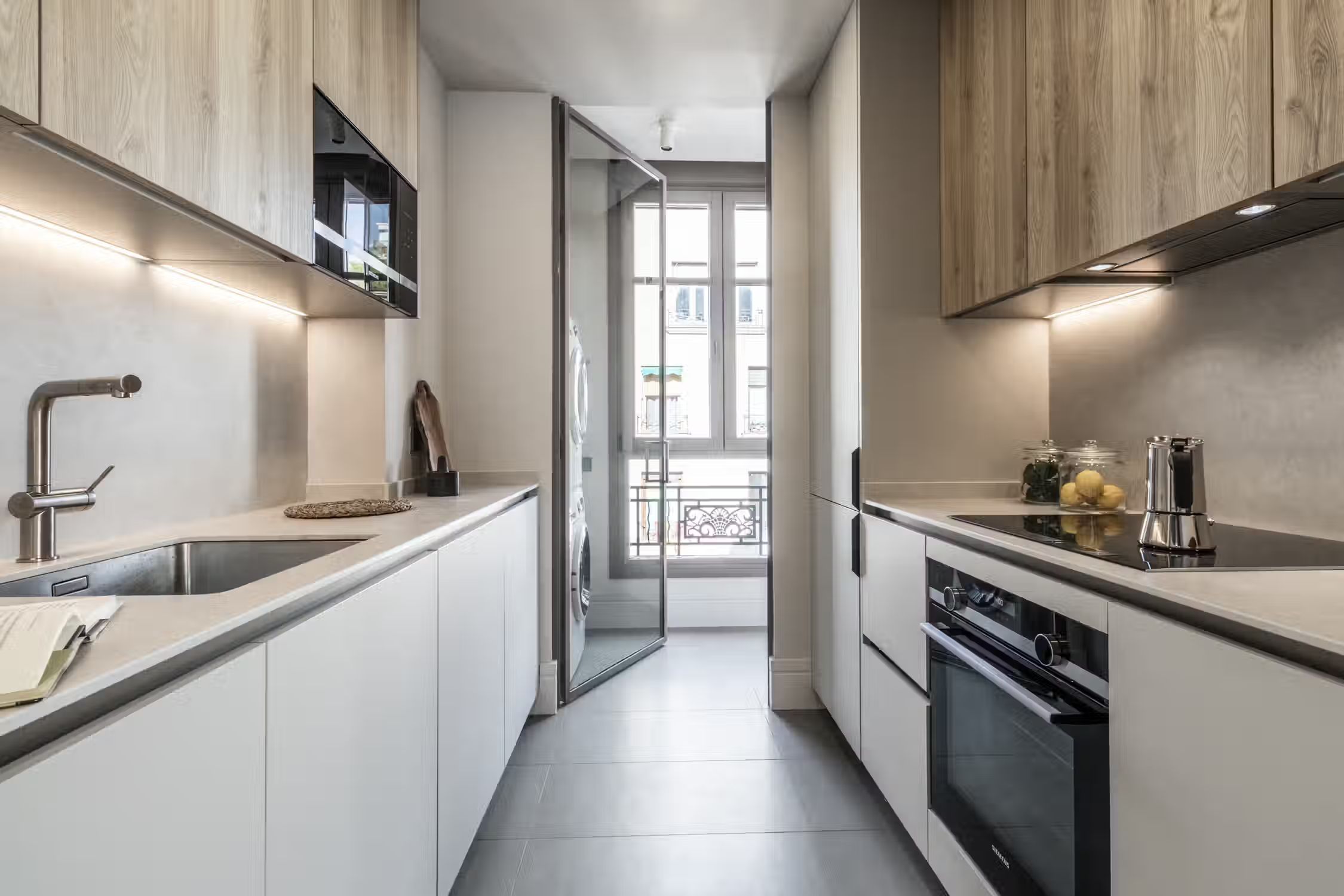 Stay in this spectacular two-bedroom furnished apartment in the Almagro neighborhood. The kitchen is equipped with state-of-the-art appliances and the beds are fitted with soft linens, ideal for a good night's rest. For work travelers and digital nomads, Lusciano has a work designated area so you remain productive at home. Its central location makes it the ideal base for your life in Madrid. As with all Ukio apartments, we furnish our spaces with beautiful pieces and unique designs. But you'll find that this two-bedroom apartment comes with something special: a shared rooftop, pool, and gym. Along with quality linens and towels, a complete kitchen set, HDTV, and a Crosley Bluetooth speaker, you get the best of Madrid life all in on place. A spectacular rental home, if we can say so ourselves. *Please note that the building amenities such as the pool and/or gym may have specific hours of operation and might not be available year-round. *Our in-house design team expertly selects all apartment furniture and decor to ensure the highest level of quality and comfort