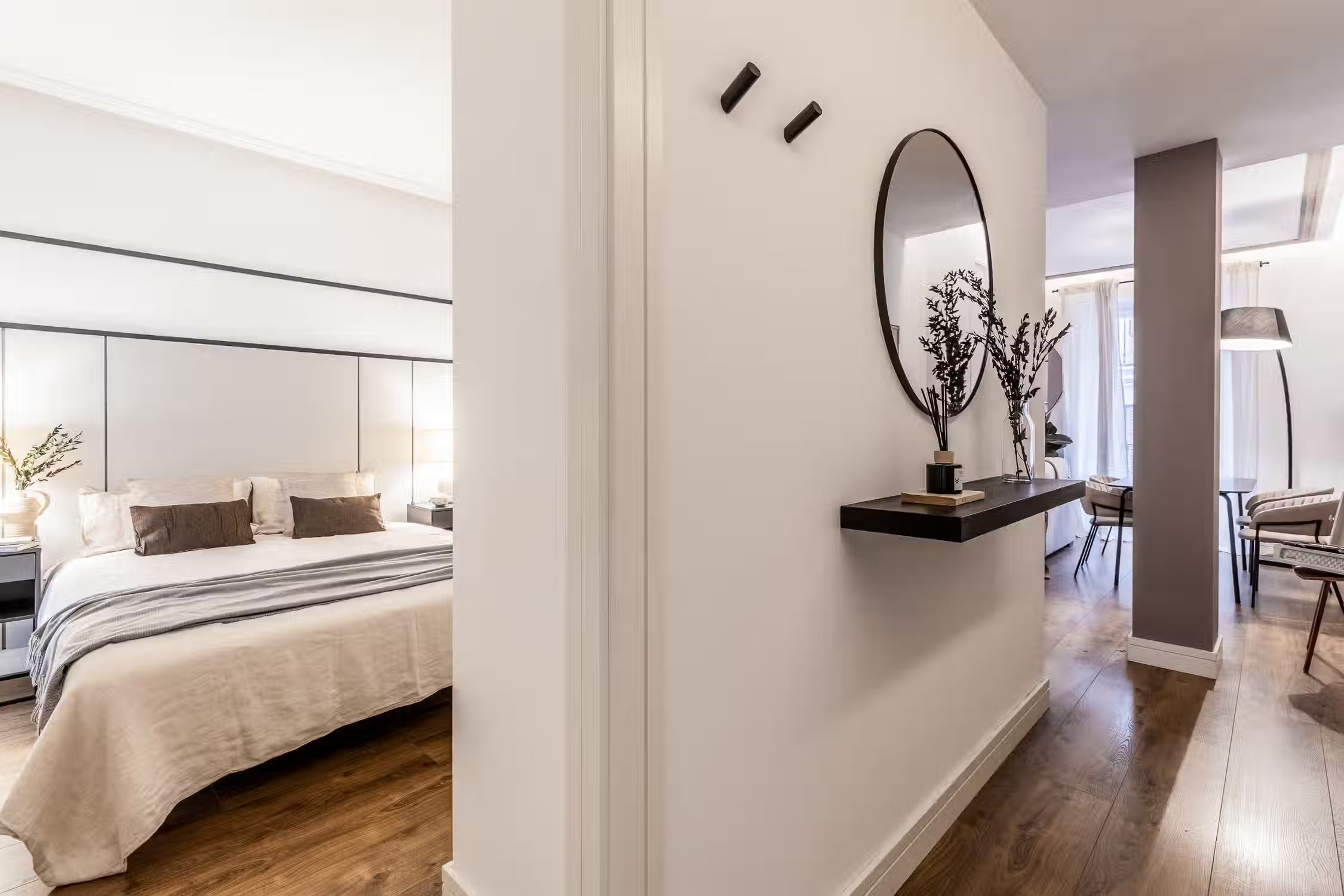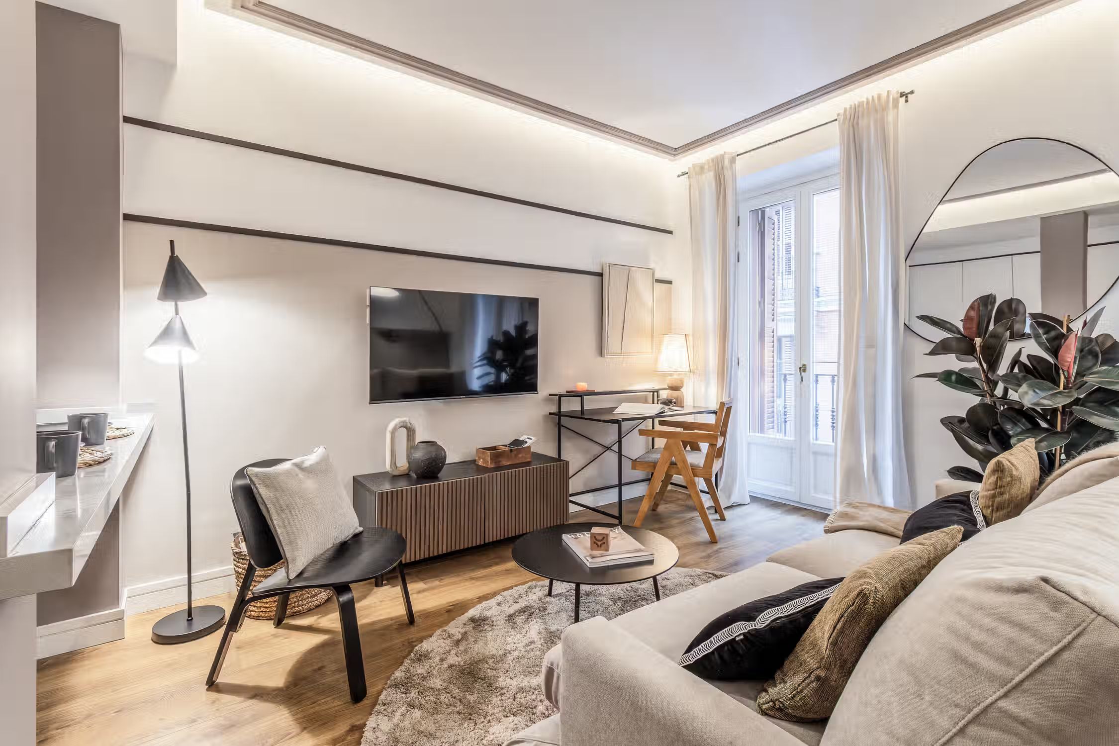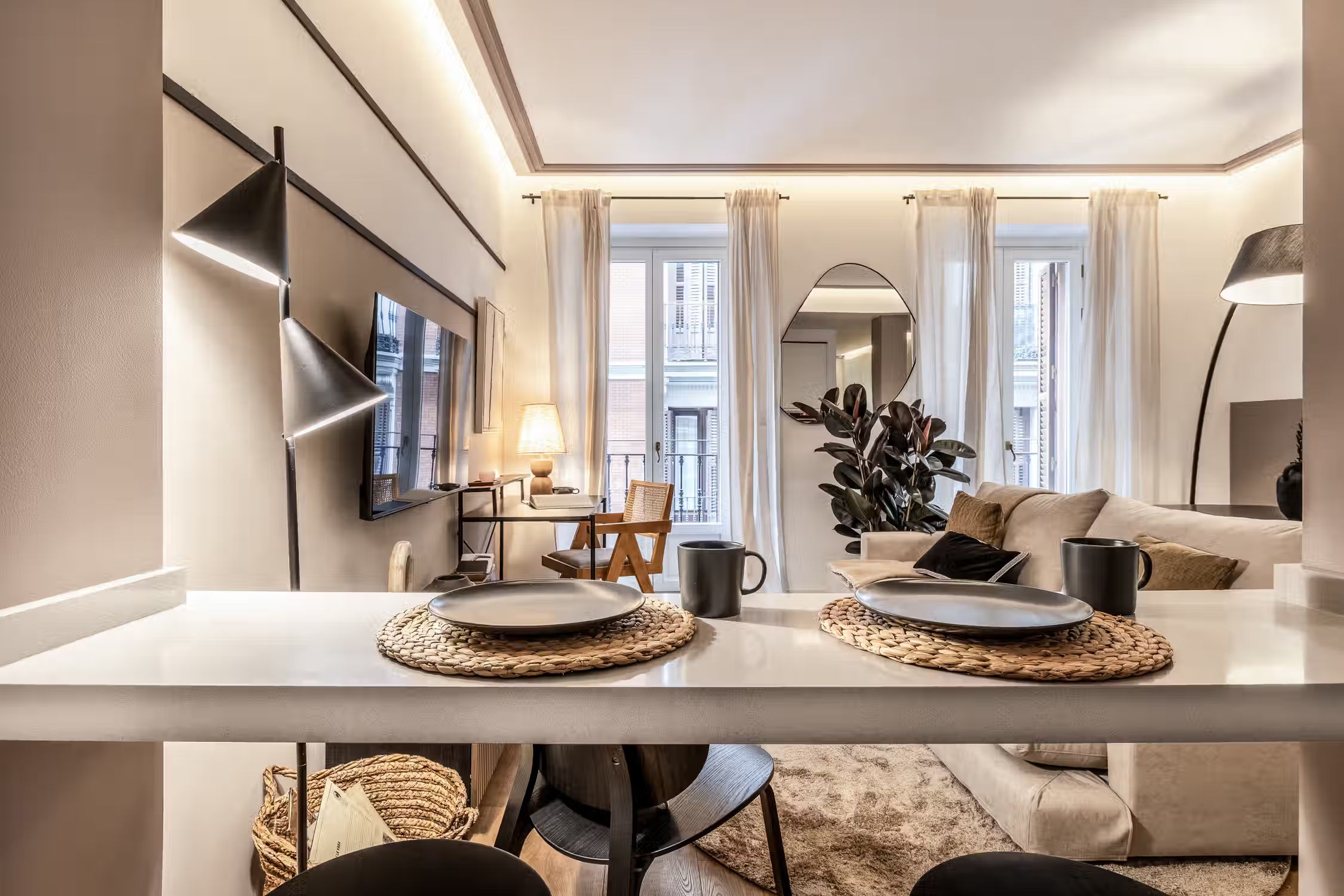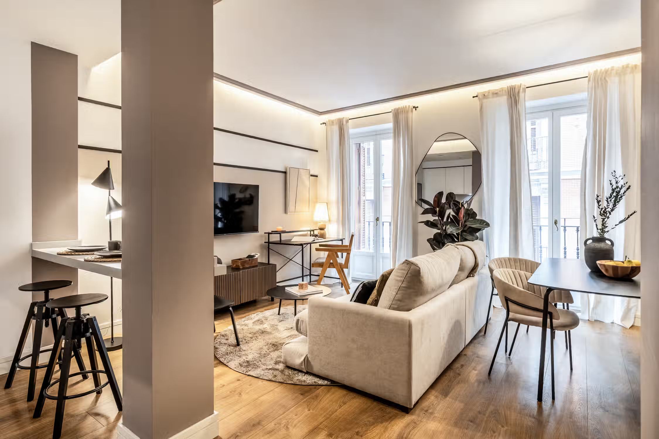 Welcome to Sauco, a stylish 65-square-meter haven situated in the heart of Centro, surrounded by scenic architecture and museums, offering you a delightful fusion of culture and comfort. After a day of taking in the sites of Madrid, come home to Sauco for absolute indulgence. This thoughtfully designed residence features two bedrooms, each graced with queen-size beds, ensuring a peaceful and rejuvenating night's sleep. The single bathroom, with its contemporary design, complements the overall aesthetic of the apartment. Sauco boasts an open-plan living room and kitchen, creating a seamless flow between spaces. The chic design of the apartment is characterized by a neutral color palette, while pops of green from strategically placed plants add a touch of freshness and vibrancy. The living room is a versatile area, featuring an entertainment system for relaxation, a dedicated workstation for productivity, and a dining table for shared meals. The fully furnished kitchen, complete with countertop seating, is a culinary haven where you can create delightful dishes or enjoy a quick bite. Ducted air conditioning in all rooms and individual floor heating ensure that the climate is always just right, adding an extra layer of comfort to your living experience. A doorman provides both security and convenience, making your stay in Sauco even more enjoyable. Fully furnished, this apartment comes with everything you need, including bedding and linen