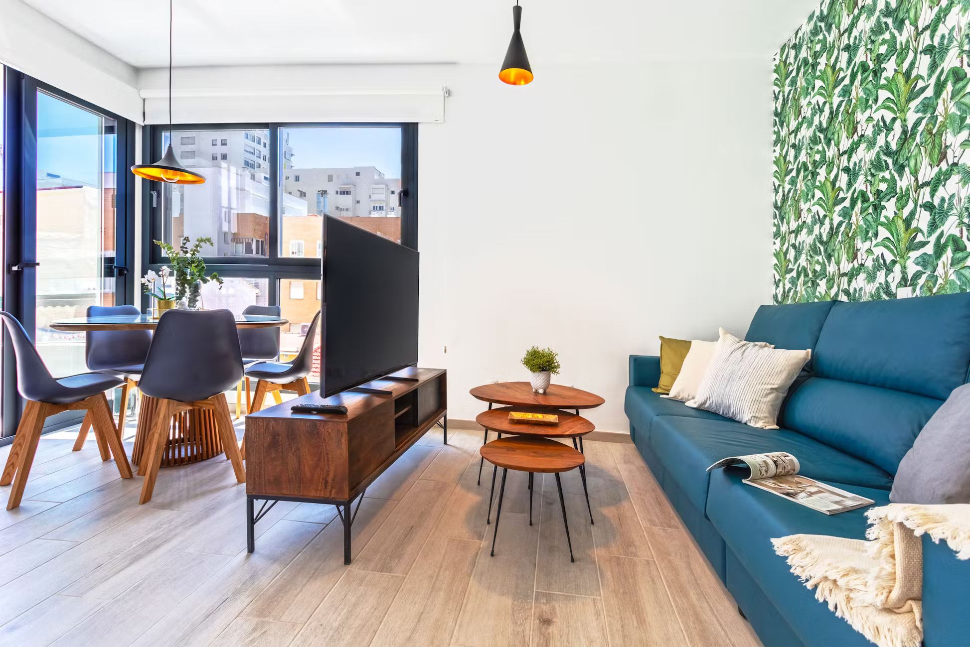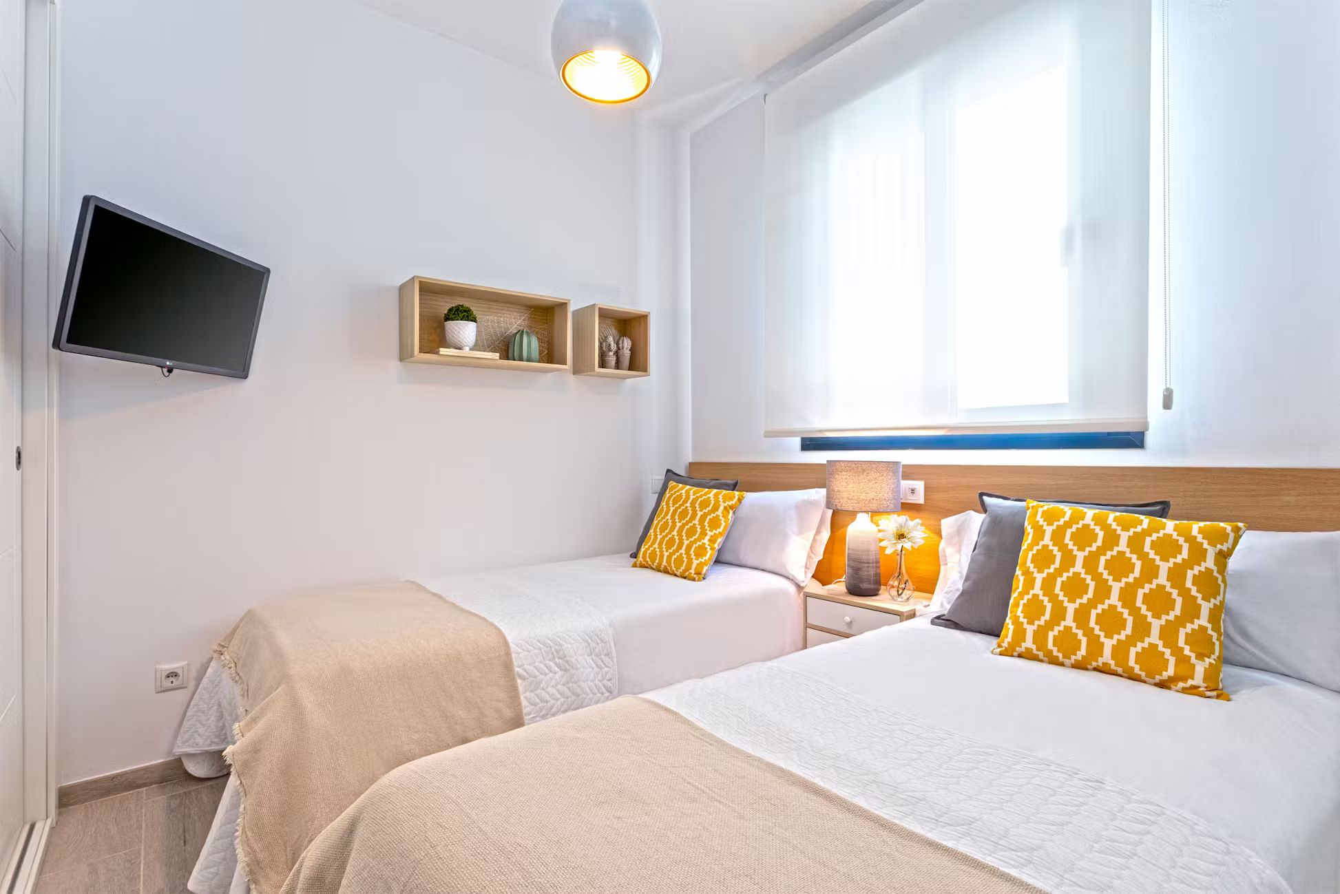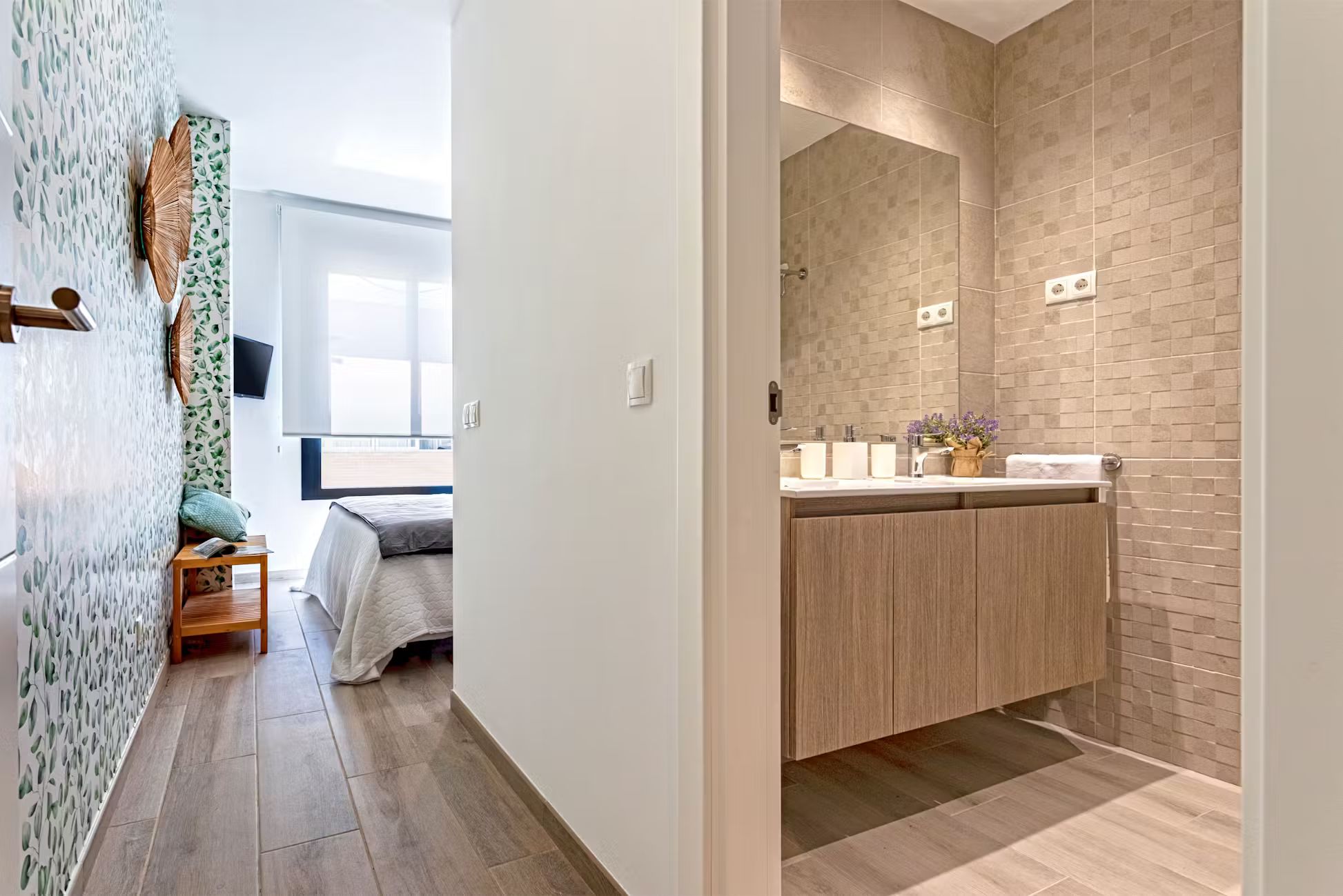 Upon entering the apartment we find a hall that leads directly to the kitchen, fully equipped and open to the living room. The living room, modern and decorated with a design, has a double sofa bed, giving the apartment capacity for up to 6 people. In addition, from the living room we access a small private terrace with 2 chairs and a table to enjoy the good weather of Malaga. The apartment has two bedrooms, one with a 1.80 x 200 cm bed and an en-suite bathroom with a shower, and the other with two 0.90 x 200 cm single beds. Both bedrooms have television. In addition, the apartment has another complete bathroom with a bathtub. In addition, the apartment has a private garage and a magnificent solarium on the top floor of the building, with a swimming pool open from may to october, sun loungers, barbecue and table areas. This area is communal. It is located in a modern and luxurious building on Calle Constancia a few meters from the María Zambrano train station (the main train station in Malaga), Vialia and Larios shopping centers and the Mercado del Carmen. It is also a few meters from the Port of Malaga and the beach