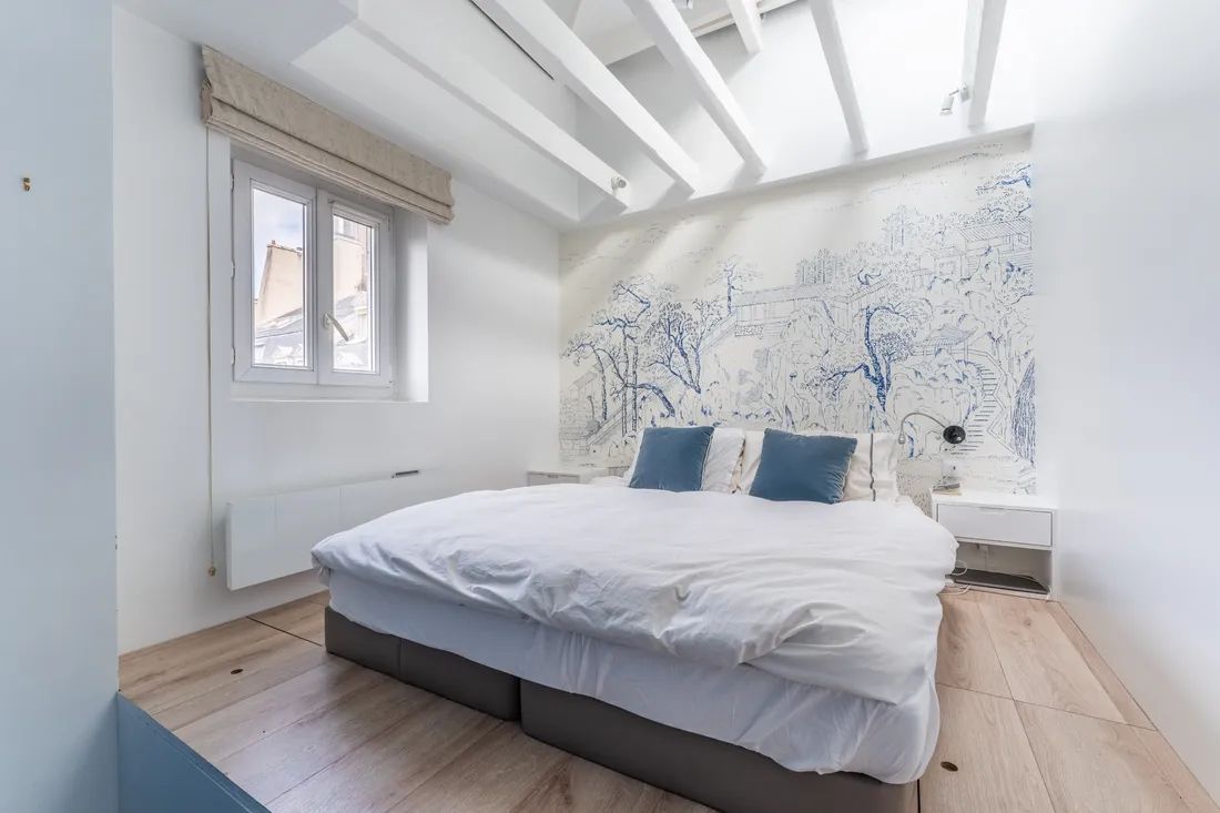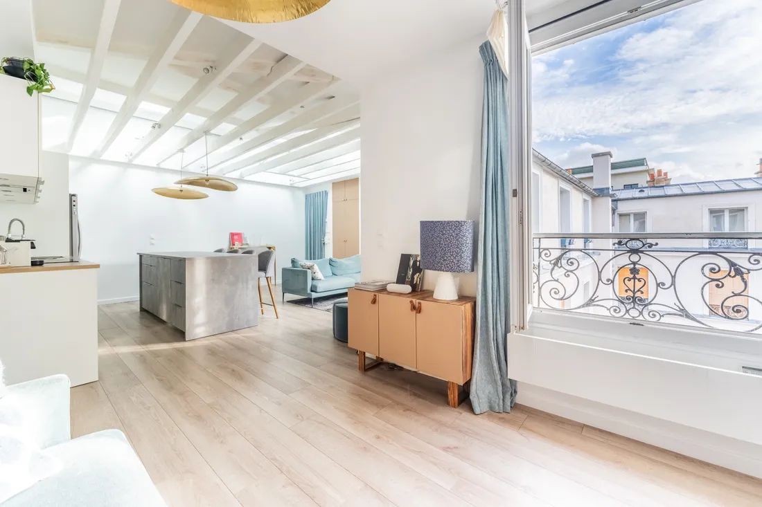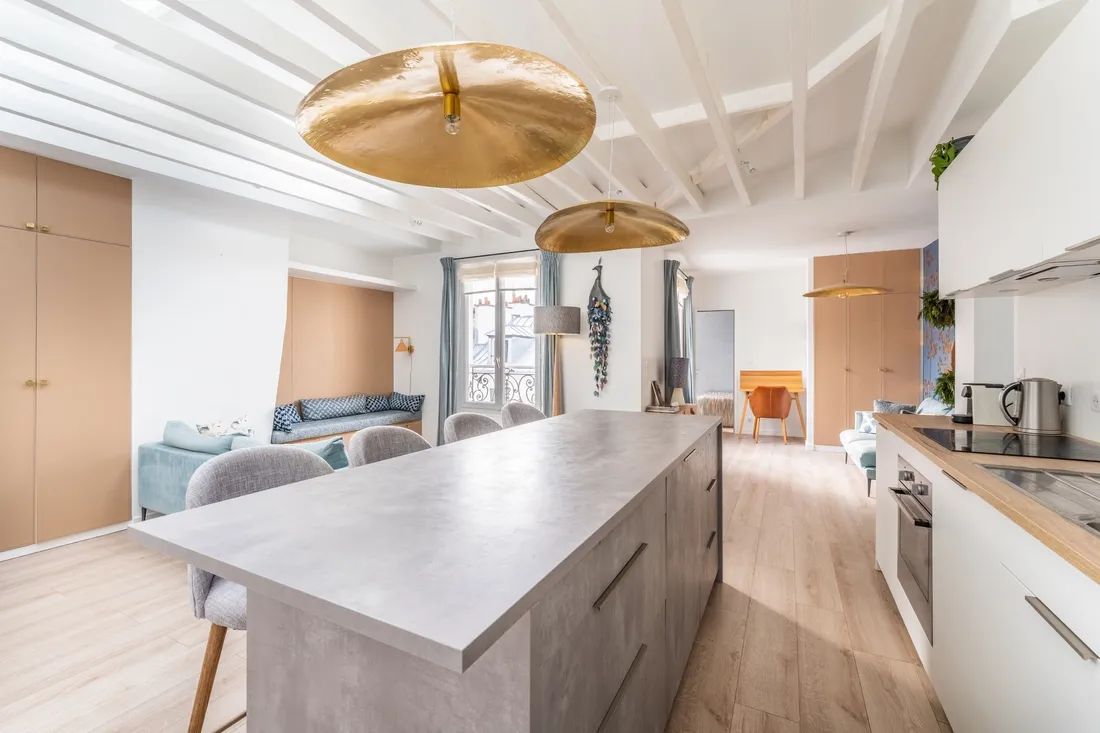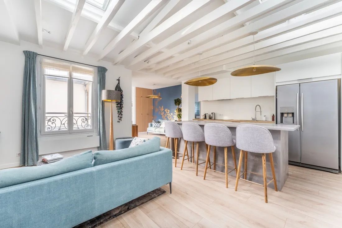 Paris 3rd - Sainte-Avoye / The Archives. In the heart of Le Marais, between the Picasso Museum and the Centre Georges Pompidou, a stone’s throw from the garden of the National Archives and the shops on Rue de Bretagne, within a beautiful secure 19th-century building with a caretaker, we offer you a 65.13 sqm Carrez law apartment, renovated by an architect, on the 4th and top floor with an unobstructed view. It consists of a spacious living room of 40 sqm with an open fitted and equipped kitchen, two bedrooms with storage, a bathroom with bathtub and walk-in shower, separate toilets, and numerous integrated storage spaces. With a triple orientation, the charm of the old with its exposed beams, lovely unobstructed views, and high ceilings, it provides beautiful brightness and absolute calm in the heart of historic Le Marais. This fully furnished apartment is a turnkey ideal pied-à-terre. A cellar completes this property. Prime location, in the immediate vicinity of all metros, shops (cafés, bars, restaurants, trendy boutiques), museums, in a neighborhood that is both lively, festive, touristy, and culturally renowned worldwide.