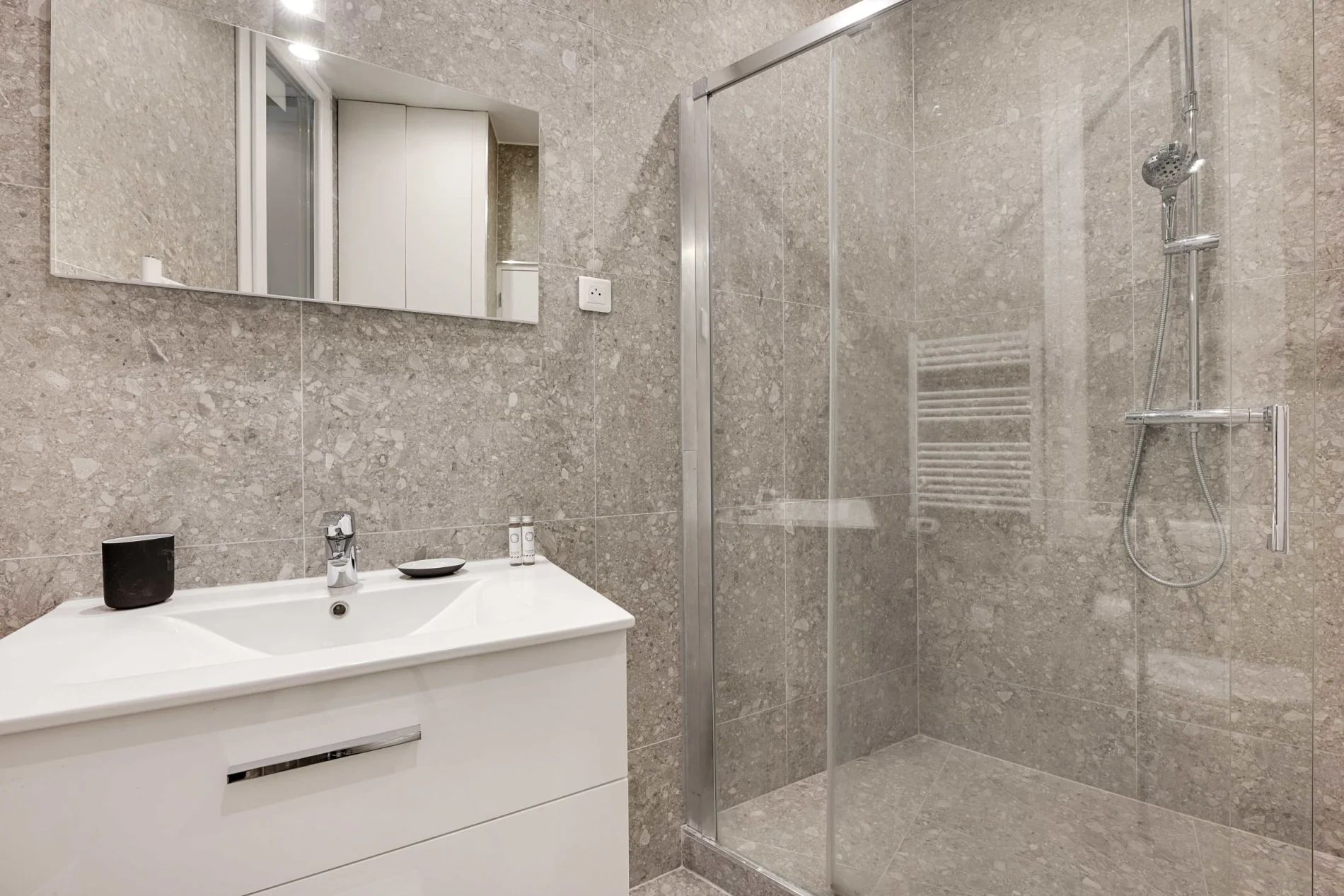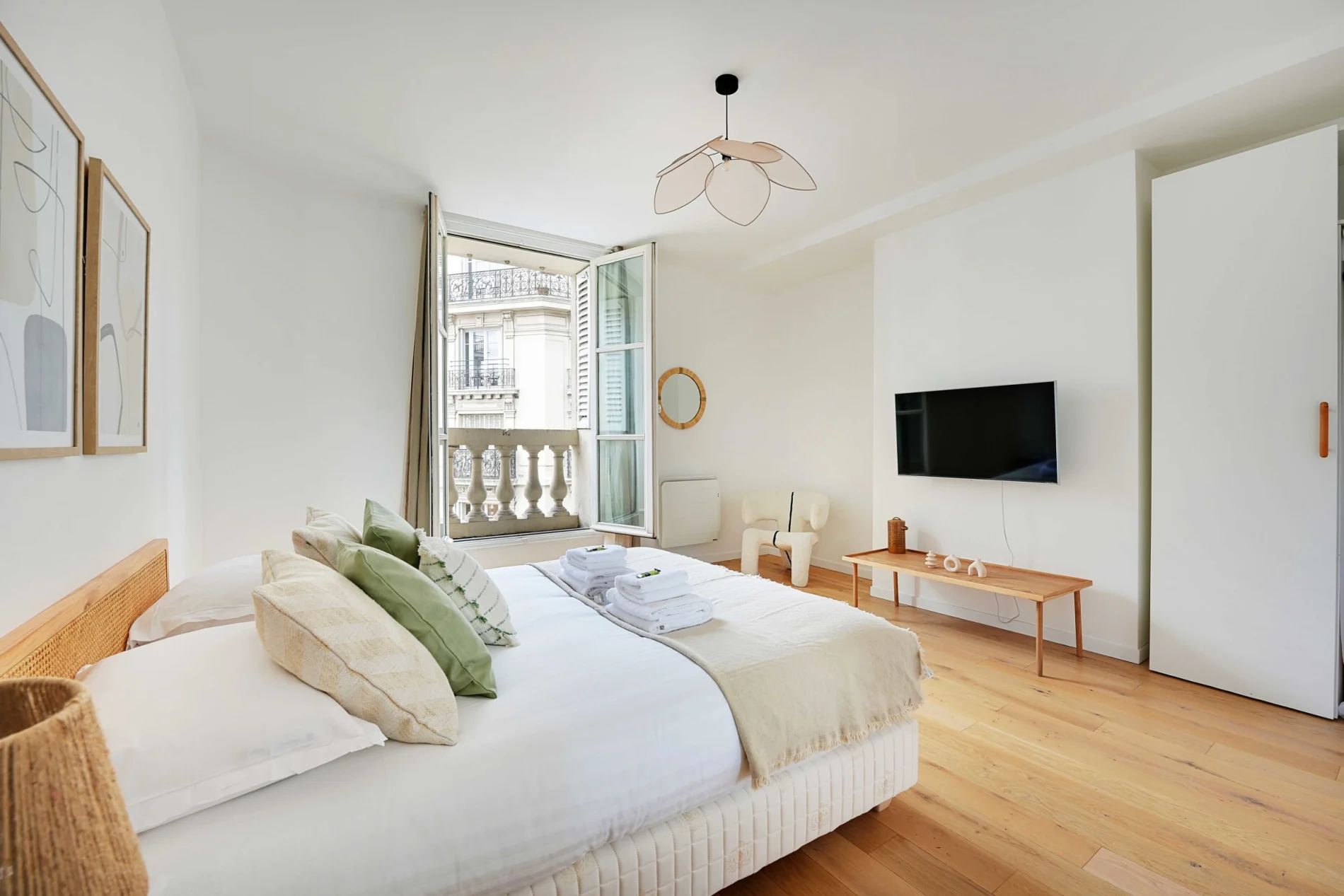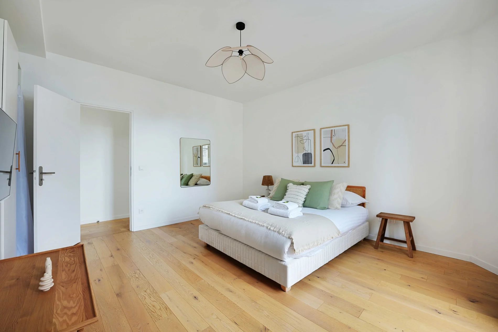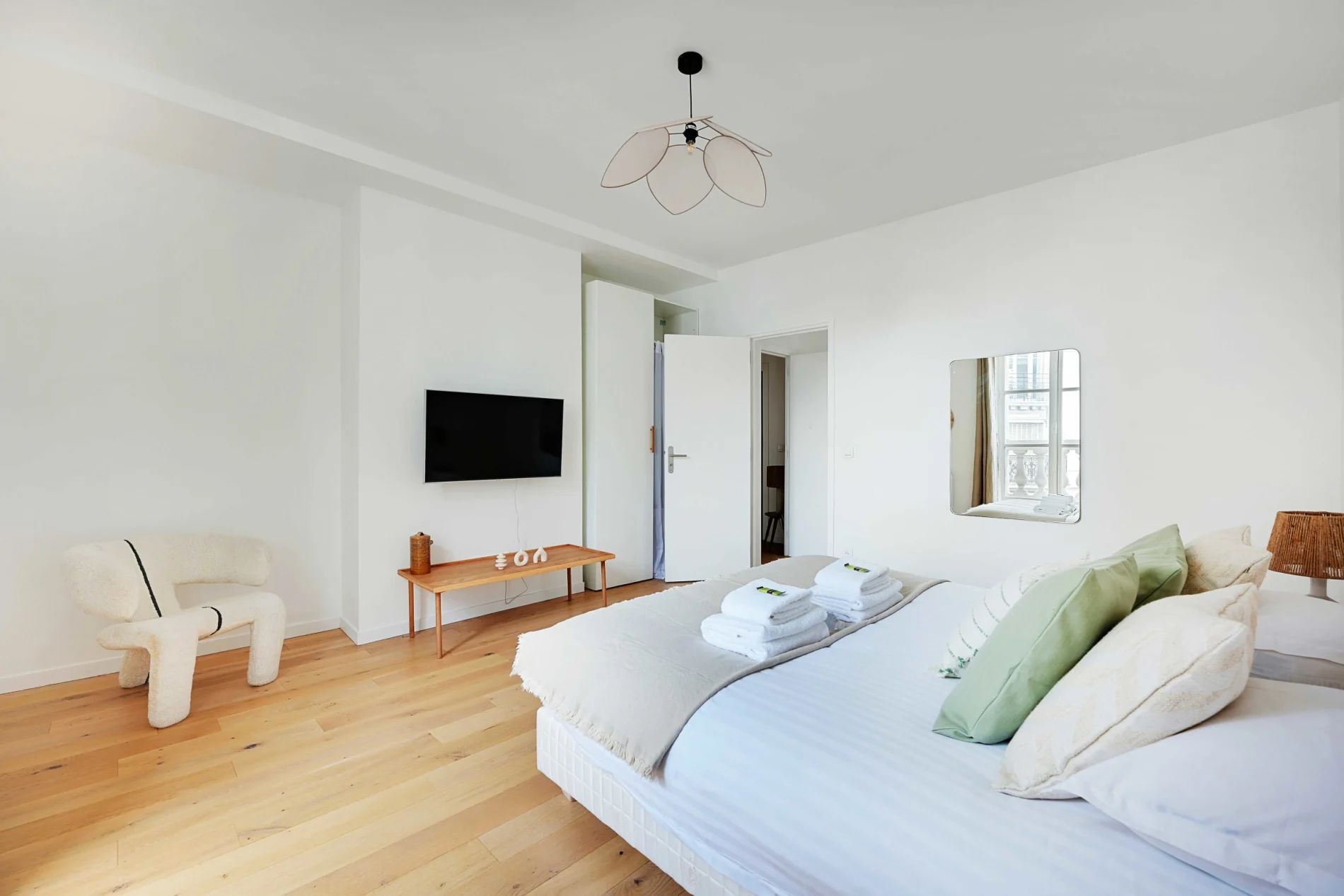 Super flat of 60m2 located on the 3rd floor without lift, only 6 minutes walk from the town hall! You can enjoy the various shops nearby. It is composed of: - A fully equipped and functional open kitchen: fridge, hob, coffee machine, toaster, kettle, washing machine... - A living area with a sofa and TV - A first bedroom with a double bed - A second bedroom with a double bed - Two bathrooms with shower and WC - Storage space - TV and high speed internet - Bed linen and towels provided
