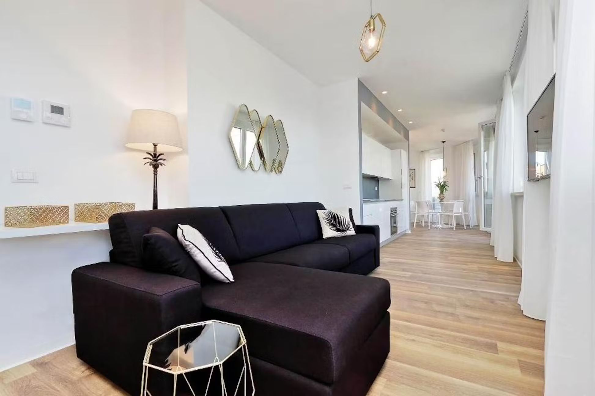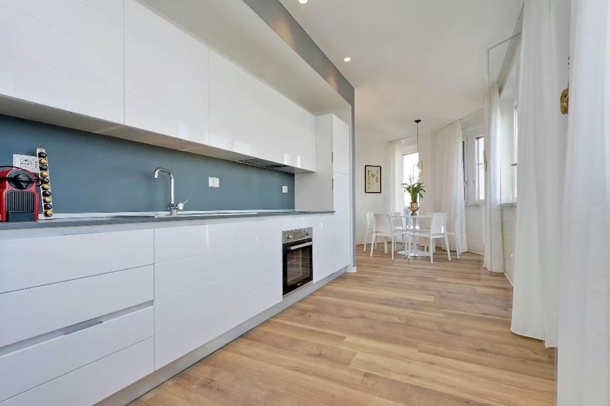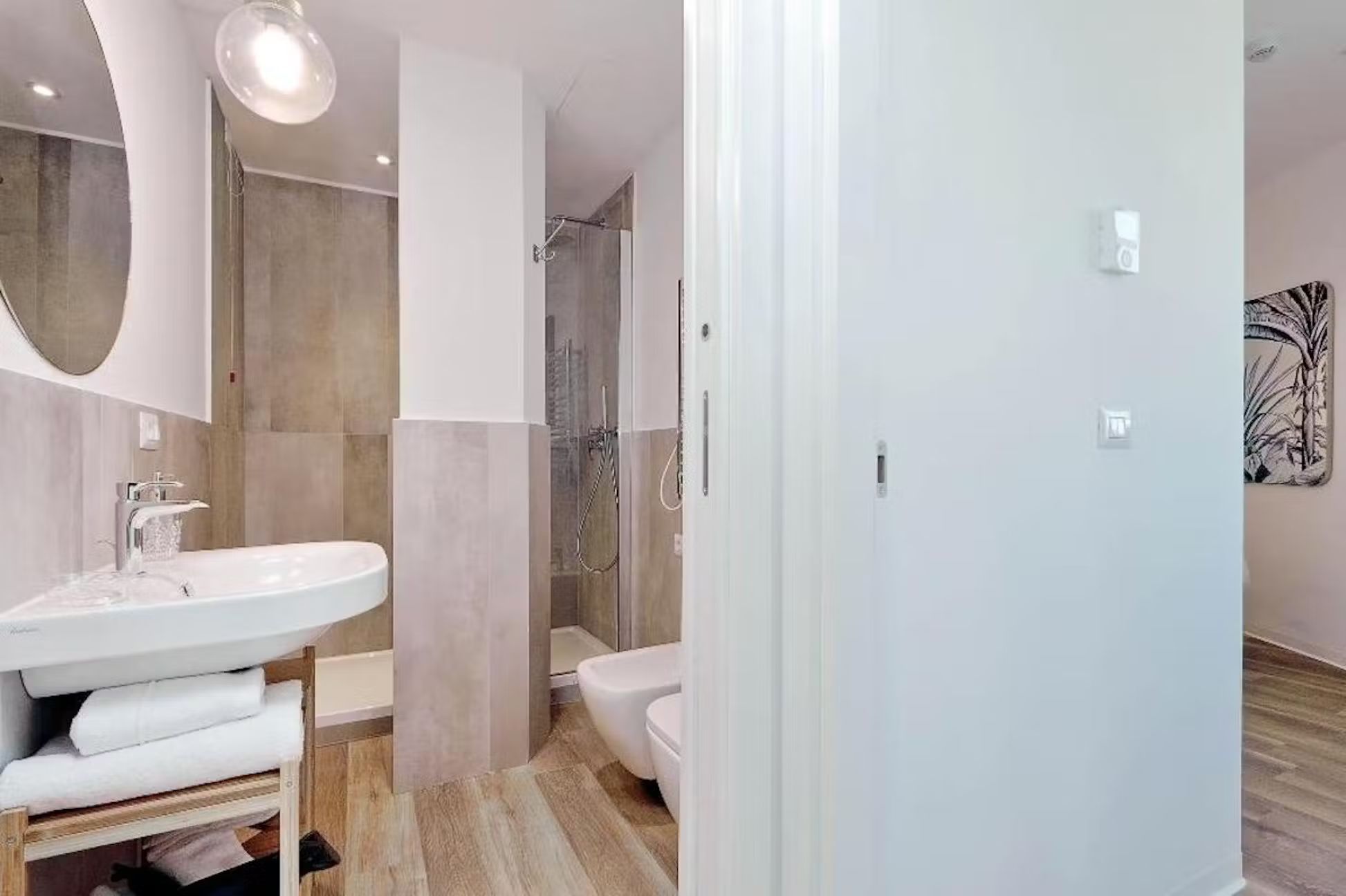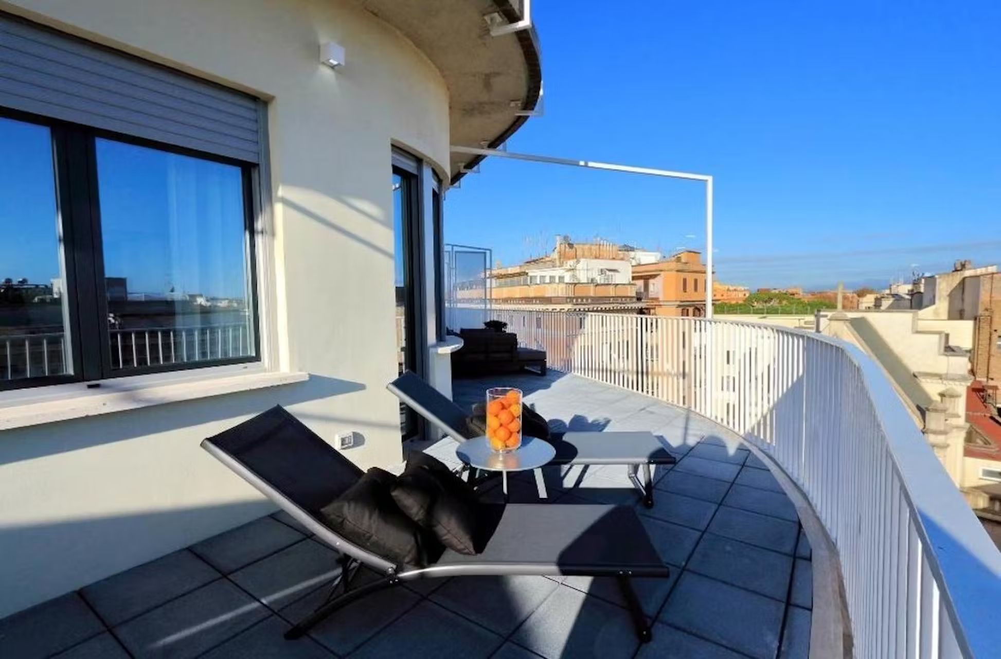 Welcome to this charming and practical three-room apartment with a terrace, perfectly situated in the heart of the lively Sallustiano district, right next to the picturesque Trevi area. With Termini station, Via Veneto, Piazza Barberini, and the Rome Opera House just a 10-minute walk away, and Metro A, Repubblica, and Termini stations only 800 meters away, you’re ideally positioned to explore all that Rome has to offer. Enter to find a spacious living area with a magnificent window that opens onto the terrace, blending indoor and outdoor living beautifully. The terrace, outfitted with a table, chairs, deck chairs, sofa, and umbrella, is perfect for alfresco dining or simply enjoying the breathtaking views. Inside, the living room features a comfy sofa bed and a wall-mounted TV, while the open kitchen is fully equipped with modern appliances including a refrigerator, dishwasher, oven, induction hob, microwave, toaster, electric kettle, and a Nespresso coffee machine, plus cutlery and crockery for six. A stylish dining table with six chairs completes the space To the right of the living room, you’ll find a bedroom with an en suite bathroom, featuring a cozy French double bed, a bedside table, and a spacious wardrobe. On the opposite side of the dining area is the second bedroom, with a luxurious double bed, an inviting armchair, a wall-mounted TV, and ample storage in a large wardrobe. Both bathrooms are equipped with modern fittings and a convenient shower cabin Parking: Nearby, you’ll find both paid parking lots (marked with blue lines) and free parking spaces (marked with white lines) for your convenience