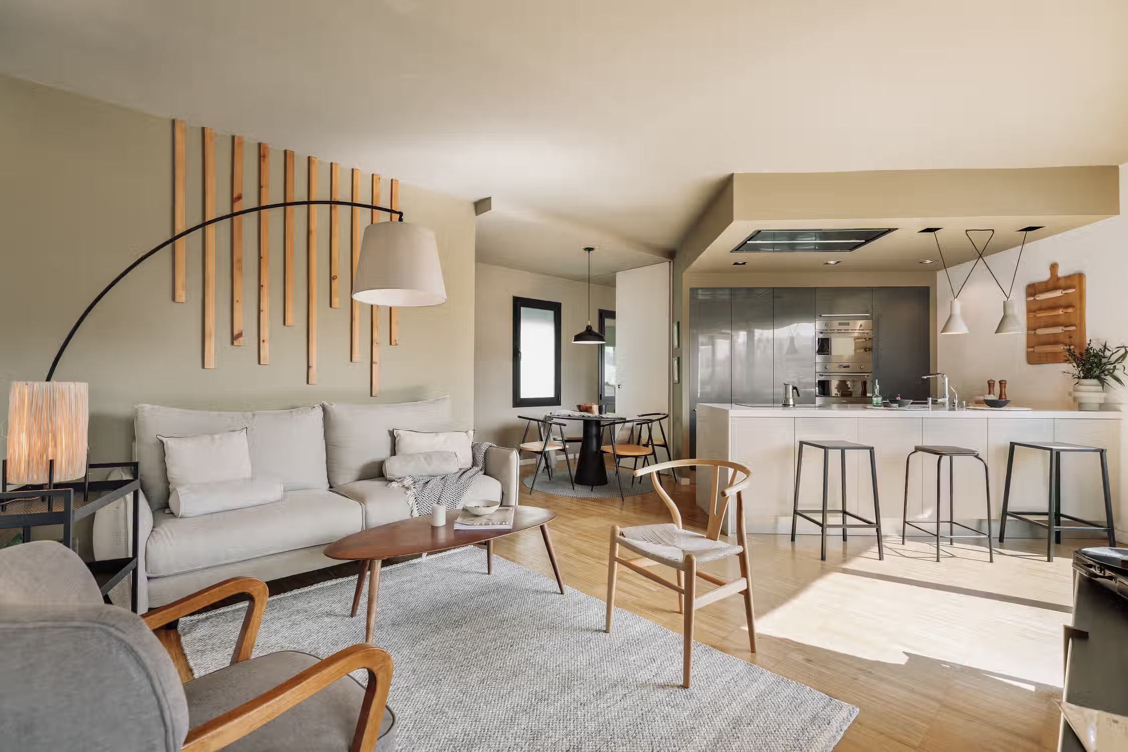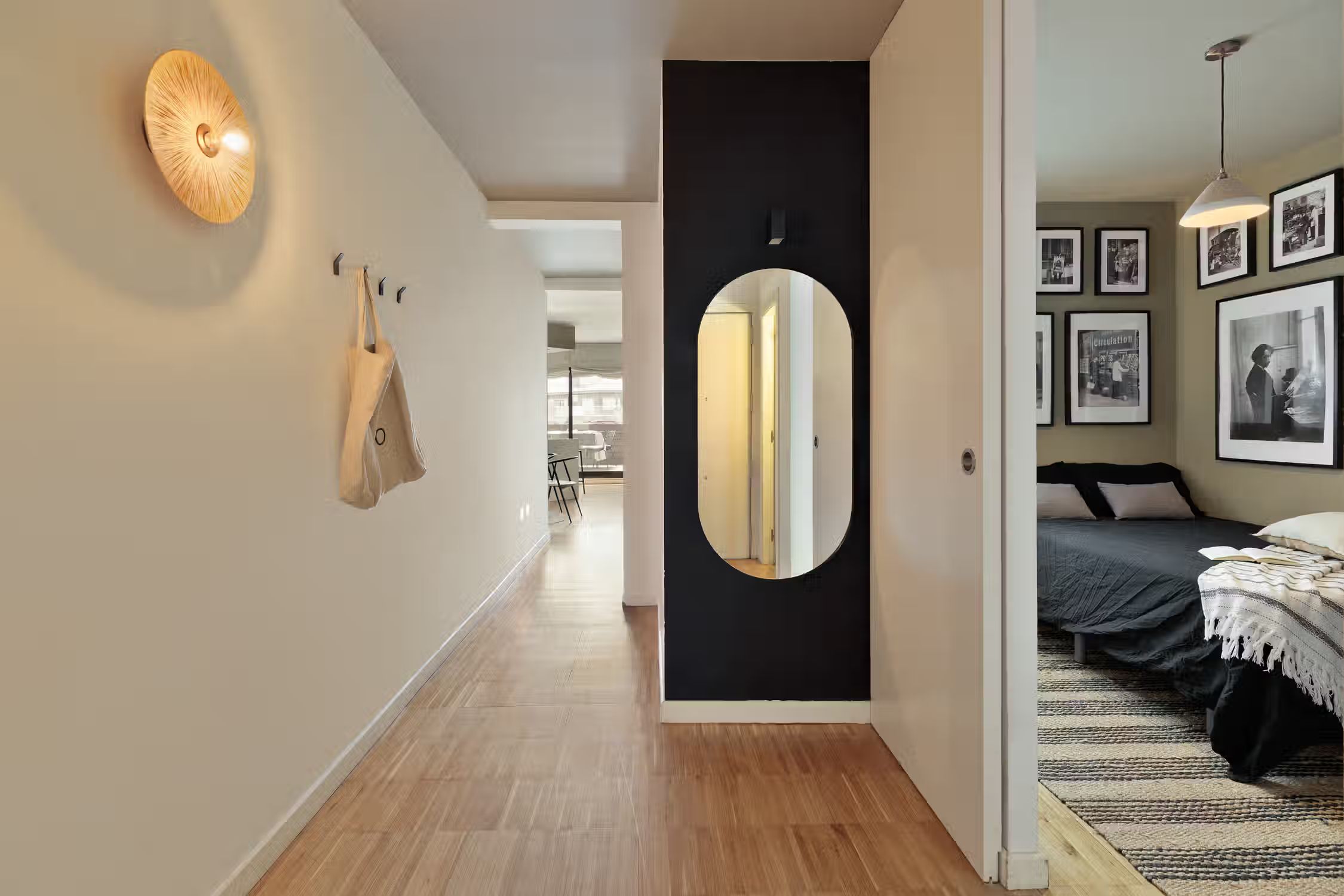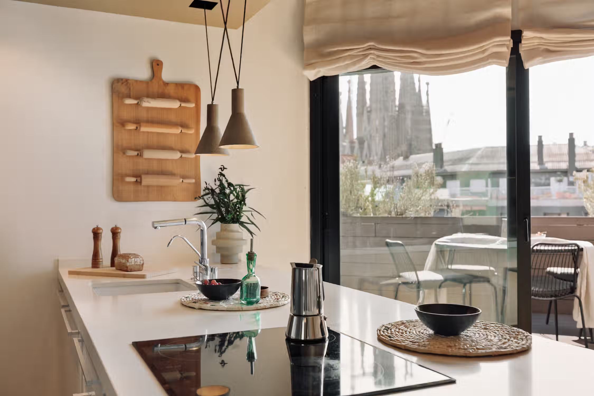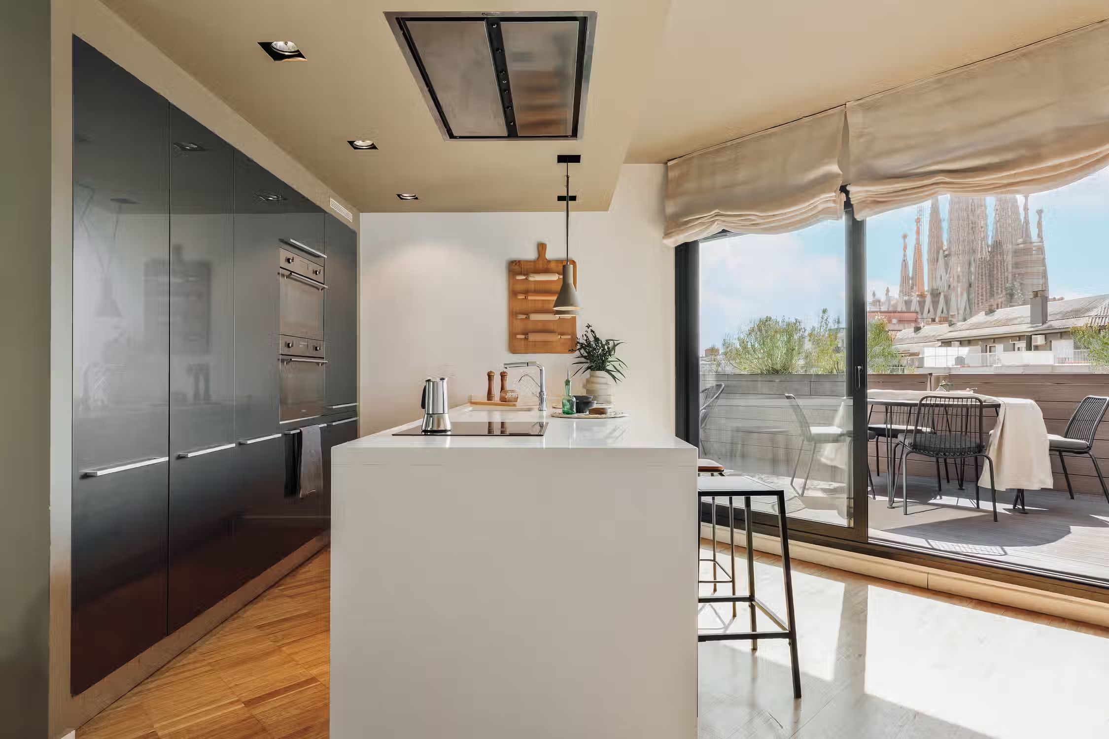 It is rare to find a flat such as this one - a huge terrace, views of the Sagrada Familia, and amazing decor! The wrap around outdoor terrace has a lounge area with a sofa and low table, as well as a dining area. Turn the corner and find a huge rocking sofa chair facing the sun. Walk into the flat and find a guest room, uniquely designed with frames covering the walls and a pull out couch bed. Down the hallway is an open plan kitchen which is completely new with a sleek kitchen island. The open plan living room is flooded with natural light, with discreet wood decor on the walls. The living room comes with a sitting area, and a small round dining area. There is a private alcove with a custom made desk for all your work from home needs. The living room gives access to the fantastic terrace which overlooks Gaudi's famous Sagrada Familia. The master bedroom can be accessed by the other side of the terrace. There is ample storage space and a queen sized bed with new sheets. There is an ensuite bathroom with a shower, and fresh towels. For comfort, this apartment comes equipped with air conditioning in the Living room and in one bedroom