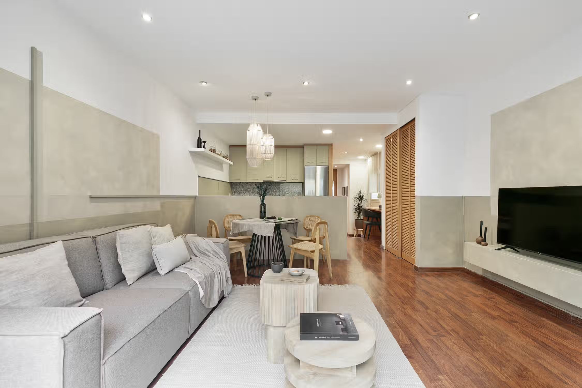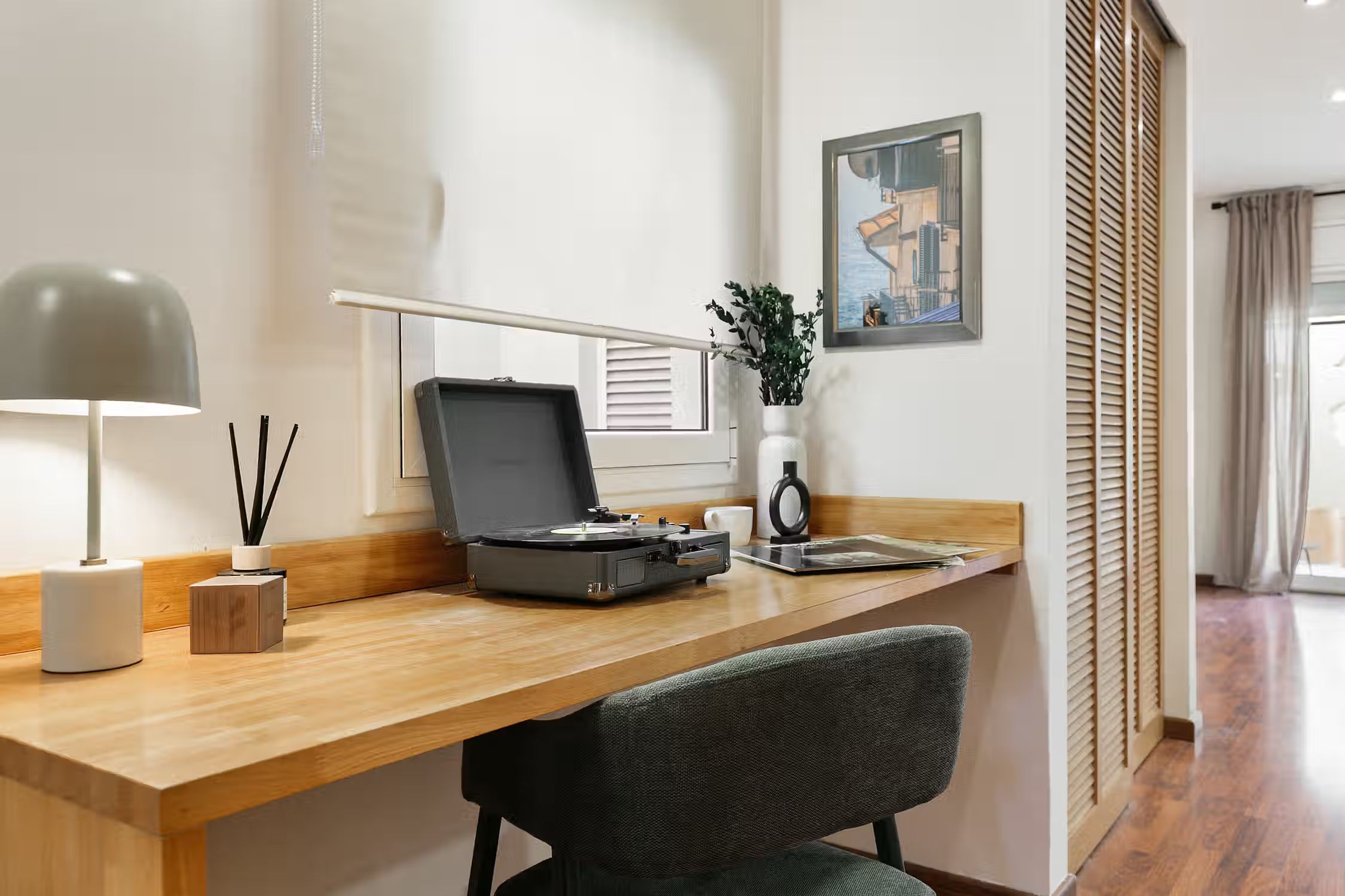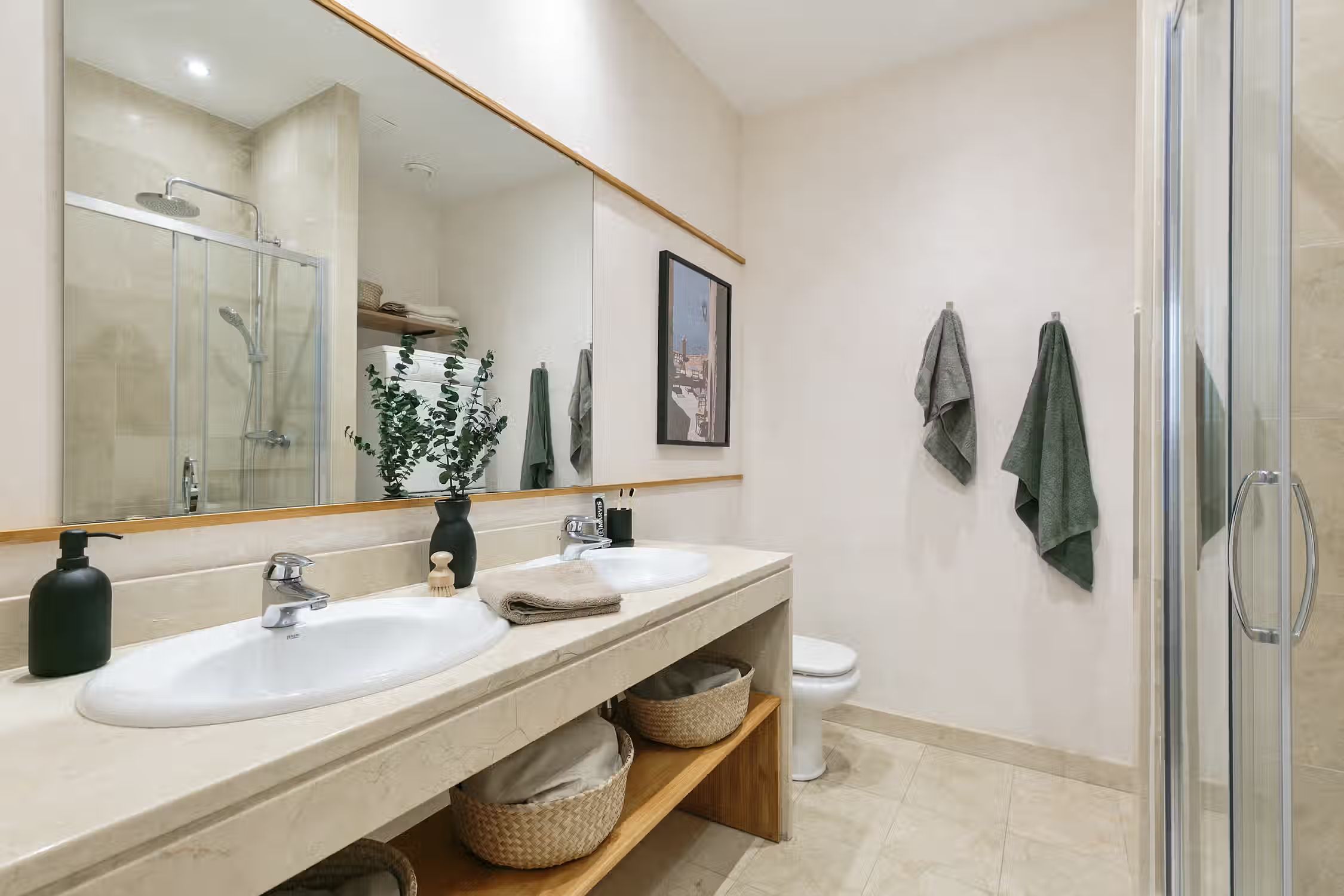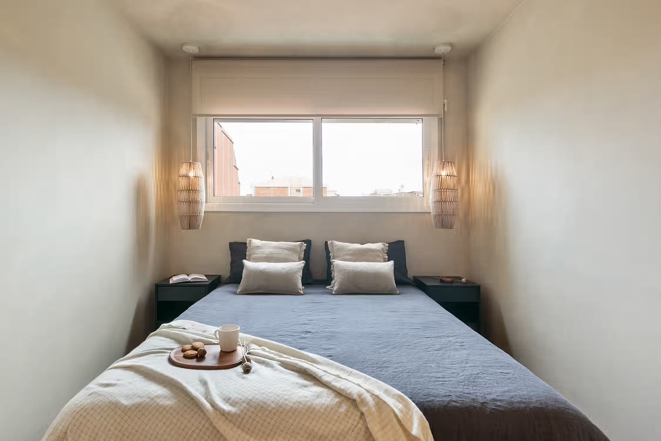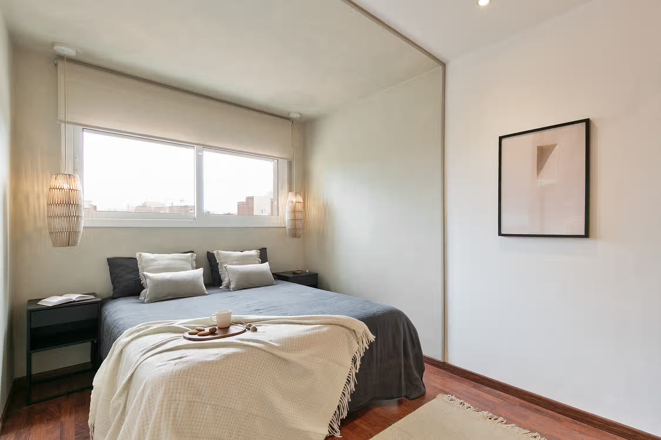 Welcome to Nerano, a delightful beach-themed apartment located in the vibrant neighborhood of Gracia in Barcelona. This cute area is perfect for enjoying an outdoor drink, shopping the trendy stores, and getting a great bite to eat. After a day of exploring, come home to Nerano for absolute indulgence. Spanning 80 square meters, Nerano is designed to provide a comfortable and relaxing atmosphere. The apartment features two tastefully decorated bedrooms, both equipped with queen-size beds to ensure a restful night's sleep. One of the bedrooms also includes a dedicated workstation, providing a convenient space for work or study during your stay. The one bathroom is chic and functional in design and provides the perfect place to get ready for your day. The heart of Nerano is the spacious living room, where you can unwind and enjoy quality time with family and friends. This space is decorated in true beach style, with its sandy neutral color scheme and woven light wood chairs. Relax in the comfortable seating area while watching your favorite movies or shows on the entertainment system. The dining table offers a cozy spot for meals, and the large windows flood the room with natural light, creating a bright and welcoming ambiance. Step outside from the living room and discover the charming terrace. The terrace is a perfect spot to soak up the sun or enjoy al fresco dining. With its sitting area and outdoor dining table, you can savor your meals while taking in the refreshing breeze and delightful views of the surroundings. The fully furnished kitchen is equipped with modern appliances and offers everything you need to prepare your favorite dishes. Adjacent to the kitchen, you'll find a dedicated workstation, providing a comfortable space to catch up on emails or work on any tasks that require your attention. To ensure your comfort during your stay, Nerano is equipped with air conditioning, allowing you to adjust the temperature to your preference and enjoy a pleasant indoor environment. Fully furnished, this apartment comes with everything you need, including bedding and linens