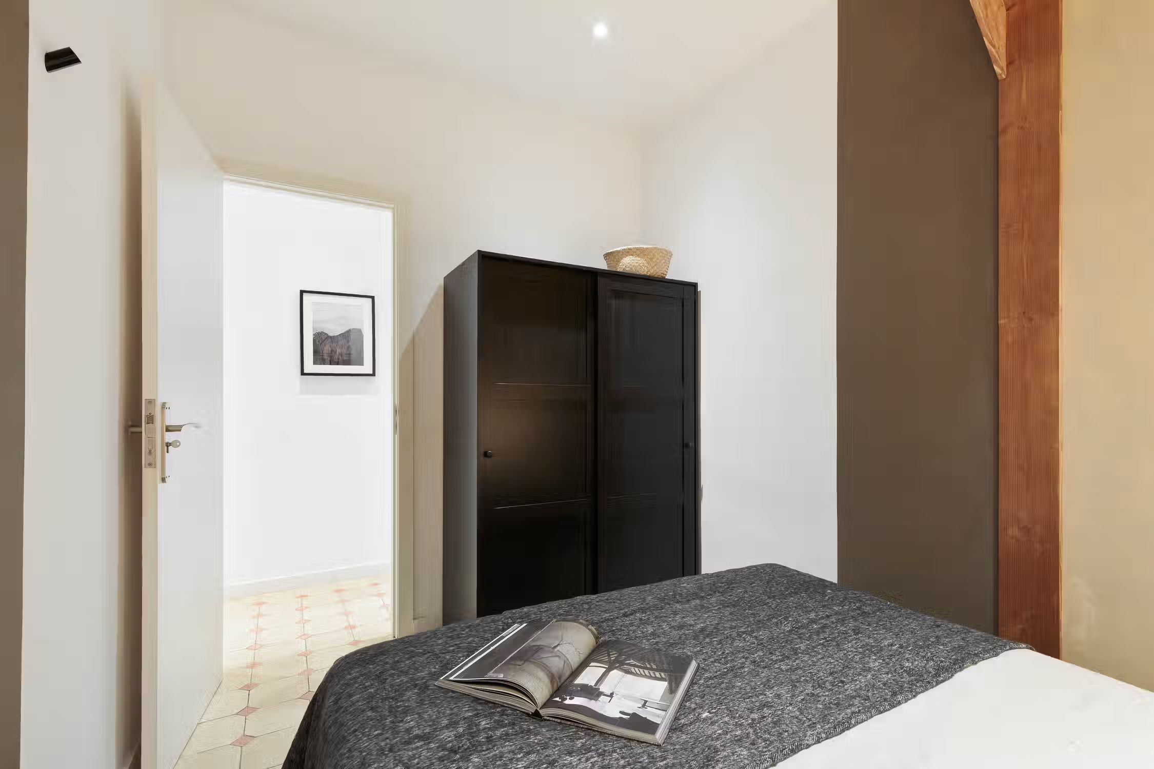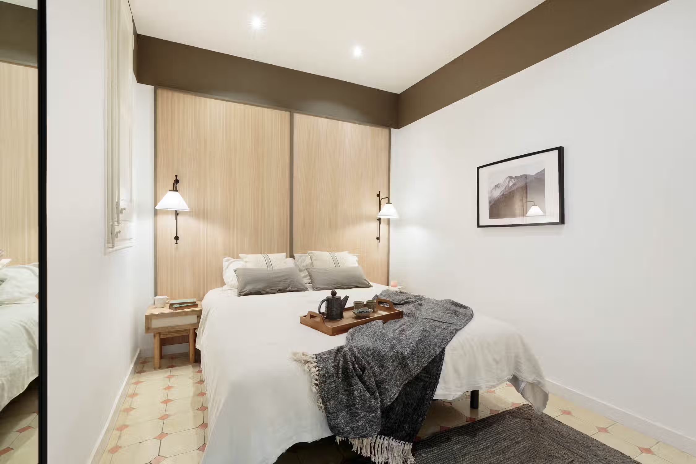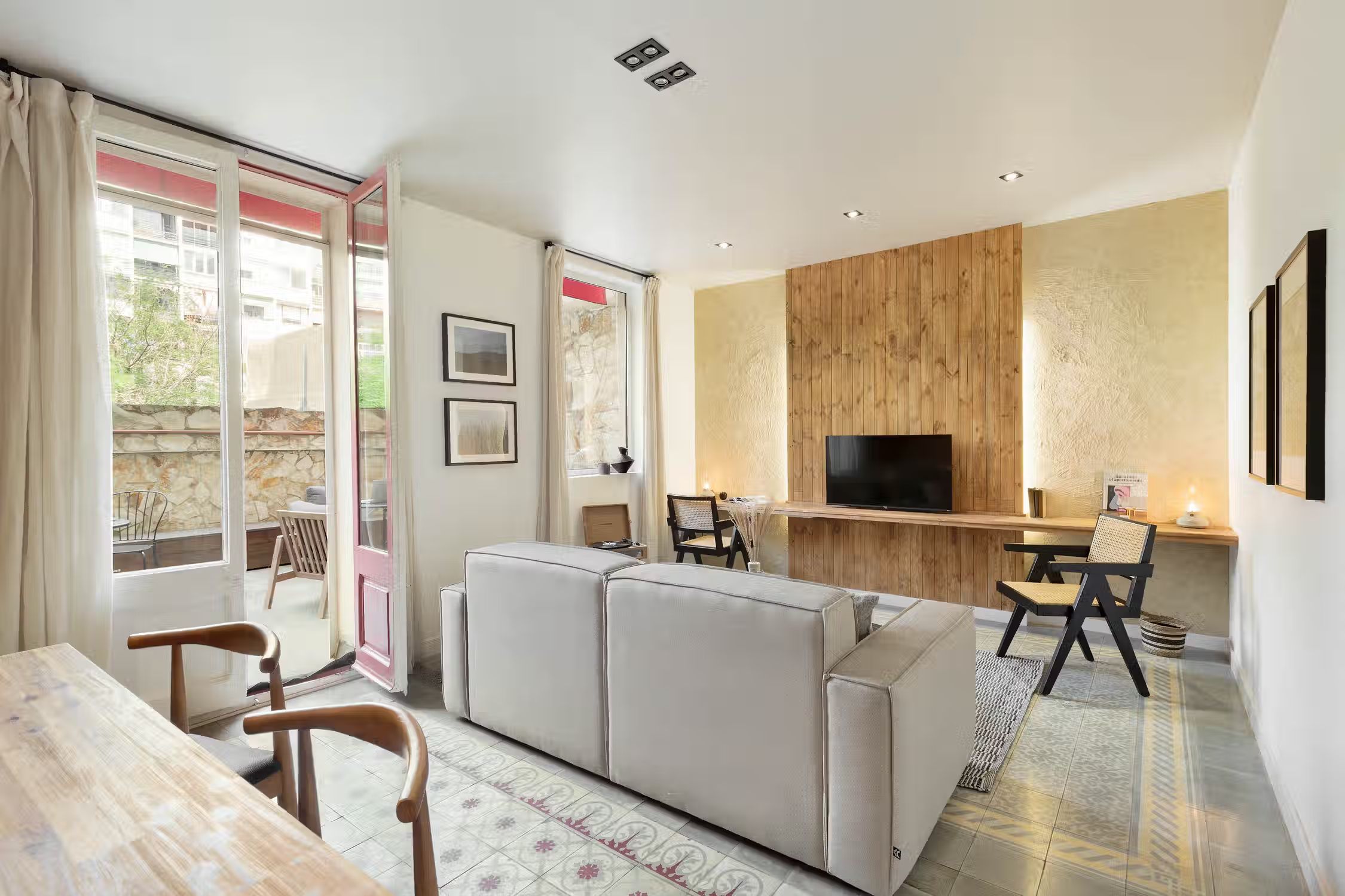 Welcome to Jaiz, a delightful mountain-themed apartment nestled in the heart of the L'Antiga Esquerra de l'Eixample neighborhood in Barcelona. Explore the captivating architecture of the city, indulge in delectable local cuisine, or simply immerse yourself in the energy and charm that Barcelona has to offer. With its warm and inviting ambiance, Jaiz offers a tranquil retreat for your stay in this vibrant city. Spanning 73 square meters, Jaiz features two tastefully furnished double bedrooms, each boasting a comfortable queen-size bed. The bedrooms provide a serene haven where you can unwind and rejuvenate after a day of exploration. The hanging light features and wooden beams evoke a feeling of mountain serenity from within the bedrooms. The apartment offers a well-appointed bathroom, ensuring convenience and privacy for all guests. The living room in Jaiz is thoughtfully designed with your comfort in mind. It features a dedicated workstation, providing a space where you can catch up on work or stay connected with loved ones. The dining table offers an inviting setting for enjoying meals together or planning your itinerary for the day. As you relax in the living room, you can easily access the expansive terrace, creating a seamless connection between indoor and outdoor living spaces. The fully furnished kitchen in Jaiz is equipped with modern appliances and offers ample counter space, making it a pleasure to prepare your favorite meals. Whether you're a seasoned chef or a novice cook, you'll find everything you need to whip up delicious dishes and create lasting memories around the dining table. As you explore Jaiz, you'll discover a dressing room, providing generous storage space for your belongings and allowing you to keep your living areas clutter-free and organized. To ensure your comfort throughout your stay, air conditioning is available in the living room, allowing you to create an ideal temperature for relaxation and rejuvenation. Fully furnished, this apartment comes with everything you need, including bedding and linens