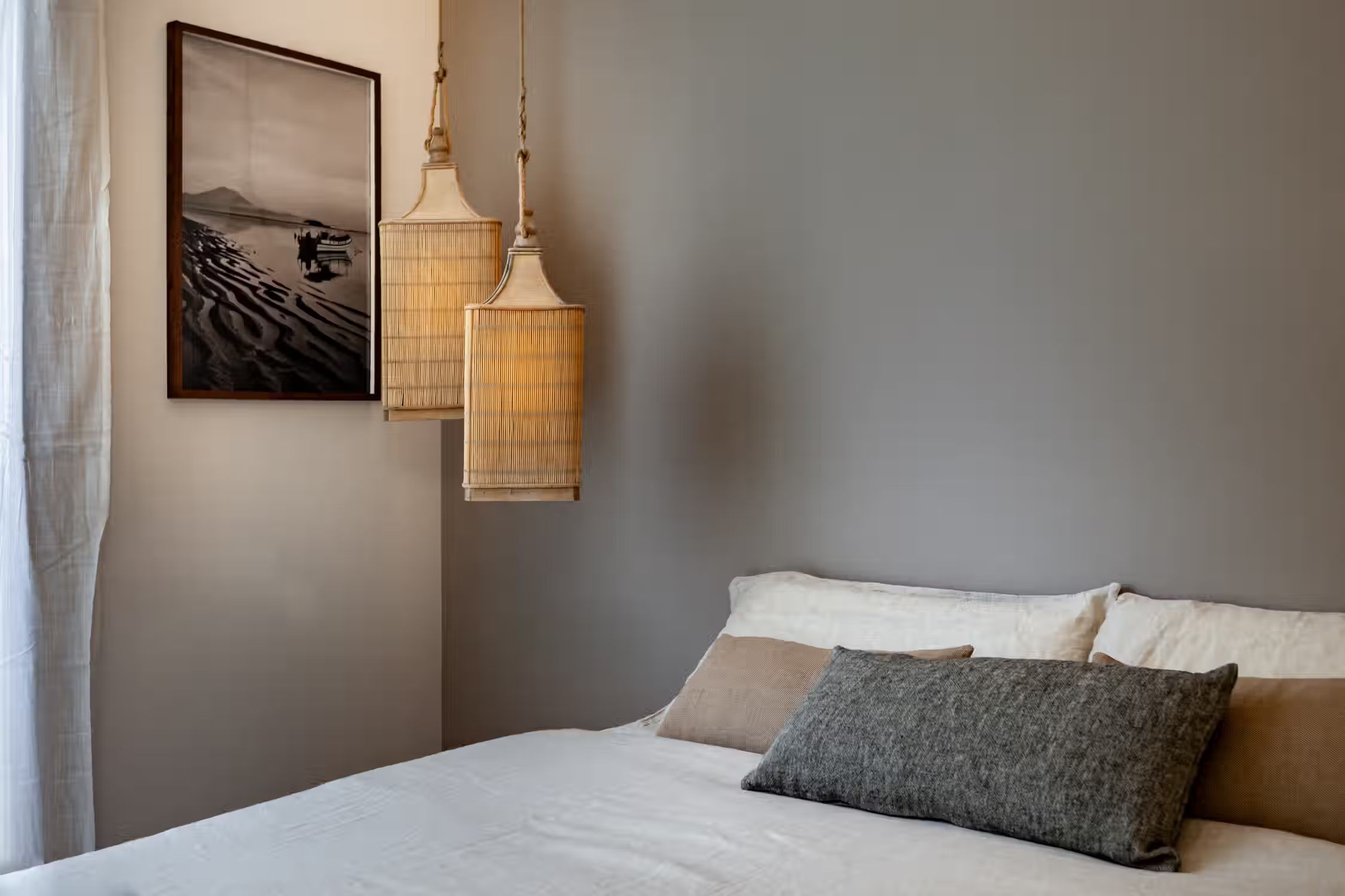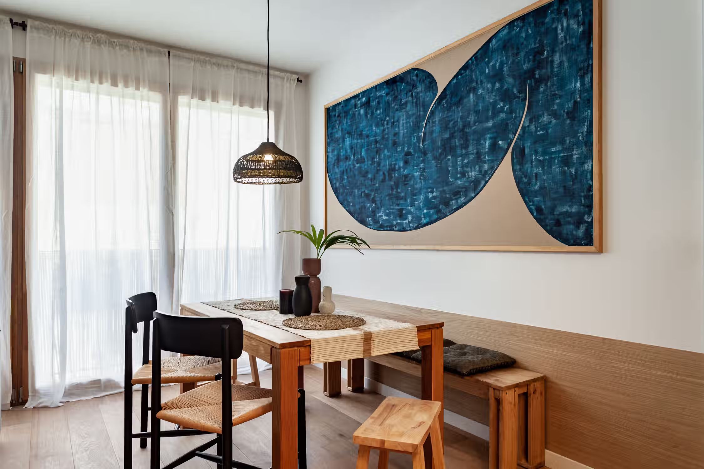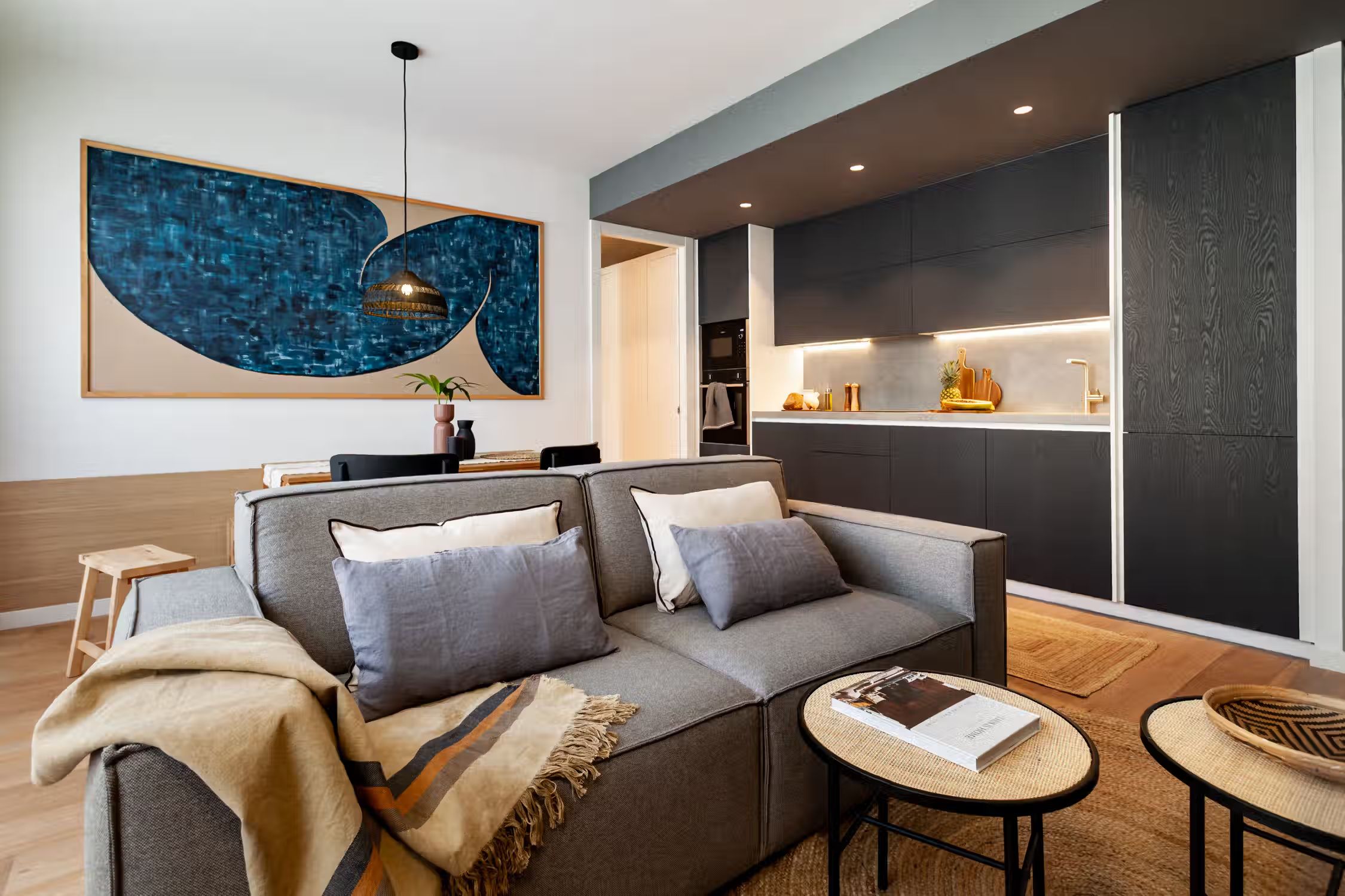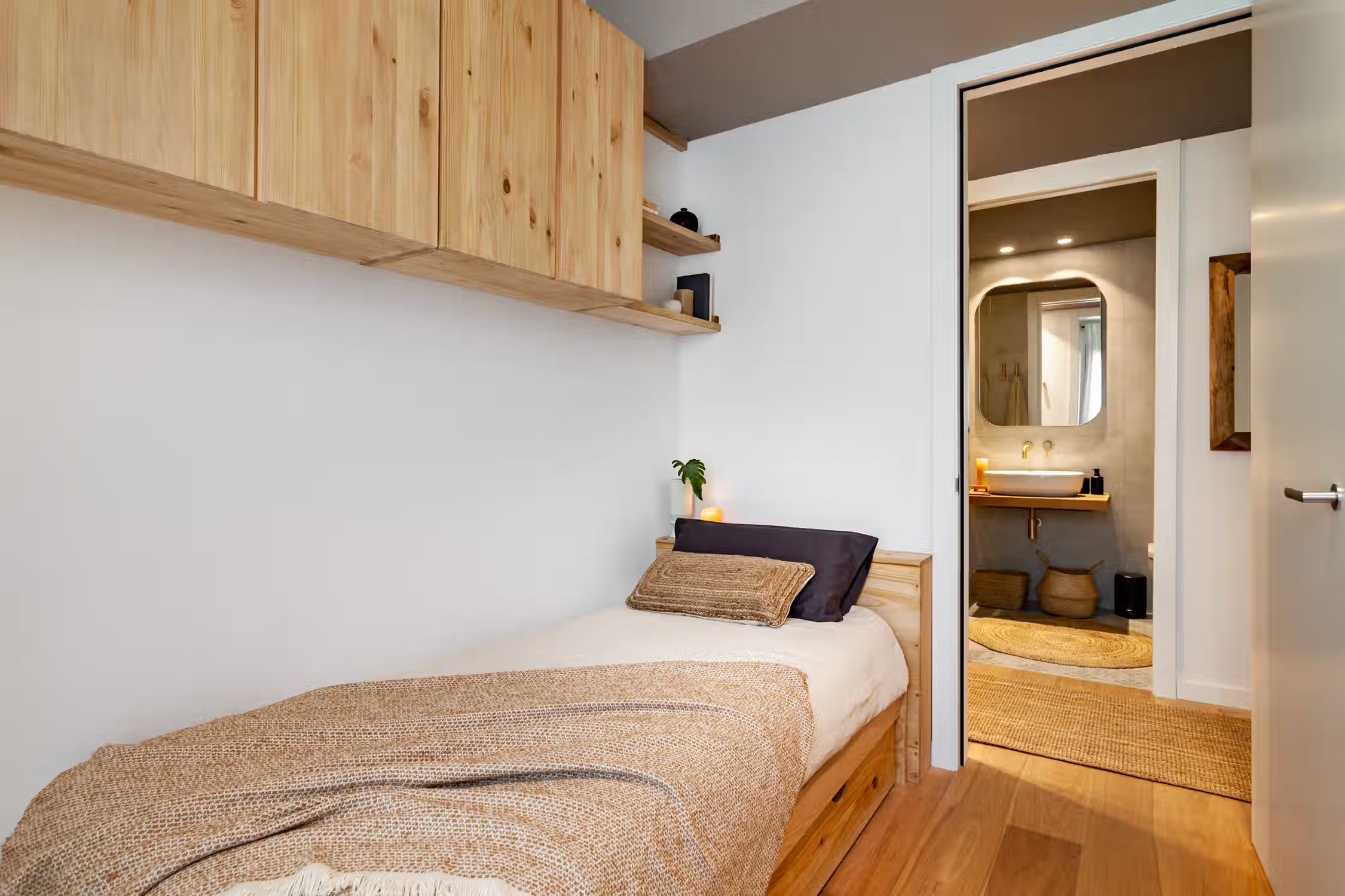 Weaving together Southeast Asian design with Catalonian classics, Oetune is a 65 square meter marvel. The awe continues from its interiors to outside the home in the lively Gracia neighborhood. Peruse the many local artisan shops or have a bite at any of the famed tapas bars. Barcelona boasts a majority of sunny days, which is aided by Oetune’s shared rooftop pool and solarium. Making a luminous first impression, Oetune offers an open-concept living and dining area at the very entrance. Nearest to the front door, a lounge area with designer furnishing and jute touches invites a sensation of entertainment. Cool blues remind guests of the Indonesian design roots with a large, handmade art piece hanging behind the seven-person dining set to the right of the room. Double French doors lead to the living room balcony. The wall opposite the French doors highlights the kitchen space. Modern appliances and sleek cabinetry are flush with the wall to create a well-concealed, yet fully-functional cooking area. Down the hallway, the first door to the left is Oetune’s office. Indonesian art hangs throughout the space, framing the dedicated workstation in the corner. Ample storage space resides nearest the office’s entry. The next door on the left is Oetune’s first bedroom. Perfectly suited for visitors, a single bed clothed in organic textiles sits to the right with built-in storage hanging overhead. Across the hall is Oetune’s detached bathroom. Travertine tile meets Catalonian-style flooring to create a spa-like space. The bathroom is complete with an all-glass, walk-in shower. At the end of the hall is the ensuite bedroom. Once through the bedroom doors, the right door leads to the attached bathroom. Mirroring the same luxury of the detached bathroom, this space also offers an all-glass, walk-in shower with a delightful tiling blend. Into the bedroom, themes of radiance take over with natural light coming in through the balcony on the left and creamy textiles covering the queen-sized bed. Built-in storage sits to the right of the bed. All bedding and linens are provided