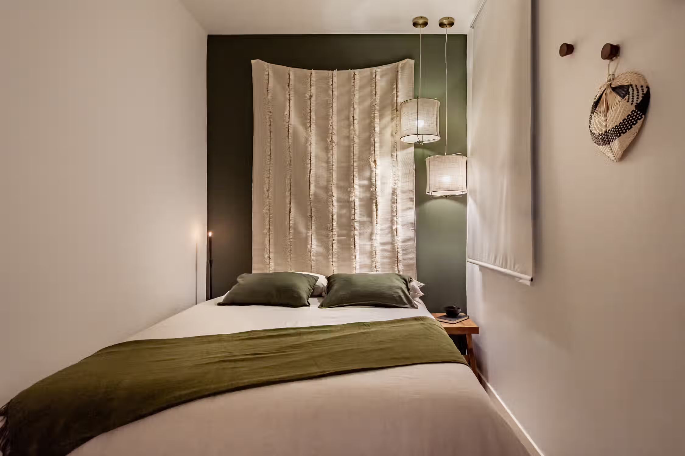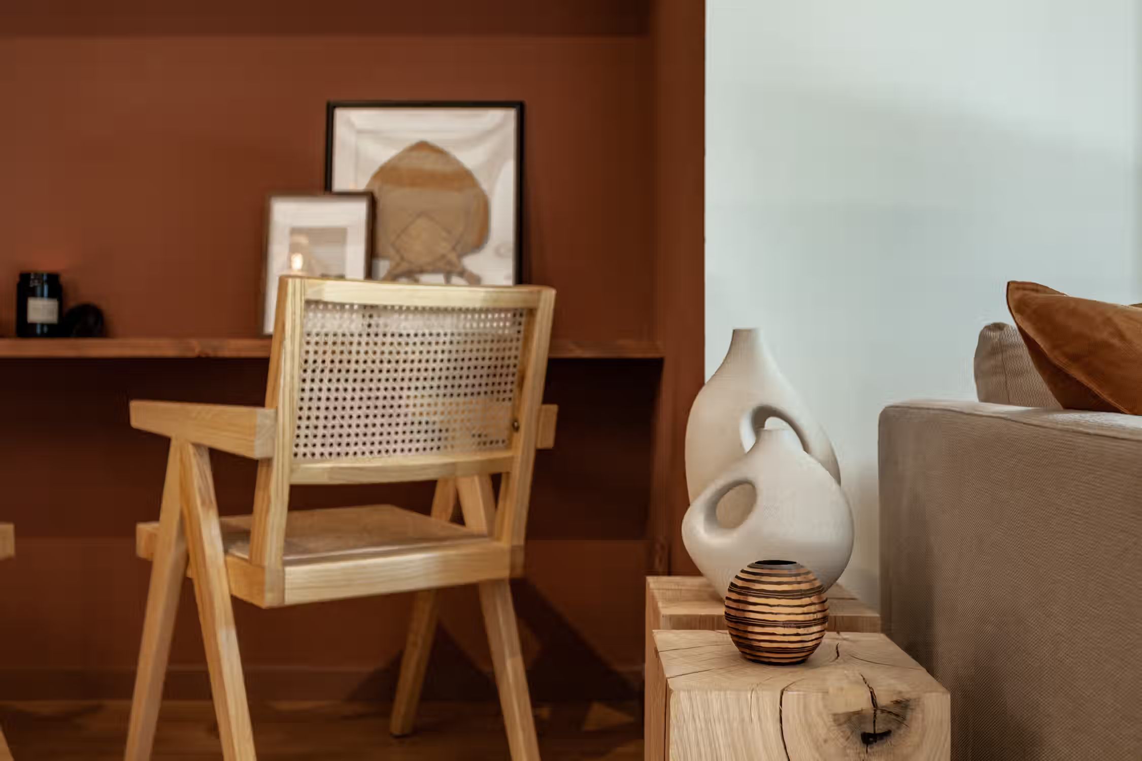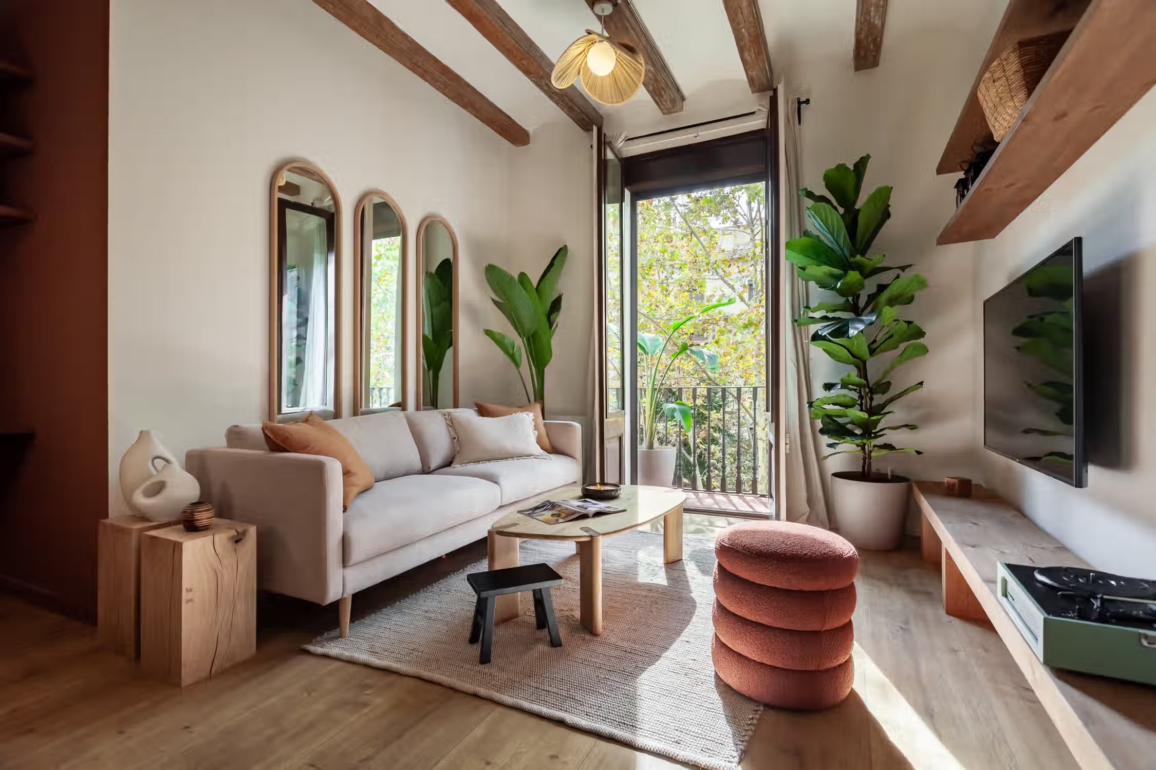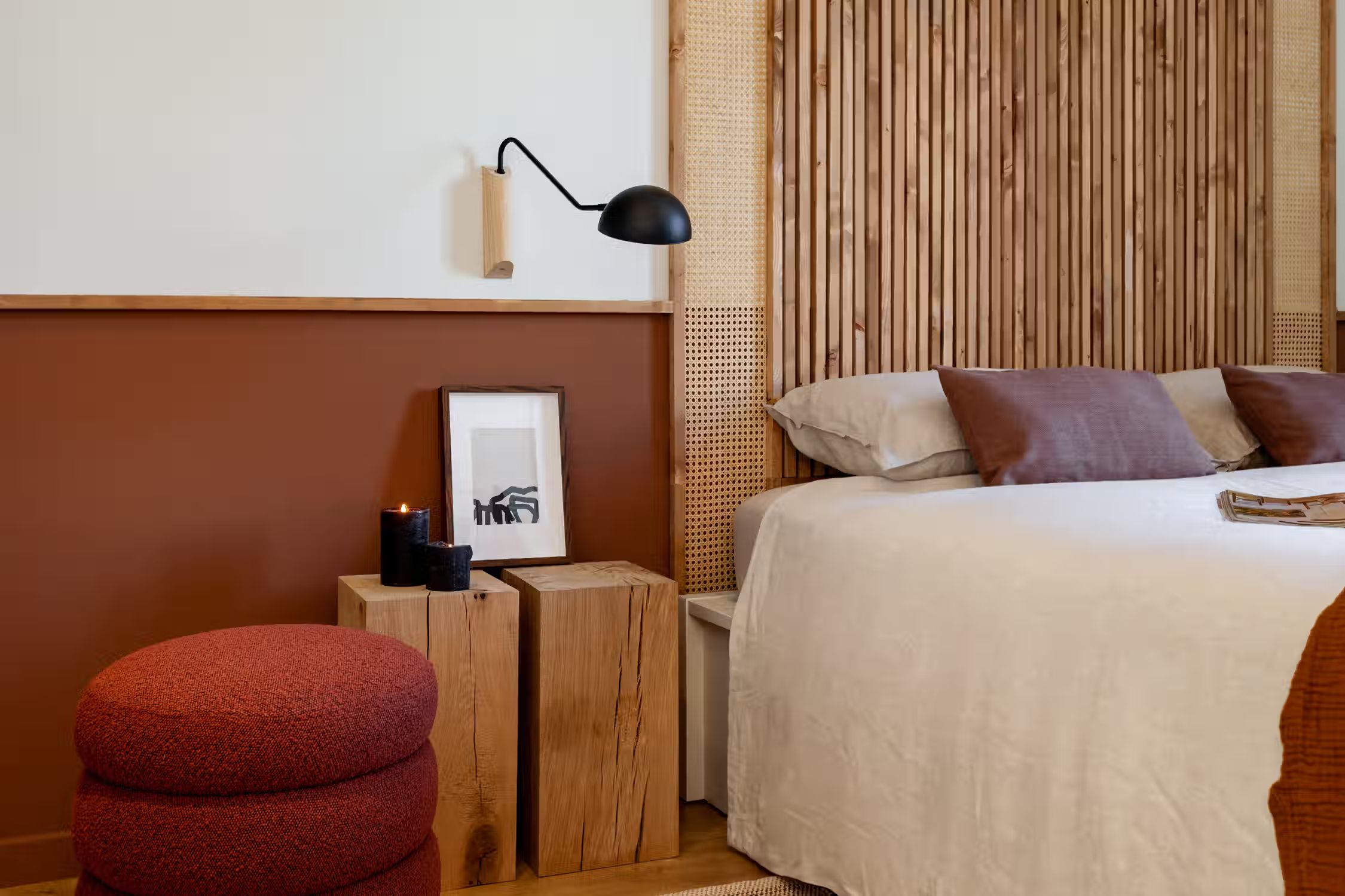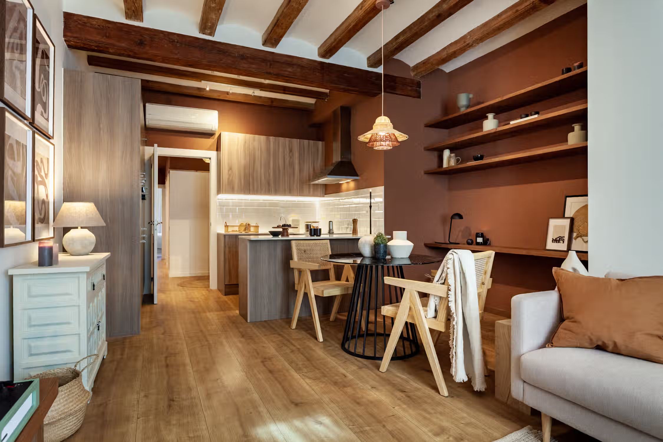 inspired by desert landscapes, uses burnt orange tones with a rustic design throughout the 75 square meter space. The apartment has 2 bedrooms, 2 baths and 2 balconies. The open plan kitchen, featuring varnished wooden cabinets, has all cooking utensils and appliances. There is a sleek black round dining table between the kitchen and lounge area. An alcove, painted in red. serves as a work area with custom-made desk and and wooden shelves. The living room features a sofa facing Smart TV and vinyl bluetooth speakers, and leads to an outdoor balcony. The main bedroom is spacious with ensuite bathroom and ample storage. The queen-size bed has an impressive custom-made wooden headboard. There is access to a second balcony. The second bedroom is unique with a hand-made hanging fabric over the queen-sized bed. The second bathroom is in the hallway. For comfort, this apartment comes equipped with air conditioning in the Living Room and in one Bedroom. Both bathrooms have showers, and all bed & bath linens are provided