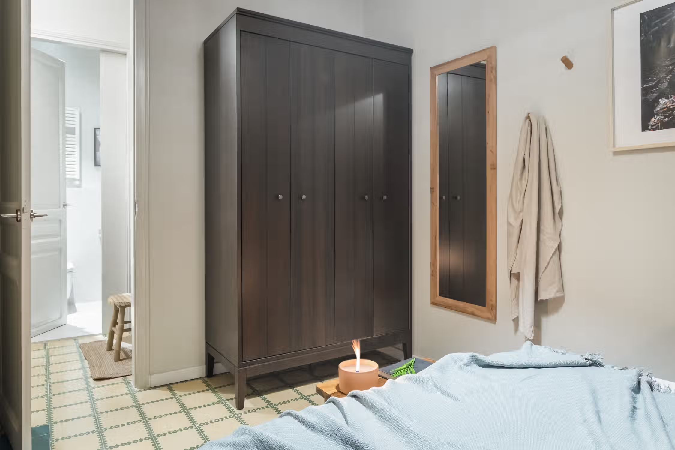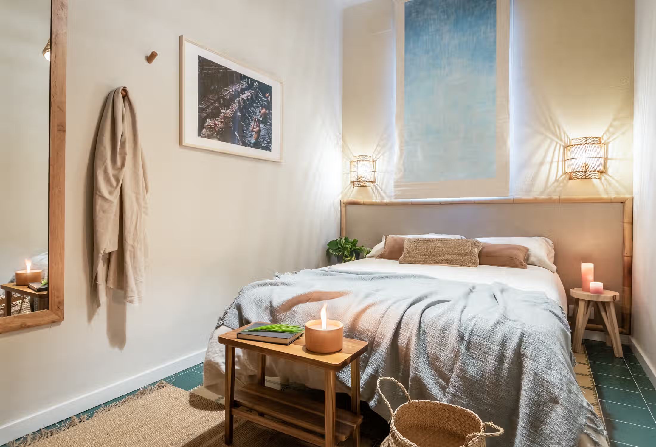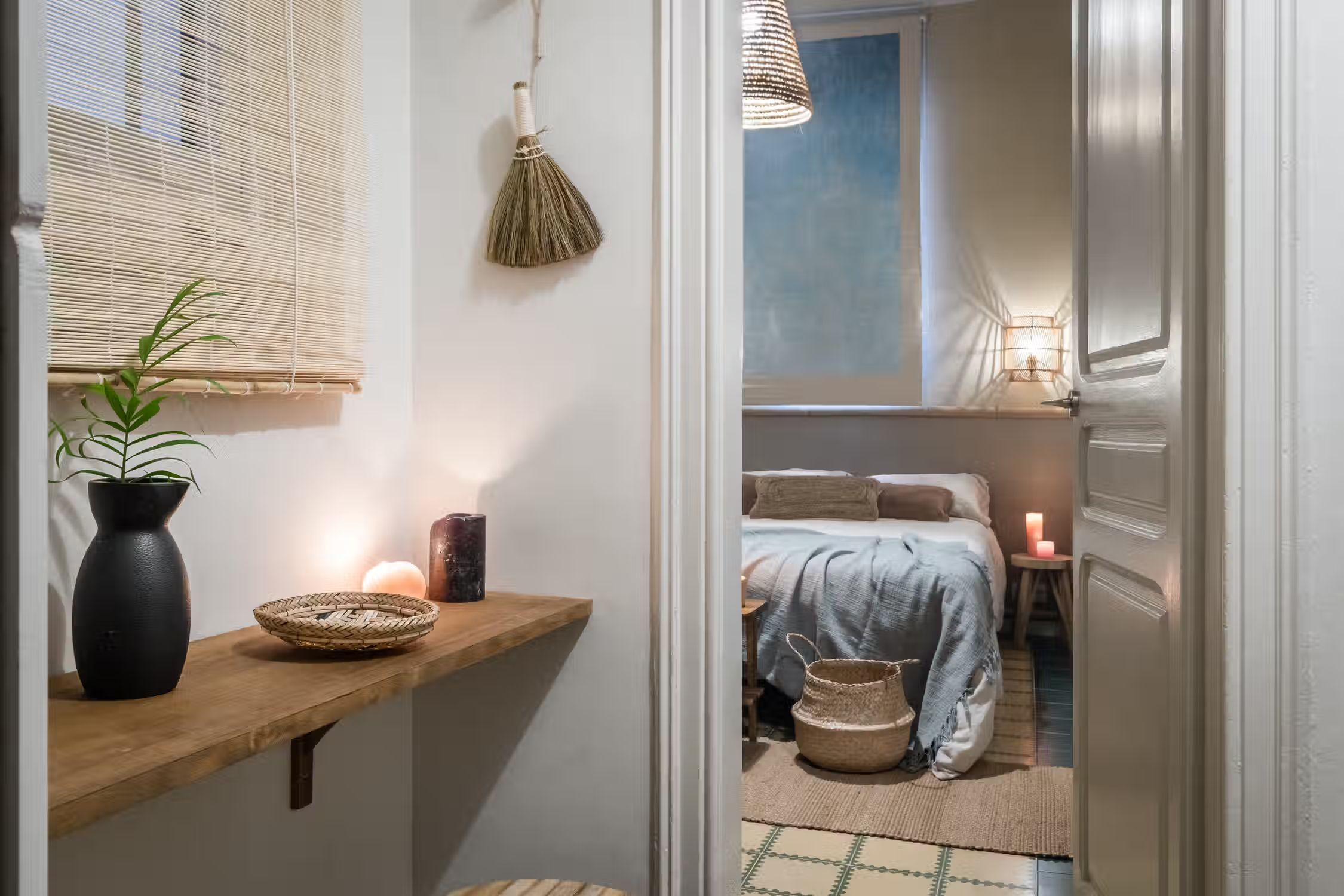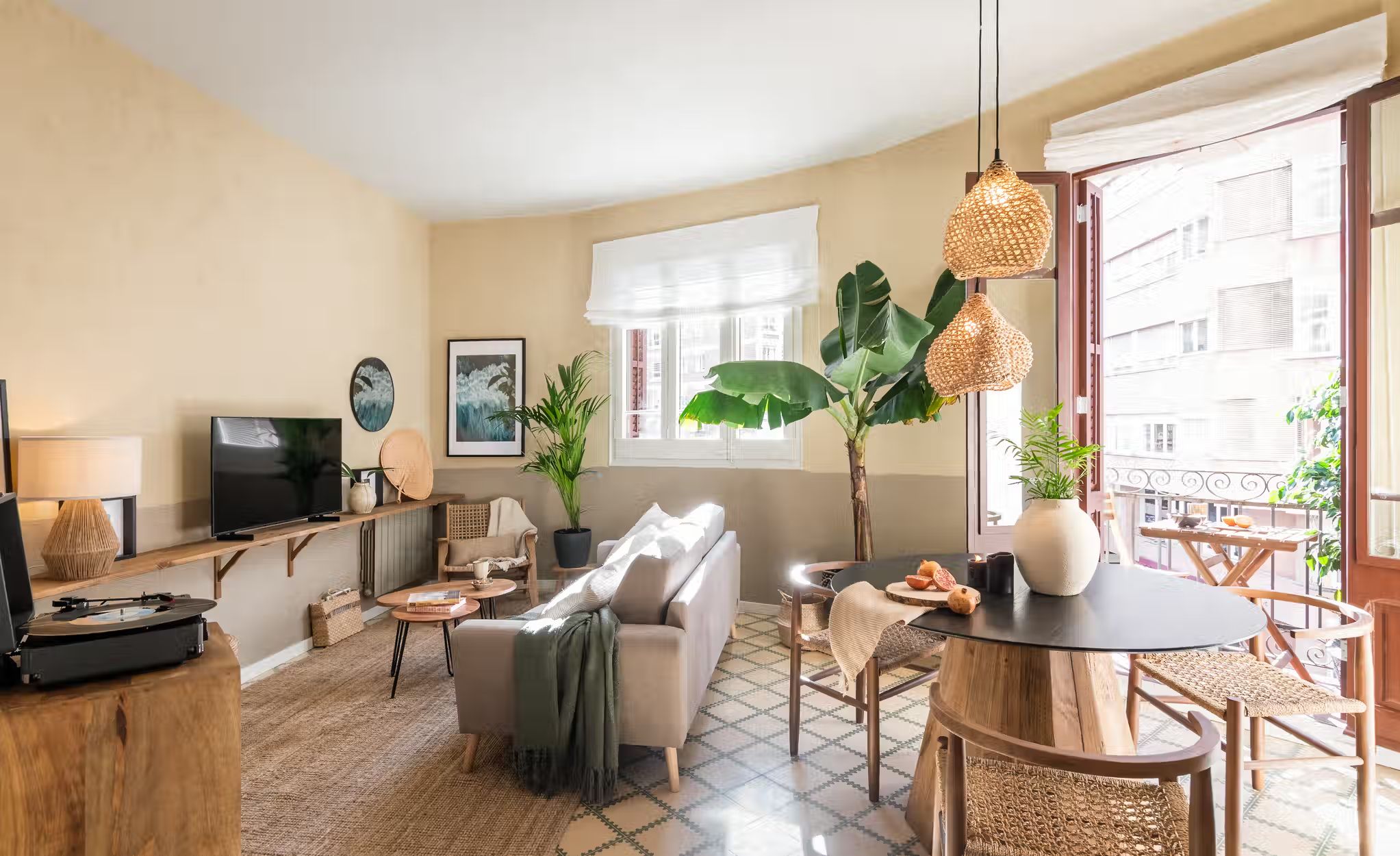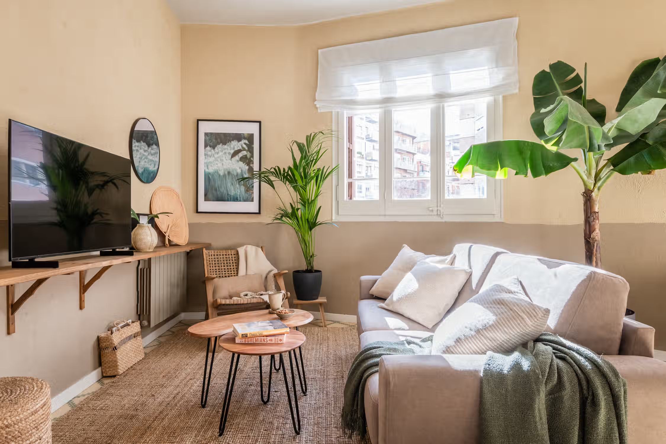 This two-bedroom, two-bath gem is perfectly positioned for the gastronomy-lover and culture-aficionado alike. Eixample is the neighborhood for exploration and recreation which is echoed both in the surrounding area of Tomini and within the space. Tomini’s style is as trendy as the neighborhood it resides in. Step inside this chic apartment to find 76 square meters of pure style and unmatched character pulling from Indonesian and Southeast Asian design elements. The first striking characteristic is the light cast from the sun-baked balcony. Step outside and indulge in the Barcelona cityscape views that Tomini offers. Round the corner of the entryway to find the first bedroom tucked away. This room boasts a queen-sized bed, abundant storage, and plush linens. Just across the hall is the first bath, complete with modern fixtures and a walk-in shower. The main hall leads to a fully-equipped kitchen that later opens up to a lofty living and dining room. Elements of old and new are fused, with the original Eixample-esque flooring and contemporary conversation pieces. The second bedroom is a showstopper. Transcend to tranquility or buckle down on productivity with the duality of this space. This ensuite highlights comfort with an elegantly styled queen-sized bed as well as peak performance with a stylish workspace. The second bedroom also features its own ensuite bathroom