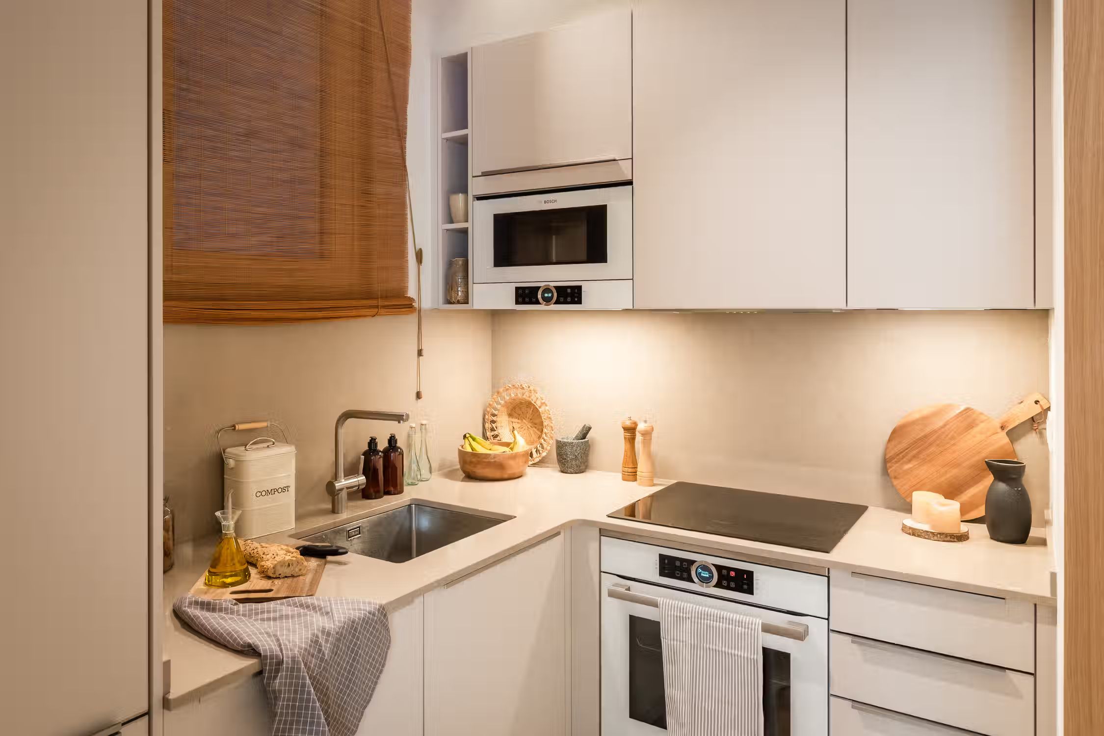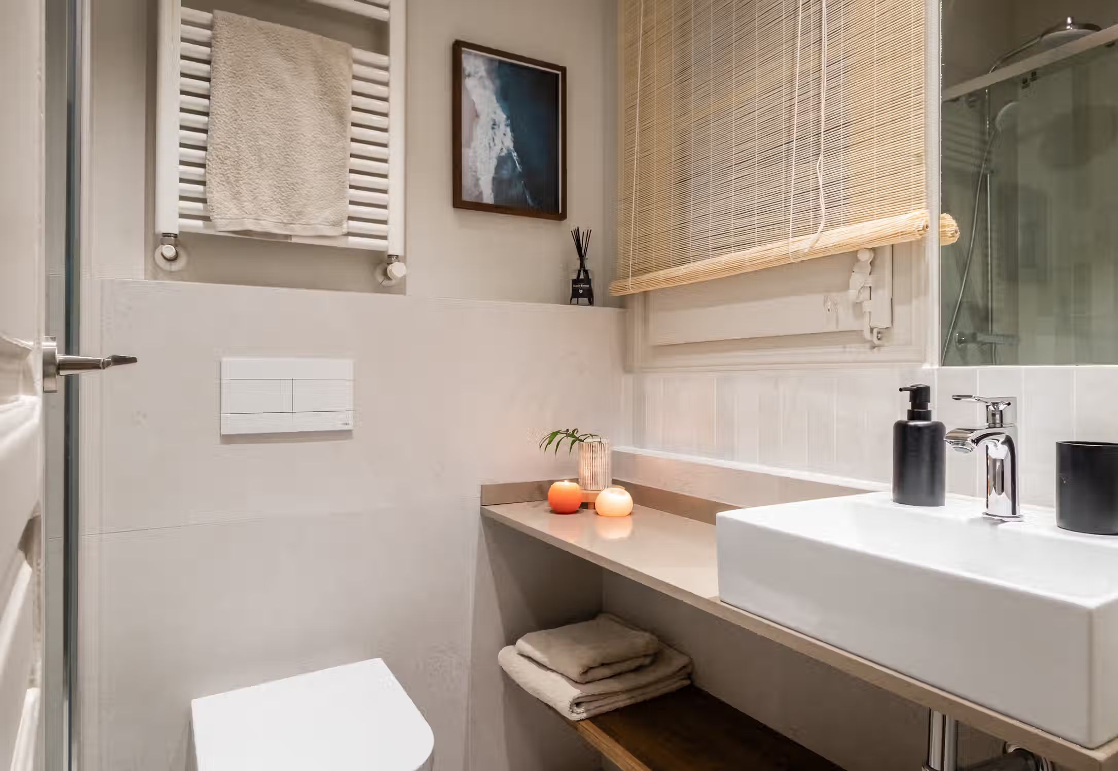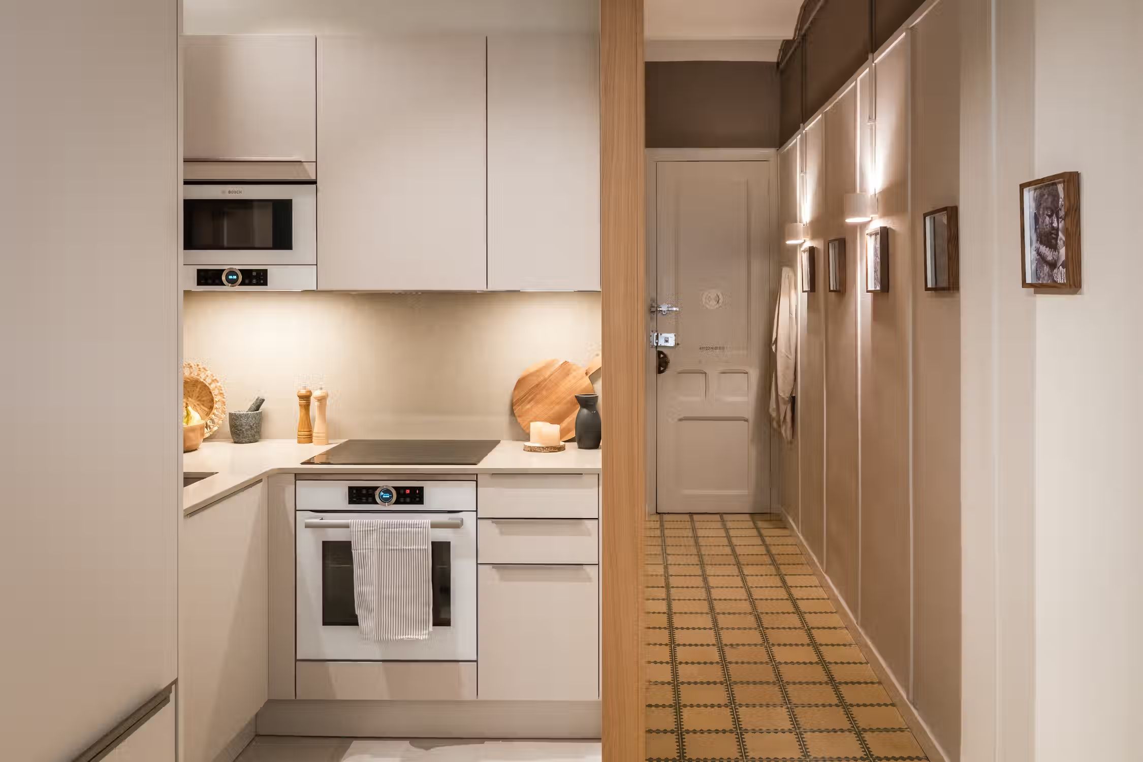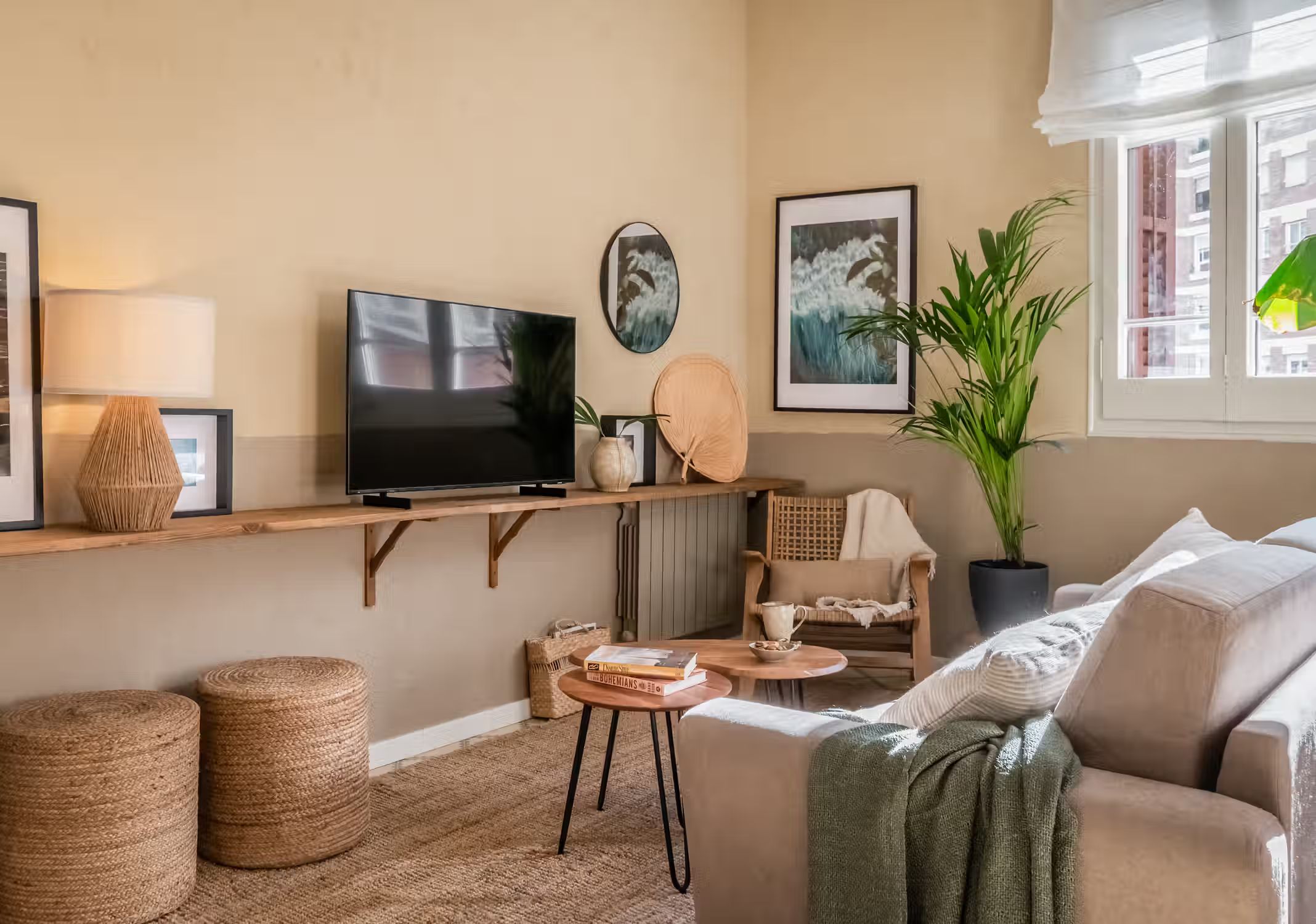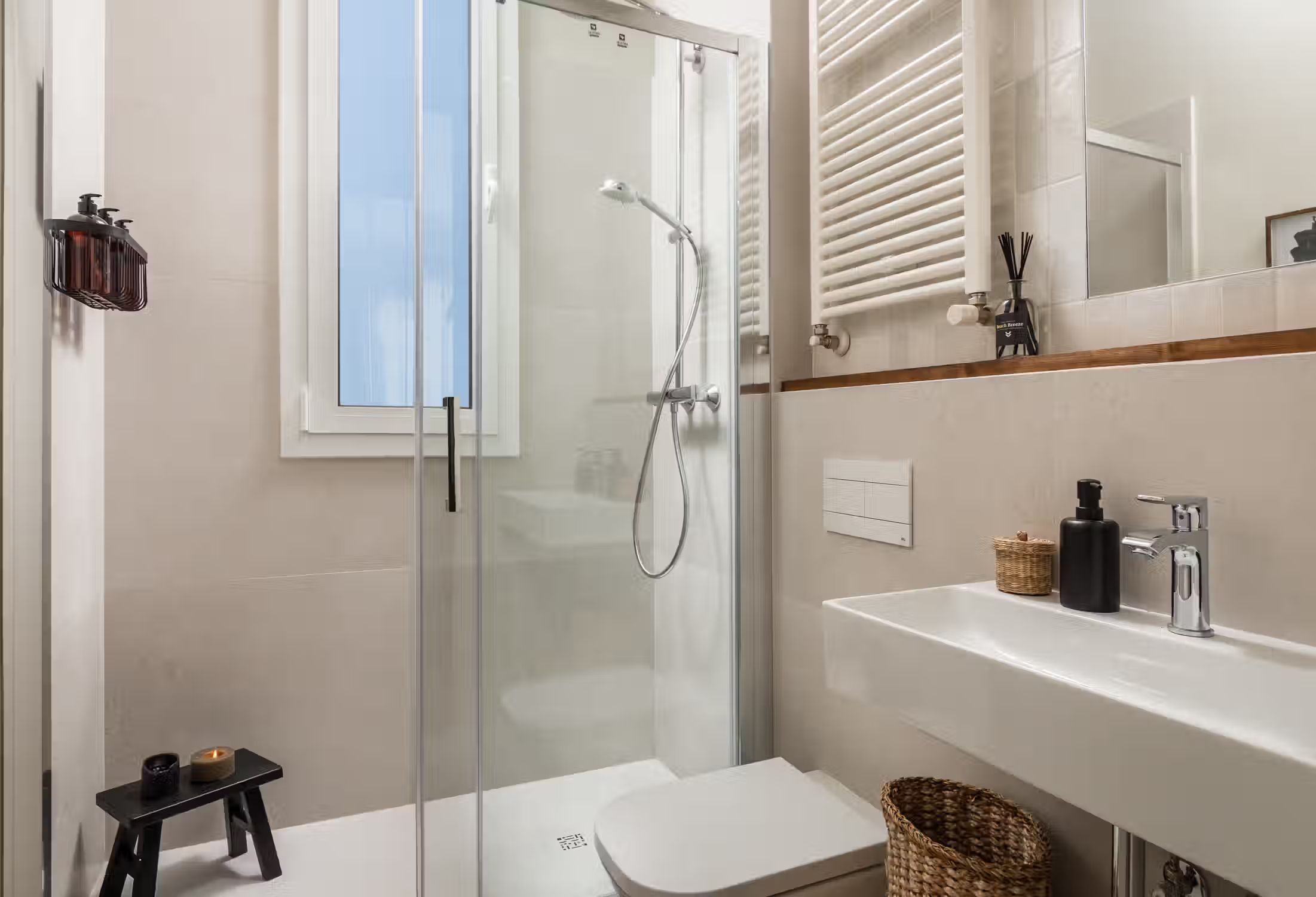 This two-bedroom, two-bath gem is perfectly positioned for the gastronomy-lover and culture-aficionado alike. Eixample is the neighborhood for exploration and recreation which is echoed both in the surrounding area of Tomini and within the space. Tomini’s style is as trendy as the neighborhood it resides in. Step inside this chic apartment to find 76 square meters of pure style and unmatched character pulling from Indonesian and Southeast Asian design elements. The first striking characteristic is the light cast from the sun-baked balcony. Step outside and indulge in the Barcelona cityscape views that Tomini offers. Round the corner of the entryway to find the first bedroom tucked away. This room boasts a queen-sized bed, abundant storage, and plush linens. Just across the hall is the first bath, complete with modern fixtures and a walk-in shower. The main hall leads to a fully-equipped kitchen that later opens up to a lofty living and dining room. Elements of old and new are fused, with the original Eixample-esque flooring and contemporary conversation pieces. The second bedroom is a showstopper. Transcend to tranquility or buckle down on productivity with the duality of this space. This ensuite highlights comfort with an elegantly styled queen-sized bed as well as peak performance with a stylish workspace. The second bedroom also features its own ensuite bathroom