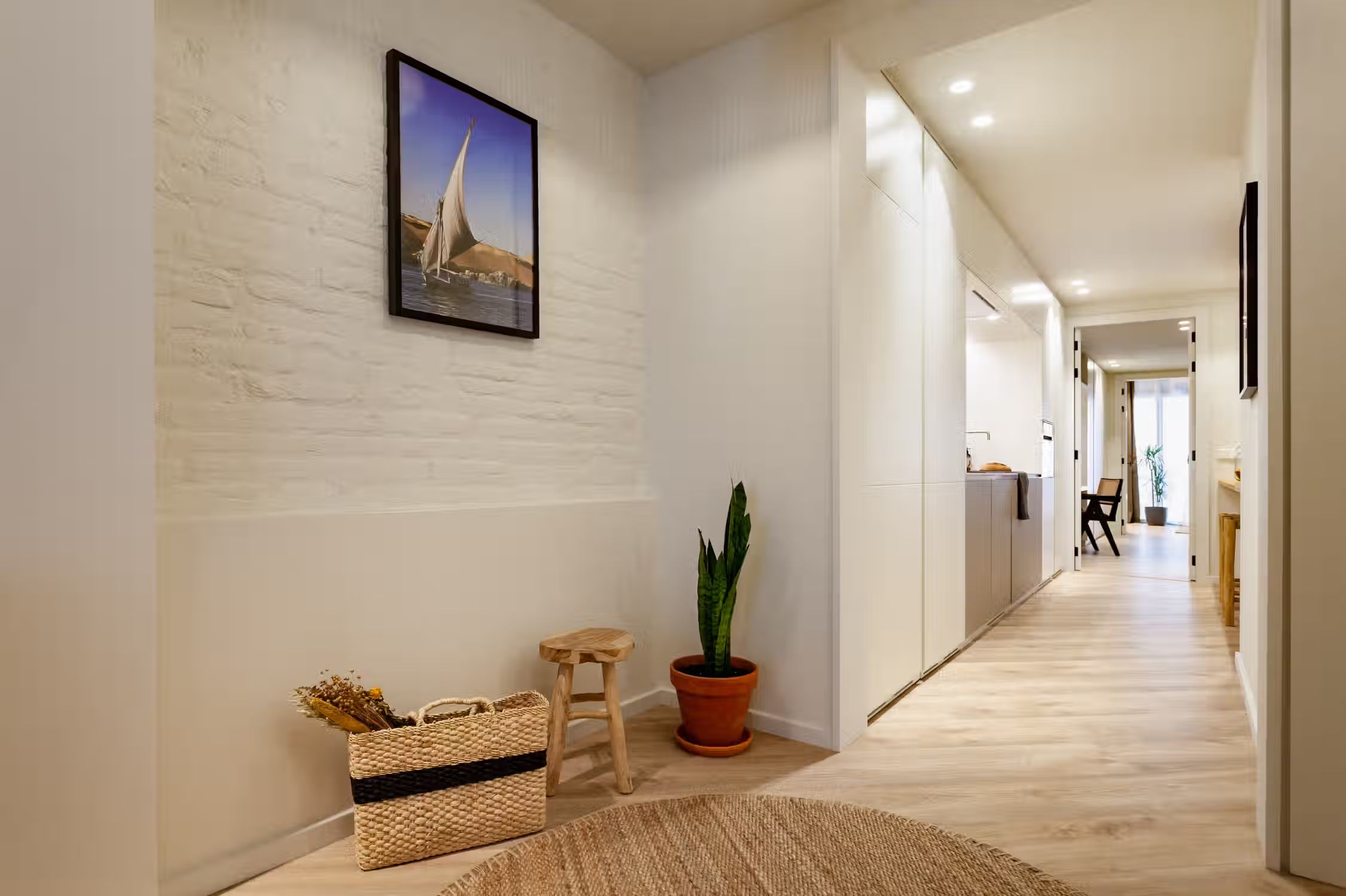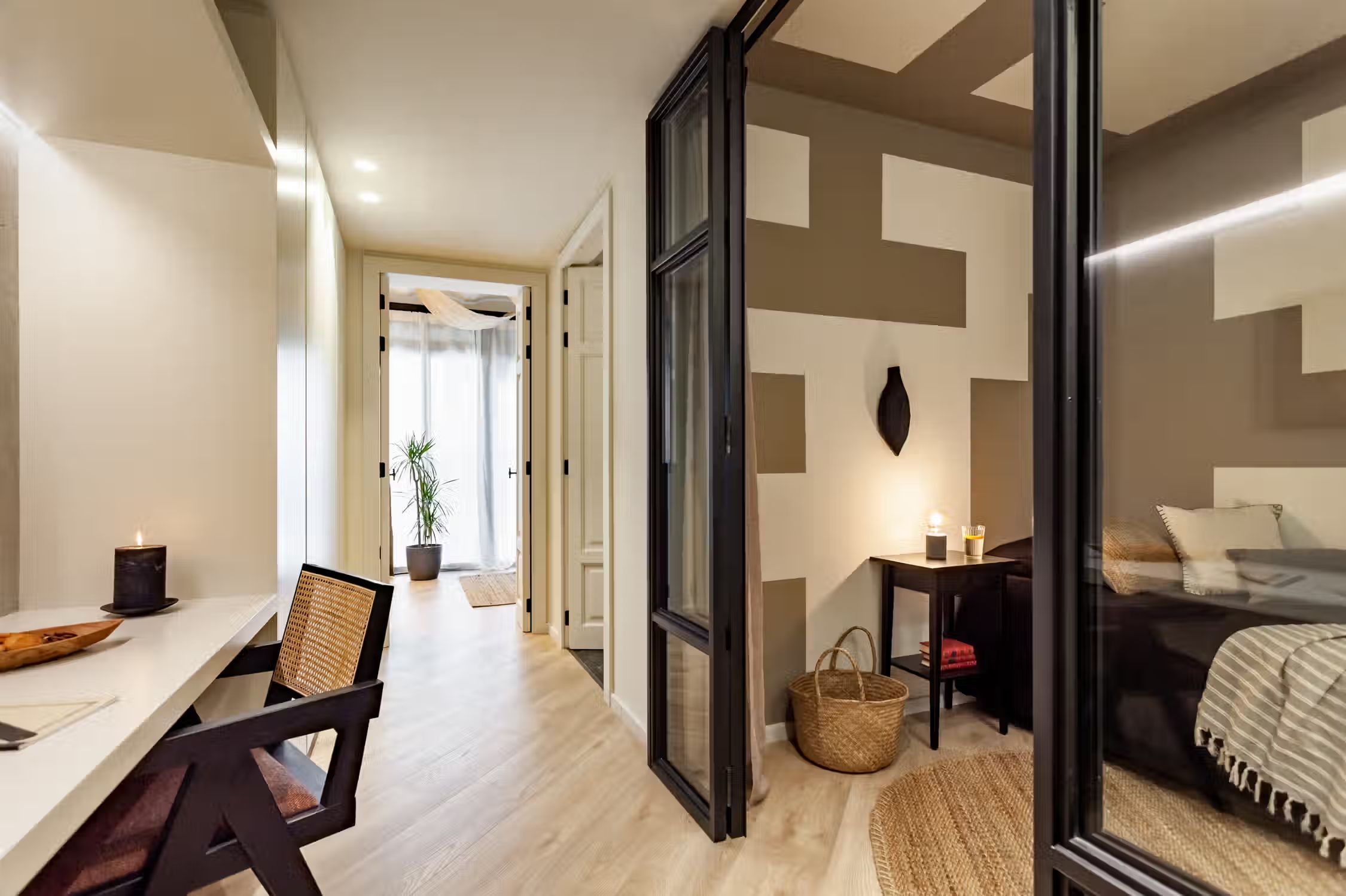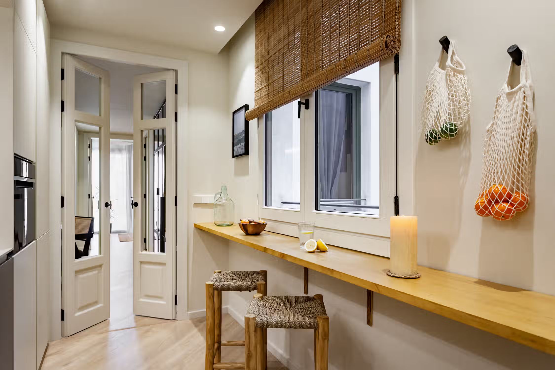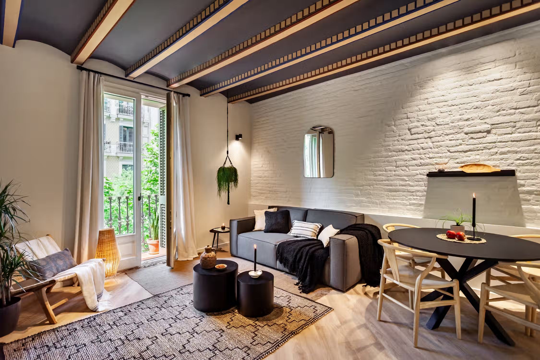 Step into Baharya’s living room with large window doors that open out to a small balcony, a white exposed-brick accent wall, and a gorgeous Saharan desert carpet. This 76 square meter desert-themed apartment tastefully packs in everything you need within its walls including a galley kitchen, a master double bedroom, a single room with a glass wall, one bathroom, a fully furnished kitchen, and a dedicated work space. This home comes with all of the furnishing you need, including bedding and linens, all of which match the desert toned features of Baharya. Light and breezy, this apartment allows for a taste of Barcelona’s Mediterranean climate right from the sofa