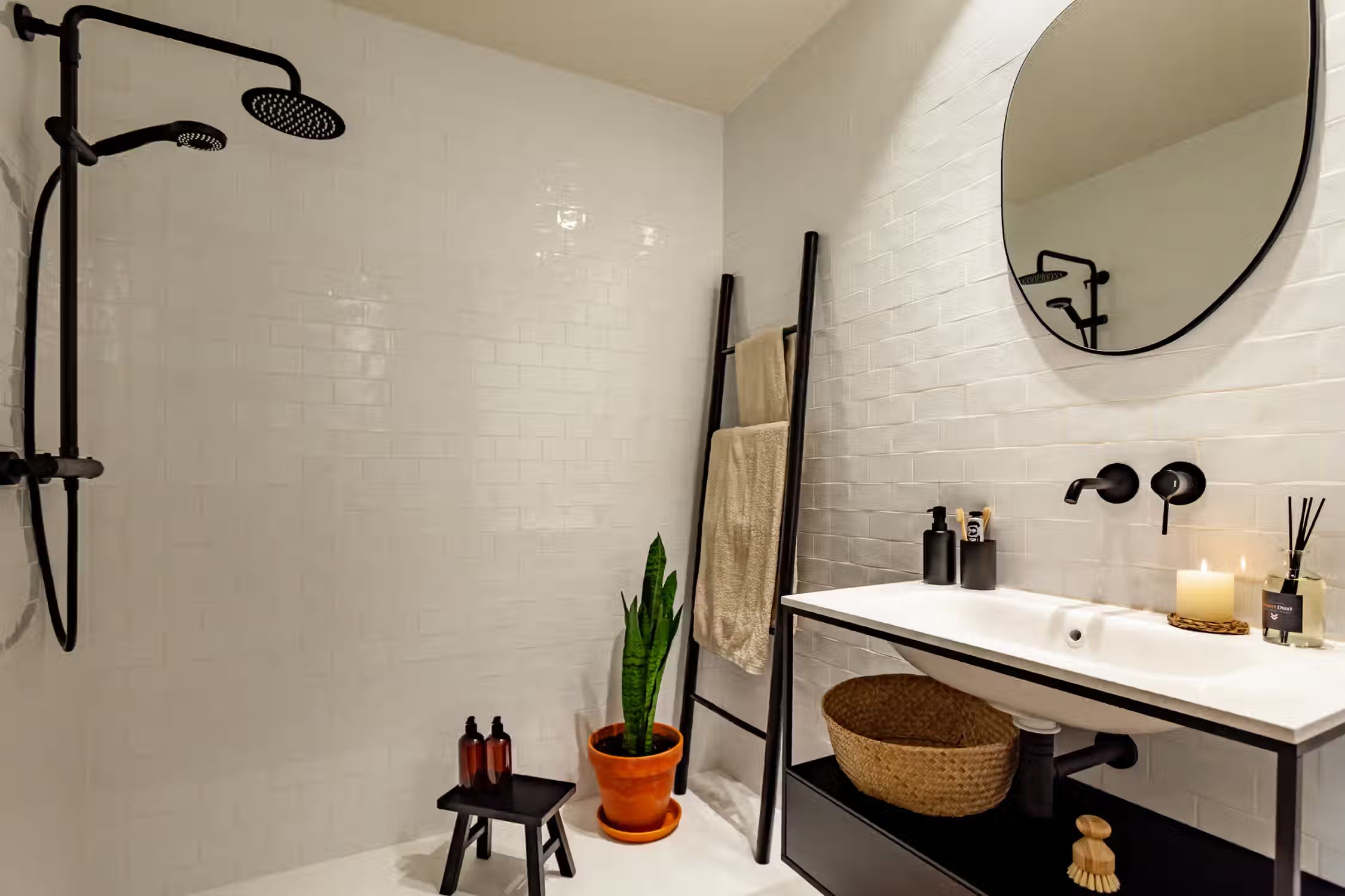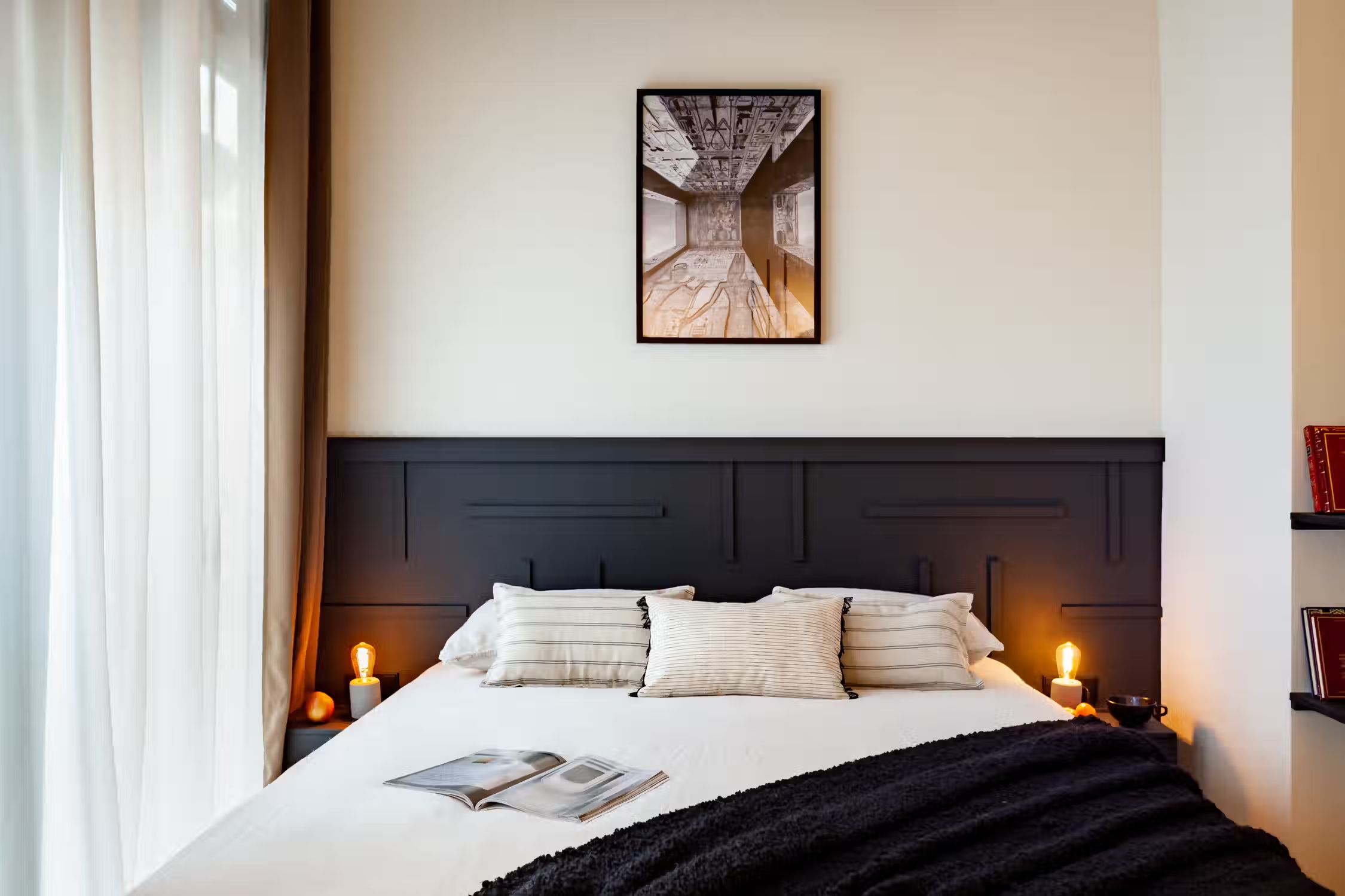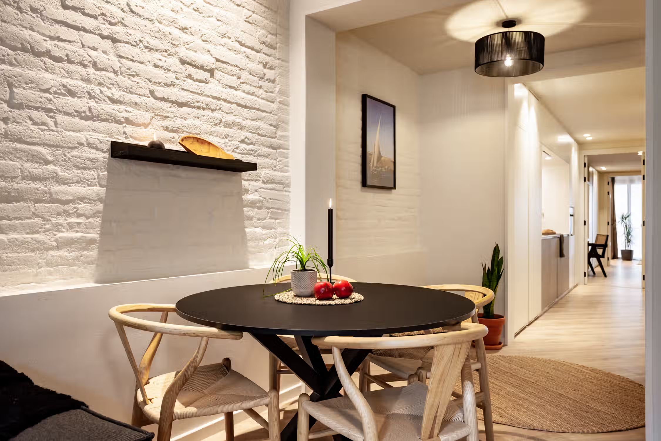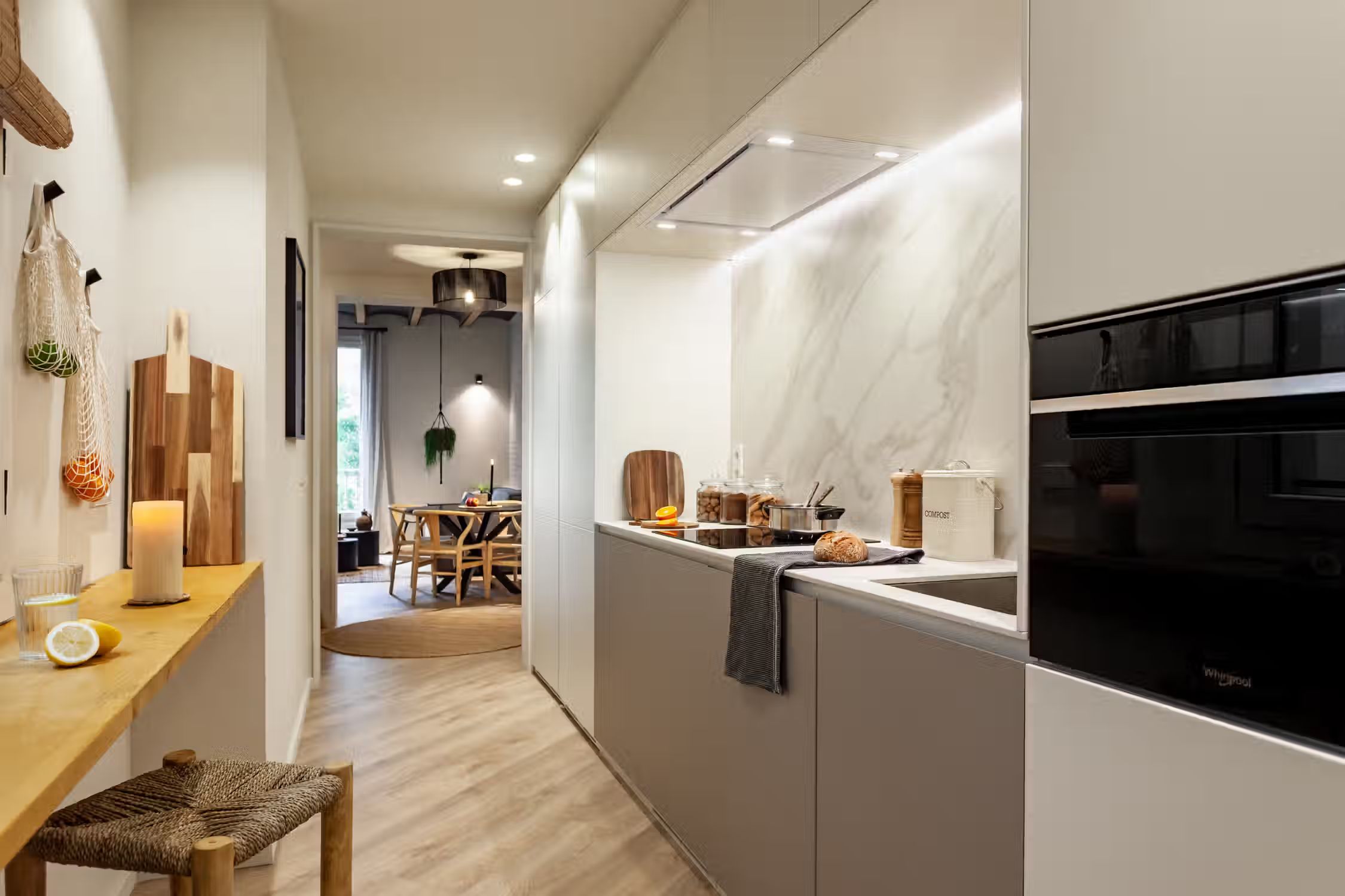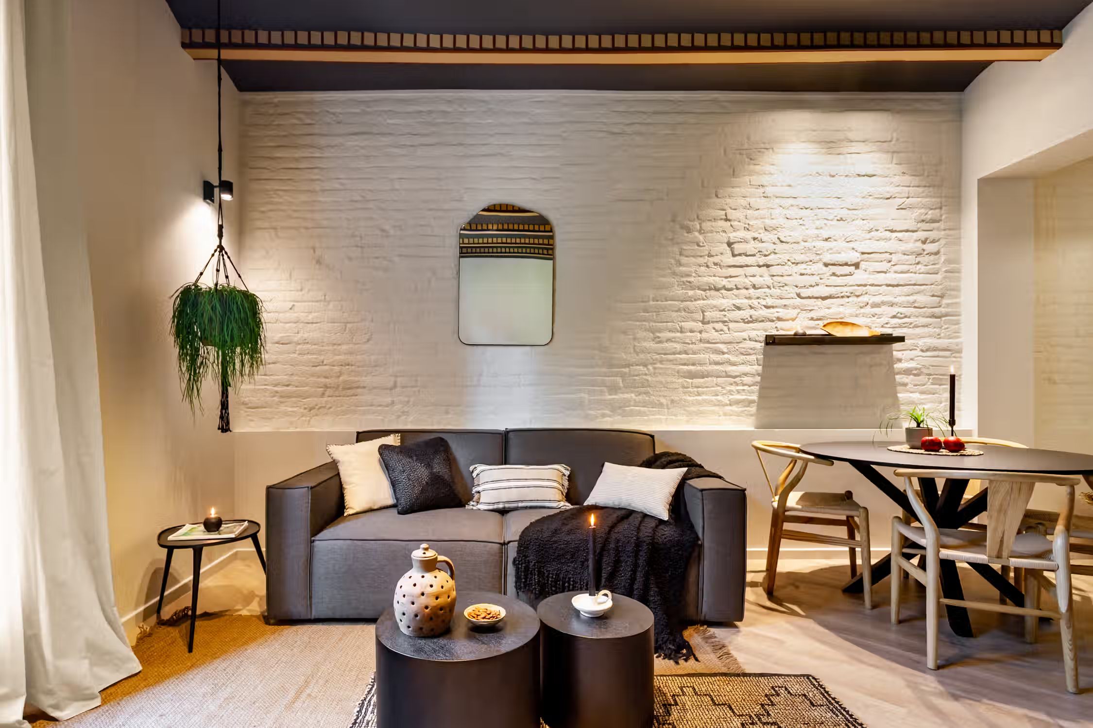 Step into Baharya’s living room with large window doors that open out to a small balcony, a white exposed-brick accent wall, and a gorgeous Saharan desert carpet. This 76 square meter desert-themed apartment tastefully packs in everything you need within its walls including a galley kitchen, a master double bedroom, a single room with a glass wall, one bathroom, a fully furnished kitchen, and a dedicated work space. This home comes with all of the furnishing you need, including bedding and linens, all of which match the desert toned features of Baharya. Light and breezy, this apartment allows for a taste of Barcelona’s Mediterranean climate right from the sofa