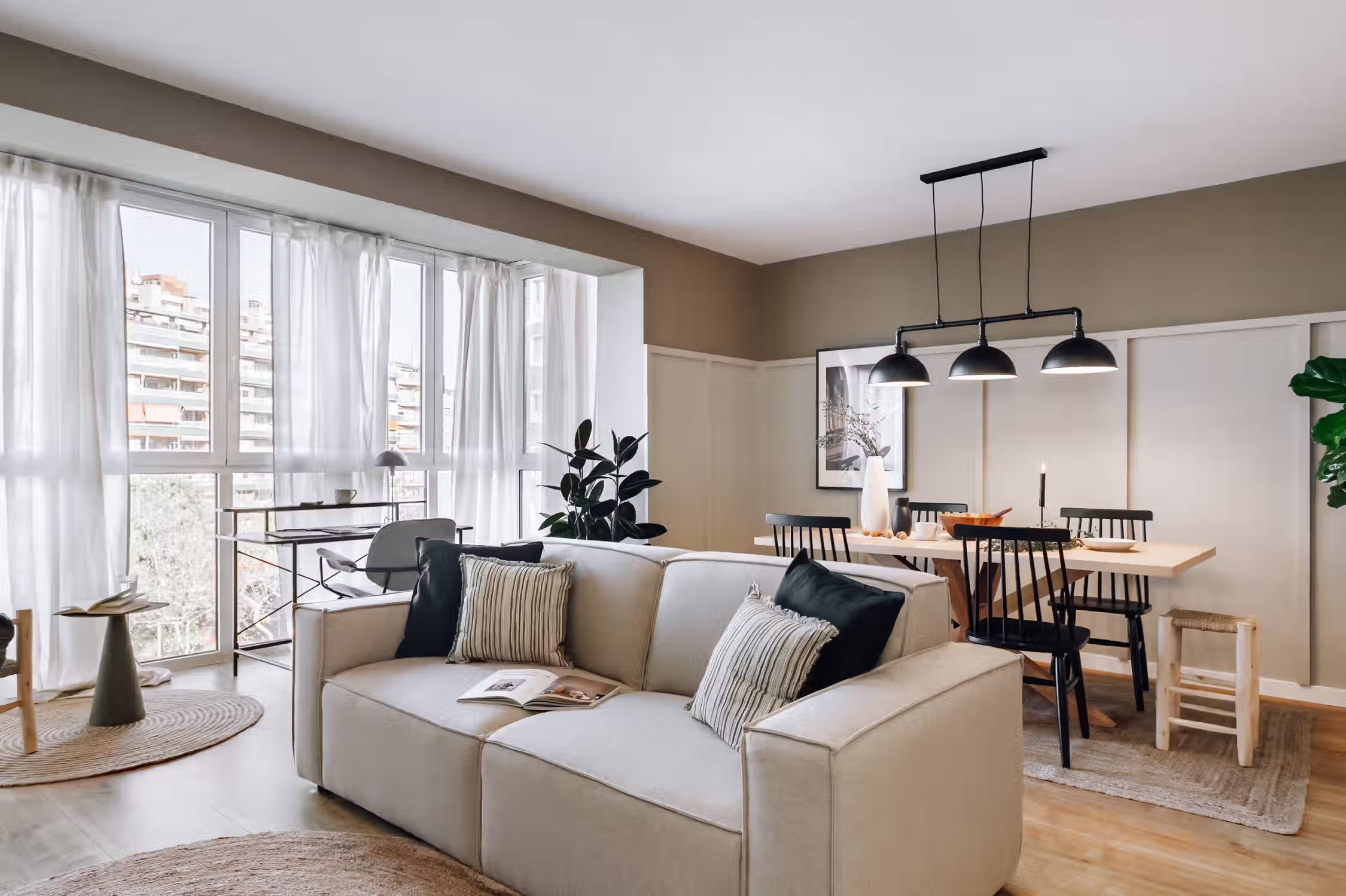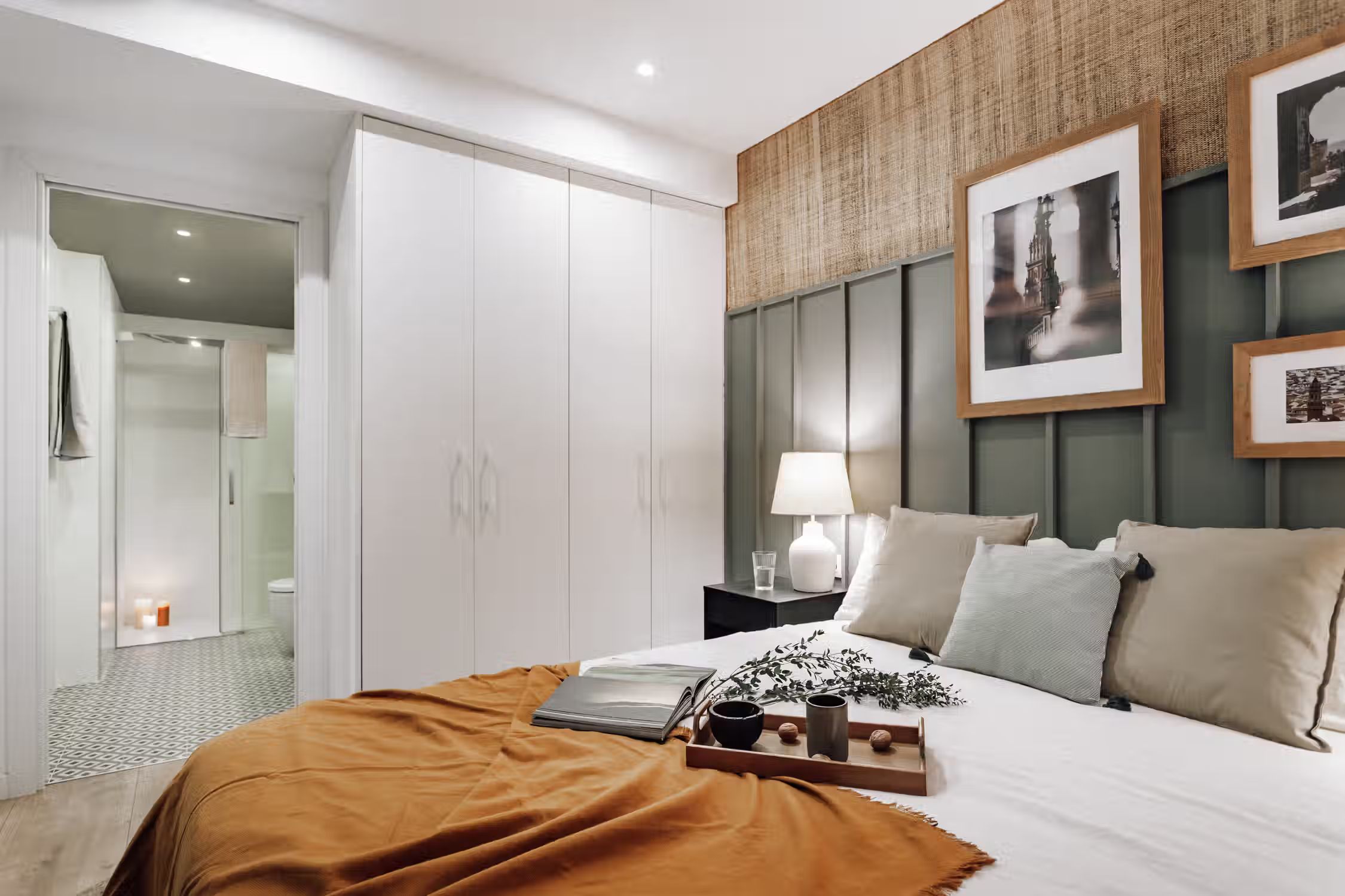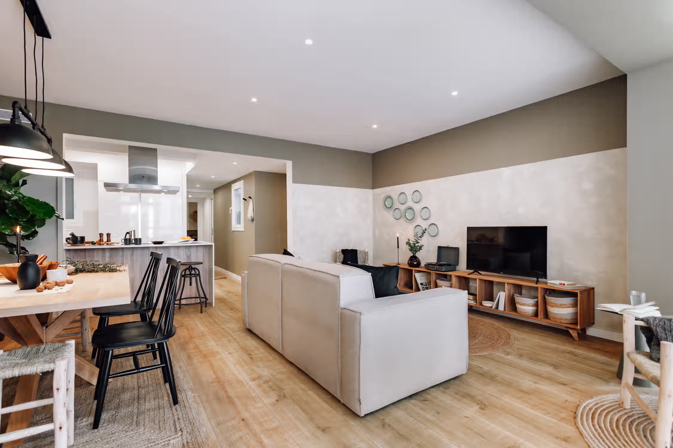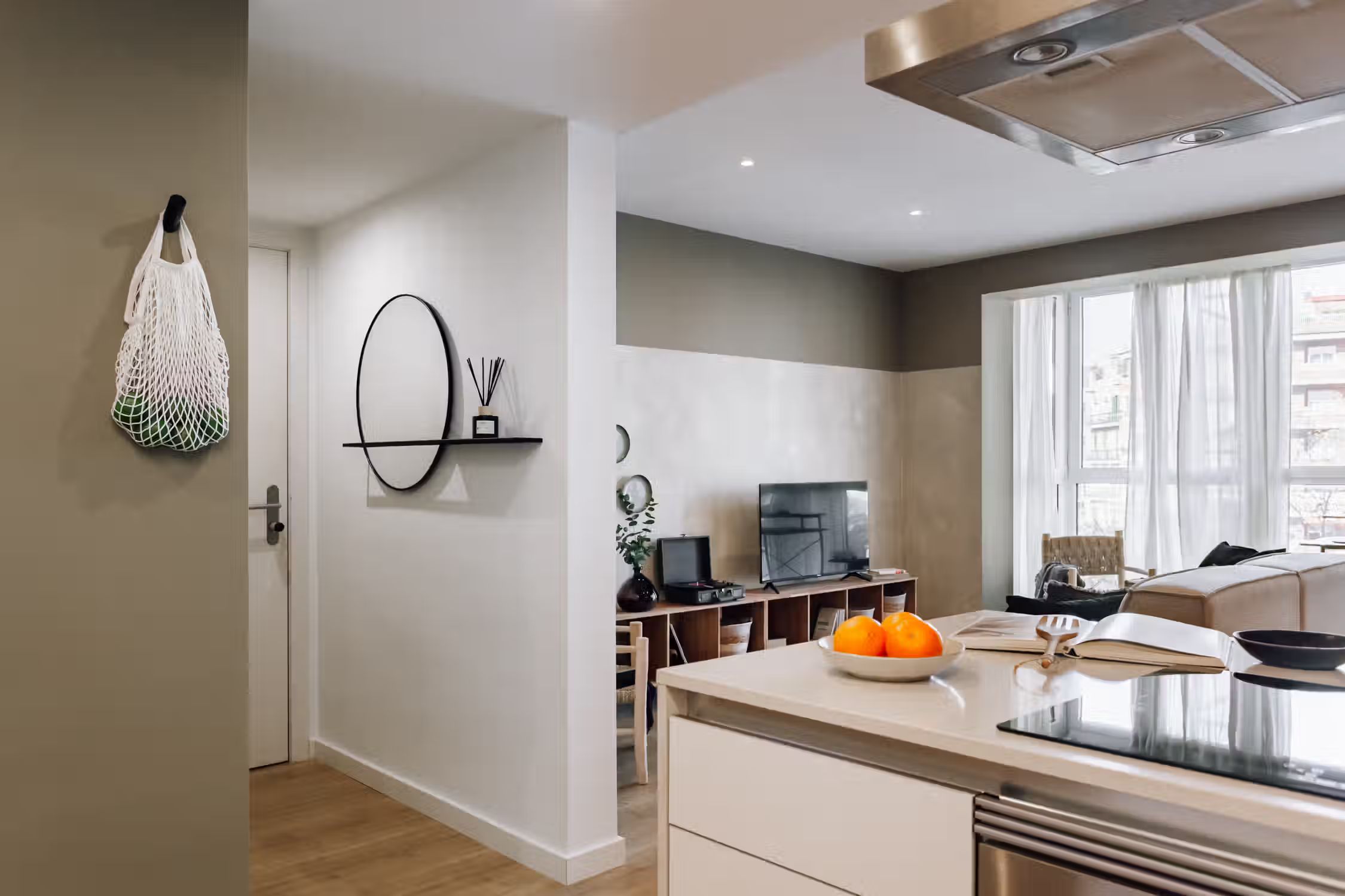 Elevate your stay in Barcelona with this two-bedroom furnished rental in the heart of Sant Antoni. The Loja apartment belongs to our special grassland line offering you grassy greens, burnt orange contrasts, and decorative plate designs. This home comes with a fully equipped kitchen, beddings and towels, and a work area perfect for digital nomads. What more could you ask for! Our in-house team of interior designers placed a lot of thought into this furnished rental in Barcelona. Whether you're lounging on a custom Ukio-fabricated couch or spending time in the kitchen, you'll never miss that 'home' feeling. This apartment also comes with HD television, high-speed internet, fresh linens and towels, and a Crosley vinyl and Bluetooth speaker. There is so much to love in this Sant Antoni apartment