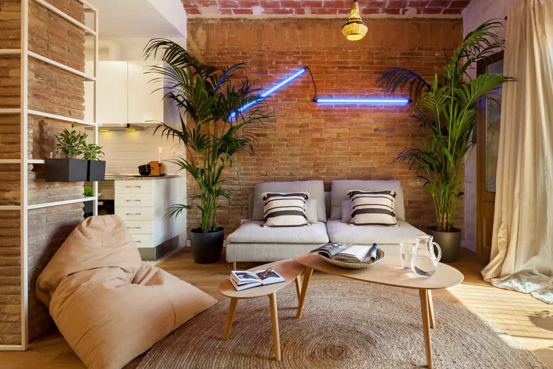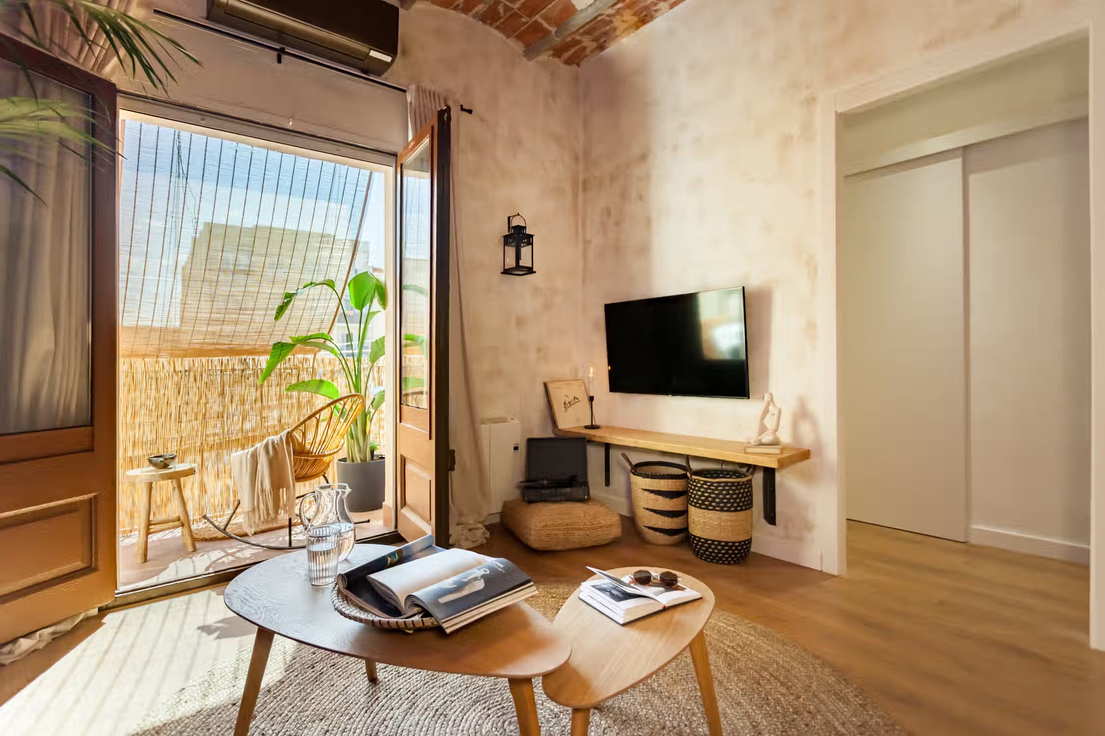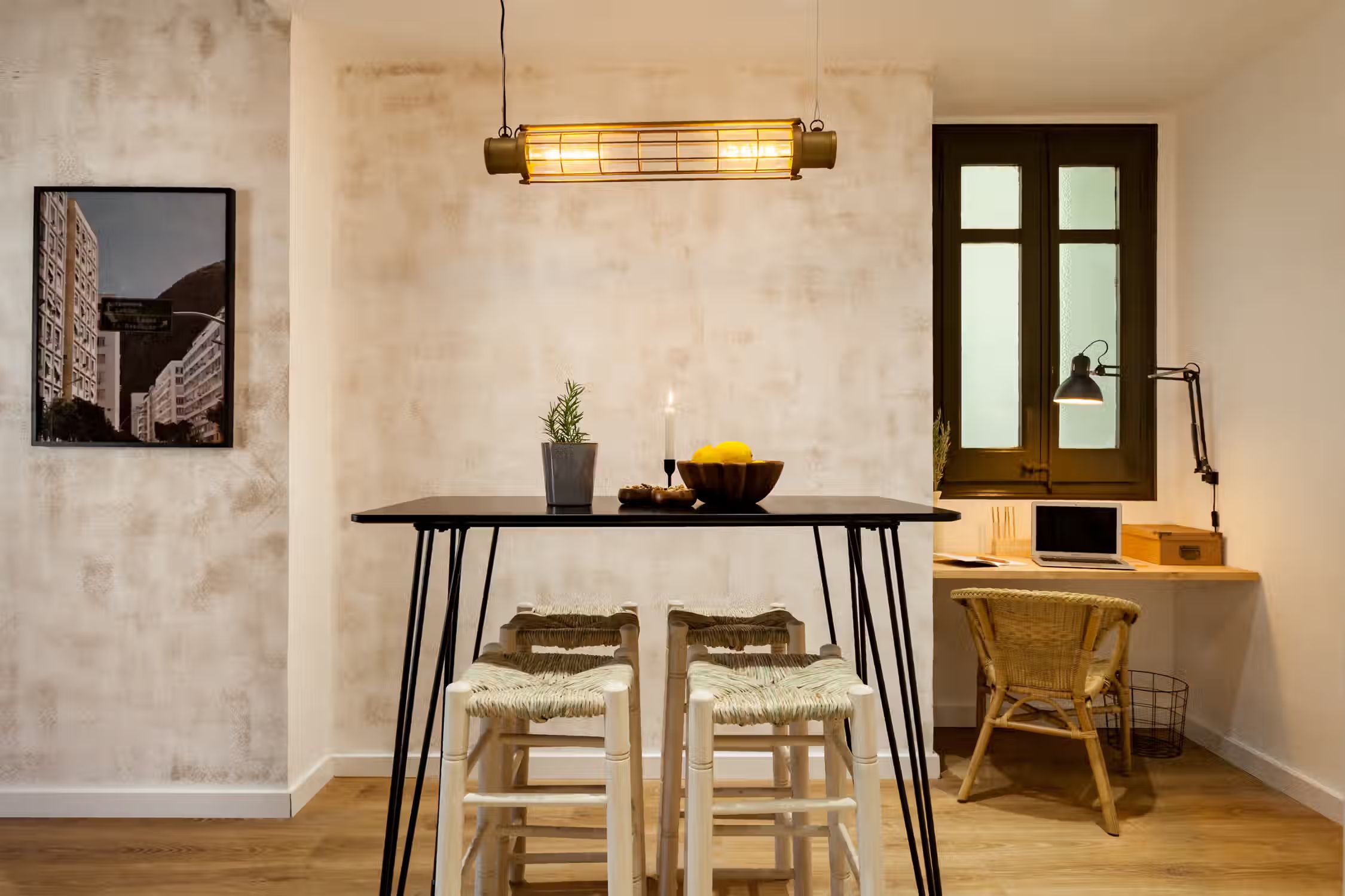 A cozy 2 bedrooms and 1 bath in the heart of Eixample Esquerra. This 62 sq meter flat boasts classic domed ceilings decorated with a mix of vibrant greenery and unique decor pieces. At the entrance, there is a custom built workstation, with desk and chair. The open plan kitchen comes with all cooking essentials and appliances. Find an array of different herbs to be used hanging on the column between kitchen and living room. There is a high compact dining table adjacent to the living area. Framed scenes of Brazilian beaches and a one-of-a-kind neon light structure adorn the walls of the lounge area. There is a balcony fitted with a chair and small round table right outside the living area. The master bedroom, fitted with a queen-sized bed, boasts natural light. Beige tones create a beachy atmosphere in the space. The bathroom comes with a full shower and fresh towels. Next to the bathroom, find a guest bedroom which has a pull-out sofa bed, ideal for visitors. For comfort, this apartment comes equipped with air conditioning in the Living room and fans in one Bedroom