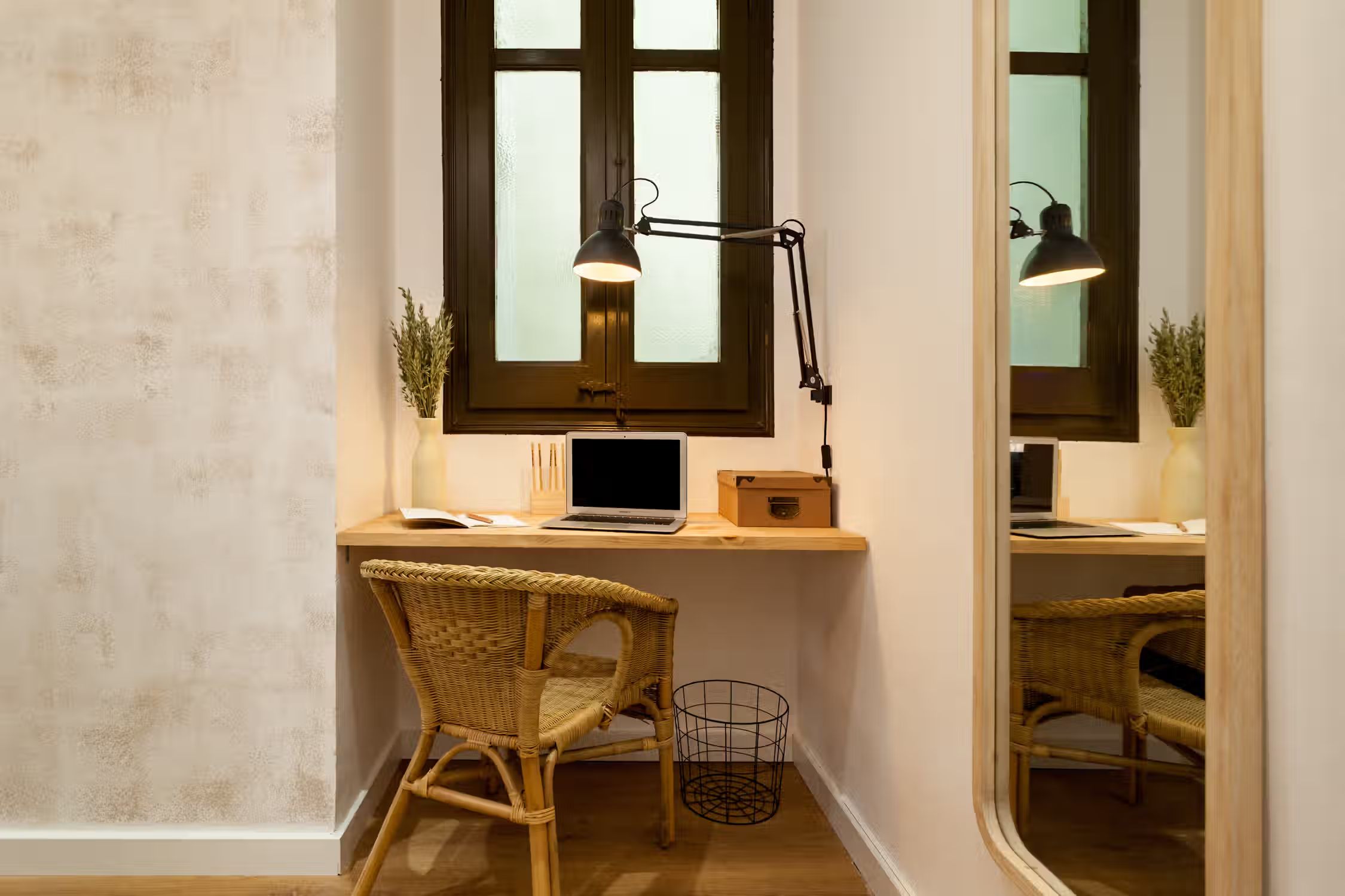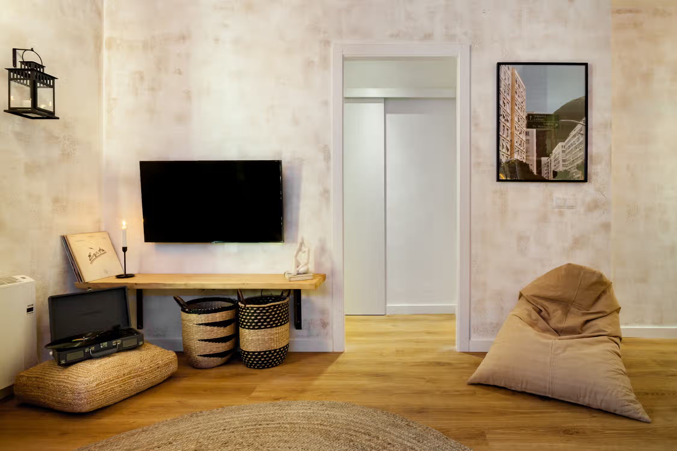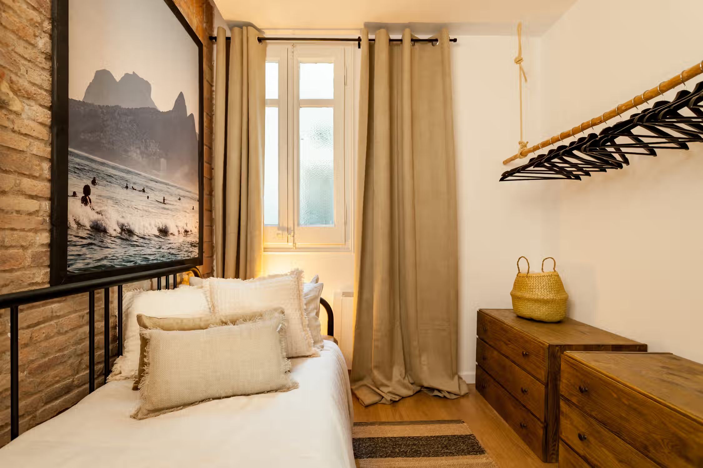 A cozy 2 bedrooms and 1 bath in the heart of Eixample Esquerra. This 62 sq meter flat boasts classic domed ceilings decorated with a mix of vibrant greenery and unique decor pieces. At the entrance, there is a custom built workstation, with desk and chair. The open plan kitchen comes with all cooking essentials and appliances. Find an array of different herbs to be used hanging on the column between kitchen and living room. There is a high compact dining table adjacent to the living area. Framed scenes of Brazilian beaches and a one-of-a-kind neon light structure adorn the walls of the lounge area. There is a balcony fitted with a chair and small round table right outside the living area. The master bedroom, fitted with a queen-sized bed, boasts natural light. Beige tones create a beachy atmosphere in the space. The bathroom comes with a full shower and fresh towels. Next to the bathroom, find a guest bedroom which has a pull-out sofa bed, ideal for visitors. For comfort, this apartment comes equipped with air conditioning in the Living room and fans in one Bedroom