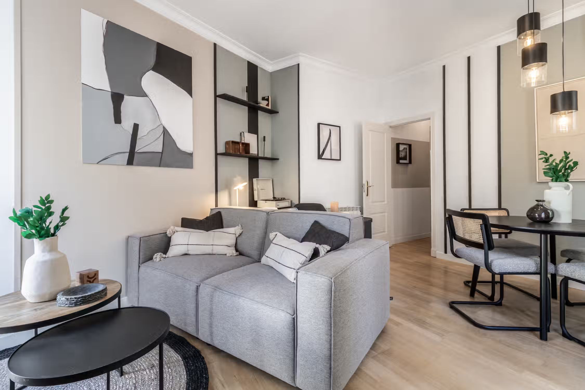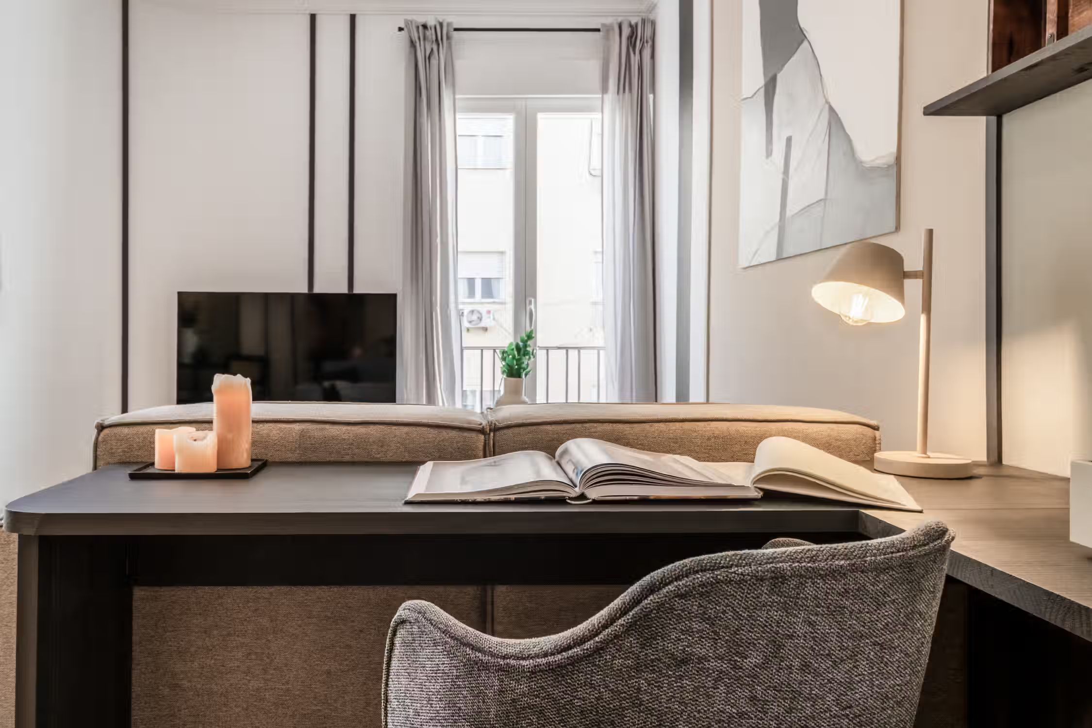 Stay in this spectacular two-bedroom furnished apartment in the Ríos Rosas neighborhood. The kitchen is equipped with state-of-the-art appliances and the beds are fitted with soft linens, ideal for a good night's rest. For work travelers and digital nomads, Meseta has a work designated area so you remain productive at home. Its central location makes it the ideal base for your life in Madrid. Custom designer furniture, an HDTV, and a Crosley Bluetooth speaker are just some of the amenities you’ll find inside this two-bedroom apartment. To relax, your beds are set with fresh linens and comfy pillow sets, and our custom Ukio-made sofas are perfect for lounging around. For anything you need, our Guest Experiences team is around to assist you. Ideally located in the Ríos Rosas neighborhood of Madrid, you'll simply love living in this furnished rental