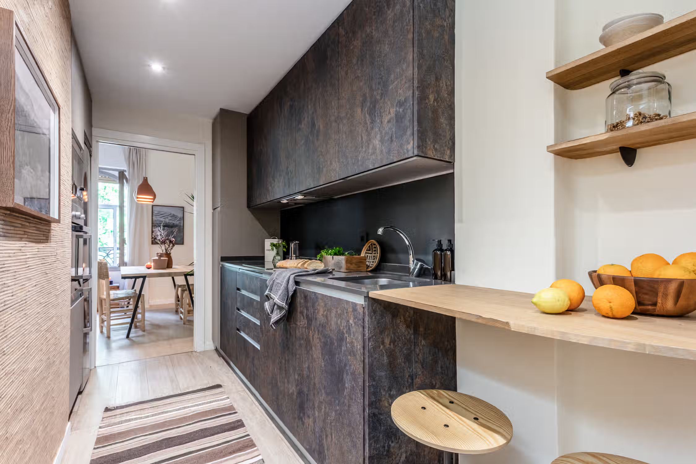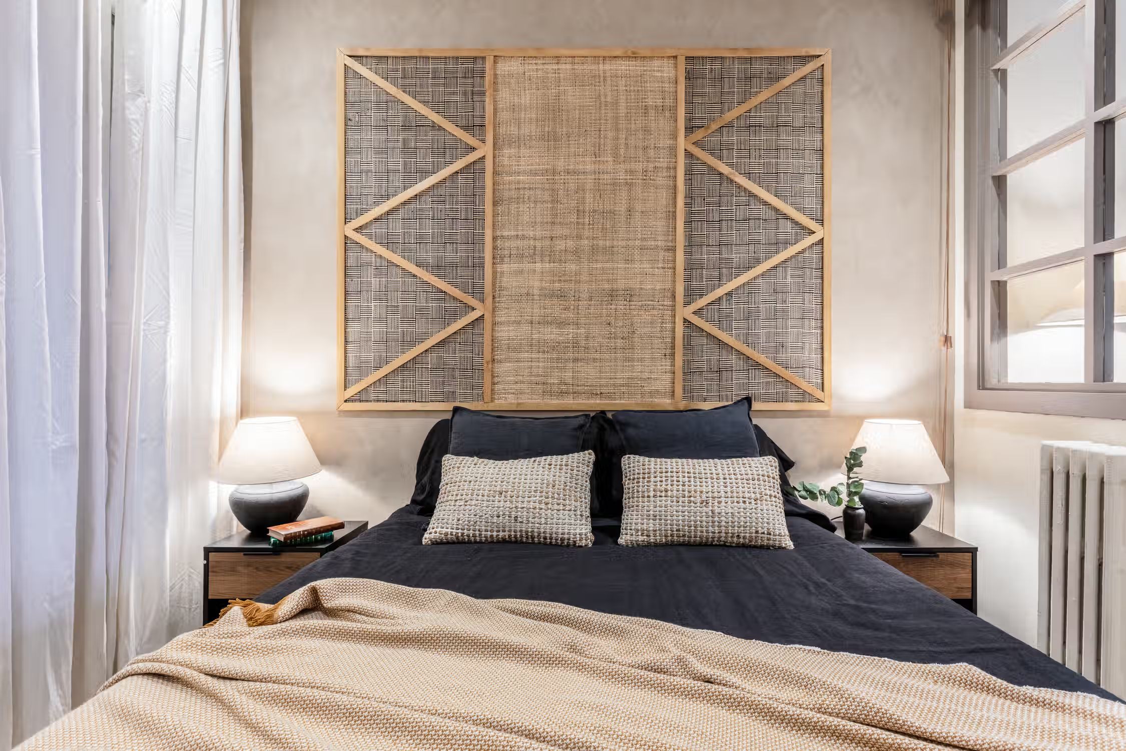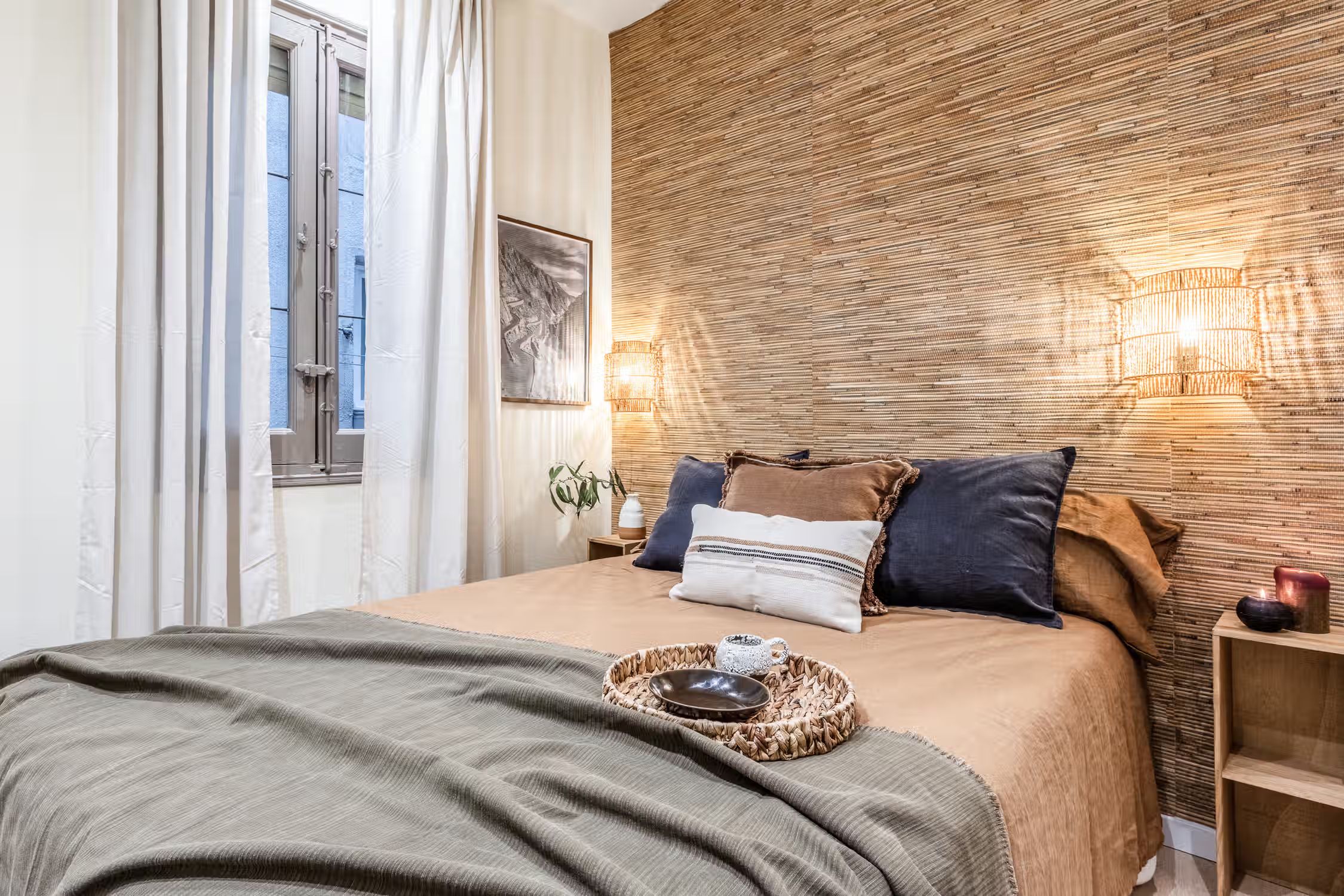 Transcend to a Saharan escape, right in Madrid’s famed Goya neighborhood. Guests can enjoy prime real estate in this Salamanca district with its charming pedestrian streets and traditional tapas restaurants scattered throughout the neighborhood. In true Madrilenian fashion, this 80 square meter home showcases Spanish architecture through its elevated ceilings and stained glass windows upon entry. To the left of the entrance is a dedicated workstation fit for two. Walking down the main hallway, the first door to the left reveals Tazrouk’s first bedroom. Terracotta hues coat the room from the natural fiber accent wall to the linens on the queen-sized bed. A built-in closet sits opposite the bed. The next left leads to Tazrouk’s detached bathroom. Cool blues are highlighted with the slate tiling covering the space and into the full-sized shower. The hallway widens to show off the galley kitchen and a two-person breakfast bar. The space is complete with modern appliances and all the necessary cooking utensils. The end of the hall leads to the open-concept living and dining area. Desert themes echo through the space with natural fiber-lined trey ceilings and earthy decor. To the left of the cozy lounge area is Tazrouk’s final bedroom. This ensuite boasts a queen-sized bed in the center and built-in closets along the left-hand side. At the far corner of the room is the attached bathroom, exuding spa-like vibes with the all-glass shower and floating vanity