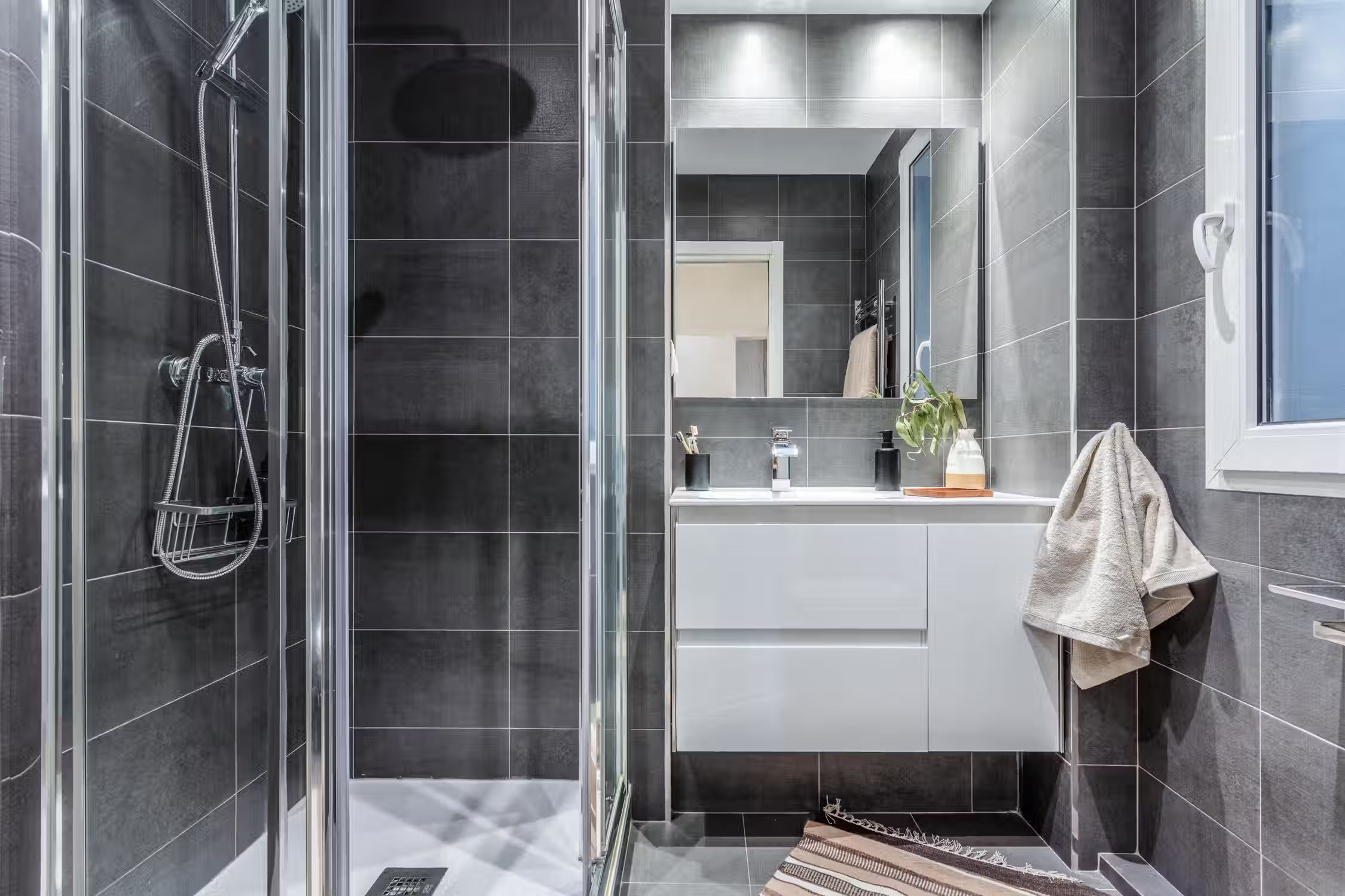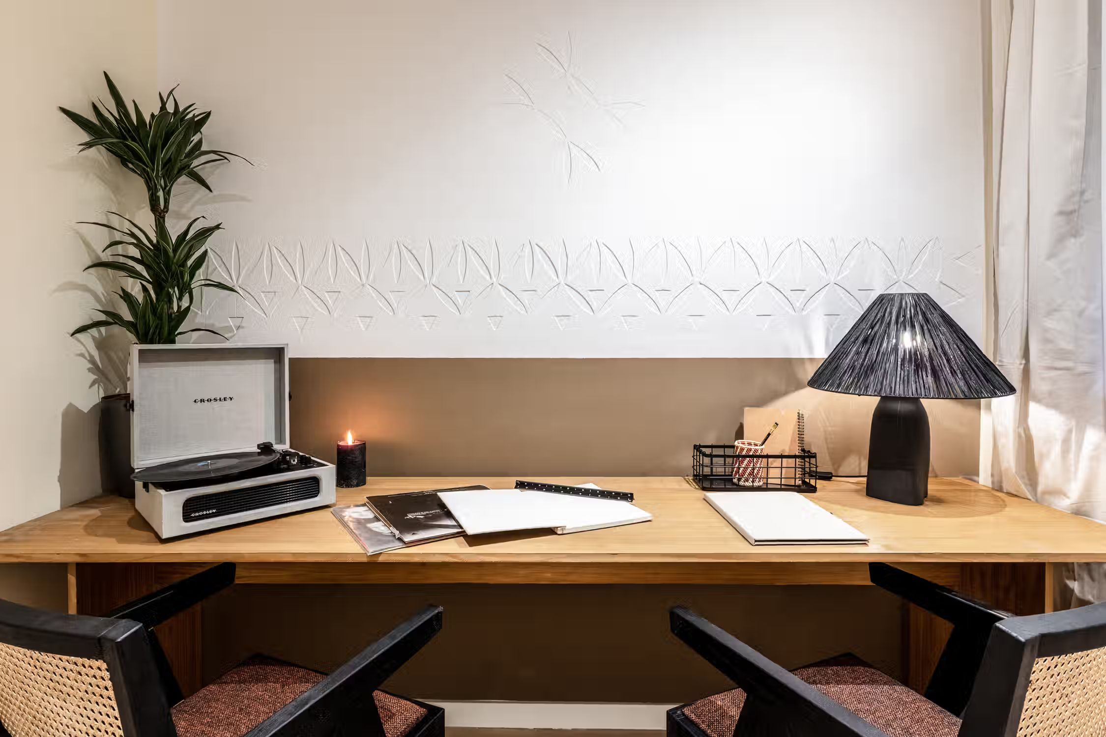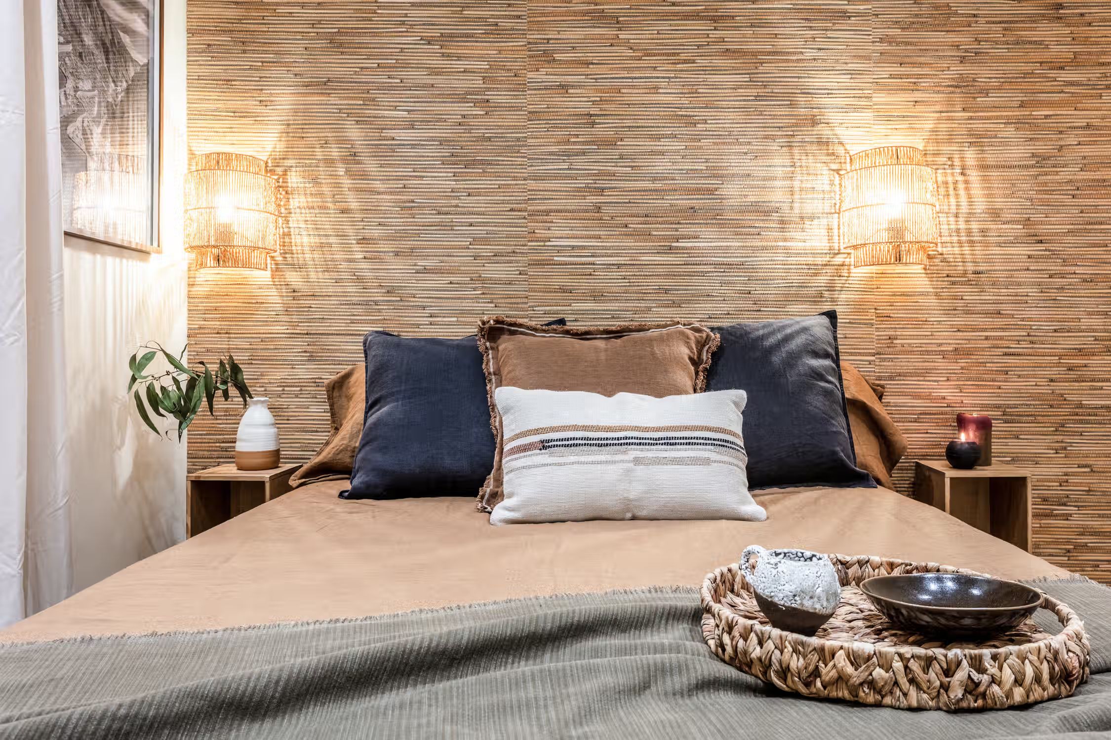 Transcend to a Saharan escape, right in Madrid’s famed Goya neighborhood. Guests can enjoy prime real estate in this Salamanca district with its charming pedestrian streets and traditional tapas restaurants scattered throughout the neighborhood. In true Madrilenian fashion, this 80 square meter home showcases Spanish architecture through its elevated ceilings and stained glass windows upon entry. To the left of the entrance is a dedicated workstation fit for two. Walking down the main hallway, the first door to the left reveals Tazrouk’s first bedroom. Terracotta hues coat the room from the natural fiber accent wall to the linens on the queen-sized bed. A built-in closet sits opposite the bed. The next left leads to Tazrouk’s detached bathroom. Cool blues are highlighted with the slate tiling covering the space and into the full-sized shower. The hallway widens to show off the galley kitchen and a two-person breakfast bar. The space is complete with modern appliances and all the necessary cooking utensils. The end of the hall leads to the open-concept living and dining area. Desert themes echo through the space with natural fiber-lined trey ceilings and earthy decor. To the left of the cozy lounge area is Tazrouk’s final bedroom. This ensuite boasts a queen-sized bed in the center and built-in closets along the left-hand side. At the far corner of the room is the attached bathroom, exuding spa-like vibes with the all-glass shower and floating vanity