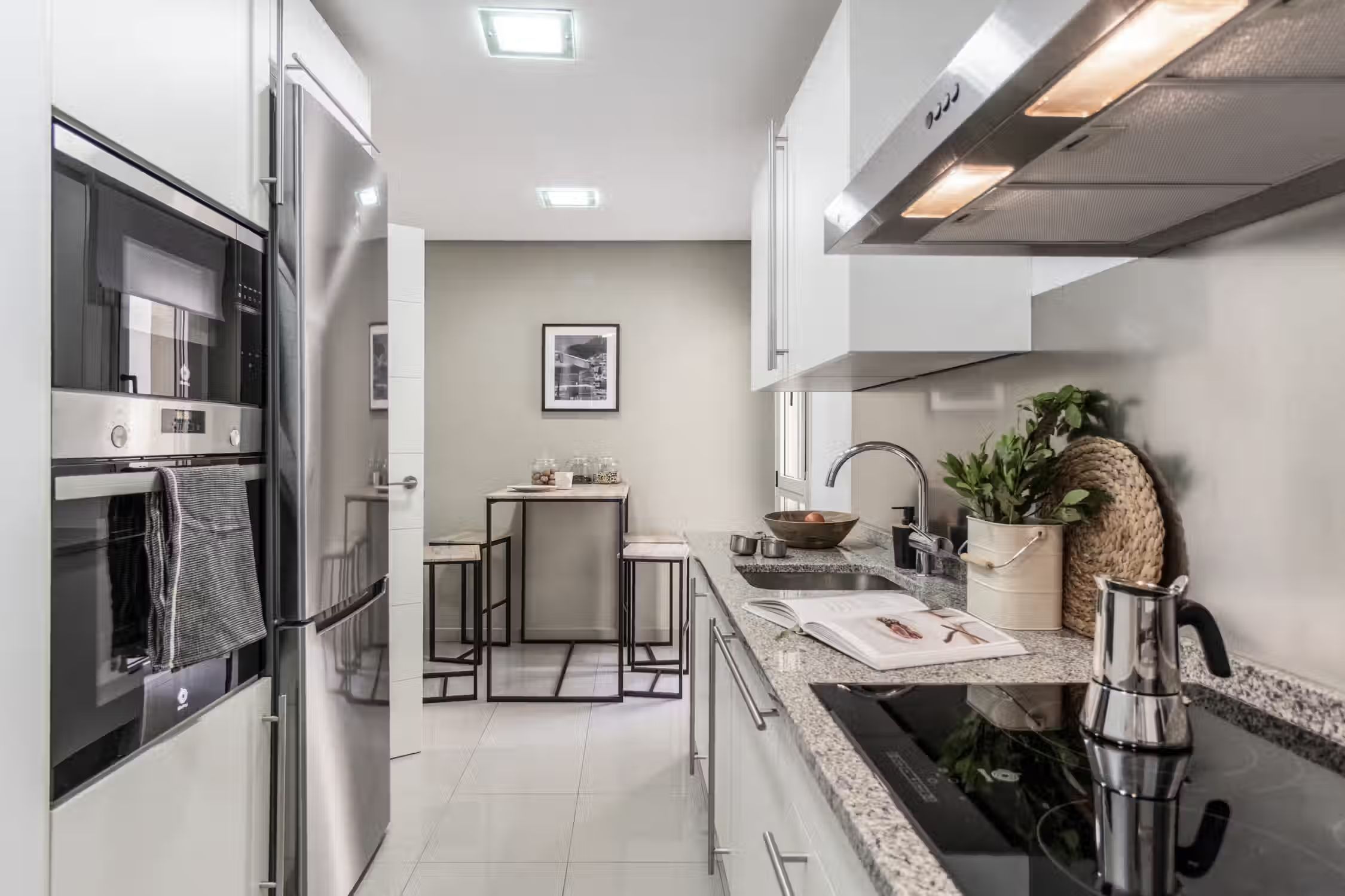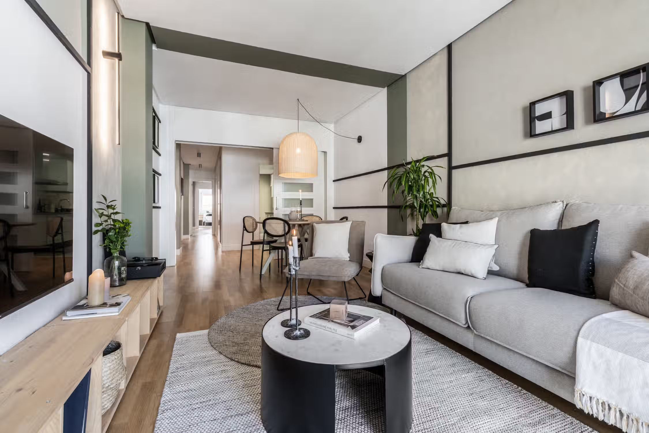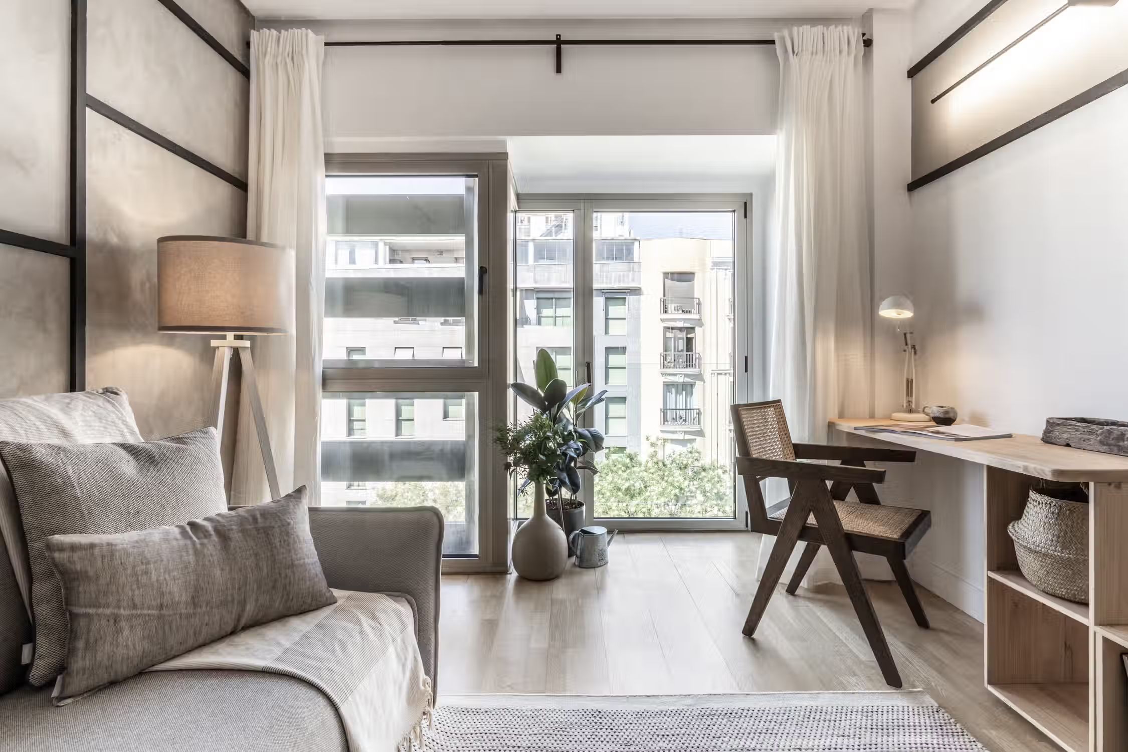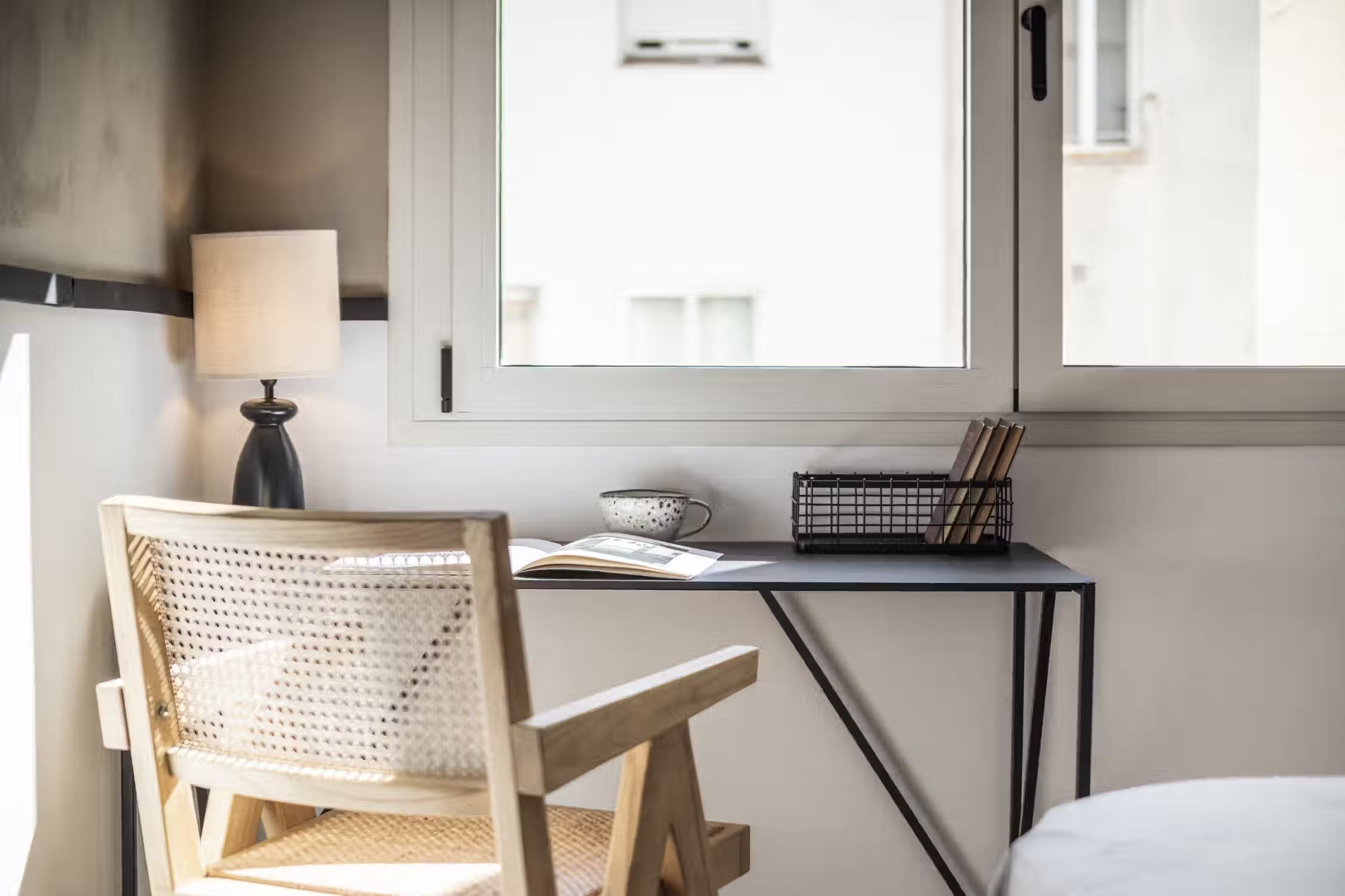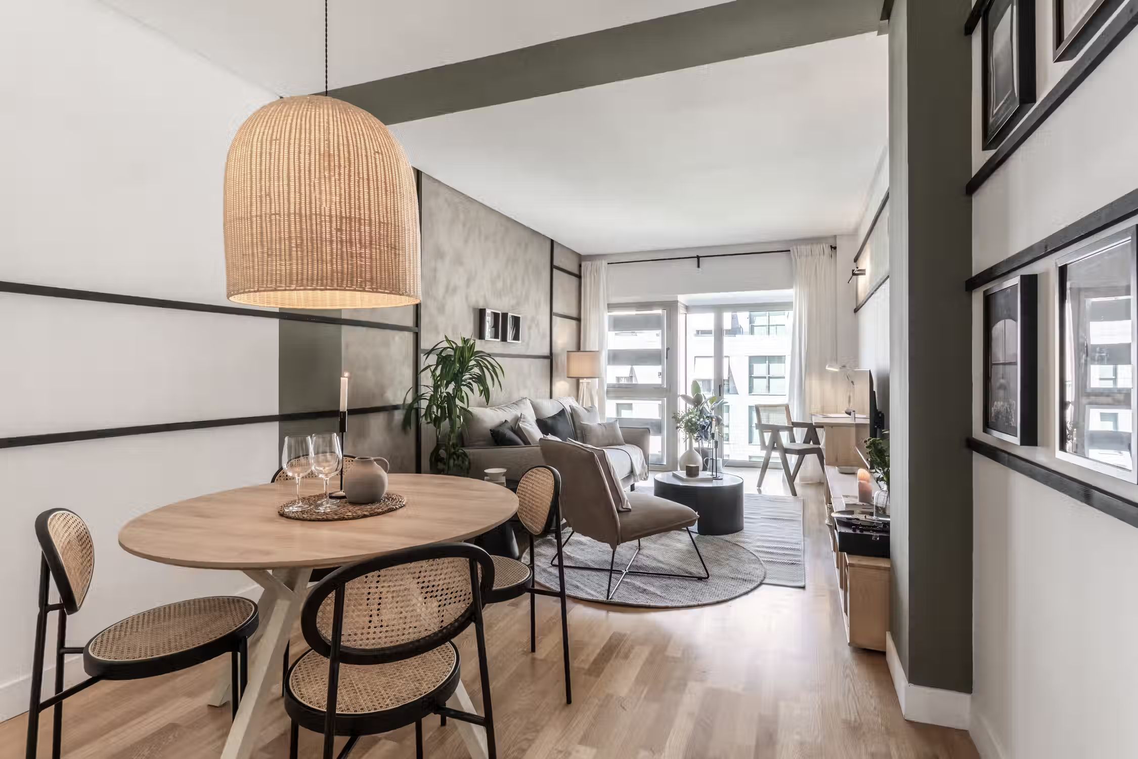 Welcome to Nocera, a charming 2-bedroom apartment nestled in the vibrant Arapiles neighborhood. This area gives a taste of the traditional life in Madrid, perfect for soaking up the local culture and flavors. With its stylish design and comfortable amenities, Nocera offers an inviting retreat for your stay in this dynamic city. Spanning 95 square meters, Nocera is designed to provide you with a seamless blend of modern convenience and aesthetic appeal. As you enter, you'll be greeted by an open and spacious living room that boasts a full entertainment system, perfect for relaxing after a day of exploration. A dedicated workstation in the living area caters to any work or study needs you may have during your stay. The dining table is thoughtfully integrated into the living space, offering a cozy setting for enjoying meals or planning your day's adventures. The fully furnished kitchen, complete with all necessary appliances, includes a charming breakfast nook where you can start your mornings with a cup of coffee and a delightful view. The apartment offers two beautifully appointed bedrooms, each featuring a comfortable queen-size bed for a restful night's sleep. The master bedroom comes with an ensuite bathroom, providing added convenience and privacy, and a dedicated workstation. The ensuite bathroom is equipped with a bathtub, offering a relaxing escape after a day of exploration. The second detached bathroom is chic and functional in design. The beach design theme throughout the apartment infuses a sense of tranquility and relaxation into the ambiance, creating a soothing backdrop for your stay. Air conditioning is provided to ensure your comfort, allowing you to maintain an ideal temperature throughout your time in Madrid. Fully furnished, this apartment comes with everything you need, including bedding and linens