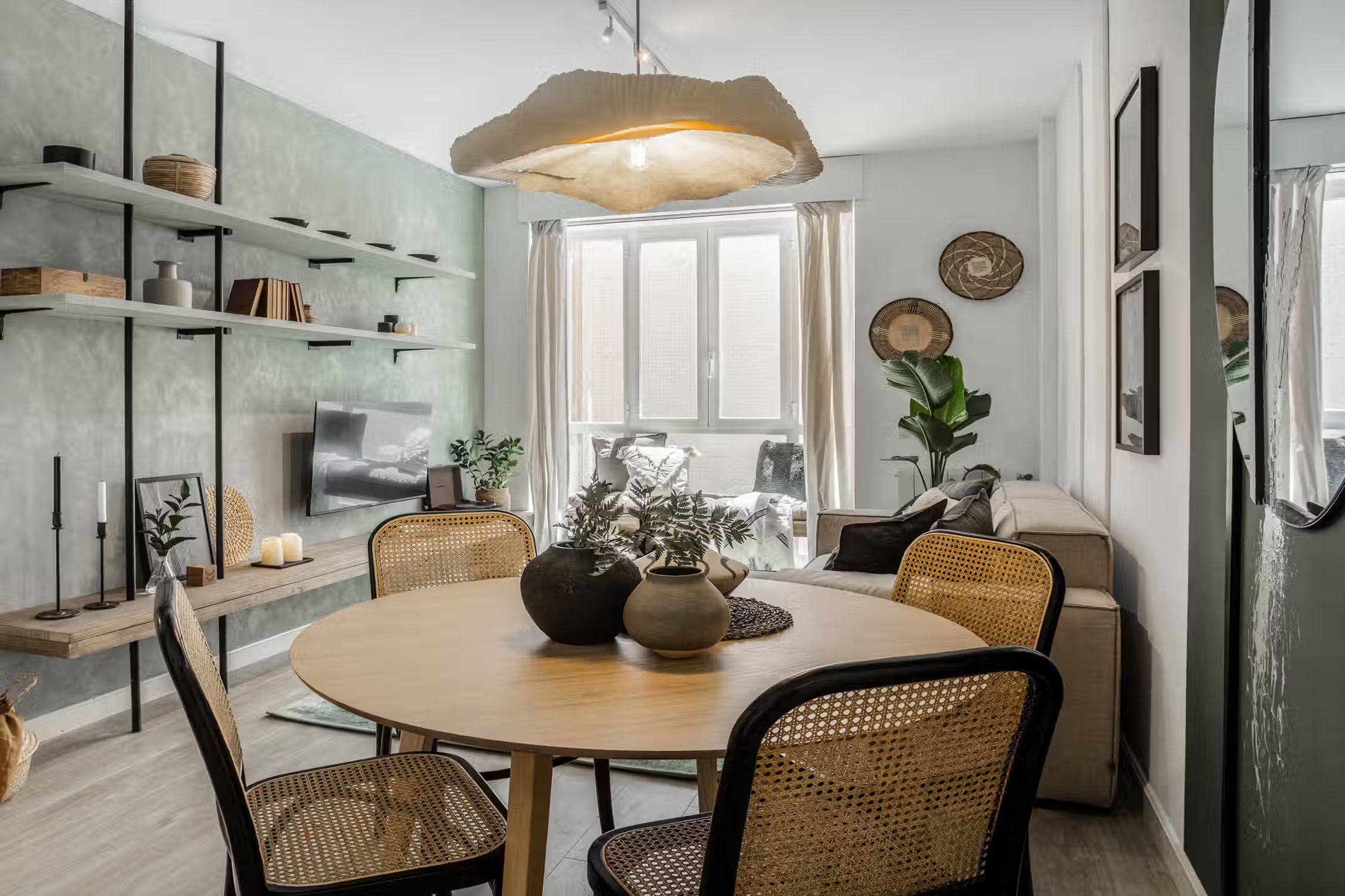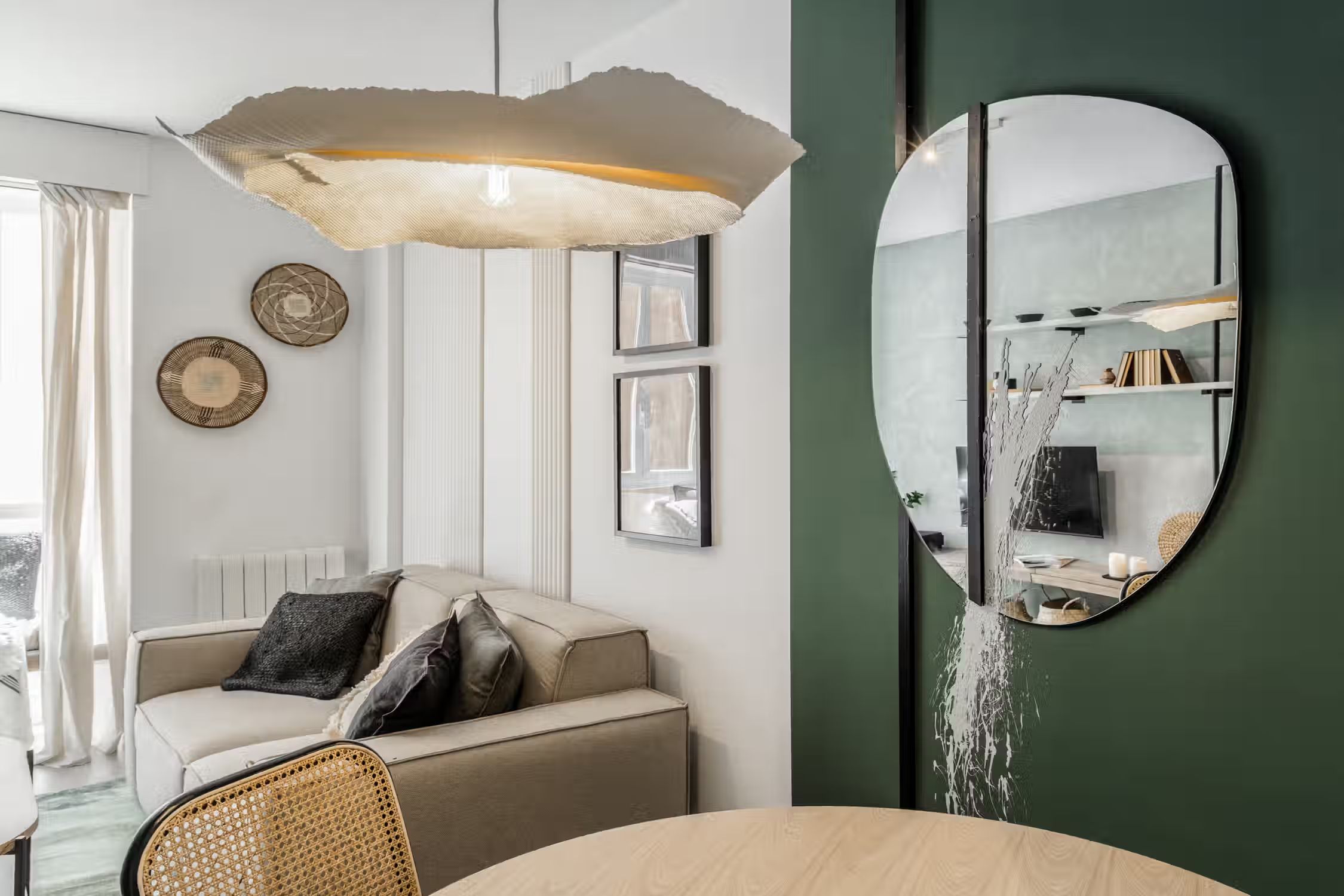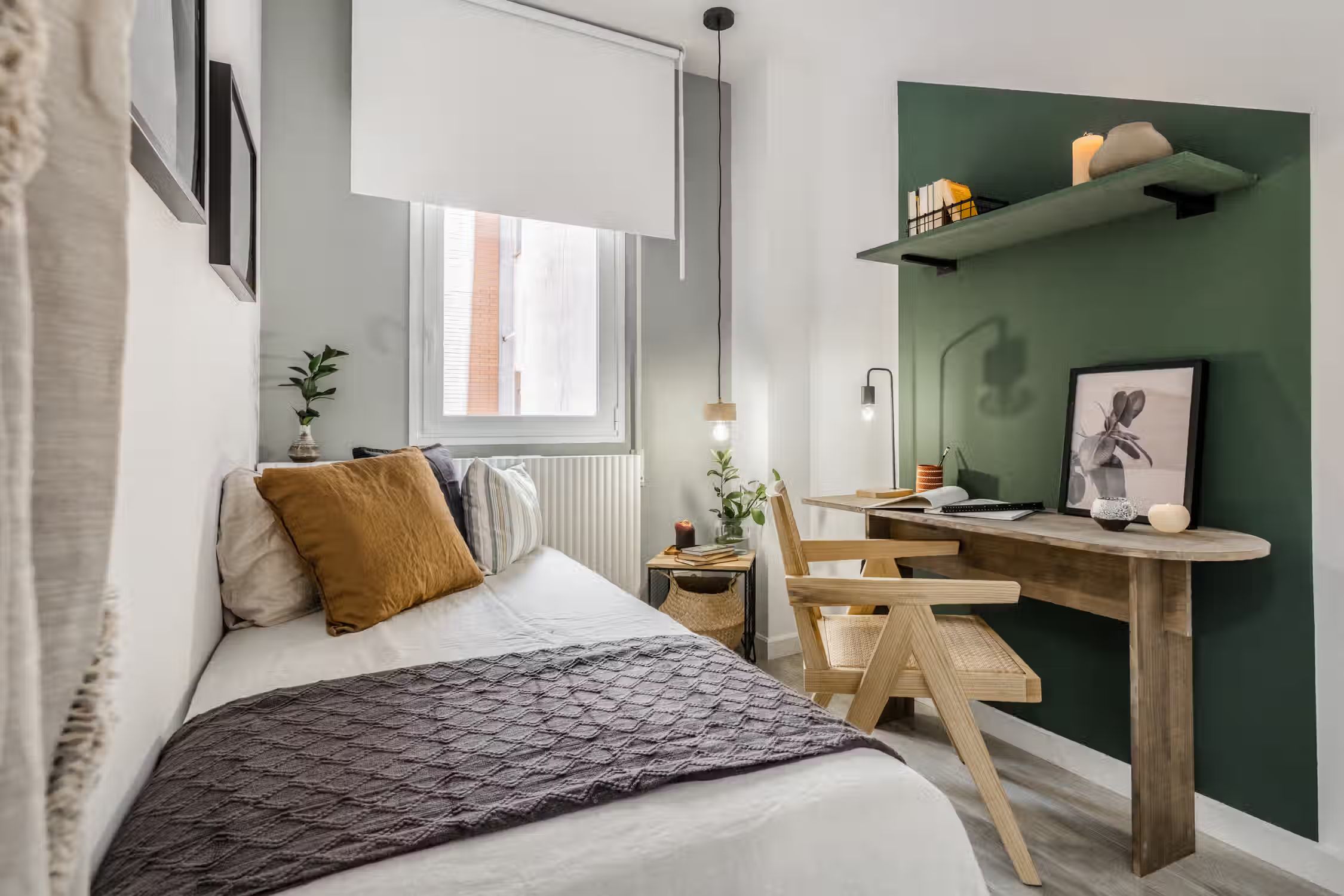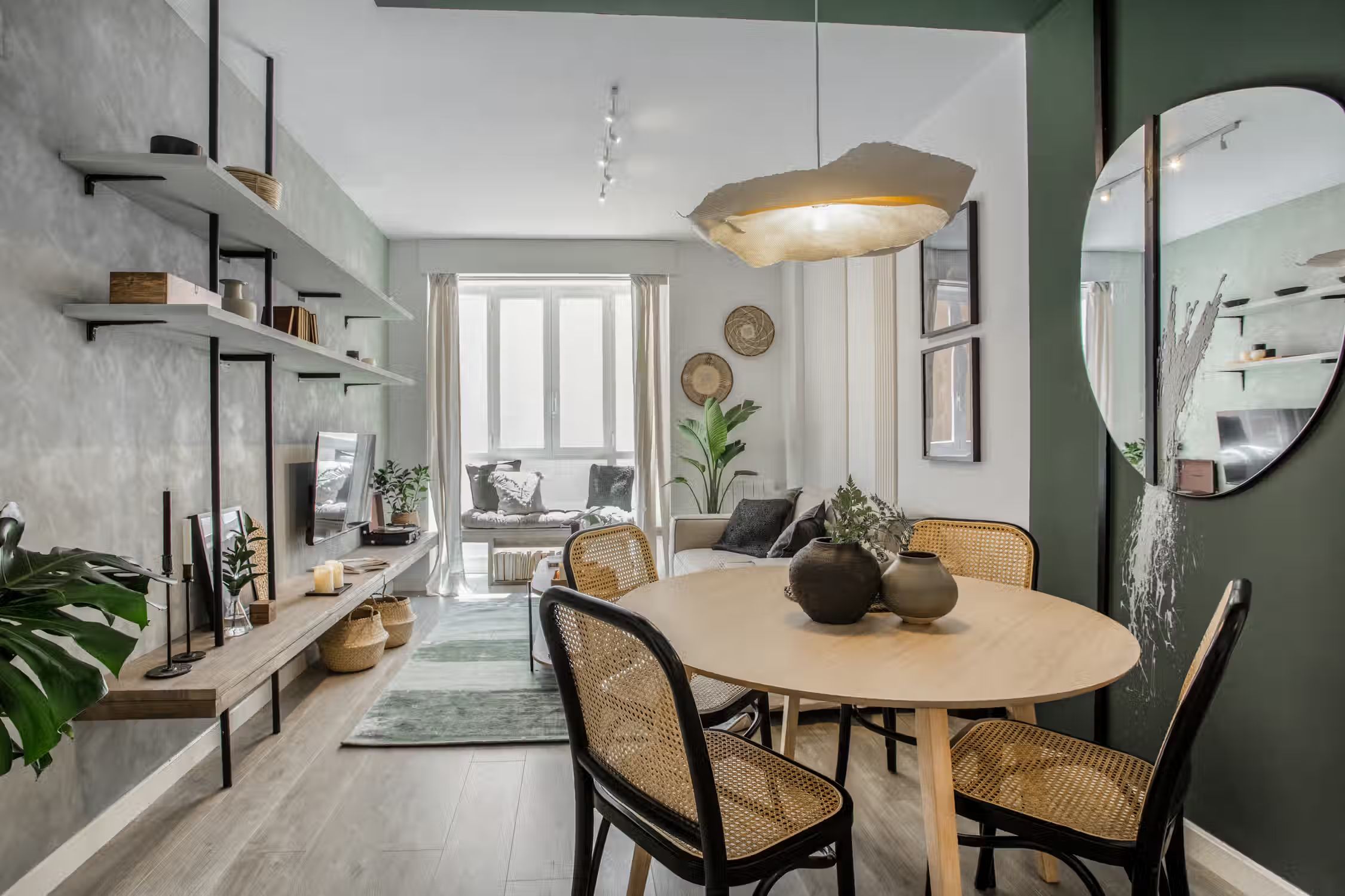 Jungle aesthetics blended with Spanish classics - this 78-square-meter home knows all things design. Located in Madrid’s famed Rio Rosas neighborhood, guests will enjoy centrality and local gems such as the quaint small business and under-the-radar restaurants. Once inside Bwende’s interiors, the two-bed, one-bath home will inspire awe. Hand-painted designs cover the walls of the entryway as guests are guided into the kitchen straight on. Boasting natural light and modernity, the kitchen is complete with modern appliances and all the necessary cooking utensils. To the right of the kitchen is the open-concept living and dining area. Past the four-person dining set, a cozy lounge area is complemented by the full entertainment system. A window seat at the far end of the space gazes out at the Madrid views. The hallway past the living room reveals a detached bathroom to the left and Bwende’s first bedroom to the right. Slate and glass surround the walk-in shower, giving the space a contemporary feel. Across the hall, plush jungle greens meet earthy hues to create a stunning palette in the bedroom. The first bedroom boasts a queen-sized bed in the center and built-in closets nearest the entrance. At the end of the hall, contemporary designs and wall patterns play with the slanted ceilings. A daybed sits comfortably in the corner with a dedicated workstation on the other side