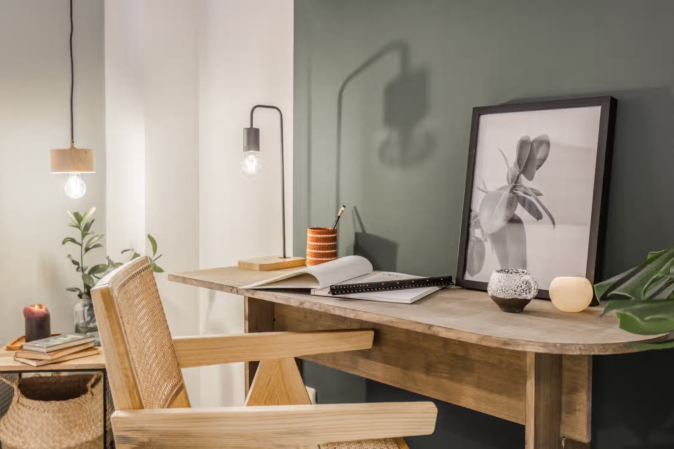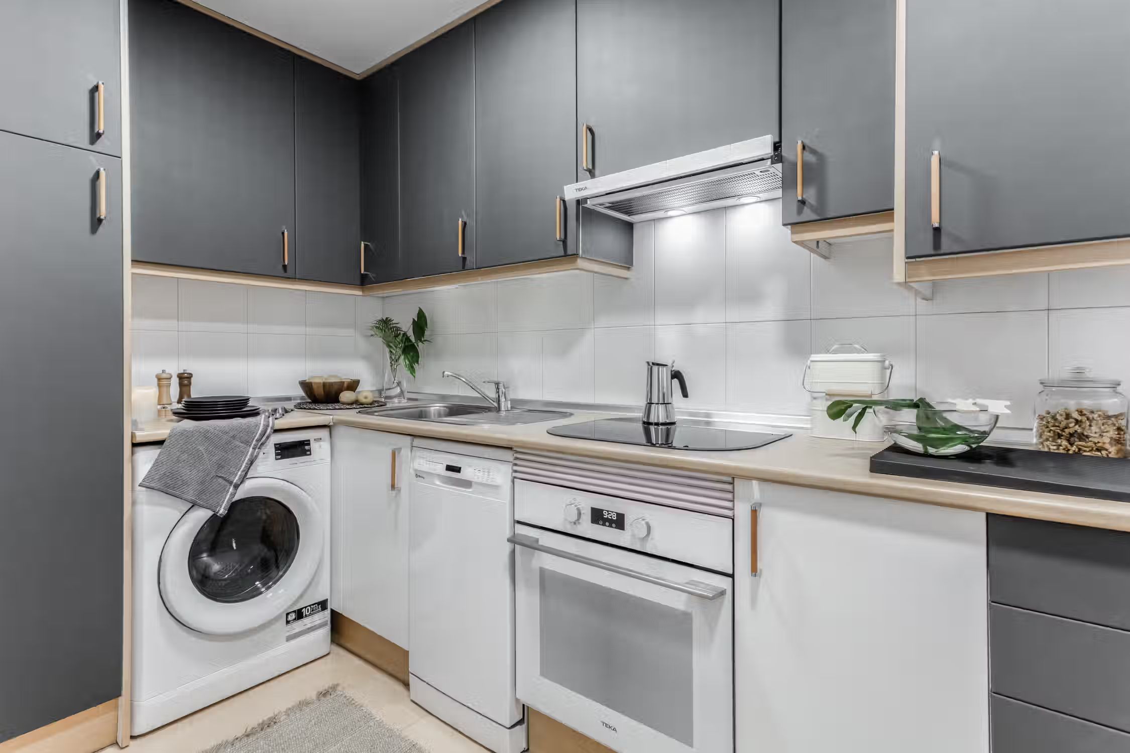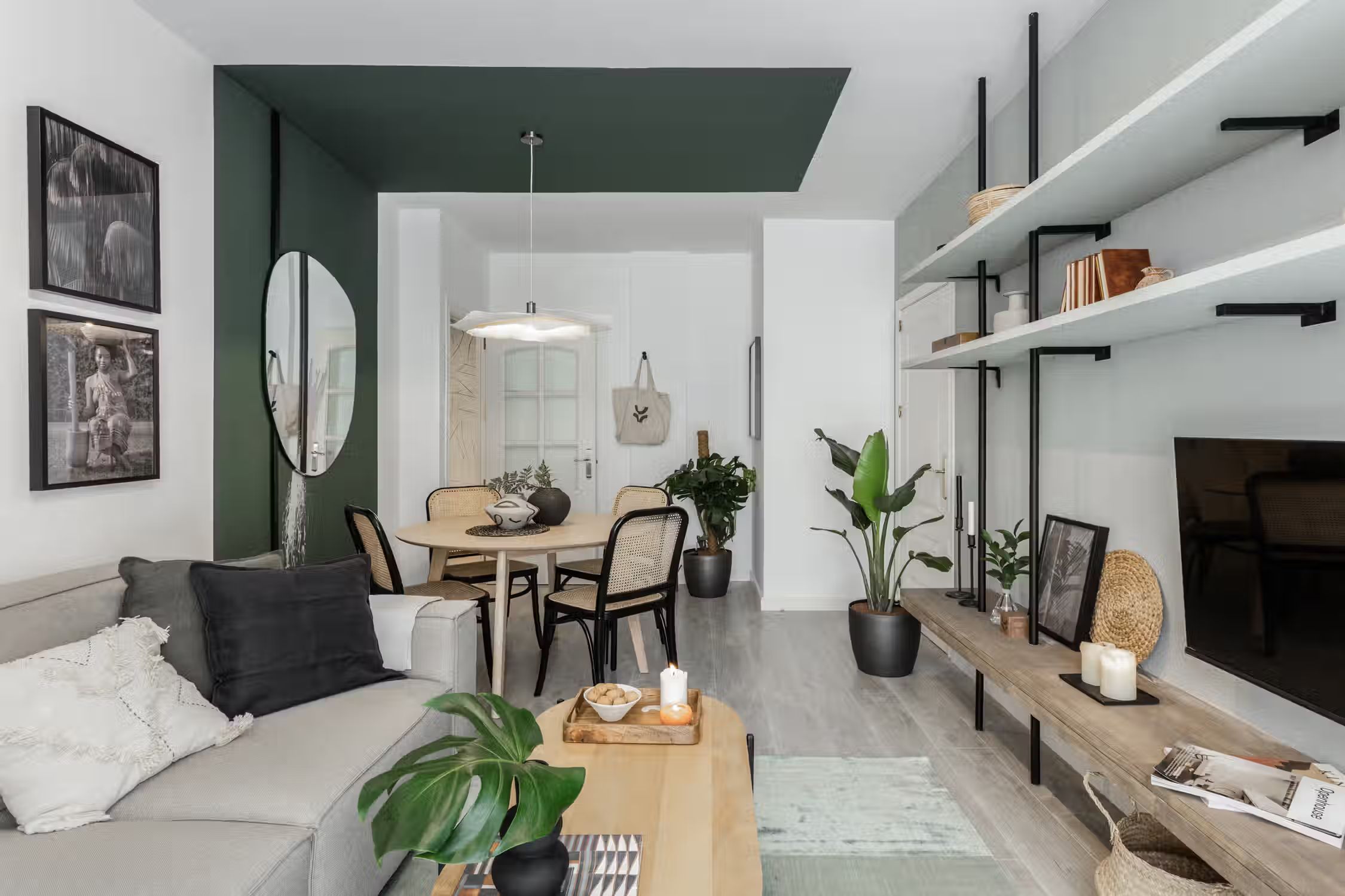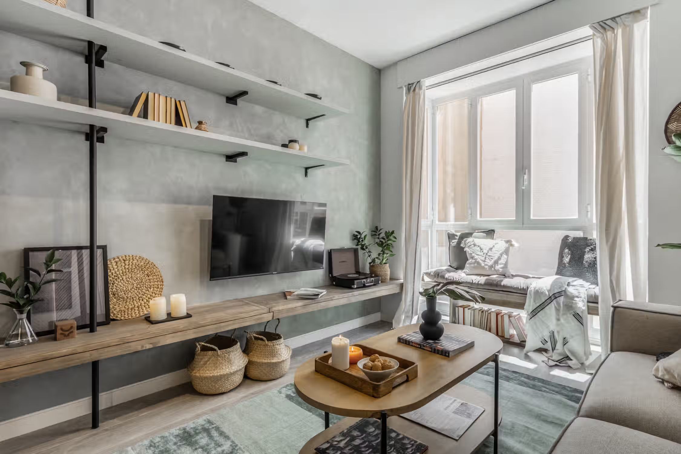 Jungle aesthetics blended with Spanish classics - this 78-square-meter home knows all things design. Located in Madrid’s famed Rio Rosas neighborhood, guests will enjoy centrality and local gems such as the quaint small business and under-the-radar restaurants. Once inside Bwende’s interiors, the two-bed, one-bath home will inspire awe. Hand-painted designs cover the walls of the entryway as guests are guided into the kitchen straight on. Boasting natural light and modernity, the kitchen is complete with modern appliances and all the necessary cooking utensils. To the right of the kitchen is the open-concept living and dining area. Past the four-person dining set, a cozy lounge area is complemented by the full entertainment system. A window seat at the far end of the space gazes out at the Madrid views. The hallway past the living room reveals a detached bathroom to the left and Bwende’s first bedroom to the right. Slate and glass surround the walk-in shower, giving the space a contemporary feel. Across the hall, plush jungle greens meet earthy hues to create a stunning palette in the bedroom. The first bedroom boasts a queen-sized bed in the center and built-in closets nearest the entrance. At the end of the hall, contemporary designs and wall patterns play with the slanted ceilings. A daybed sits comfortably in the corner with a dedicated workstation on the other side