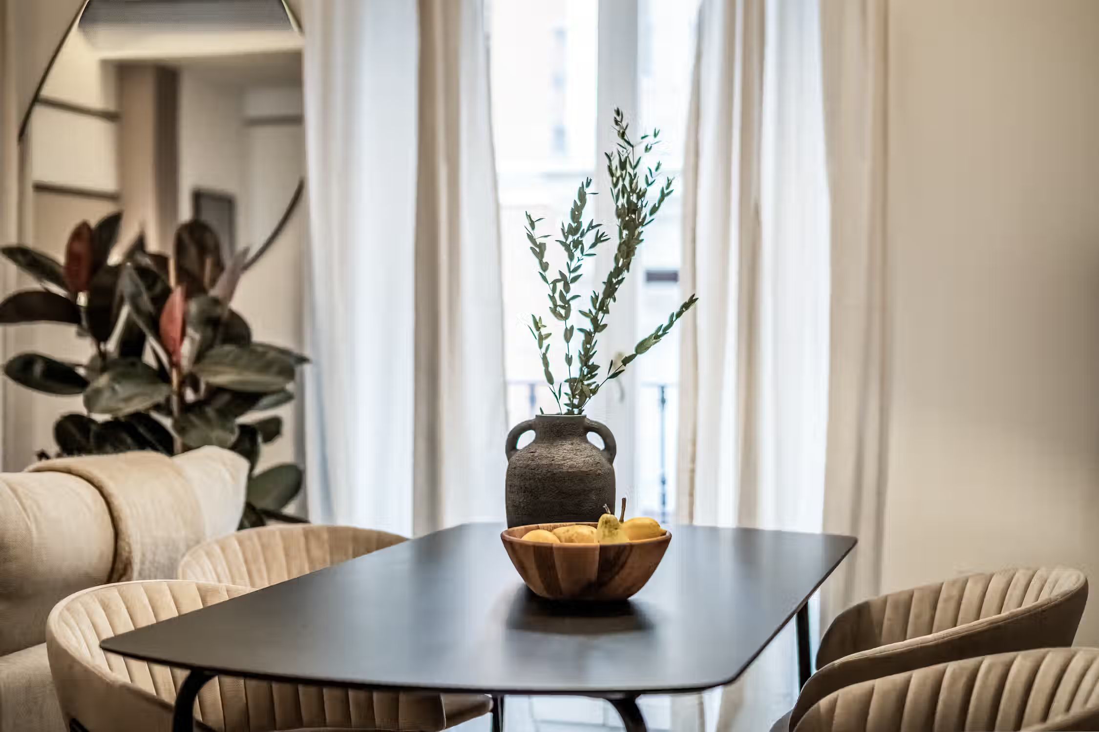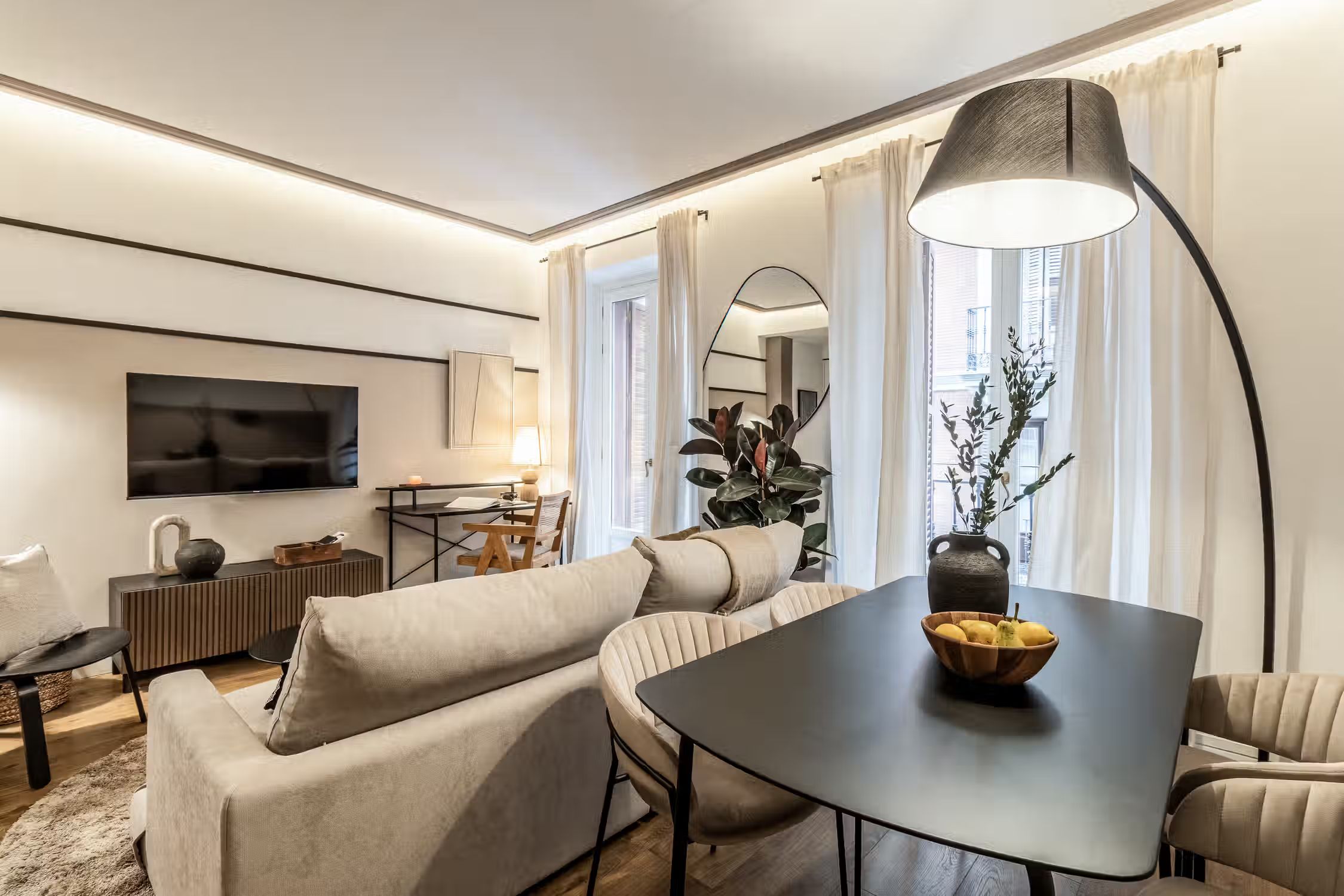 Welcome to Sauco, a stylish 65-square-meter haven situated in the heart of Centro, surrounded by scenic architecture and museums, offering you a delightful fusion of culture and comfort. After a day of taking in the sites of Madrid, come home to Sauco for absolute indulgence. This thoughtfully designed residence features two bedrooms, each graced with queen-size beds, ensuring a peaceful and rejuvenating night's sleep. The single bathroom, with its contemporary design, complements the overall aesthetic of the apartment. Sauco boasts an open-plan living room and kitchen, creating a seamless flow between spaces. The chic design of the apartment is characterized by a neutral color palette, while pops of green from strategically placed plants add a touch of freshness and vibrancy. The living room is a versatile area, featuring an entertainment system for relaxation, a dedicated workstation for productivity, and a dining table for shared meals. The fully furnished kitchen, complete with countertop seating, is a culinary haven where you can create delightful dishes or enjoy a quick bite. Ducted air conditioning in all rooms and individual floor heating ensure that the climate is always just right, adding an extra layer of comfort to your living experience. A doorman provides both security and convenience, making your stay in Sauco even more enjoyable. Fully furnished, this apartment comes with everything you need, including bedding and linen