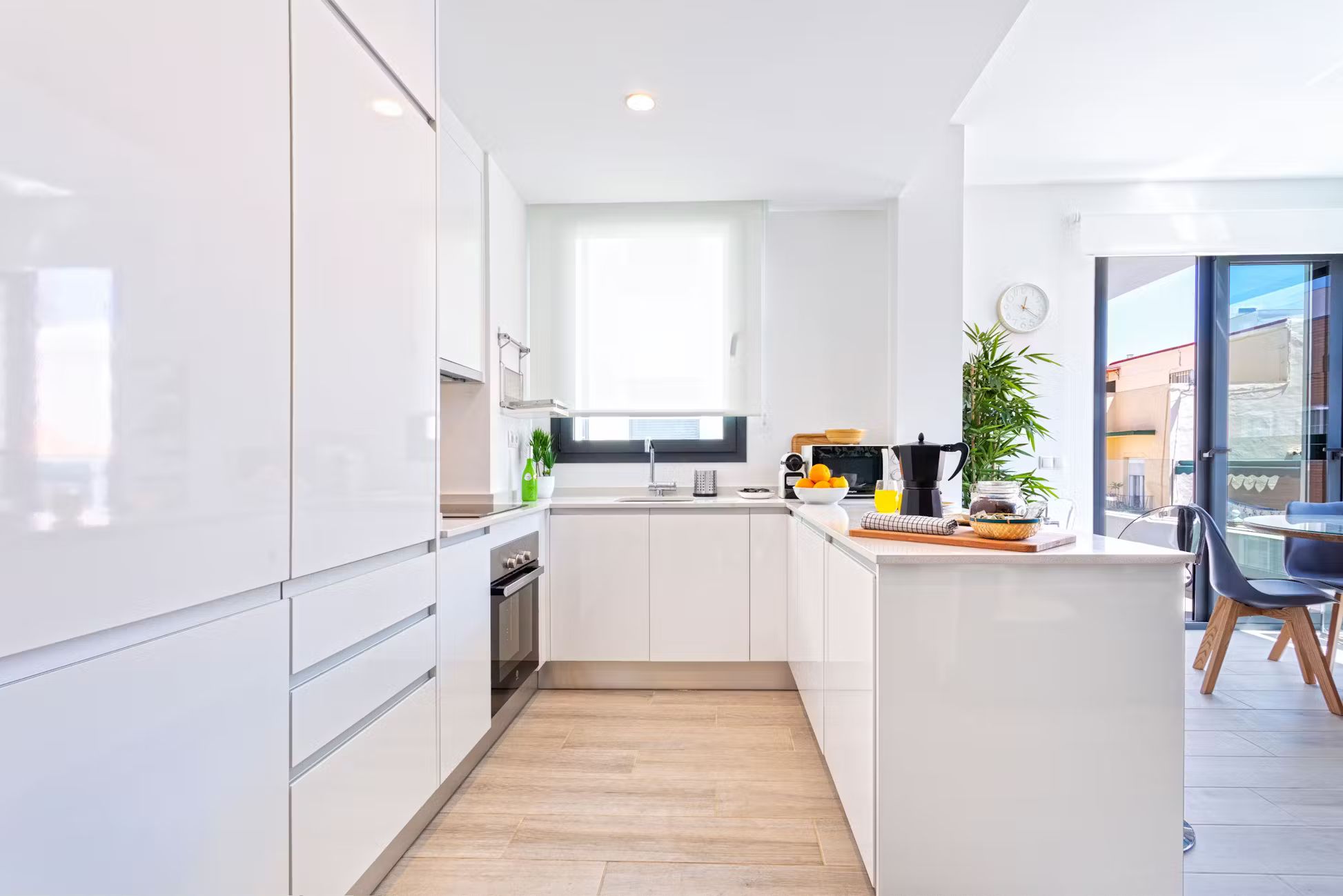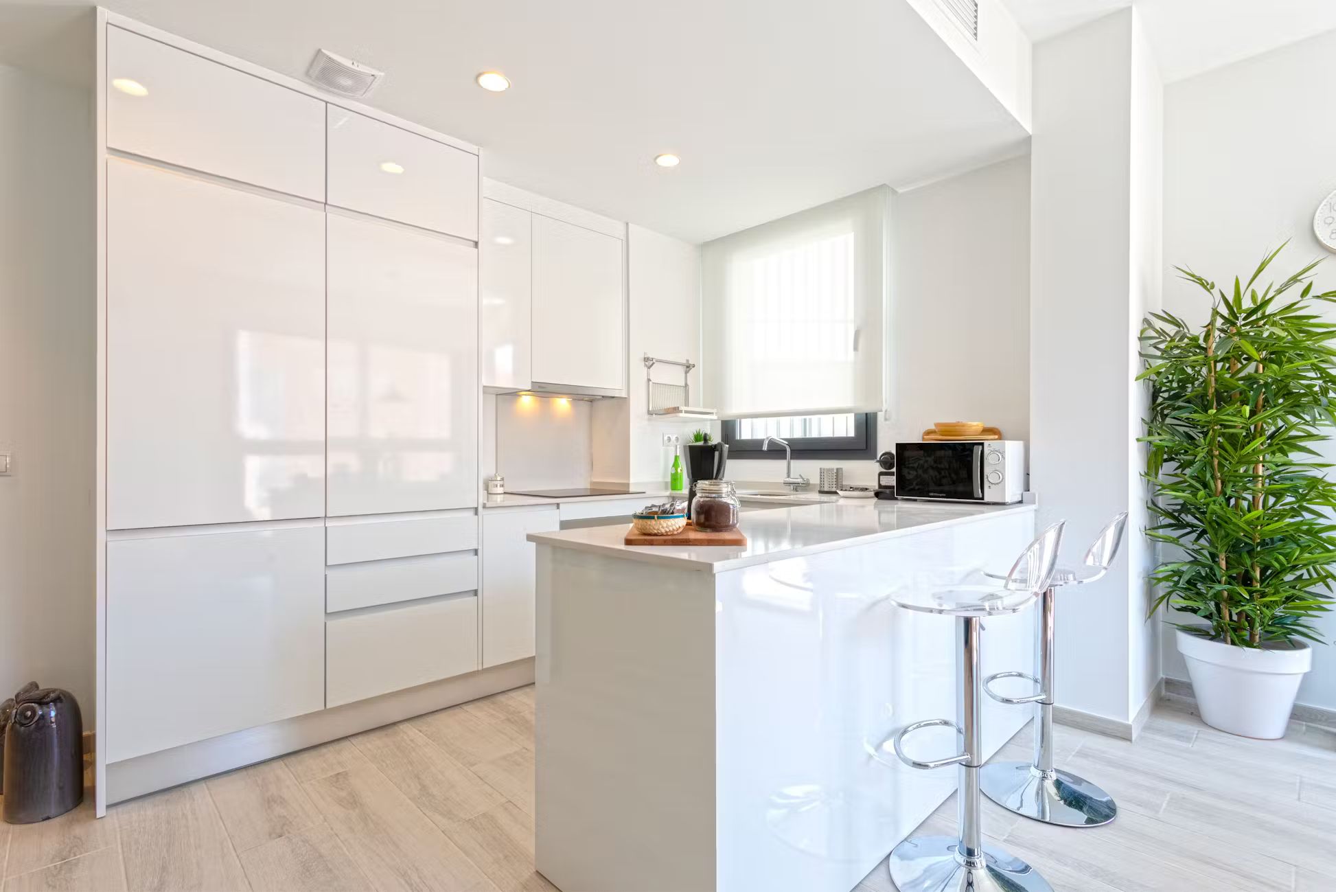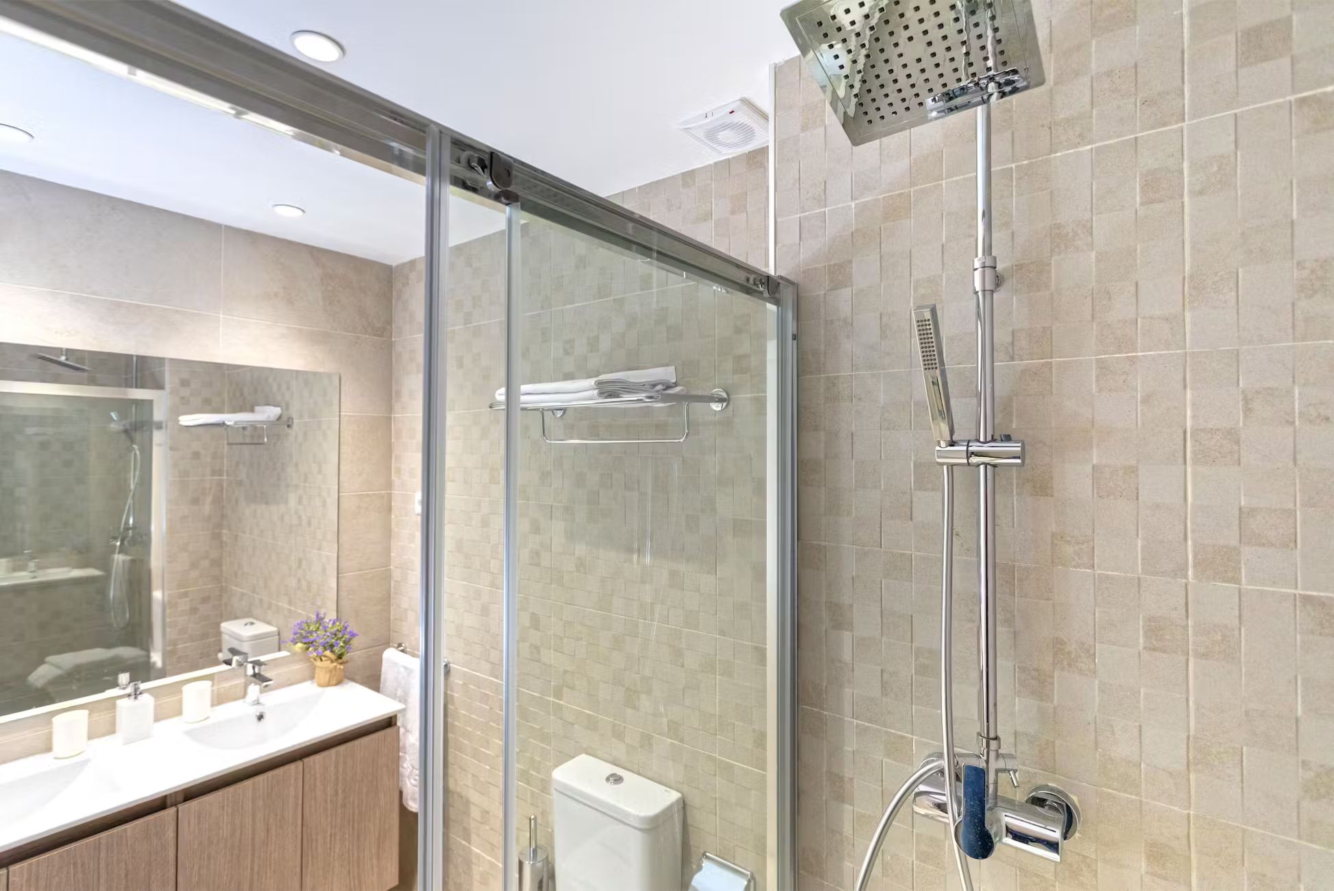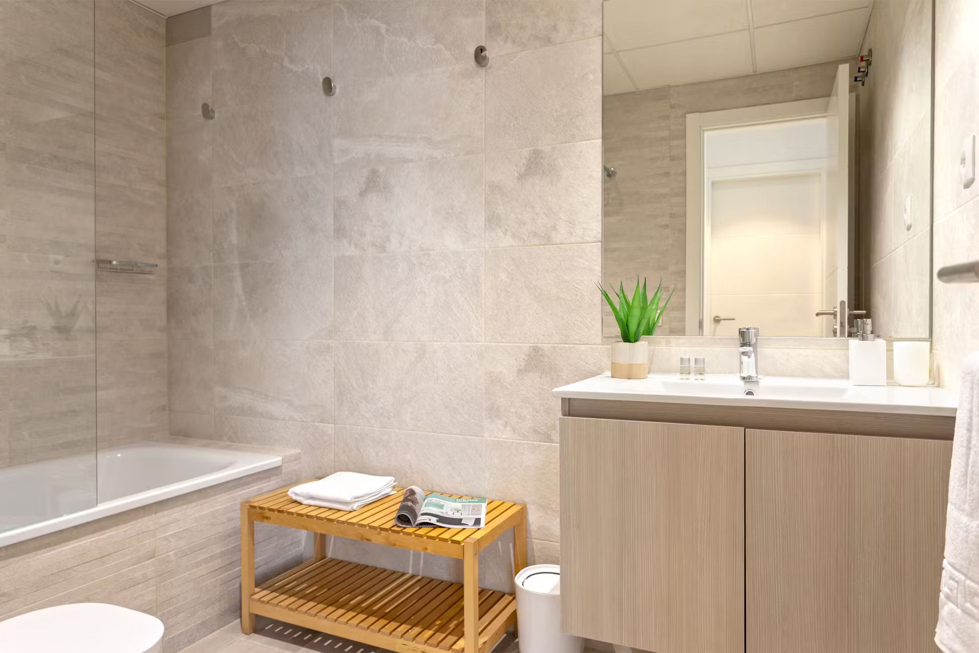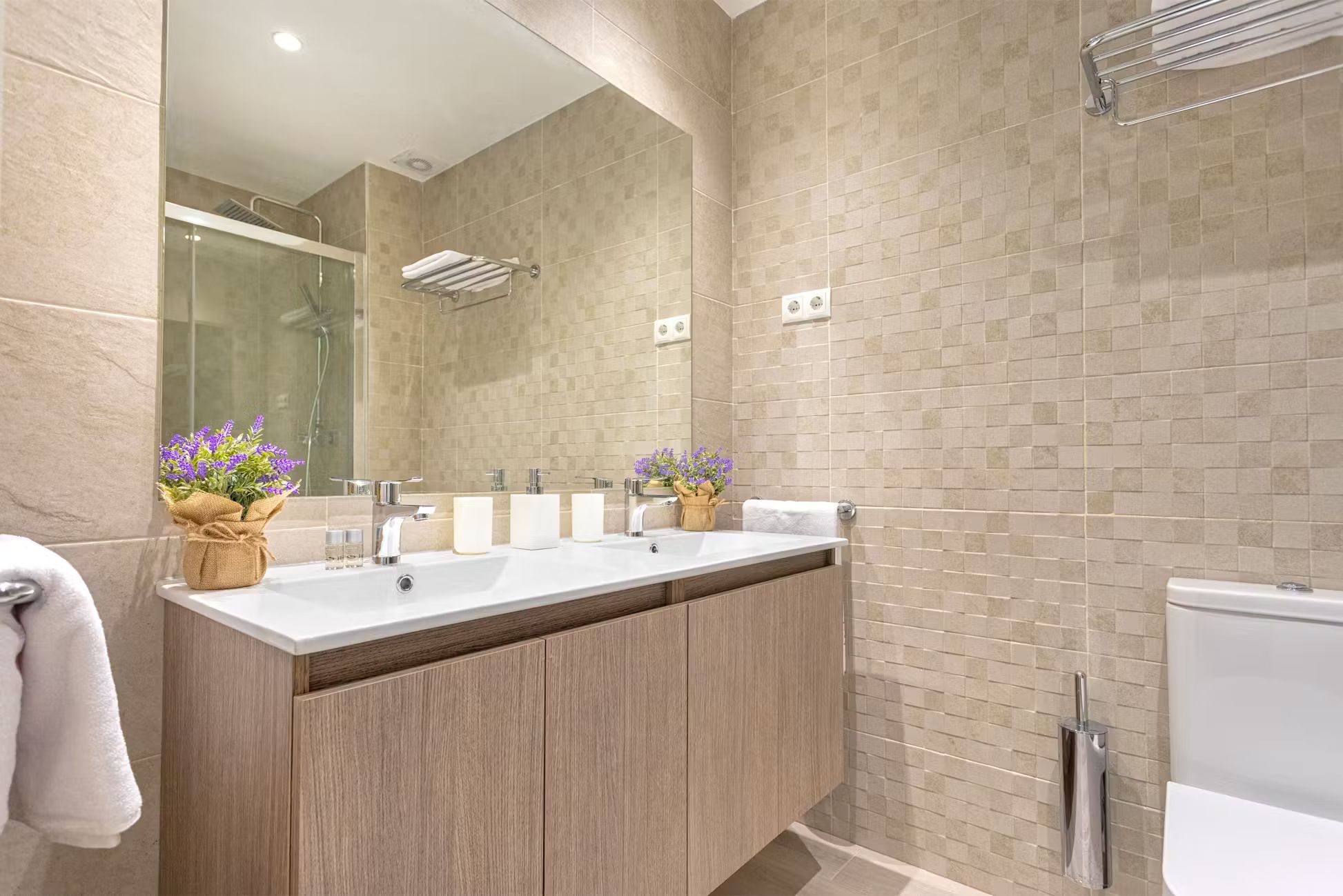 Upon entering the apartment we find a hall that leads directly to the kitchen, fully equipped and open to the living room. The living room, modern and decorated with a design, has a double sofa bed, giving the apartment capacity for up to 6 people. In addition, from the living room we access a small private terrace with 2 chairs and a table to enjoy the good weather of Malaga. The apartment has two bedrooms, one with a 1.80 x 200 cm bed and an en-suite bathroom with a shower, and the other with two 0.90 x 200 cm single beds. Both bedrooms have television. In addition, the apartment has another complete bathroom with a bathtub. In addition, the apartment has a private garage and a magnificent solarium on the top floor of the building, with a swimming pool open from may to october, sun loungers, barbecue and table areas. This area is communal. It is located in a modern and luxurious building on Calle Constancia a few meters from the María Zambrano train station (the main train station in Malaga), Vialia and Larios shopping centers and the Mercado del Carmen. It is also a few meters from the Port of Malaga and the beach