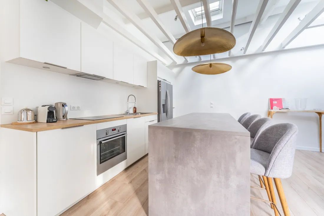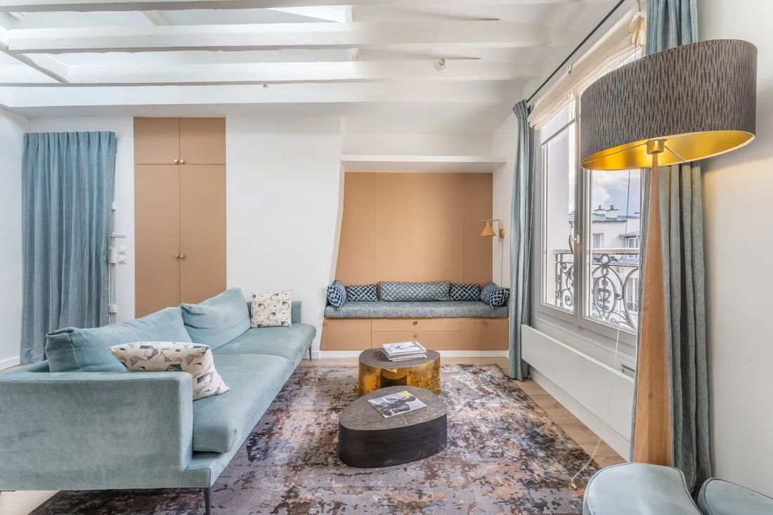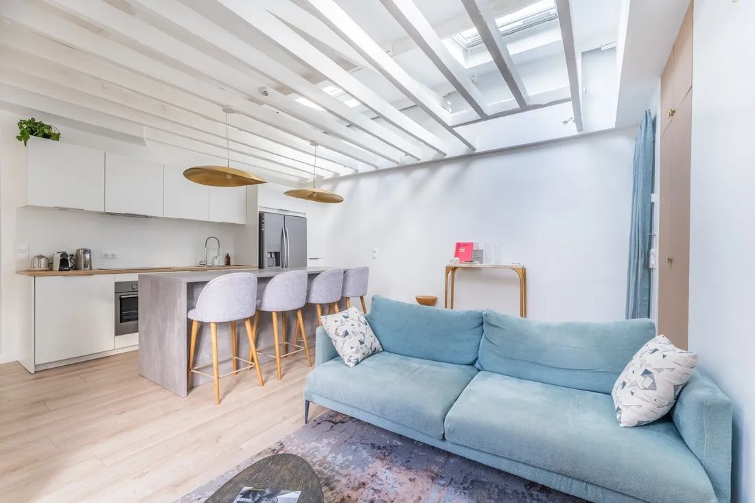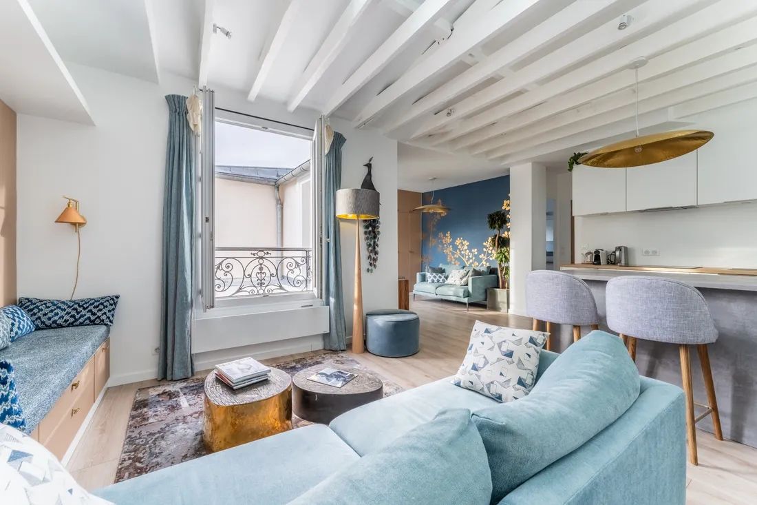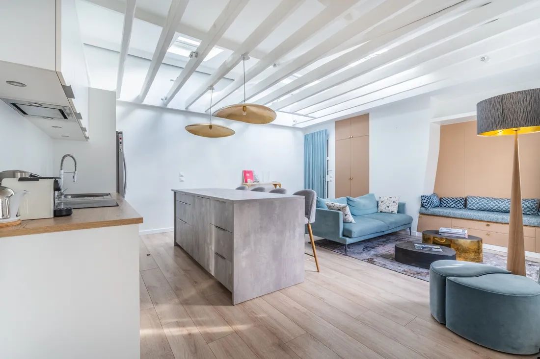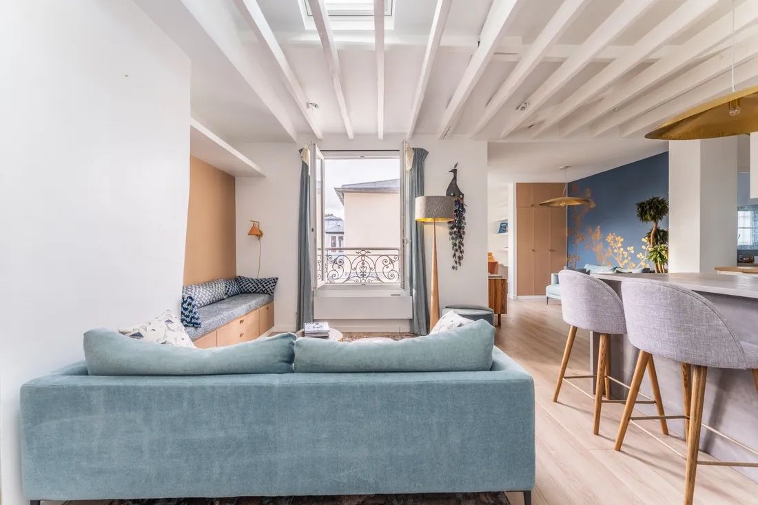 Paris 3rd - Sainte-Avoye / The Archives. In the heart of Le Marais, between the Picasso Museum and the Centre Georges Pompidou, a stone’s throw from the garden of the National Archives and the shops on Rue de Bretagne, within a beautiful secure 19th-century building with a caretaker, we offer you a 65.13 sqm Carrez law apartment, renovated by an architect, on the 4th and top floor with an unobstructed view. It consists of a spacious living room of 40 sqm with an open fitted and equipped kitchen, two bedrooms with storage, a bathroom with bathtub and walk-in shower, separate toilets, and numerous integrated storage spaces. With a triple orientation, the charm of the old with its exposed beams, lovely unobstructed views, and high ceilings, it provides beautiful brightness and absolute calm in the heart of historic Le Marais. This fully furnished apartment is a turnkey ideal pied-à-terre. A cellar completes this property. Prime location, in the immediate vicinity of all metros, shops (cafés, bars, restaurants, trendy boutiques), museums, in a neighborhood that is both lively, festive, touristy, and culturally renowned worldwide.