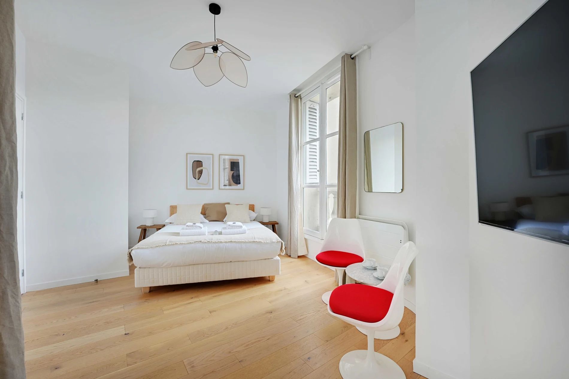 Super flat of 60m2 located on the 3rd floor without lift, only 6 minutes walk from the town hall! You can enjoy the various shops nearby. It is composed of: - A fully equipped and functional open kitchen: fridge, hob, coffee machine, toaster, kettle, washing machine... - A living area with a sofa and TV - A first bedroom with a double bed - A second bedroom with a double bed - Two bathrooms with shower and WC - Storage space - TV and high speed internet - Bed linen and towels provided