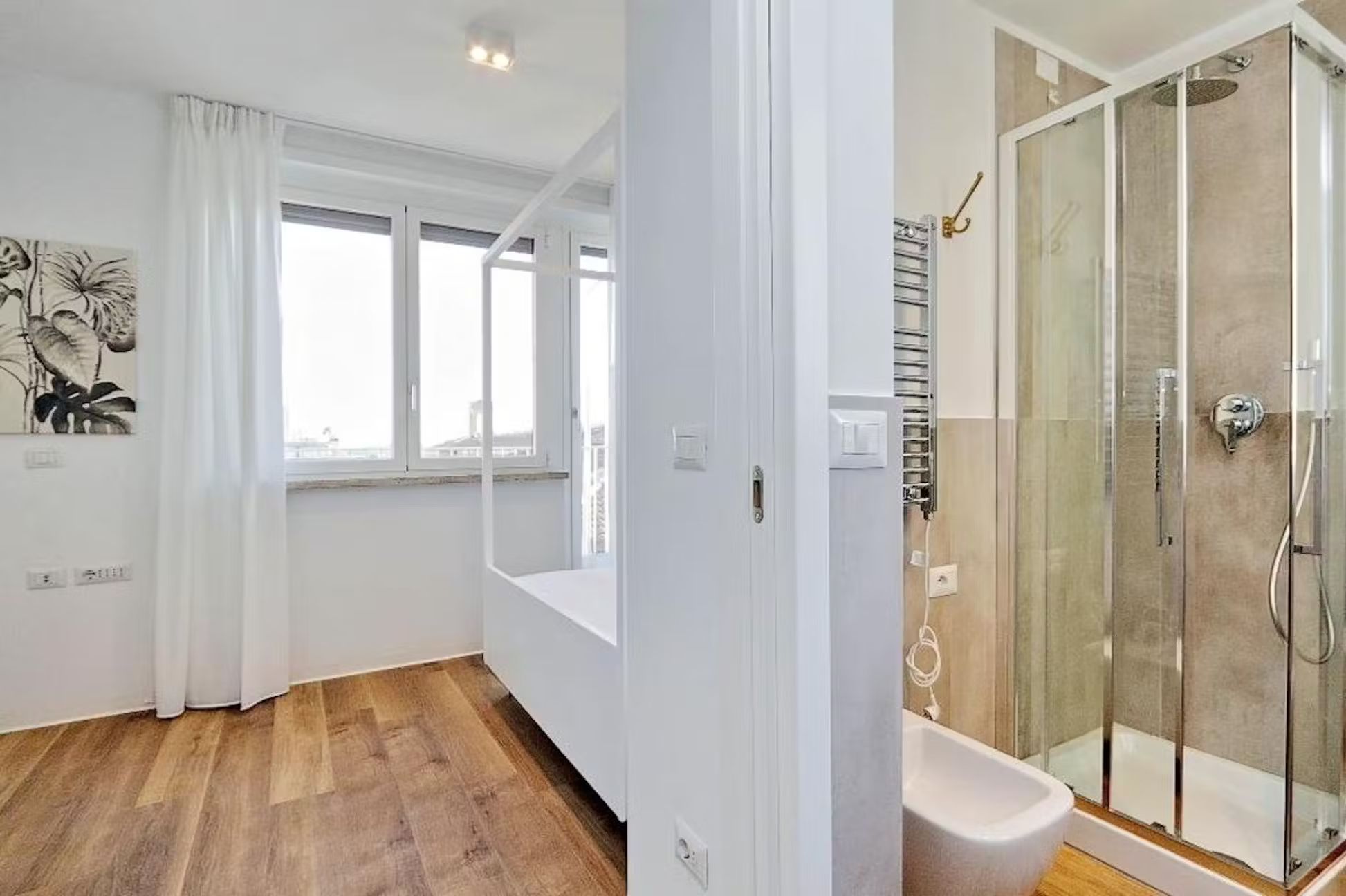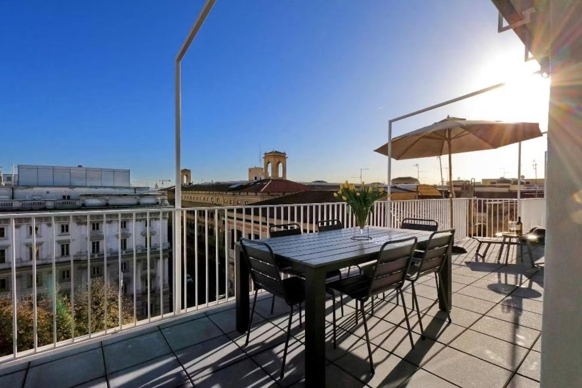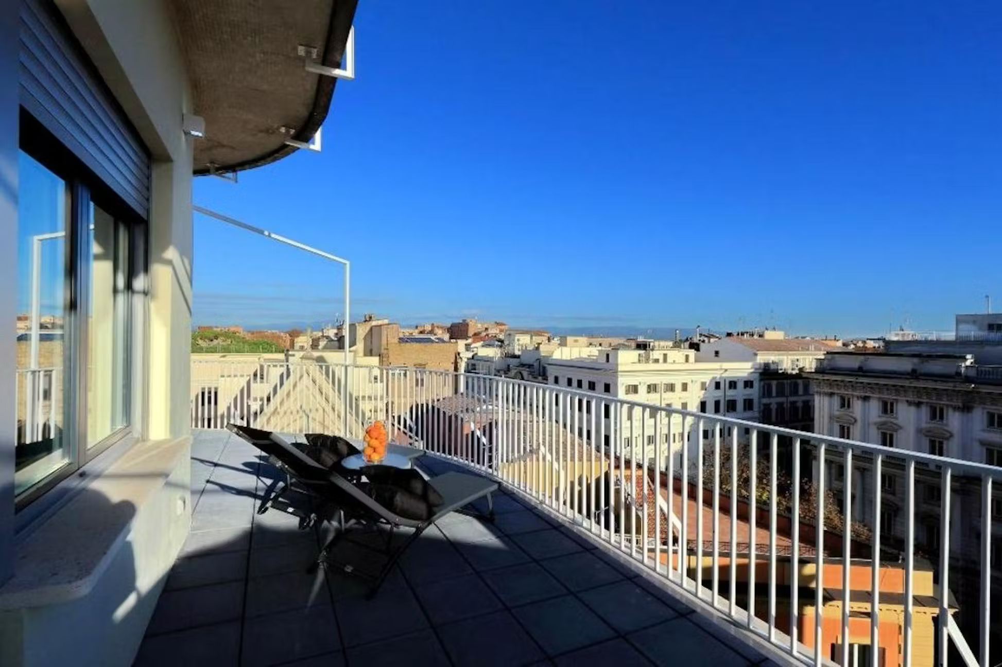 Welcome to this charming and practical three-room apartment with a terrace, perfectly situated in the heart of the lively Sallustiano district, right next to the picturesque Trevi area. With Termini station, Via Veneto, Piazza Barberini, and the Rome Opera House just a 10-minute walk away, and Metro A, Repubblica, and Termini stations only 800 meters away, you’re ideally positioned to explore all that Rome has to offer. Enter to find a spacious living area with a magnificent window that opens onto the terrace, blending indoor and outdoor living beautifully. The terrace, outfitted with a table, chairs, deck chairs, sofa, and umbrella, is perfect for alfresco dining or simply enjoying the breathtaking views. Inside, the living room features a comfy sofa bed and a wall-mounted TV, while the open kitchen is fully equipped with modern appliances including a refrigerator, dishwasher, oven, induction hob, microwave, toaster, electric kettle, and a Nespresso coffee machine, plus cutlery and crockery for six. A stylish dining table with six chairs completes the space To the right of the living room, you’ll find a bedroom with an en suite bathroom, featuring a cozy French double bed, a bedside table, and a spacious wardrobe. On the opposite side of the dining area is the second bedroom, with a luxurious double bed, an inviting armchair, a wall-mounted TV, and ample storage in a large wardrobe. Both bathrooms are equipped with modern fittings and a convenient shower cabin Parking: Nearby, you’ll find both paid parking lots (marked with blue lines) and free parking spaces (marked with white lines) for your convenience